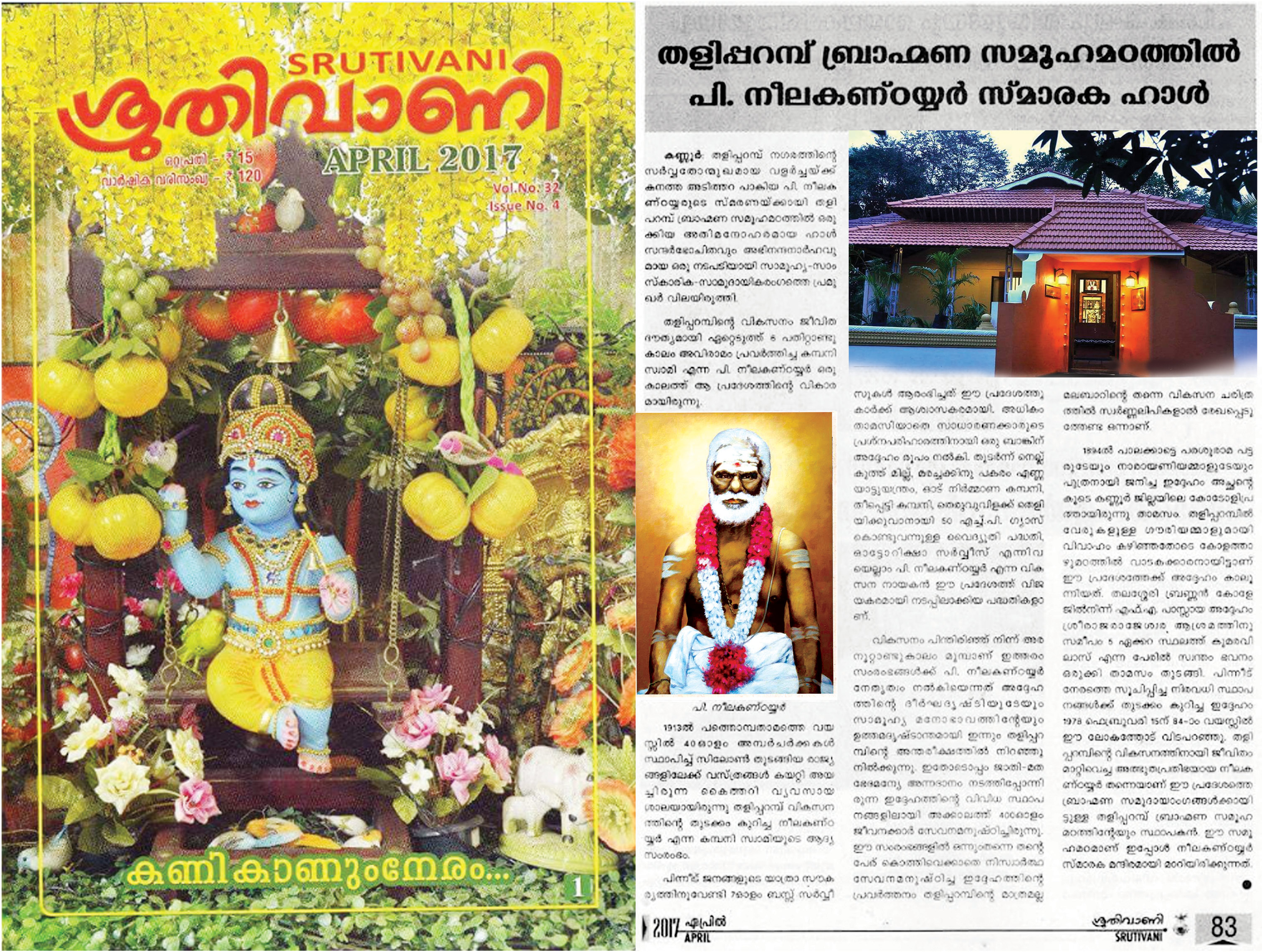 കണ്ണൂര് തളിപ്പറമ്പ് നഗരത്തിന്റെ സര്വ്വതോന്മുഖമായ വളര്ച്ചയ്ക്ക് കനത്ത അടിത്തറ പാകിയ പി. നീലകണ്ഠയ്യരുടെ സ്മരണയ്ക്കായി തളിപ്പറമ്പ് ബ്രാഹ്മണ സമൂഹമഠത്തില് ഒരുക്കിയ അതിമനോഹരമായ ഹാള് സന്ദര്ഭോചിതവുും അഭിനന്ദനാര്ഹവുമായ ഒരു നടപടിയായി സാമൂഹ്യ-സാംസ്കാരിക-സാമുദായികരംഗത്തെ പ്രമുഖര് വിലയിരുത്തി. തളിപ്പറമ്പിന്റെ വികസനം ജീവിതദൗത്യമായി ഏറ്റെടുത്ത് 6 പതിറ്റാണ്ടുകാലം അവിരാമം പ്രവര്ത്തിച്ച കമ്പനി സ്വാമി എന്ന പി. നീലകണ്ഠയ്യര് ഒരു കാലത്ത് ആ പ്രദേശത്തിന്റെ വികാരമായിരുന്നു. 1913 ല് പത്തൊമ്പതാമത്തെ വയസ്സില് 40 ഓളം അമ്പര്ചര്ക്കകള് സ്ഥാപിച്ച് സിലോണ് തുടങ്ങിയ രാജ്യങ്ങളിലേക്ക് വസ്ത്രങ്ങള് കയറ്റി അയച്ചിരുന്ന കൈത്തറി വ്യവസായശാലയായിരുന്നു തളിപ്പറമ്പ് വികസനത്തിന്റെ തുടക്കം കുറിച്ച നീലകണ്ഠയ്യര് എന്ന കമ്പനി സ്വാമിയുടെ ആദ്യ സംരംഭം. പിന്നീട് ജനങ്ങളുടെ യാത്രാ സൗകര്യത്തിനുവേണ്ടി 7ഓളം ബസ്സ് സര്വ്വീസുകള് ആരംഭിച്ചത് ഈ പ്രദേശത്തുകാര്ക്ക് ആശ്വാസകരമായി. അധികം താമസിയാതെ സാധാരണക്കാരുടെ പ്രശ്ന പരിഹാരത്തിനായി ഒരു ബാങ്കിന് അദ്ദേഹം രൂപം നല്കി. തുടര്ന്ന് നെല്ല്കുത്ത് മില്ല്, മരച്ചക്കിനു പകരം എണ്ണയാട്ടുയന്ത്രം, ഓട് നിര്മ്മാണ കമ്പനി, തീപ്പെട്ടി കമ്പനി, തെരുവിളക്ക് തെളിയിക്കുനാനായി 50 എച്ച്. പി. ഗ്യാസ് കൊണ്ടുവന്നുള്ള വൈദ്യുതി പദ്ധതി, ഓട്ടോറിക്ഷാ സര്വ്വീസ് എന്നിവയെല്ലാം പി. നീലകണ്ഠയ്യര് എന്ന വികസന നായകന് ഈ പ്രദേശത്ത് വിജയകരമായി നടപ്പിലാക്കിയ പദ്ധിതകളാണ്. വികസനം പിന്തിരിഞ്ഞ് നിന്ന് അരനൂറ്റാണ്ടുകാലം മുമ്പാണ് ഇത്തരം സംരംഭങ്ങള്ക്ക് പി. നീലകണ്ഠയ്യര് നേതൃത്വം നല്കിയെന്നത് അദ്ദേഹത്തിന്റെ ദീര്ഘദൃഷ്ടിയുടേയും സാമൂഹ്യമനോഭാവത്തിന്റേയും ഉത്തമദൃഷ്ടാന്തമായി ഇന്നും തളിപ്പറമ്പിന്റെ അന്തരീക്ഷത്തില് നിറഞ്ഞു നില്ക്കുന്നു. ഇതോടൊപ്പം ജാതി-മത ഭേദമന്യേ അന്നദാനം നടത്തിപ്പോന്നിരുന്ന ഇദ്ദേഹത്തിന്റെ വിവിധ സ്ഥാപനങ്ങളിലായി അക്കാലത്ത് 400 ഓളം ജീവനക്കാര് സേവനമനിഷ്ഠിച്ചിരുന്നു. ഈ സംരംഭങ്ങളില് ഒന്നും തന്നെ തന്റെ പേര് കൊത്തിവെക്കാതെ നിസാര്ത്ഥ സേവനമനുഷ്ഠിച്ച ഇദ്ദേഹത്തിന്റെ പ്രവര്ത്തനം തളിപ്പറമ്പിന്റെ മാത്രമല്ല മലബാറിന്റെ തന്നെ വികസന ചരിത്രത്തില് സ്വര്ണ്ണലിപികളാല് രേഖപ്പെടുത്തേണ്ട ഒന്നാണ്. 1894 ല് പാലക്കാട്ടെ പരശുരാമ പട്ടരുടെയും നാരായണിയമ്മാളുടേയും പുത്രനായി ജനിച്ച ഇദ്ദേഹം അച്ഛന്റെ കൂടെ കണ്ണൂര് ജില്ലയിലെ കോട്ടോളിപ്രത്തായിരുന്നു താമസം തളിപ്പറമ്പില് വേരുകളുള്ള ഗൗരിയമ്മാളുമായി വിവാഹം കിഞ്ഞതോടെ കോളത്താഴുമഠത്തില് വാടകക്കാരനായിട്ടാണ് ഈ പ്രദേശത്തേക്ക് അദ്ദേഹം കാലൂന്നിയത്. തലശ്ശേരി ബ്രണ്ണന് കോളേജില് നിന്ന് എഫ്.എ. പാസ്സായ അദ്ദേഹം 