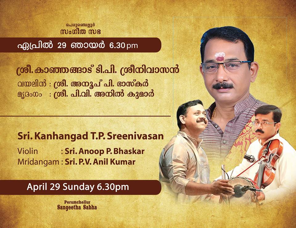 Vijay & Sangeetha are associating with Perumchellur Sangeetha Sabha. In memory of their Grandfather Sri. S.S.Marar (Shiva Shankara Marar), they are sponsoring the evening concert of 29th April 2018. Its a sheer coincidence & honour that they were once our neighbours... provided all support to our samooha madom then. Their parents Sri. K.V. Vijayan & Smt. Krishna Vijayan too are involved deeply in socio-cultural activities. Perumchellur Sangeetha Sabha are privilleged to associate with them...New generation bringing in a transformation in the society