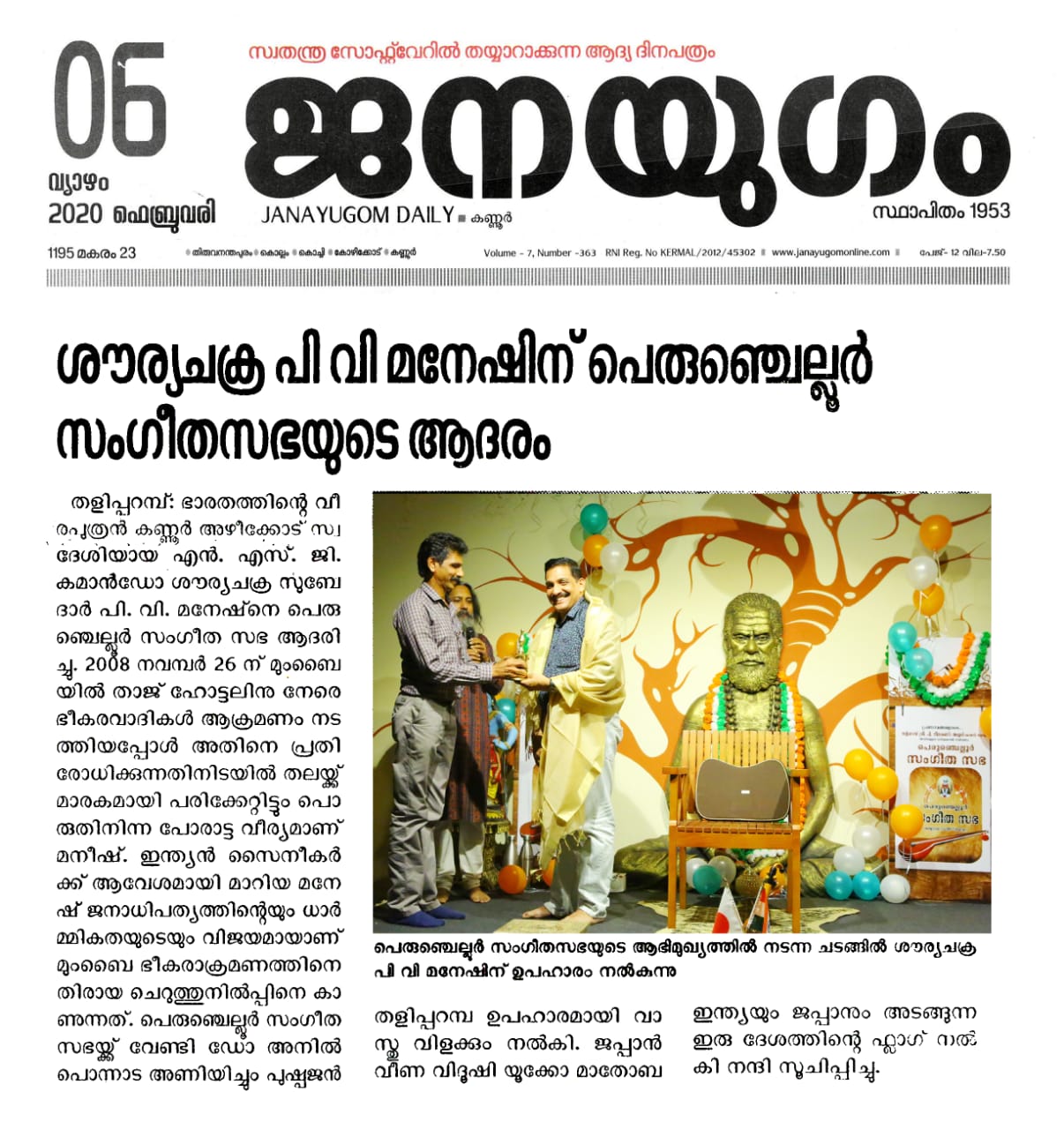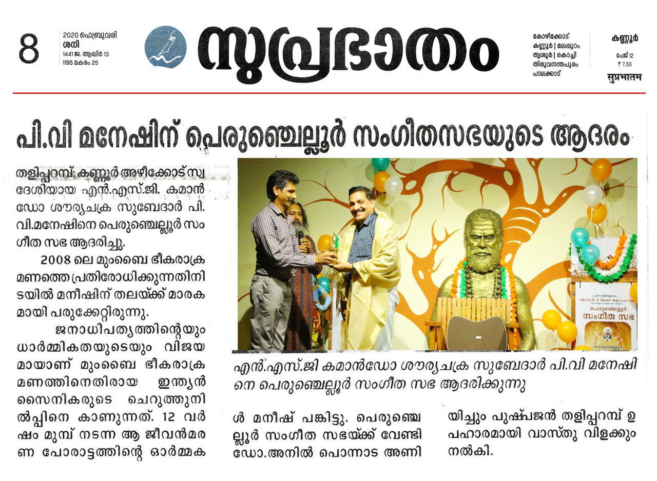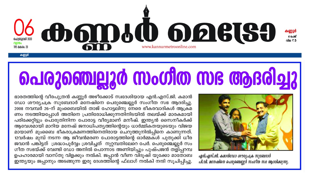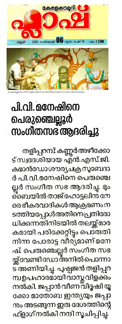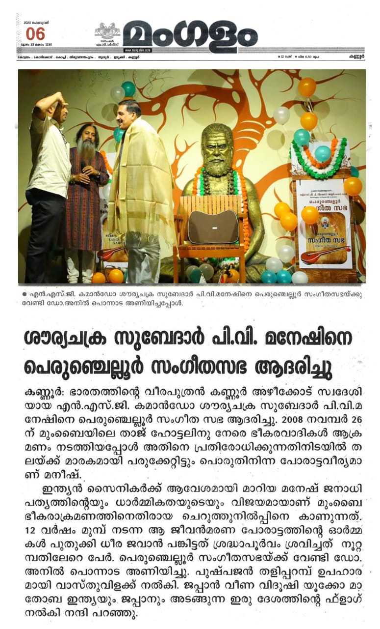 ഭാരതത്തിന്റെ വീരപുത്രൻ കണ്ണൂർ അഴീക്കോട് സ്വദേശിയായ എൻ.എസ്.ജി. കമാൻഡോ ശൗര്യചക്ര സുബേദാർ പി.വി.മനേഷ് നെ പെരുഞ്ചെല്ലൂർ സംഗീത സഭ ആദരിച്ചു. 2008 നവമ്പർ 26 ന് മുംബൈയിൽ താജ് ഹോട്ടലിനു നേരെ ഭീകരവാദികൾ ആക്രമണം നടത്തിയപ്പോൾ അതിനെ പ്രതിരോധിക്കുന്നതിനിടയിൽ തലയ്ക്ക് മാരകമായി പരിക്കേറ്റിട്ടും പൊരുതിനിന്ന പോരാട്ട വീര്യമാണ് മനീഷ്. ഇന്ത്യൻ സൈനീകർക്ക് ആവേശമായി മാറിയ മനേഷ് ജനാധിപത്യത്തിന്റെയും ധാർമ്മികതയുടെയും വിജയമായാണ് മുംബൈ ഭീകരാക്രമണത്തിനെതിരായ ചെറുത്തുനിൽപ്പിനെ കാണുന്നത്. 12 വർഷം മുമ്പ് നടന്ന ആ ജീവൻമരണ പോരാട്ടത്തിന്റെ ഓർമ്മകൾ പുതുക്കി ധീര ജവാൻ പങ്കിട്ടത് ശ്രദ്ധാപൂർവ്വം ശ്രവിച്ചത് നൂറ്റമ്പതിലേറെ പേർ. പെരുഞ്ചെല്ലൂർ സംഗീത സഭയ്ക്ക് വേണ്ടി ഡോ അനിൽ പൊന്നാട അണിയിച്ചും പുഷ്പജൻ തളിപ്പറമ്പ ഉപഹാരമായി വാസ്തു വിളക്കും നൽകി. ജപ്പാൻ വീണ വിദൂഷി യൂക്കോ മാതോബ ഇന്ത്യയും ജപ്പാനും അടങ്ങുന്ന ഇരു ദേശത്തിന്റെ ഫ്ലാഗ് നൽകി നന്ദി സൂചിപ്പിച്ചു.