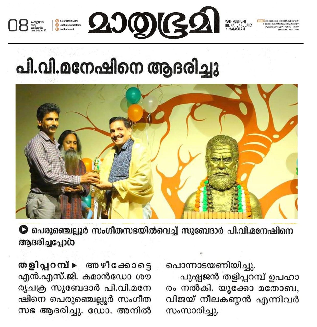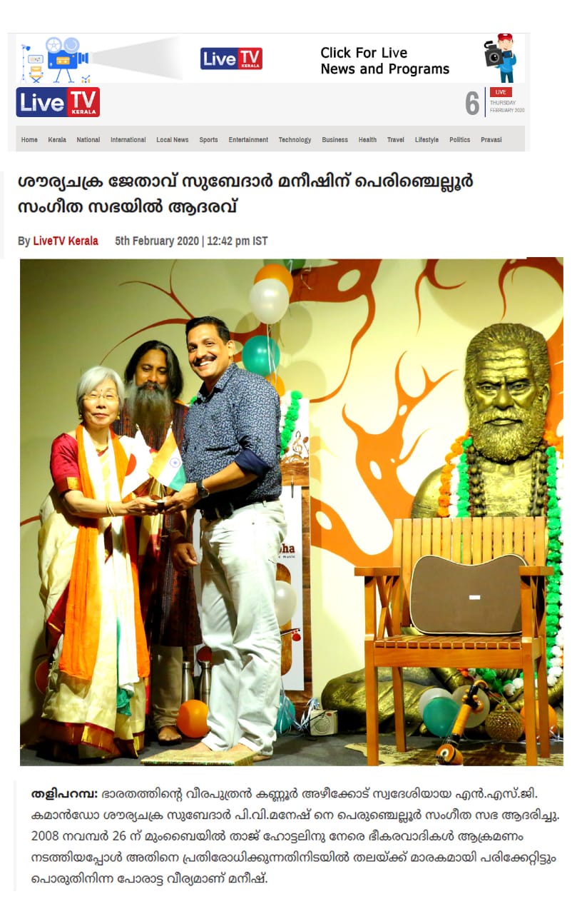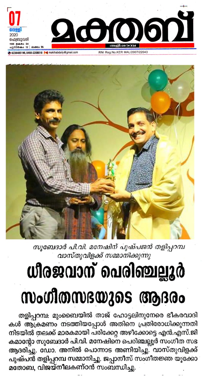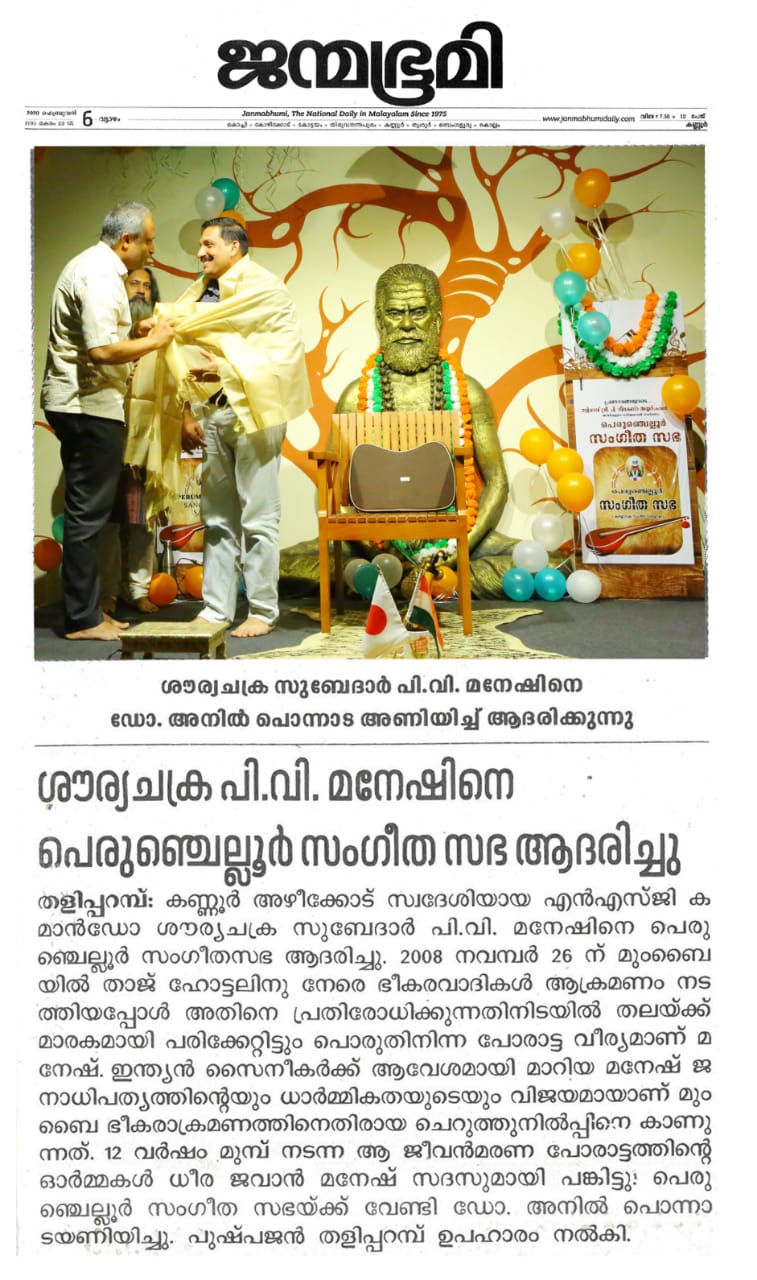ഭാരതത്തിന്റെ വീരപുത്രൻ കണ്ണൂർ അഴീക്കോട് സ്വദേശിയായ എൻ.എസ്.ജി. കമാൻഡോ ശൗര്യചക്ര സുബേദാർ പി.വി.മനേഷ് നെ പെരുഞ്ചെല്ലൂർ സംഗീത സഭ ആദരിച്ചു. 2008 നവമ്പർ 26 ന് മുംബൈയിൽ താജ് ഹോട്ടലിനു നേരെ ഭീകരവാദികൾ ആക്രമണം നടത്തിയപ്പോൾ അതിനെ പ്രതിരോധിക്കുന്നതിനിടയിൽ തലയ്ക്ക് മാരകമായി പരിക്കേറ്റിട്ടും പൊരുതിനിന്ന പോരാട്ട വീര്യമാണ് മനീഷ്. ഇന്ത്യൻ സൈനീകർക്ക് ആവേശമായി മാറിയ മനേഷ് ജനാധിപത്യത്തിന്റെയും ധാർമ്മികതയുടെയും വിജയമായാണ് മുംബൈ ഭീകരാക്രമണത്തിനെതിരായ ചെറുത്തുനിൽപ്പിനെ കാണുന്നത്. 12 വർഷം മുമ്പ് നടന്ന ആ ജീവൻമരണ പോരാട്ടത്തിന്റെ ഓർമ്മകൾ പുതുക്കി ധീര ജവാൻ പങ്കിട്ടത് ശ്രദ്ധാപൂർവ്വം ശ്രവിച്ചത് നൂറ്റമ്പതിലേറെ പേർ. പെരുഞ്ചെല്ലൂർ സംഗീത സഭയ്ക്ക് വേണ്ടി ഡോ അനിൽ പൊന്നാട അണിയിച്ചും പുഷ്പജൻ തളിപ്പറമ്പ ഉപഹാരമായി വാസ്തു വിളക്കും നൽകി. ജപ്പാൻ വീണ വിദൂഷി യൂക്കോ മാതോബ ഇന്ത്യയും ജപ്പാനും അടങ്ങുന്ന ഇരു ദേശത്തിന്റെ ഫ്ലാഗ് നൽകി നന്ദി സൂചിപ്പിച്ചു.