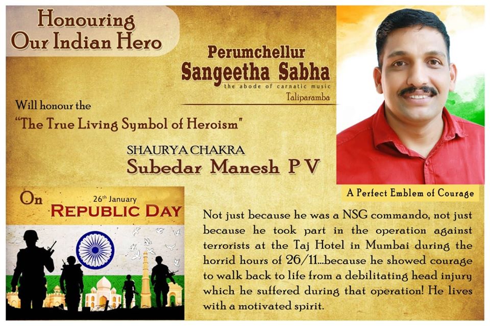Our Indian Hero Perumchellur Sangeetha Sabha Honouring “The True Living Symbol of Heroism A Perfect Emblem of Courage SHAURYA CHAKRA Subedar Manesh PV On our Republic Day 26 January 2020