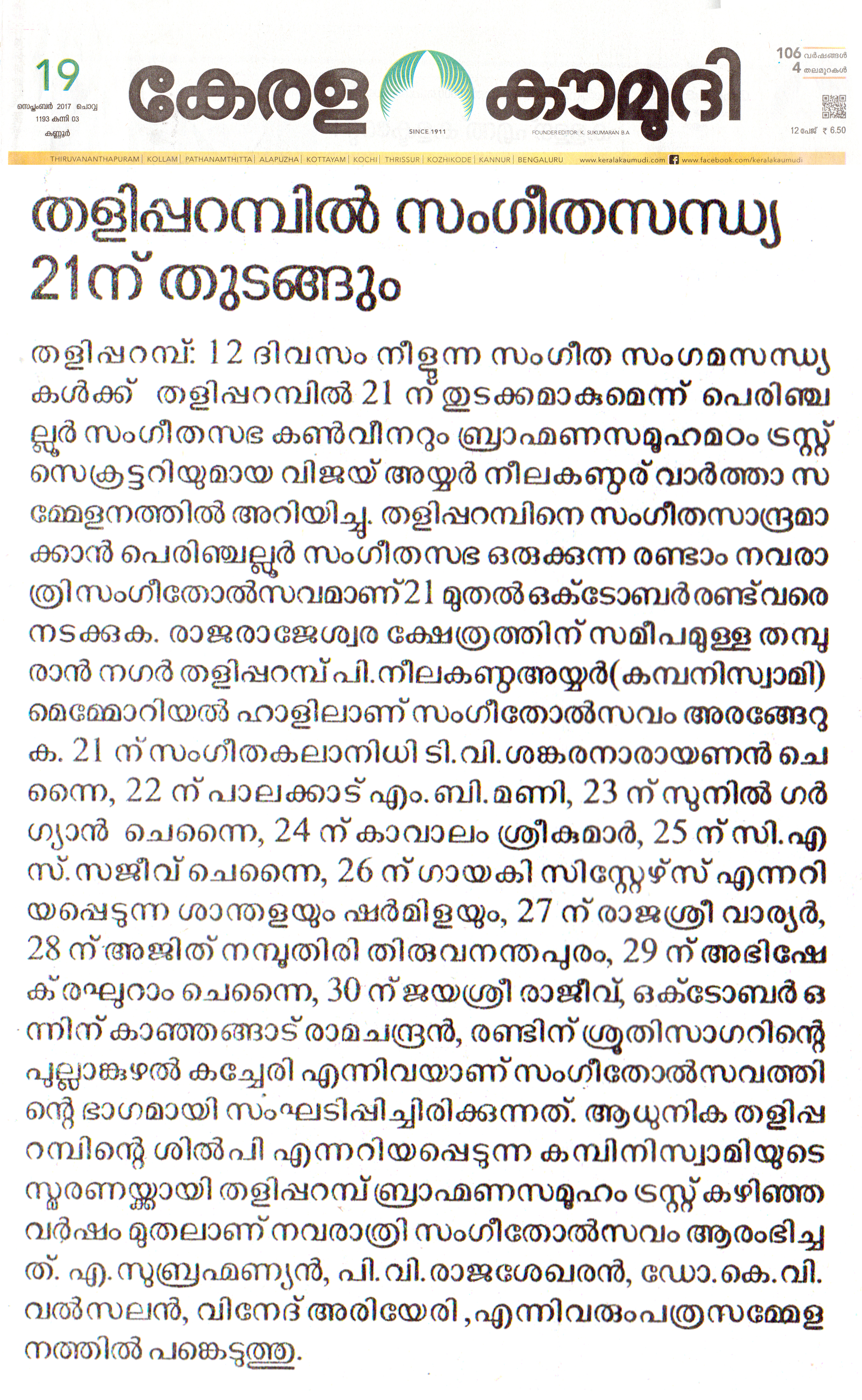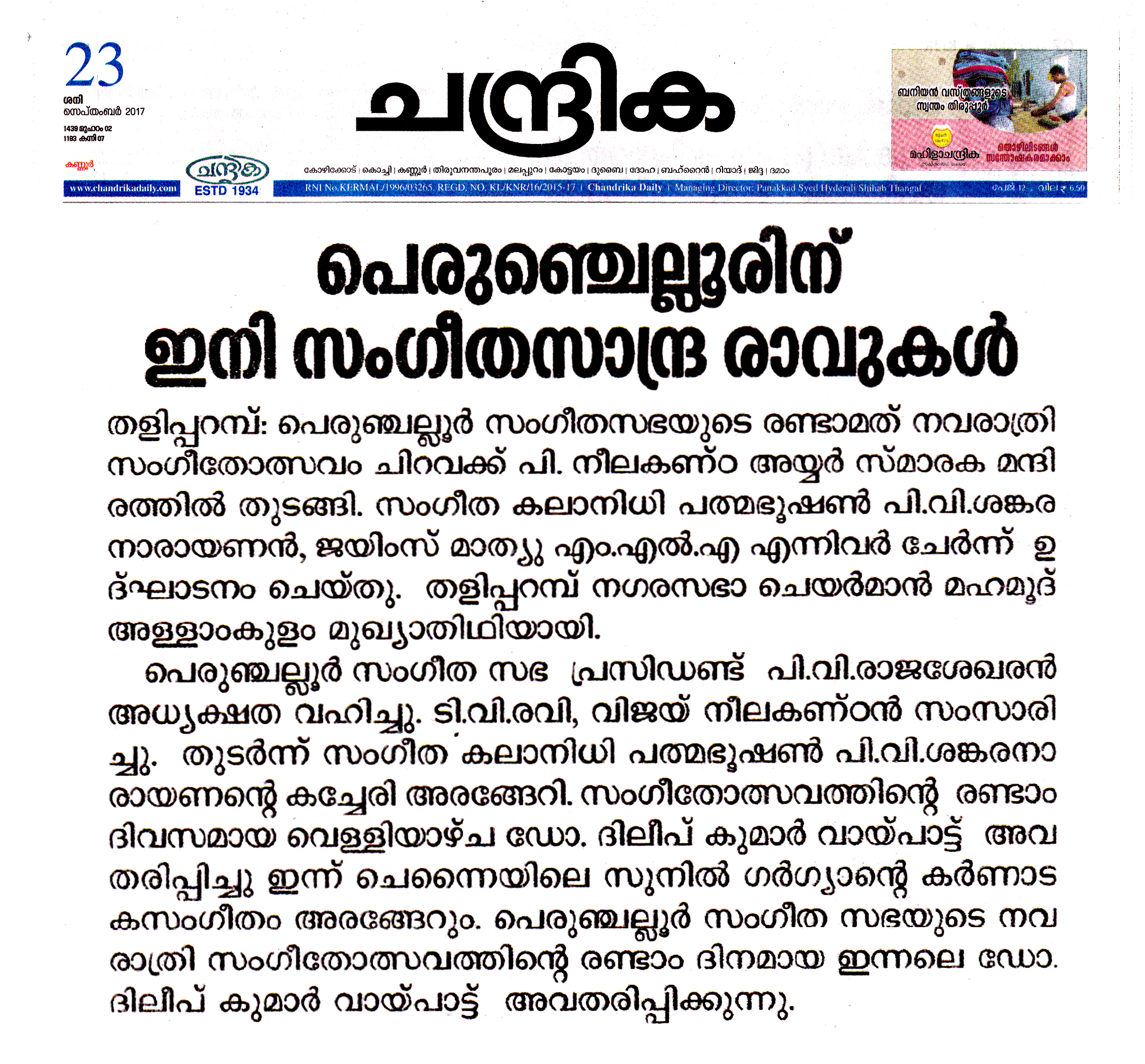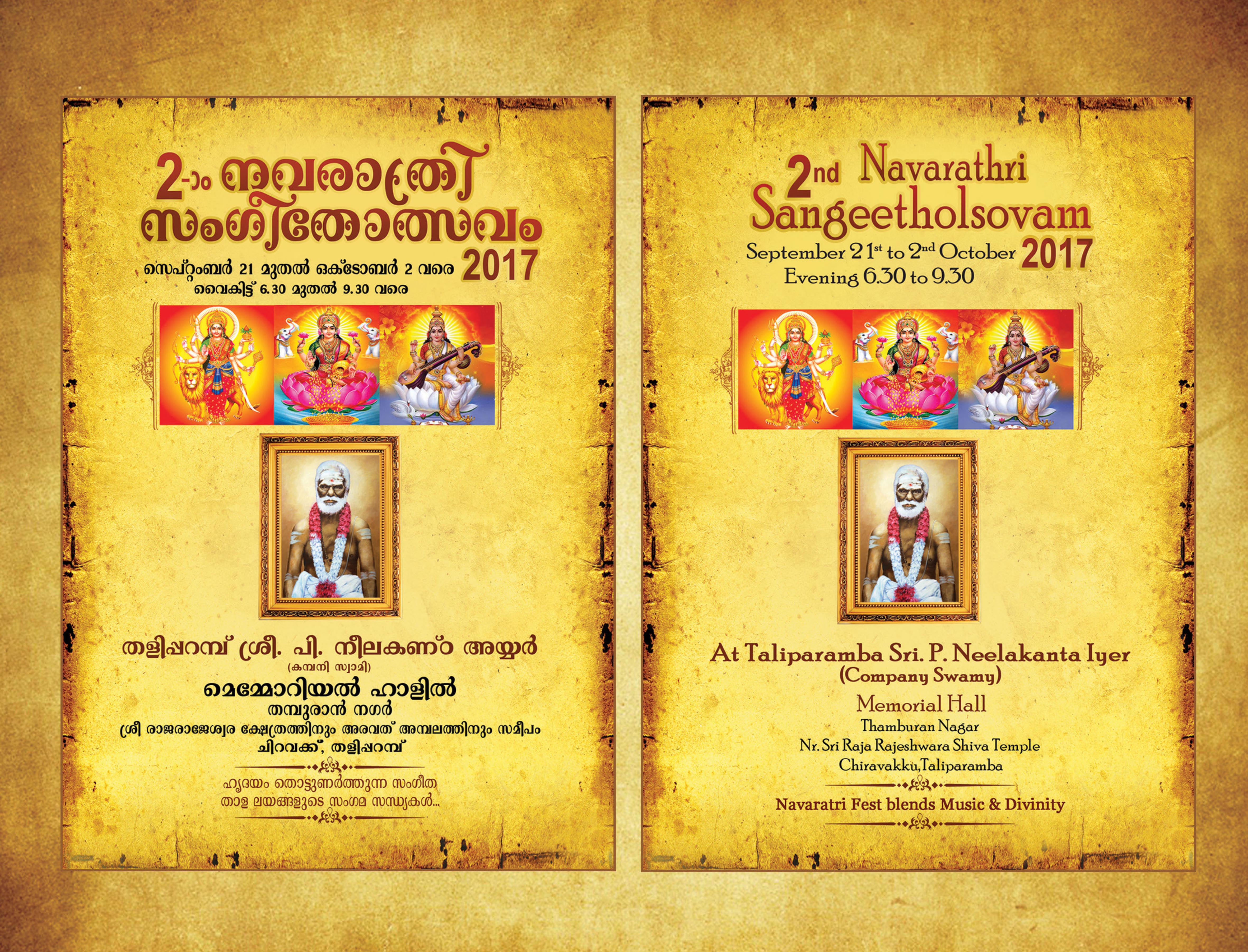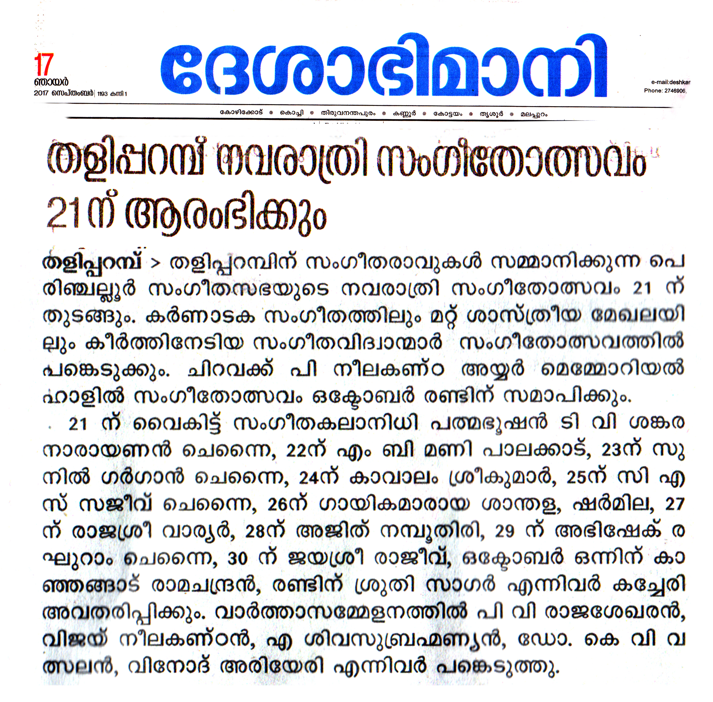 Perumchellur Sangeetha Sabha, Taliparamba (T) conducts the highest quality music concerts every month and Annual Musical Festival during Navaratri. For the first time in the history of Taliparamba, eminent musicians from across India performed during 10 days of Navaratri Sangeetholsavam 2016. Perumchellur Sangeetha Sabha, Taliparamba (T) is pleased to announce its Annual Music Festival 12 days long “2nd Navaratri Sangeetholsavam 2017”. The grand event is from the 21st September to 02nd October 2017. As in the past few years, it will be held at Sri. P. Neelakanta Iyer (Company Swamy) Memorial Hall, Nr Sri Raja Rajeshwara Shiva Temple, Chiravakku, Taliparamba.
