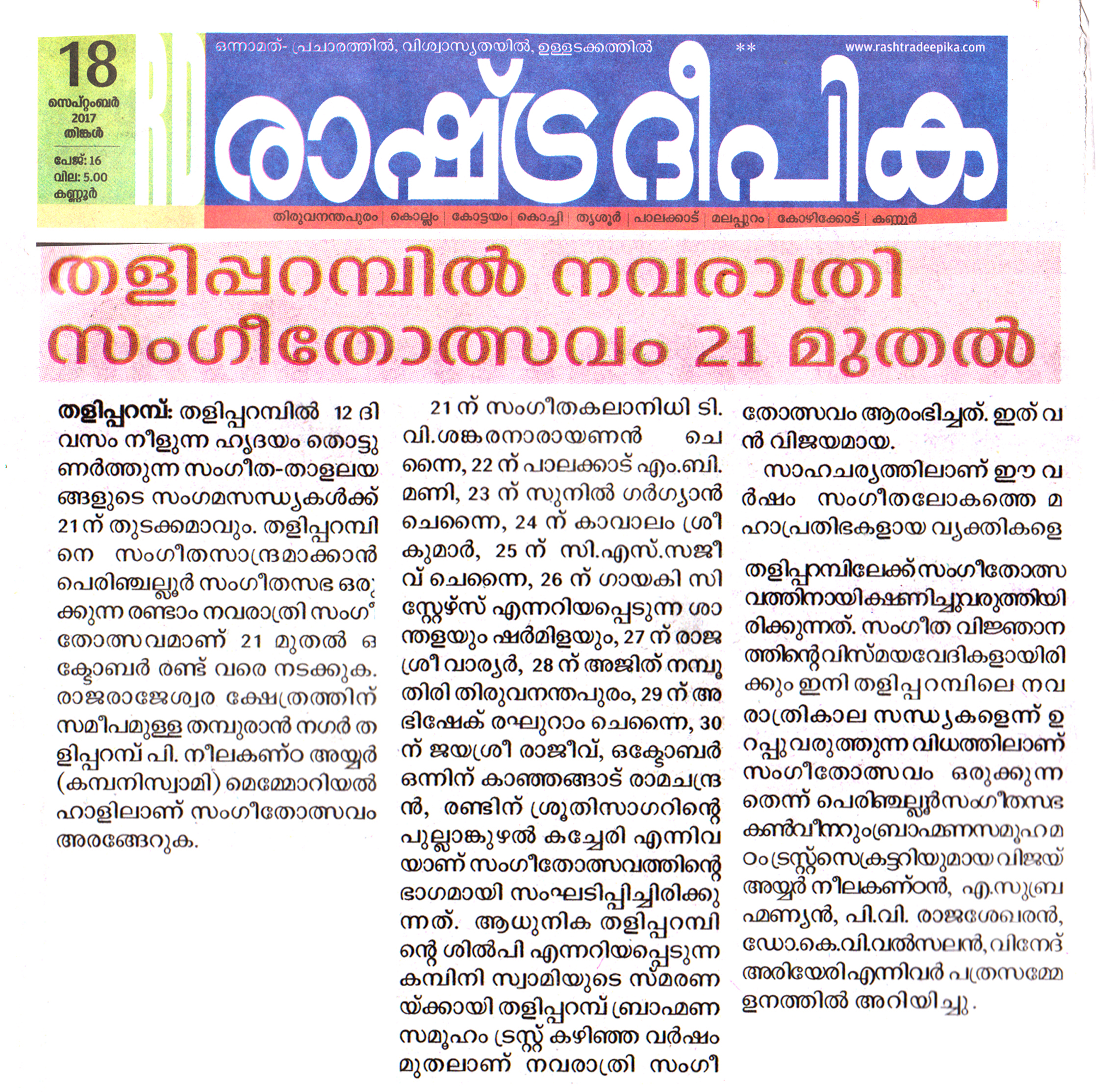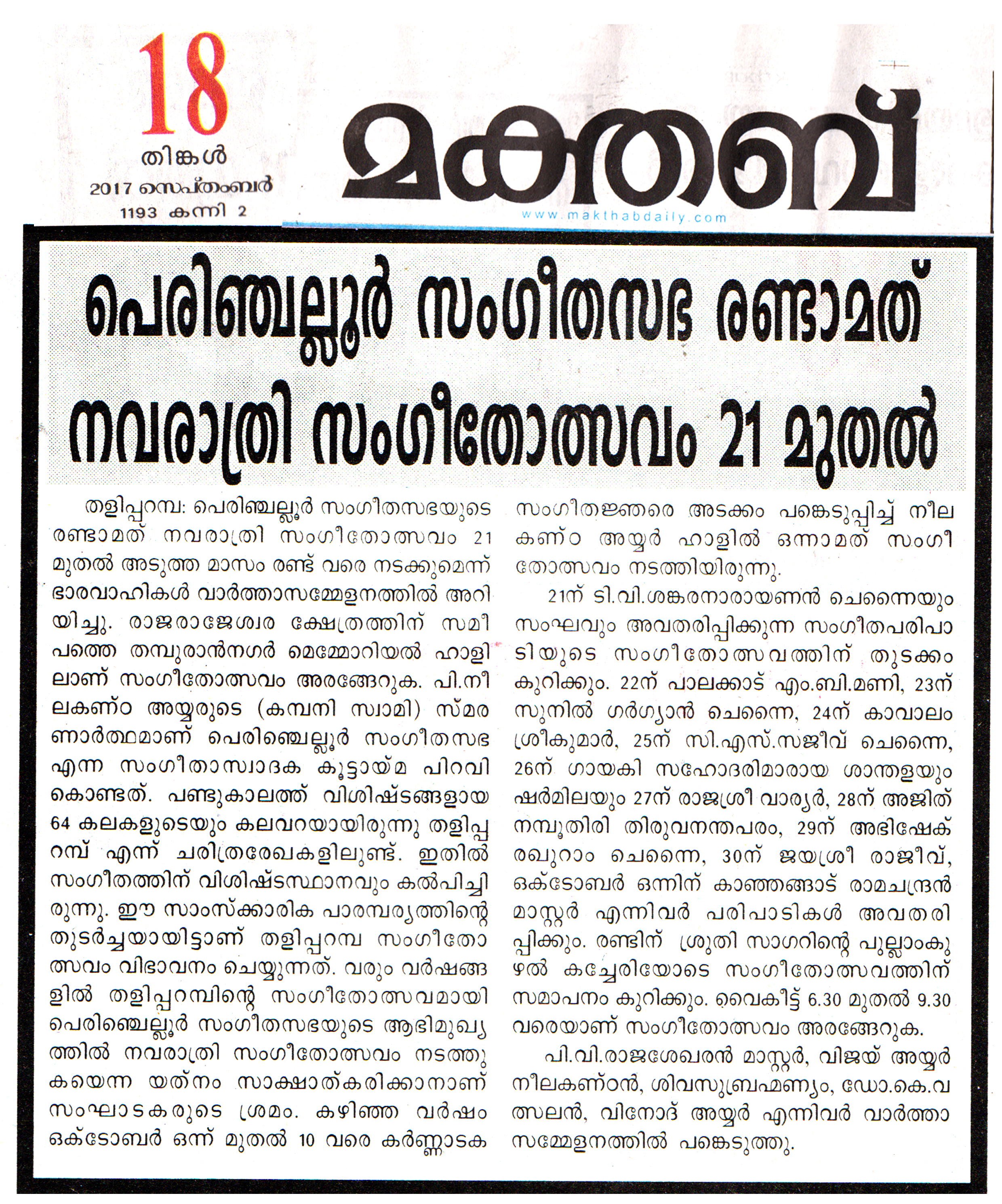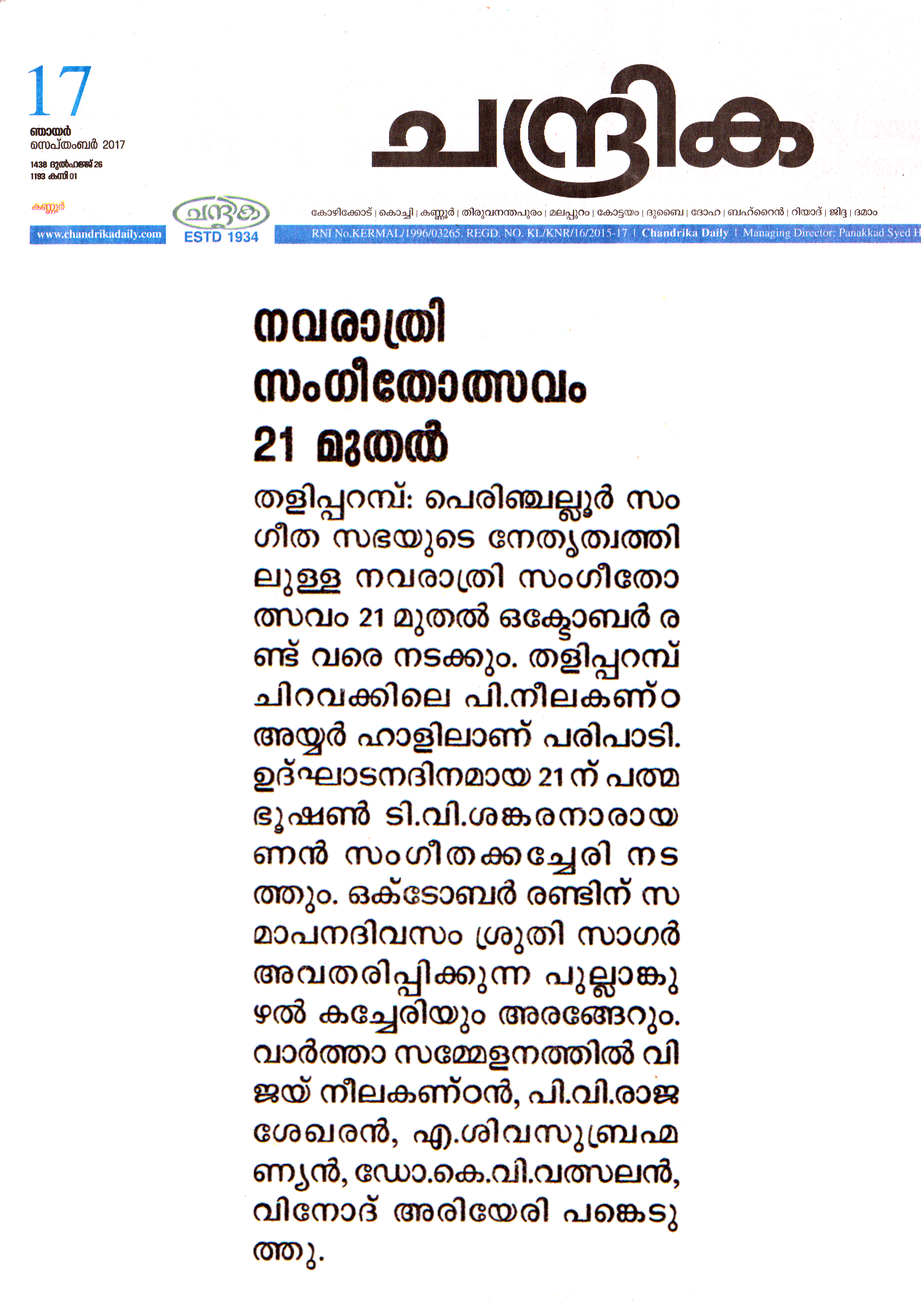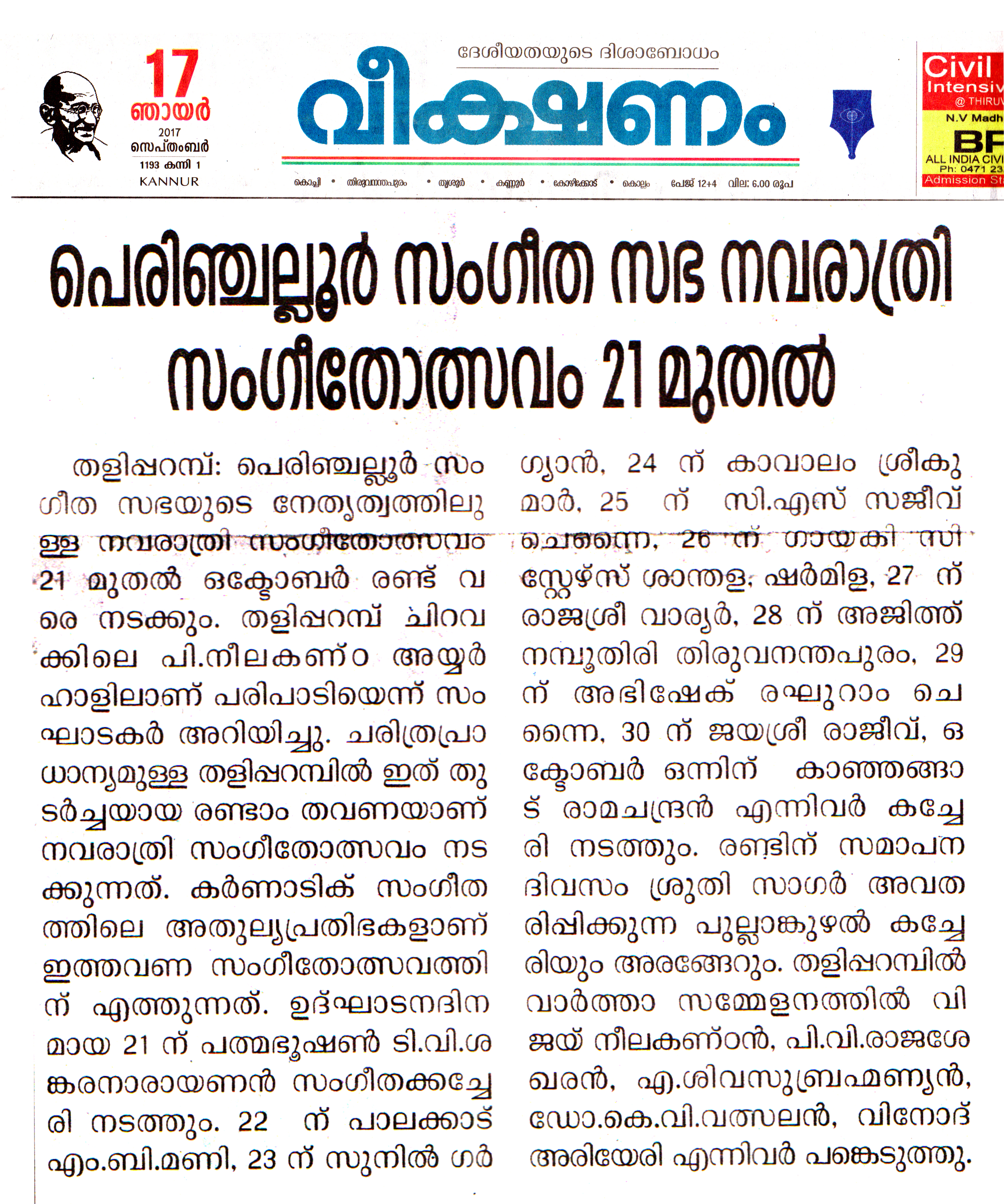 Perumchellur Sangeetha Sabha, Taliparamba (T) conducts the highest quality music concerts every month and Annual Musical Festival during Navaratri. For the first time in the history of Taliparamba, eminent musicians from across India performed during 10 days of Navaratri Sangeetholsavam 2016. Perumchellur Sangeetha Sabha, Taliparamba (T) is pleased to announce its Annual Music Festival 12 days long “2nd Navaratri Sangeetholsavam 2017”. The grand event is from the 21st September to 02nd October 2017. As in the past few years, it will be held at Sri. P. Neelakanta Iyer (Company Swamy) Memorial Hall, Nr Sri Raja Rajeshwara Shiva Temple, Chiravakku, Taliparamba.