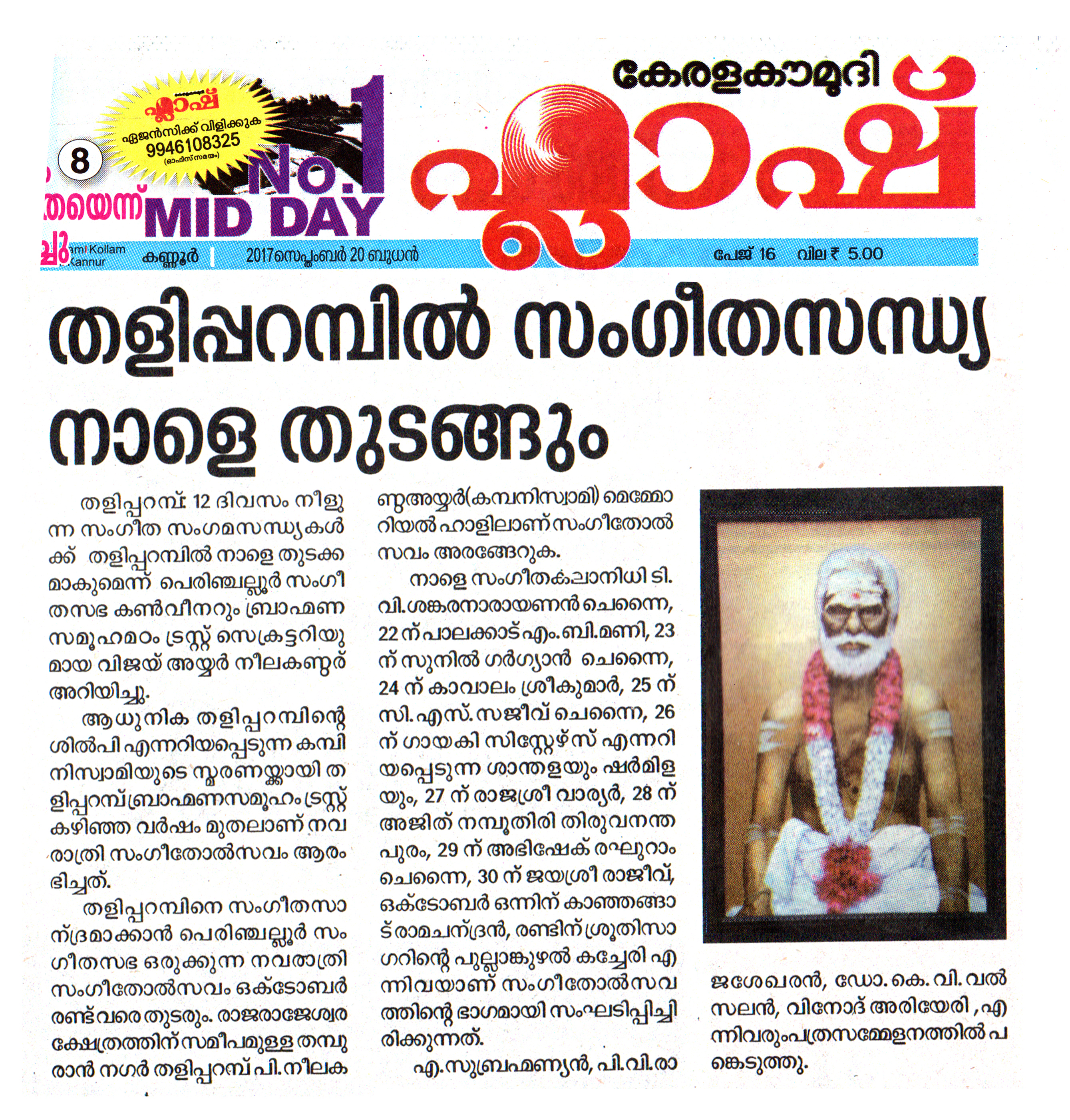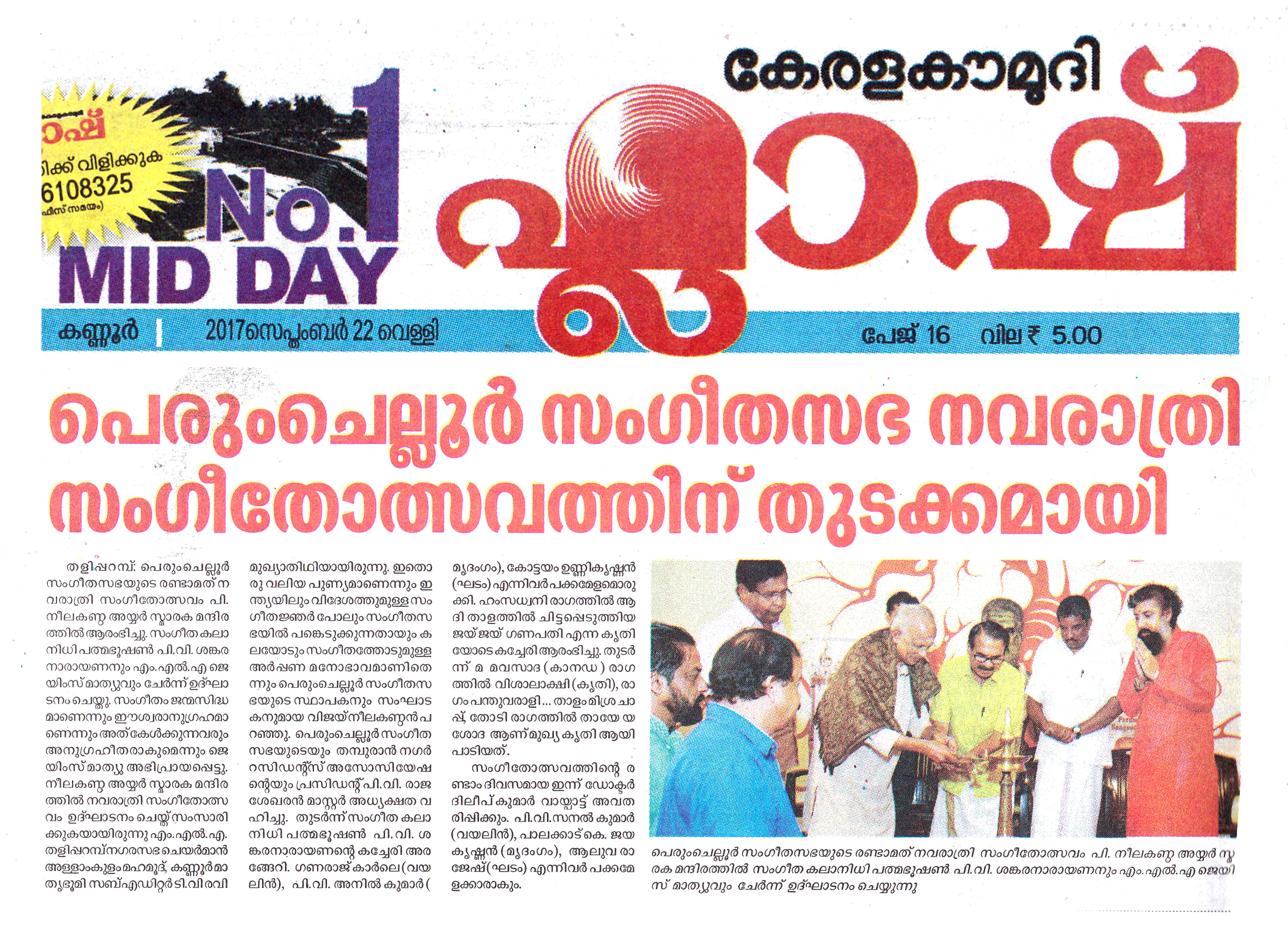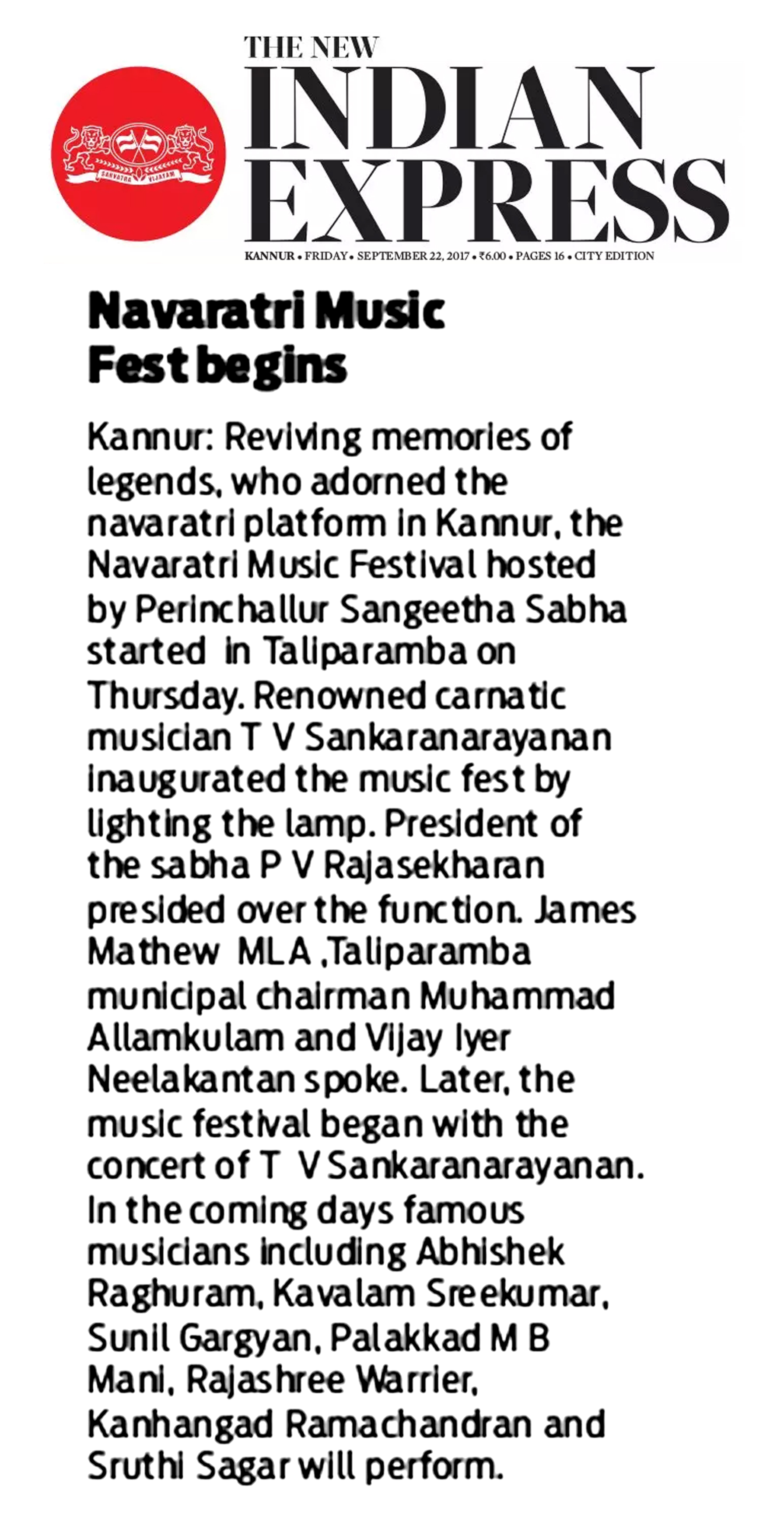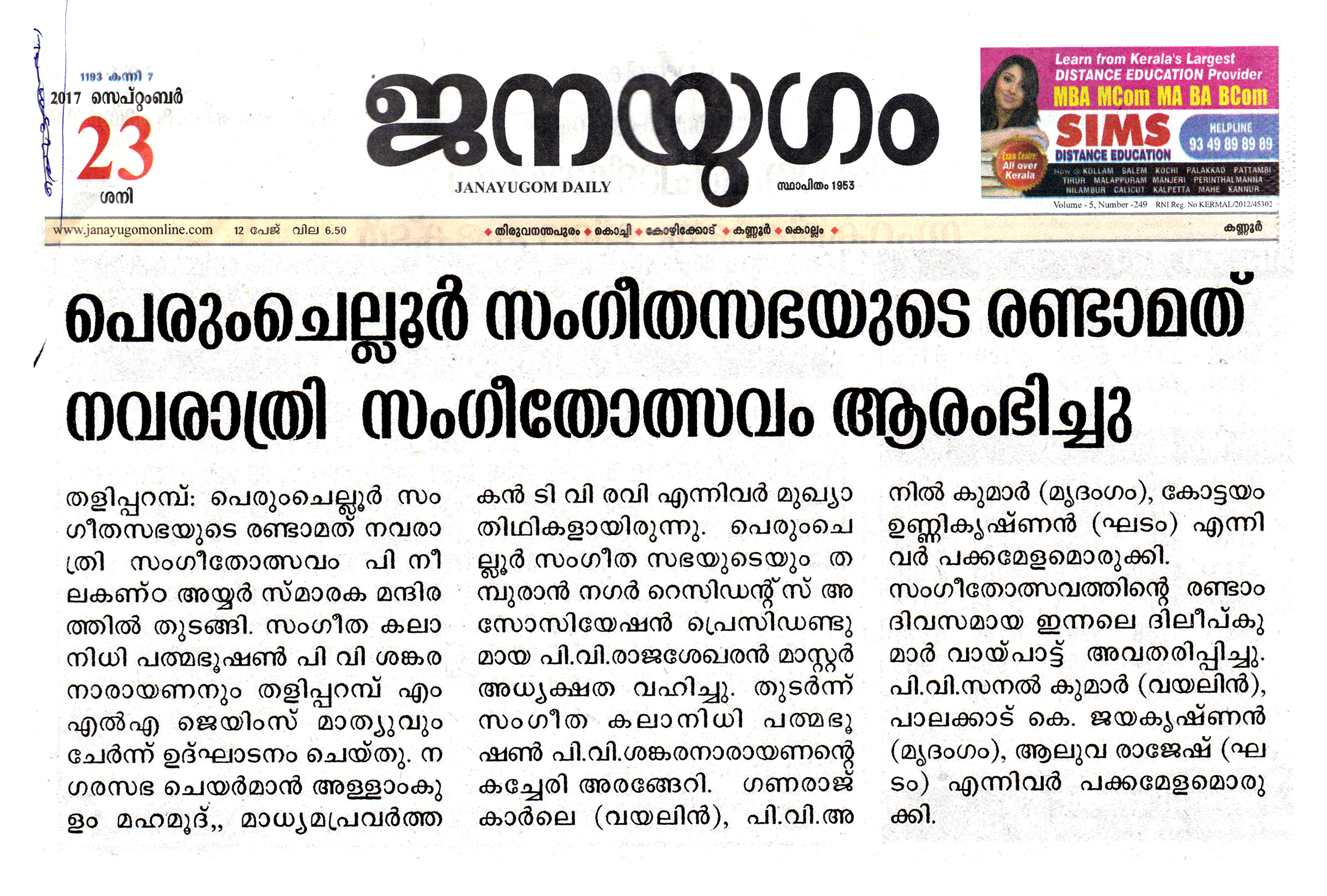 Perumchellur Sangeetha Sabha, Taliparamba (T) conducts the highest quality music concerts every month and Annual Musical Festival during Navaratri. For the first time in the history of Taliparamba, eminent musicians from across India performed during 10 days of Navaratri Sangeetholsavam 2016. Perumchellur Sangeetha Sabha, Taliparamba (T) is pleased to announce its Annual Music Festival 12 days long “2nd Navaratri Sangeetholsavam 2017”. The grand event is from the 21st September to 02nd October 2017. As in the past few years, it will be held at Sri. P. Neelakanta Iyer (Company Swamy) Memorial Hall, Nr Sri Raja Rajeshwara Shiva Temple, Chiravakku, Taliparamba.