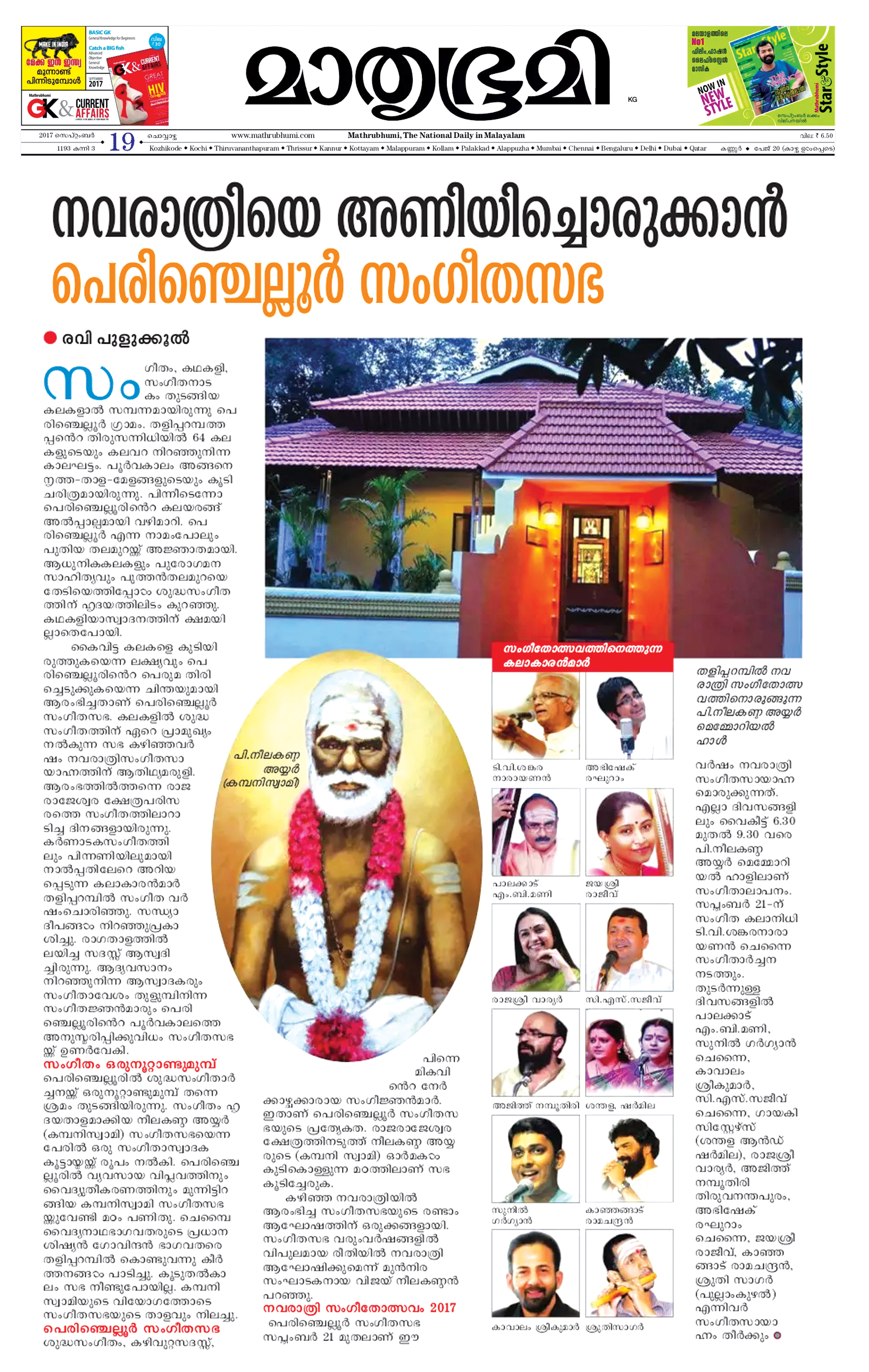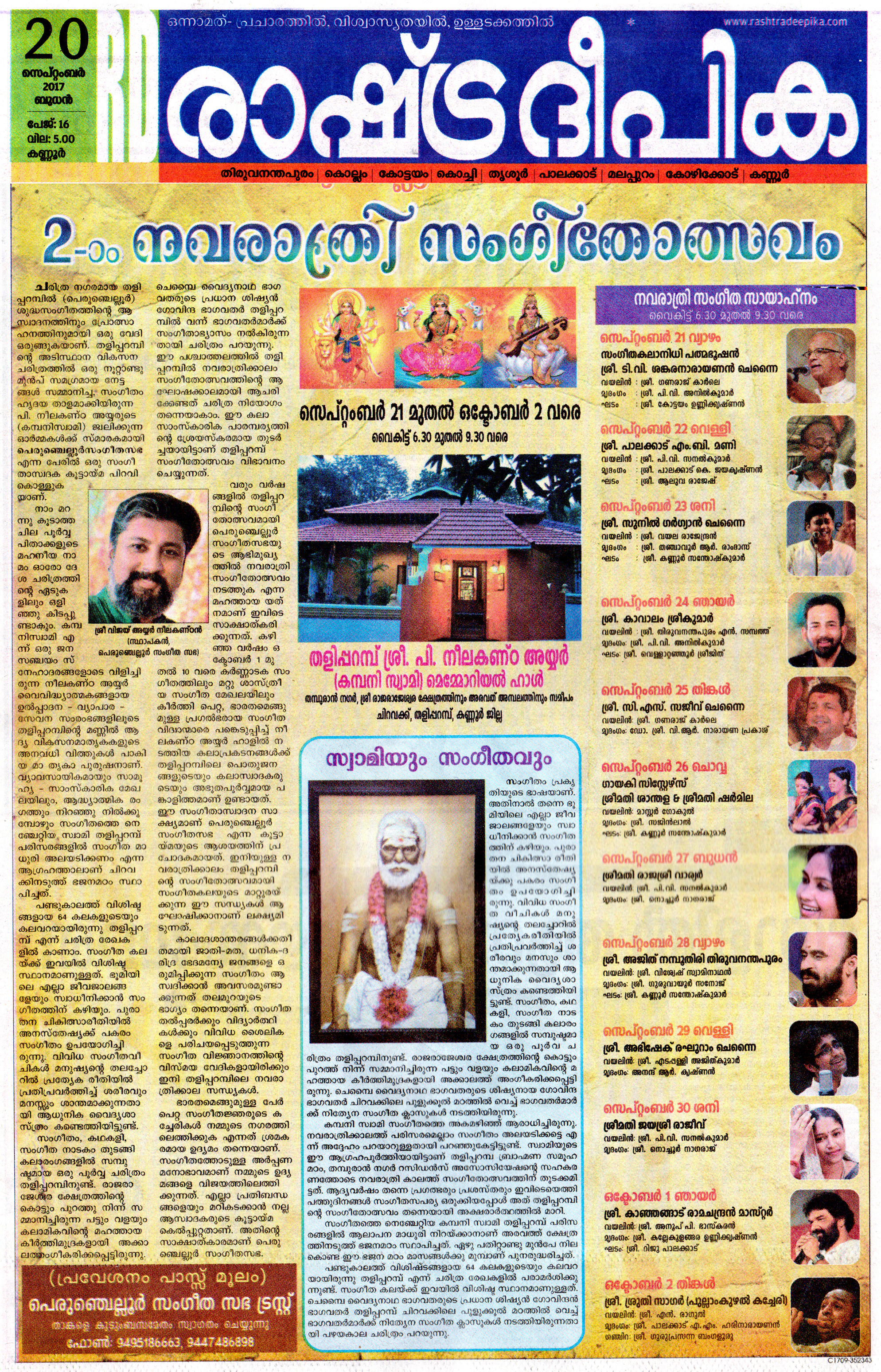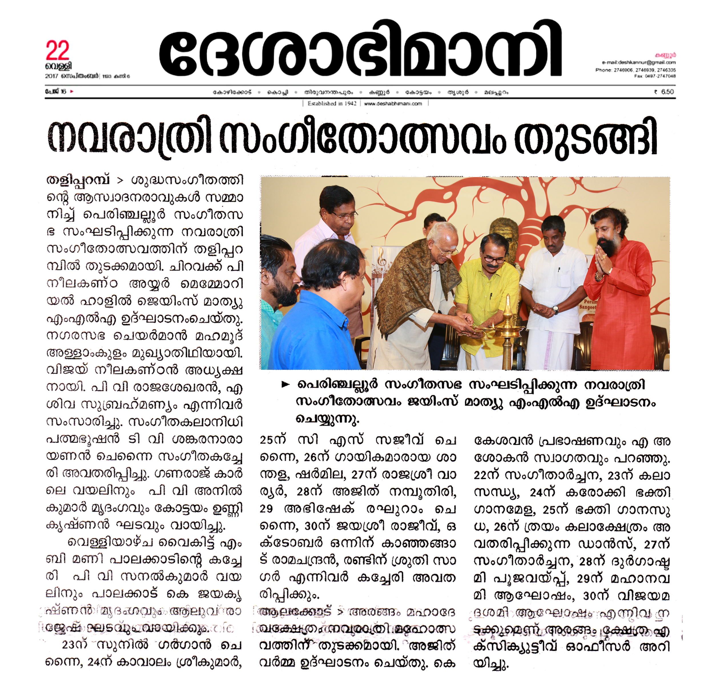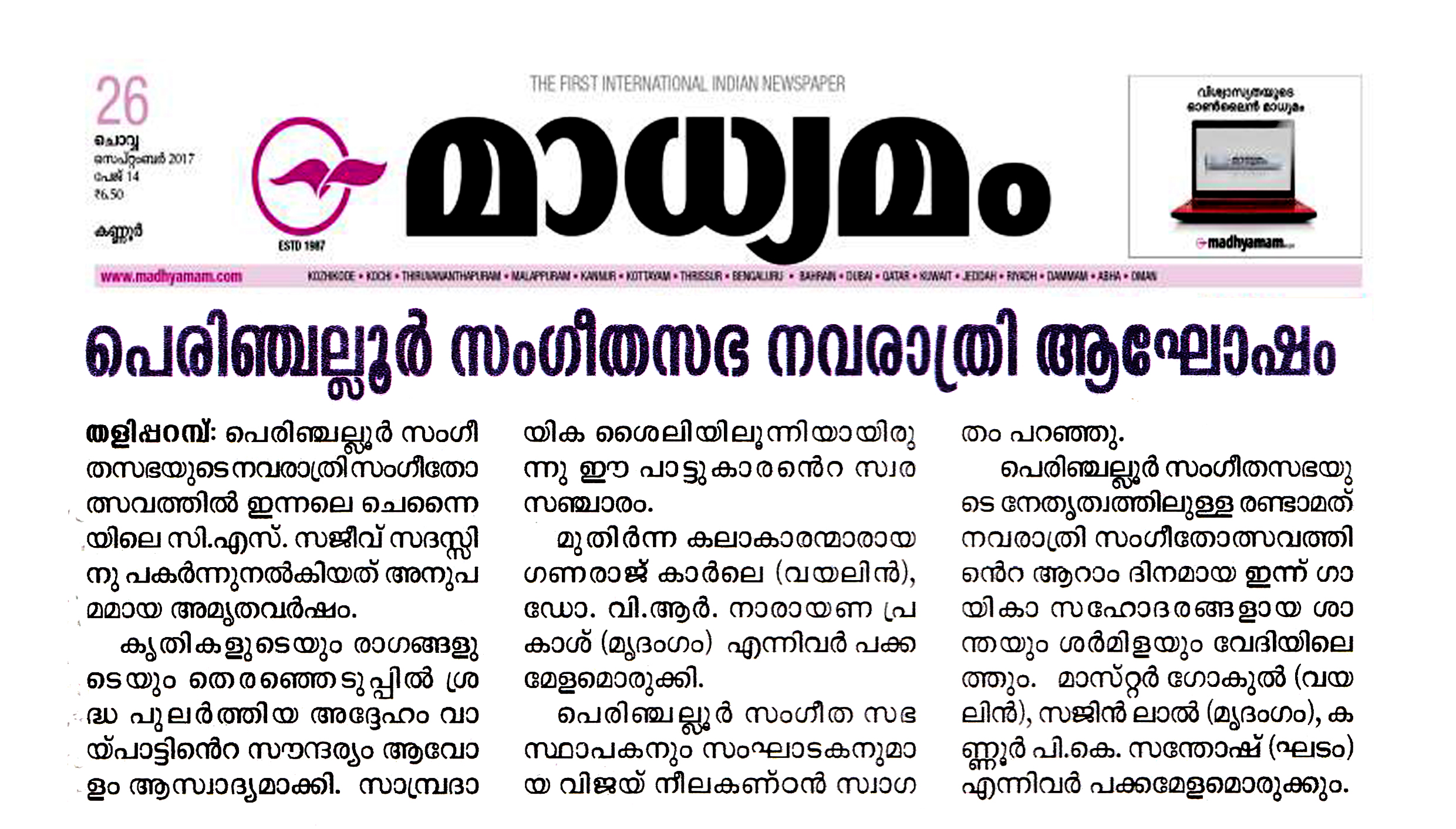 Perumchellur Sangeetha Sabha, Taliparamba (T) conducts the highest quality music concerts every month and Annual Musical Festival during Navaratri. For the first time in the history of Taliparamba, eminent musicians from across India performed during 10 days of Navaratri Sangeetholsavam 2016. Perumchellur Sangeetha Sabha, Taliparamba (T) is pleased to announce its Annual Music Festival 12 days long “2nd Navaratri Sangeetholsavam 2017”. The grand event is from the 21st September to 02nd October 2017. As in the past few years, it will be held at Sri. P. Neelakanta Iyer (Company Swamy) Memorial Hall, Nr Sri Raja Rajeshwara Shiva Temple, Chiravakku, Taliparamba.