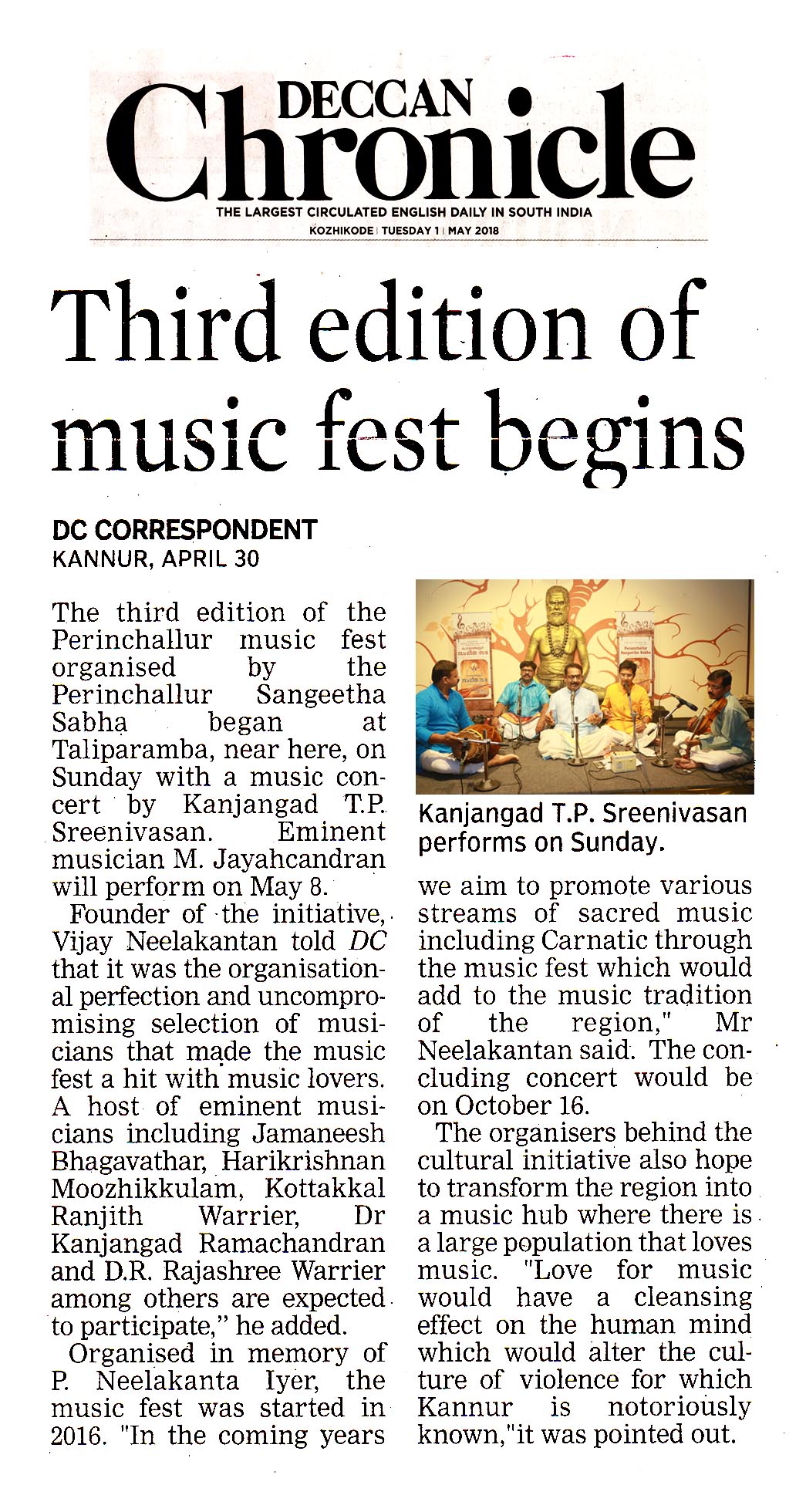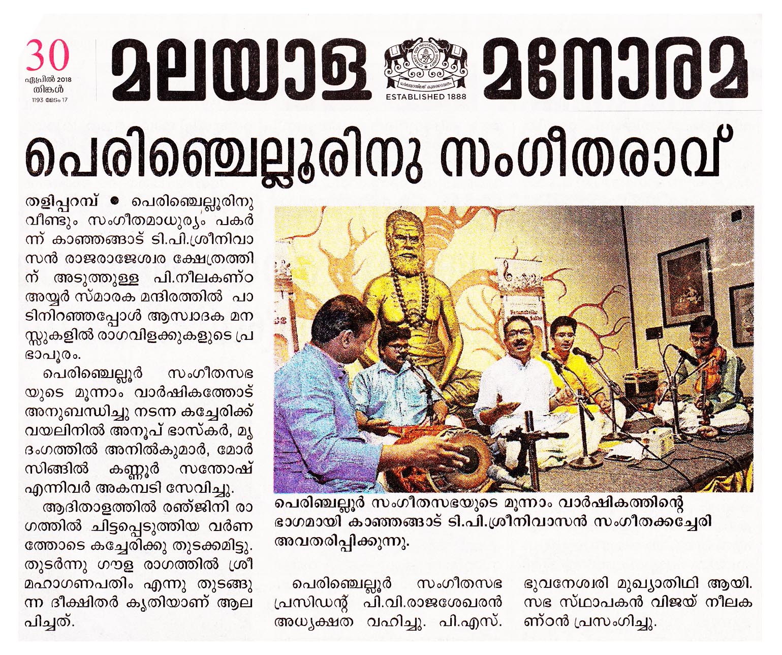 തളിപ്പറമ്പിന്റെ രാജശില്പി എന്ന് അറിയപ്പെടുന്ന ശ്രീ. പി. നീലകണ്ഠ അയ്യർ കമ്പനി സ്വാമിയുടെ ജ്വലിക്കുന്ന ഓർമകൾക്ക് സ്മാരകമായ പെരുംചെല്ലൂർ സംഗീതസഭയുടെ മൂന്നാം വാർഷികത്തോട് അനുബന്ധിച്ചു നടന്ന കച്ചേരി നാദവിസ്മയം സൃഷ്ടിച്ചപ്പോൾ വയലിനിൽ ശ്രീ. അനൂപ് ഭാസ്കരും, മൃദംഗത്തിൽ ശ്രീ. അനിൽ കുമാർ, മൊർസിങ്ങിൽ ശ്രീ. കണ്ണൂർ സന്തോഷ് എന്നിവരും അകമ്പടിയേകി. ശ്രീ. ടി. പി. ശ്രീനിവാസൻ അവർകളുടെ മകൻ ശ്രീ നന്ദ കിഷോർ ഉം കച്ചേരി വേദി പങ്കിട്ടു. ആദി താളത്തിൽ രഞ്ജിനി രാഗത്തിൽ ചിട്ടപ്പെടുത്തിയ വർണത്തോടെ കച്ചേരിക്ക് തുടക്കമിട്ടു. തുടർന്ന് ഗൗള രാഗത്തിൽ ശ്രീ മഹാഗണപതിം എന്ന് തുടങ്ങുന്ന ദീക്ഷിതർ കൃതിയാണ് ആലപിച്ചത്. നാദസുധ- ത്യാഗരാജ കൃതി, ഗോപാലക - രാഗം രേവഗുപ്തി-സ്വാതിതിരുനാൾ കൃതി രാമരാമ – സിംഹേന്ദ്രമധ്യമം - എന്നീ കീർത്തനങ്ങൾ സദസ്സിനു പകർന്നു നൽകിയത് അനുപമമായ അമൃതവർഷം. കൃതികളുടെയും രാഗങ്ങളുടെയും തിരഞ്ഞെടുപ്പിൽ ശ്രദ്ധ പുലർത്തിയ ശ്രീ. ടി. പി. ശ്രീനിവാസൻ വായ്പാട്ടിന്റെ സൗന്ദര്യം ആവോളം ആസ്വാദ്യമാക്കി. സാമ്പ്രദായിക ശൈലിയിലൂന്നിയായിരുന്നു ഈ പാട്ടുകാരന്റെ സ്വരസഞ്ചാരം. പെരുംചെല്ലൂർ സംഗീത സഭ സ്ഥാപകനും സംഘാടകനുമായ ശ്രീ. വിജയ് നീലകണ്ഠൻ സ്വാഗതം പറഞ്ഞു. സഭ പ്രസിഡന്റ് ശ്രീ. പി. വി. രാജശേഖരൻ അധ്യക്ഷ വഹിച്ച ചടങ്ങിൽ ശ്രീമതി. പി. എസ്. ഭുവനേശ്വരി മുഖ്യാതിഥി ആയിരുന്നു. ട്രുസ്ടി ശ്രീ ശിവ സുബ്രമണ്യൻ, ശ്രീ. വിനോദ്, ശ്രീ. ഡോക്ടർ കെ. വി. വത്സലൻ, ശ്രീ. ശേഷാദ്രിനാഥ്, ശ്രീ. എൻ. നീലകണ്ഠൻ, ശ്രീമതി ദീപ രാകേഷ്, ശ്രീമതി സുന്ദരാംബാൾ, ശ്രീ. സി.എച്. കൃഷ്ണൻ, ശ്രീ കെ കെ മോഹനൻ എന്നിവർ നേതൃത്വം നൽകി.