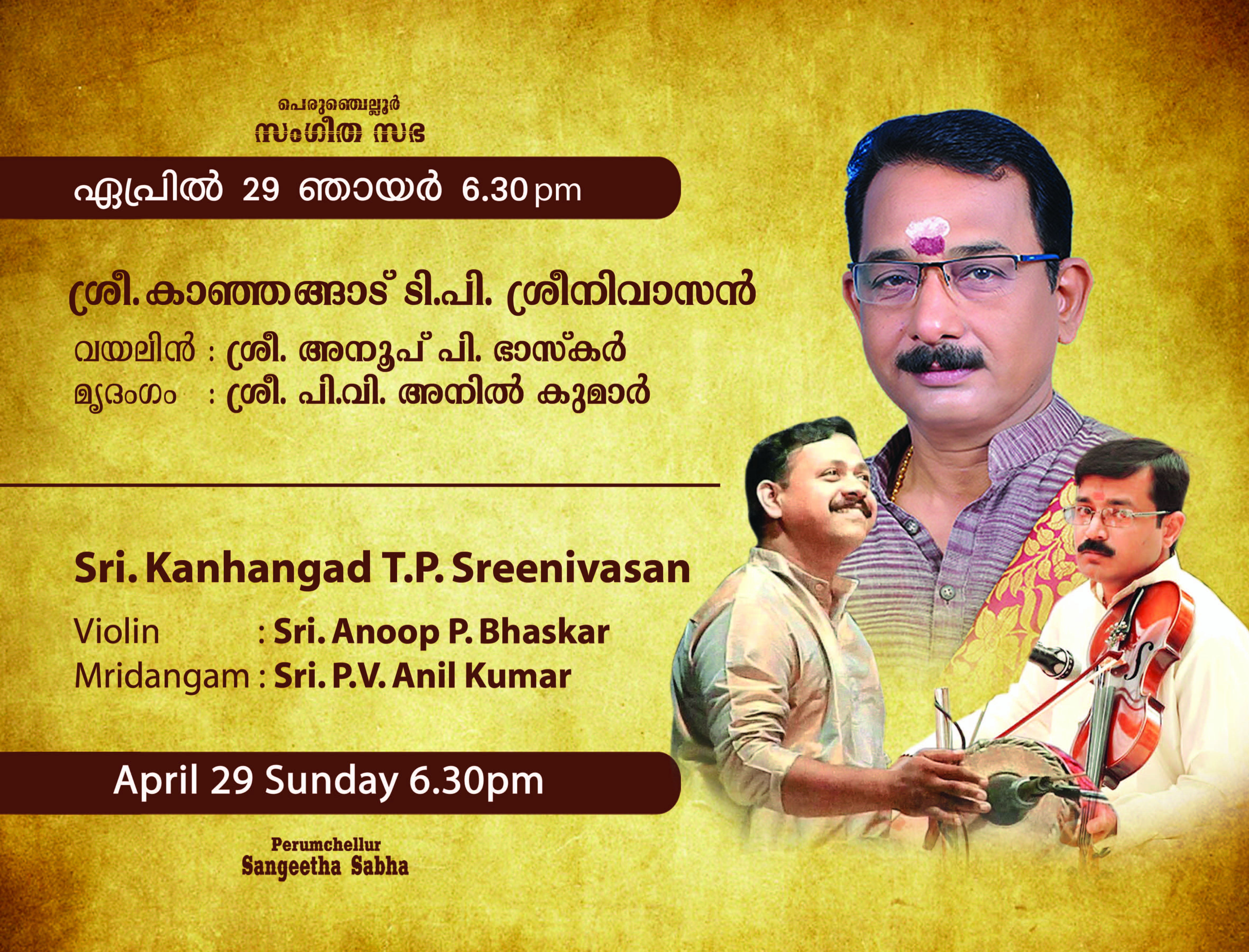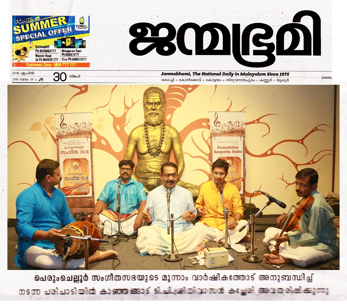Fulfilling Concert from a simple down to earth Artist... His concerts always leave you with a sense of fulfillment - 'Paripurna Trupthi". This concert was yet another gem from this supremely talented, and consistent musician of North Kerala. The keerthanams such as Srimahaganapathi, Kamalambana, Nadasudha, Gopalaka pahima, Ramarama... was splendid and blissful for the rasikas. He delivered it to perfection. Yesterdays concert at Perumchellur Sangeetha Sabha was a clear testimony, how he is committed in preserving carnatic musics rich and original tradition. Sri. Kanhangad T P Sreenivasan born into a family of Musicians.. His father, K. Kunhirama Varrier was a well known Sopana musician. His mother Smt. T.P Omana Amma invited him to Music.He had learned music in Gurukula system for many years under the tutelage of Sri. P.K.S.Varma (Pazhassi Raja) a desciple of Sangeetha Kalanidhi Chembai Vaidyanatha Bhagavathar. Later he joined R.L.V Music College Thripunithura and passed Gana Praveena with colourful results.