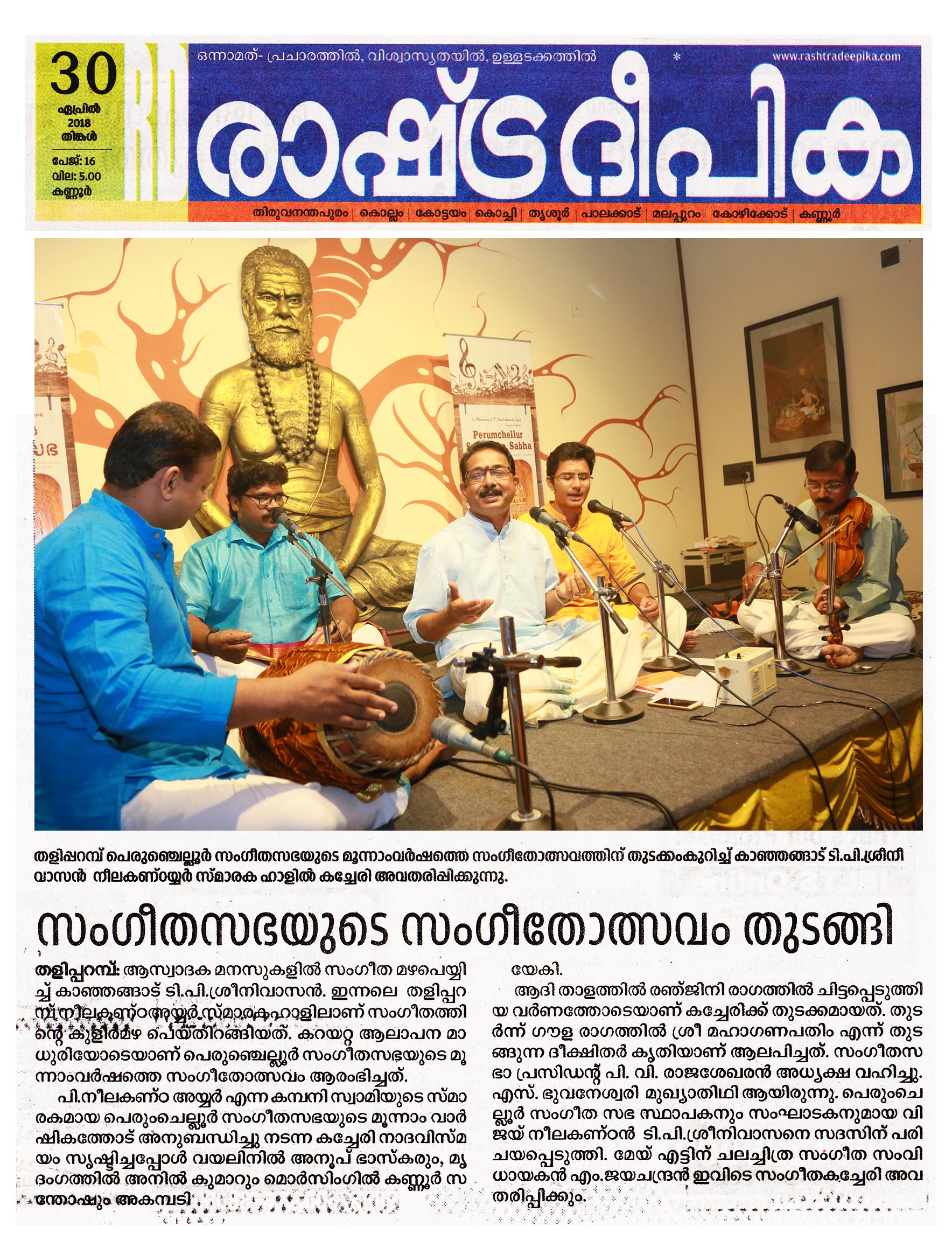 സംഗീതകലയുടെ ഗുരുക്കന്മാർ സഞ്ചരിച്ച പാതയിൽ നിന്ന് വ്യതിചലിക്കാതെ കറയറ്റ ആലാപന മാധുരിയോടെ ശ്രീ. കാഞ്ഞങ്ങാട് ടി. പി. ശ്രീനിവാസൻ ശ്രീ രാജരാജേശ്വര ക്ഷേത്രത്തിനു അടുത്തുള്ള ശ്രീ. പി. നീലകണ്ഠ അയ്യർ സ്മാരക മന്ദിരത്തിൽ പാടിനിറഞ്ഞപ്പോൾ ആസ്വാദക മനസ്സുകളിൽ രാഗവിളക്കുകളുടെ സ്വർണ്ണപ്രഭ.