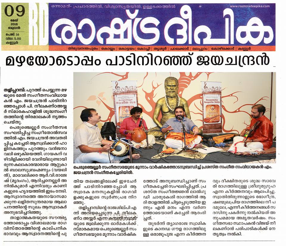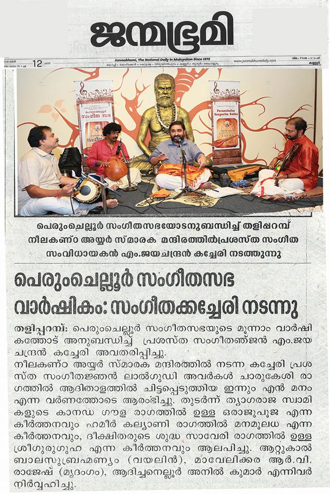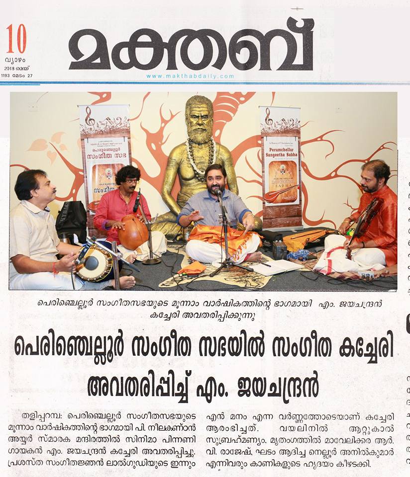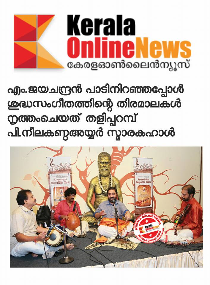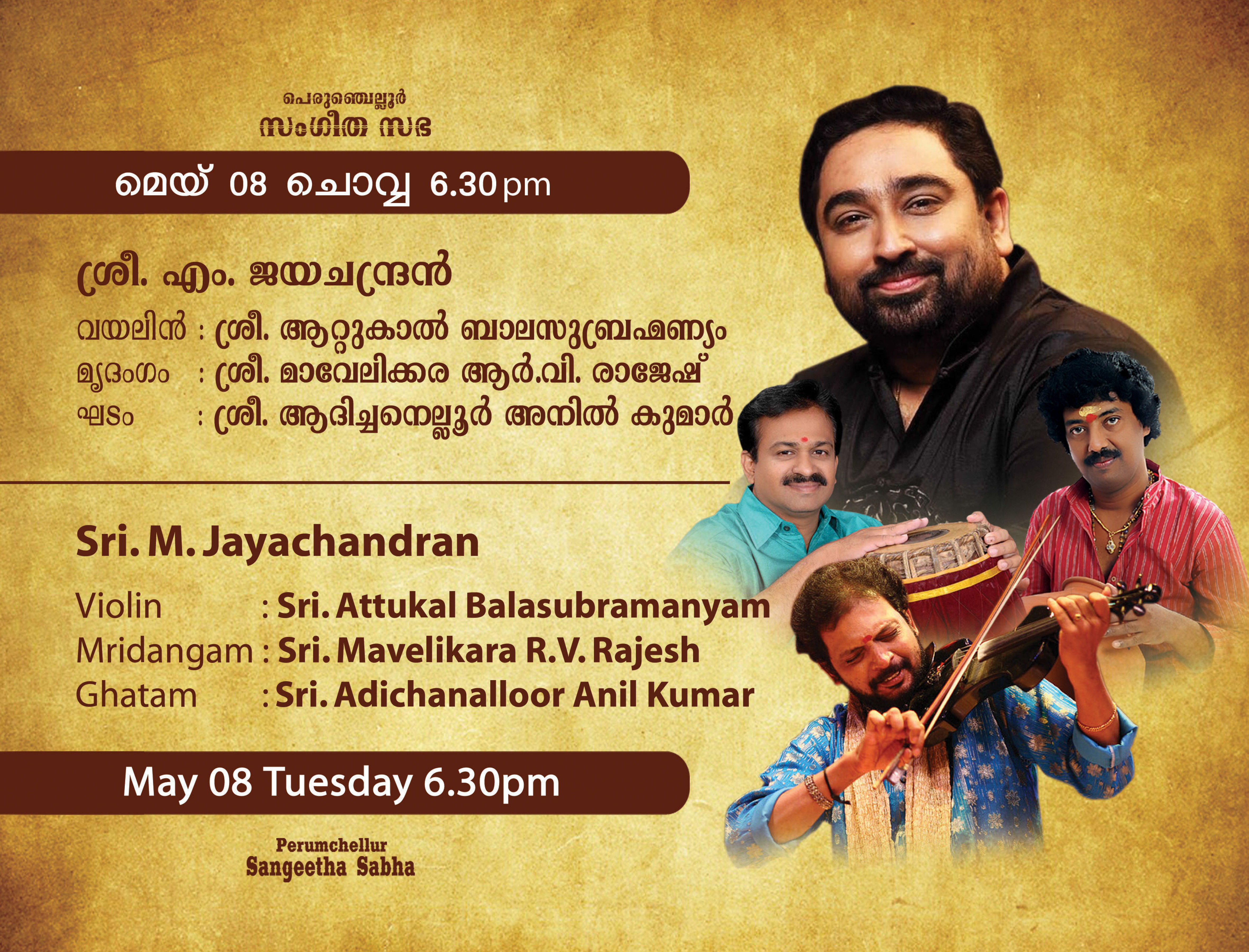 തളിപ്പറമ്പിൽ എം. ജയചന്ദ്രന്റെ കച്ചേരി ശ്രീ രാജരാജേശ്വര ക്ഷേത്രത്തിനു സമീപത്തുള്ള ശ്രീ. പി. നീലകണ്ഠ അയ്യർ സ്മാരക മന്ദിരത്തിൽ പെരുംചെല്ലൂർ സംഗീത സഭയുടെ മൂന്നാം വാർഷികത്തോട് അനുബന്ധിച്ചാണ് കച്ചേരി ഒരുങ്ങുന്നത്. ഭക്തിയും ഭാവവും നിറഞ്ഞു തുളുമ്പുന്ന ആലാപന ശൈലിയിലൂടെ ലോകത്തെ ആനന്ദിപ്പിച്ച അതുല്യ കലാകാരനാണ് ശാസ്ത്രീയ സംഗീത ലോകത്തും സിനിമാ പിന്നണി ഗാന സംവിധാന രംഗത്തും പ്രശസ്തനായ ശ്രീ. എം. ജയചന്ദ്രൻ. പേരുകേട്ട കലാകാർൻന്മാരുടെ ആലാപനങ്ങൾ നേരിട്ട് ആസ്വദിക്കാനുള്ള അവസരം തളിപ്പറമ്പുകാർക്ക് പെരുംചെല്ലൂർ സംഗീത സഭ ഒരുക്കുകയാണ്.
