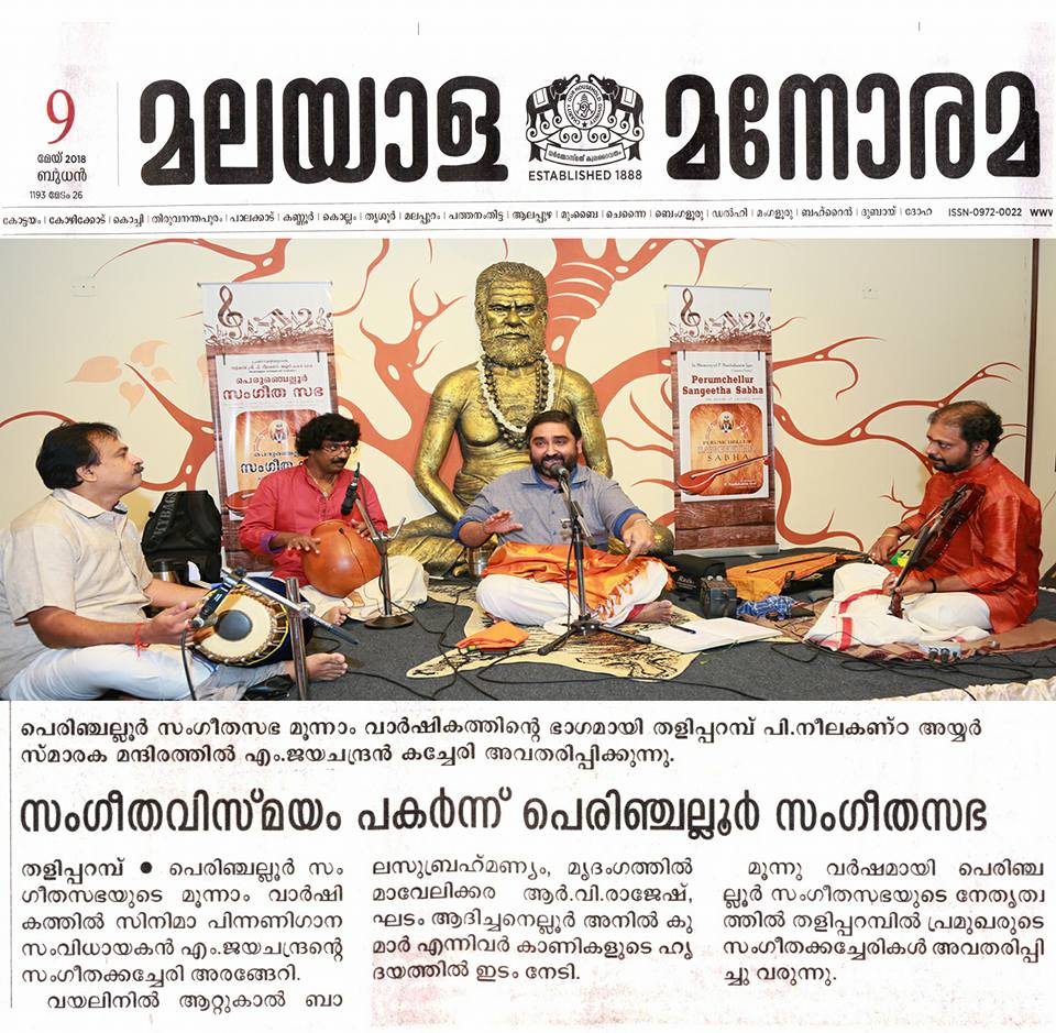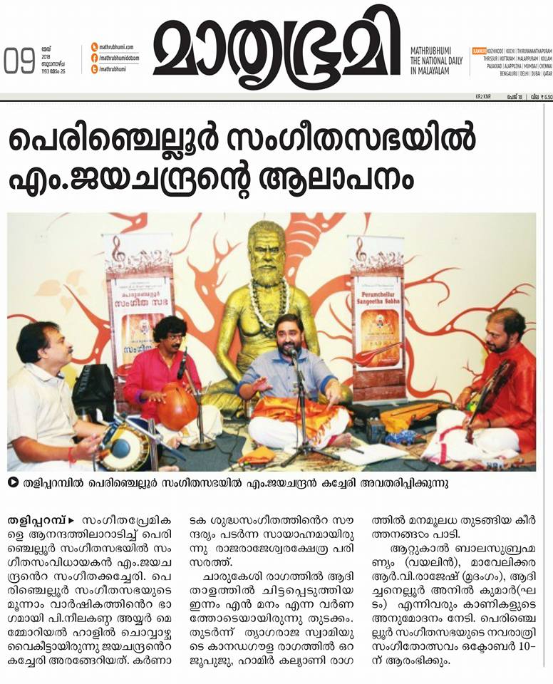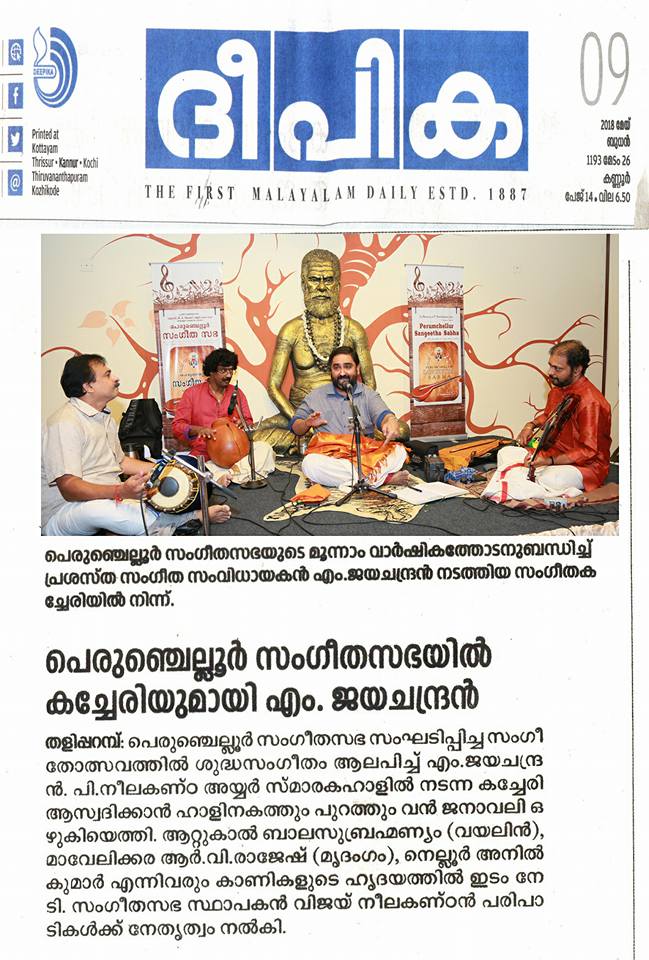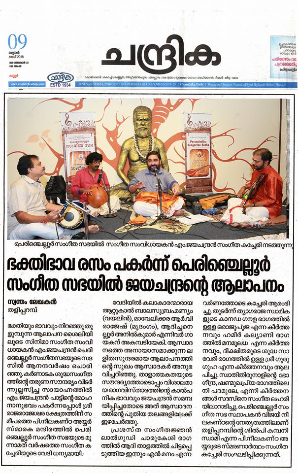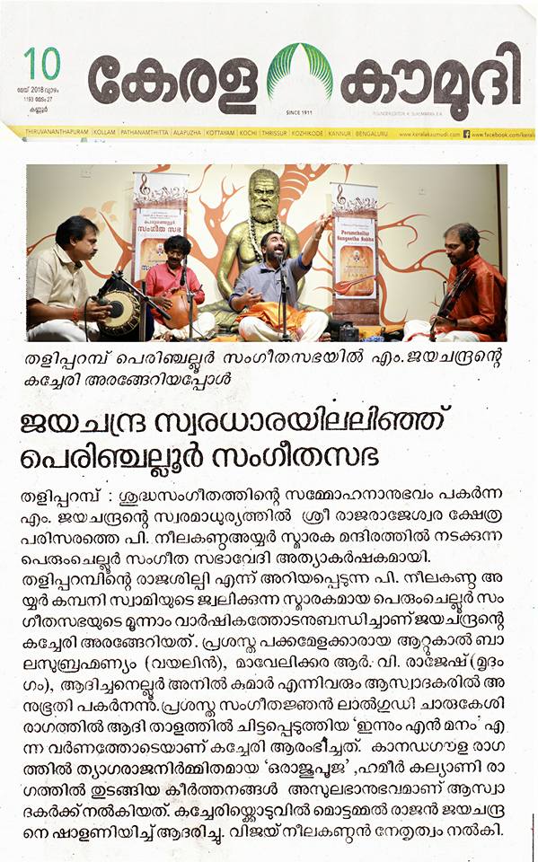A Metaphysical Elevating Experience with MJ Sri. M. Jayachandran A film score composer, singer, and musician performing at Perumchellur Sangeetha Sabha, Taliparamba Kannur Dist Kerala. He has won the Kerala State Film Award for Best Music Director for a record number of seven times. In 2005, he also won the state award for best male singer. Sangeetha Rathnam, Sri. M. Jayachandran’s concert at Perumchellur Sangeetha Sabha, Taliparamba had aroused everyone’s interest as was seen by the audience beyond the full-house that had gathered to listen to him. Just before the start of the concert I was told by his personal assistant & accompanying artists that the concert will end by 9pm & have the post concert arrangements accordingly. I didn’t have doubts as on the previous evening at Mattannur Sangeetha Sabha, MJ sang only for 1 hr 20 min. MJ's concerts whip up a great amount of anticipation, expectations and excitement. The heartening factor is that always he delivers what is expected from him. Each of his concerts has something novel & presented to the Rasika like a dazzling diamond set in a fine piece of jewellery. His Aalapanas were inspiring too. And no need to mention his repertoire ... each keerthanam acquires charm and glory at his hands and served with great fervor. His singing had an intensity that is also conveyed through his body language … very pleasing to the senses. He transformed the concert to a meditative journey… a great unforgettable classic musical experience! All of a sudden we realized it was 10.25 pm!!! He seemed energetic & fresh. When I turned back, I found even the rasikas very cheerful & in an unbelievable expression - how he is able to sing like this! MJ then stated…he was guided by a strong SPIRITUAL PRESENCE that made him to extent the concert till 10.25pm. The hall is very divine. For more than 70 years continuously our ancestors had performed pooja, bhajans & other noble deeds in this space. So that positive energy still is vibrant and gets showered on all of us. Enlightened personality Sri. P.Neelakanta Iyer is like a spiritual dynamos; have a very strong presence which touches the people; transmit something of their enlightenment to us even if they don’t exist in physical form. This feel by MJ didn’t come as a surprise to me because all the artists who performed here had shared the same spiritual experience. Even artists and rasikas who aren’t at all spiritual usually feel a sense of well-being in this space. For people who have made some spiritual progress already, the effect can be extremely powerful. No wonder MJ performed for 3 hours & 25 minutes! Sri. Attukaal Balasubramanyam on the violin was equal to the task. He followed a clear line that helped him to play with incredible ease and grace. His answering during the swara sessions exhibited astuteness and his bowing retained its sweetness always. Sri. Mavelikkara R.V.Rajesh on the mridangam fitted the slot exceptionally well. His accompanying style for songs was purely on a need-based approach. He gave a thani of substance that had a combination of strokes and nadais of absorbing variety and quality. Sri. Adichanellur Anil kumar on the Ghatam was a proof to the fact that loudness does not necessarily make good music. His playing was very aesthetic. Anil Kumar’s Ghatam accompanying style asusual was the best of its kind. Nature too blessed us with good rains…we realized when we came out of the concert hall! We couldn’t have asked for more! Both MIND & ENVIRONMENT at cool...