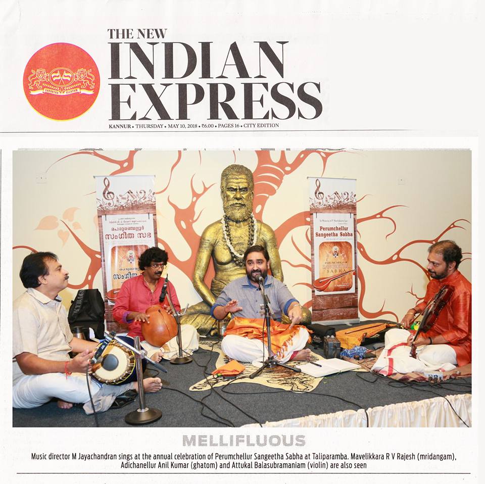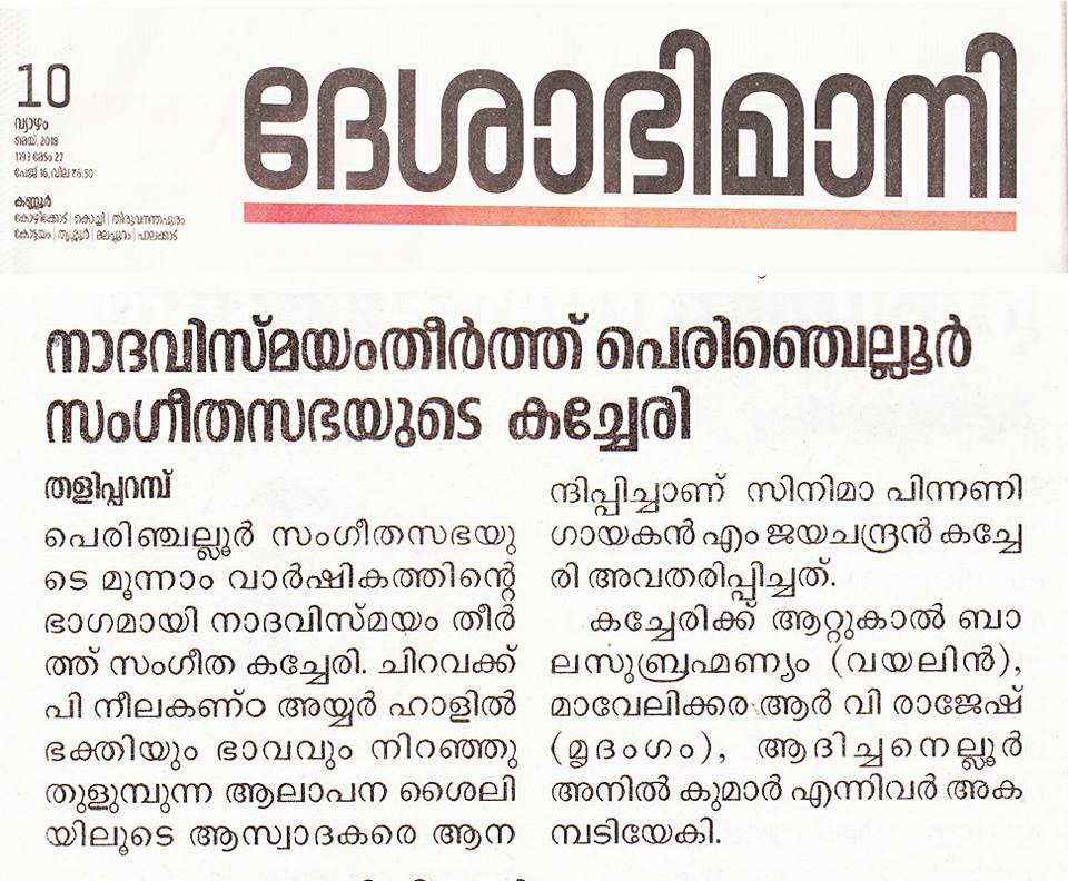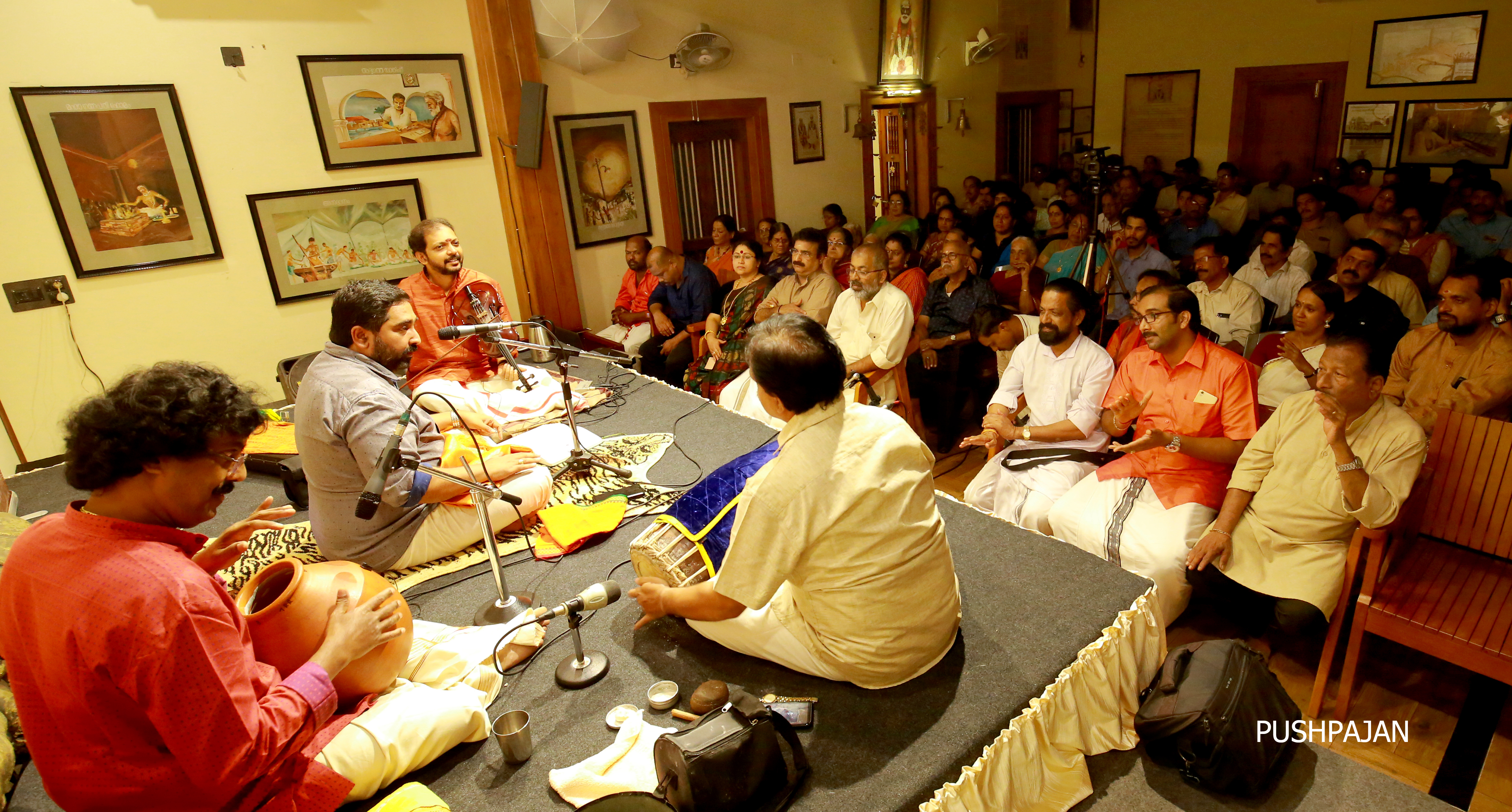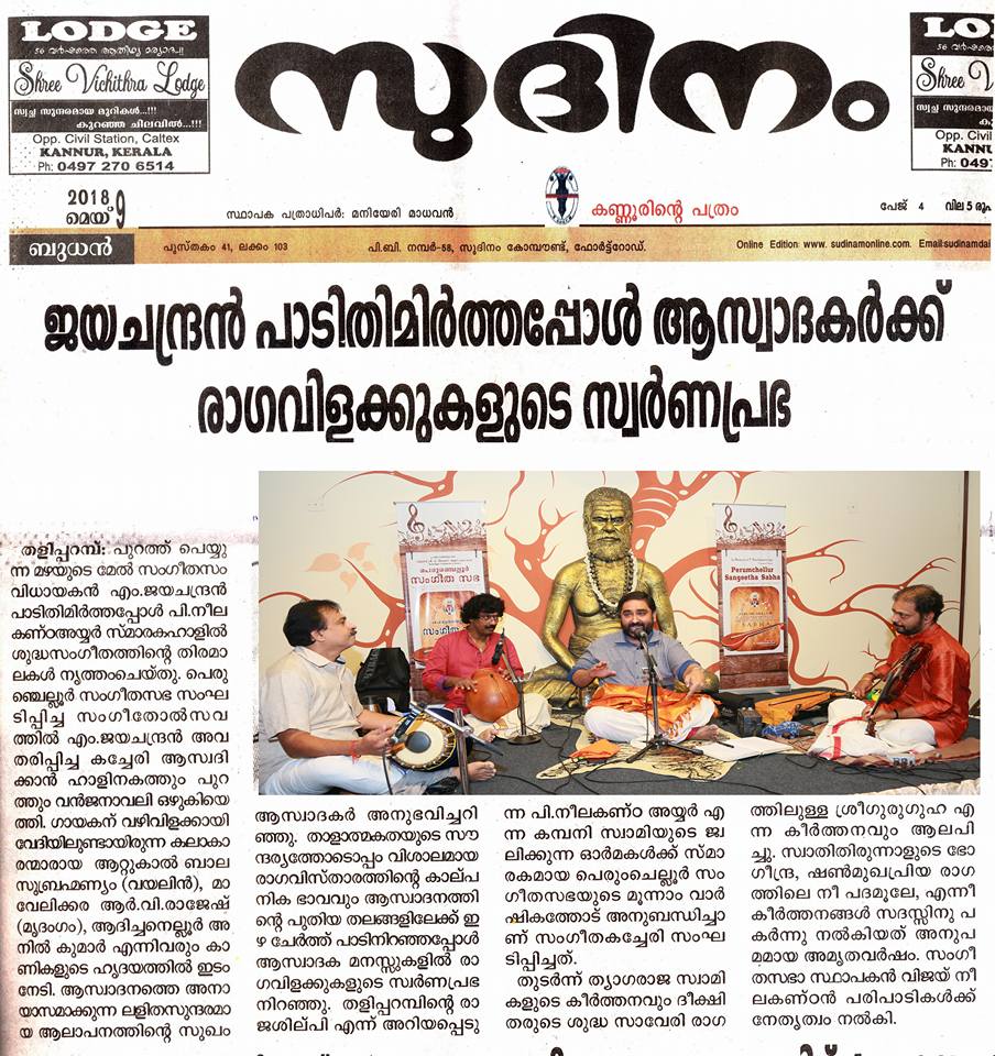 A Metaphysical Elevating Experience with MJ Sri. M. Jayachandran A film score composer, singer, and musician performing at Perumchellur Sangeetha Sabha, Taliparamba Kannur Dist Kerala. He has won the Kerala State Film Award for Best Music Director for a record number of seven times. In 2005, he also won the state award for best male singer. Sangeetha Rathnam, Sri. M. Jayachandran’s concert at Perumchellur Sangeetha Sabha, Taliparamba had aroused everyone’s interest as was seen by the audience beyond the full-house that had gathered to listen to him. Just before the start of the concert I was told by his personal assistant & accompanying artists that the concert will end by 9pm & have the post concert arrangements accordingly. I didn’t have doubts as on the previous evening at Mattannur Sangeetha Sabha, MJ sang only for 1 hr 20 min. MJ's concerts whip up a great amount of anticipation, expectations and excitement. The heartening factor is that always he delivers what is expected from him. Each of his concerts has something novel & presented to the Rasika like a dazzling diamond set in a fine piece of jewellery. His Aalapanas were inspiring too. And no need to mention his repertoire ... each keerthanam acquires charm and glory at his hands and served with great fervor. His singing had an intensity that is also conveyed through his body language … very pleasing to the senses. He transformed the concert to a meditative journey… a great unforgettable classic musical experience! All of a sudden we realized it was 10.25 pm!!! He seemed energetic & fresh. When I turned back, I found even the rasikas very cheerful & in an unbelievable expression - how he is able to sing like this! MJ then stated…he was guided by a strong SPIRITUAL PRESENCE that made him to extent the concert till 10.25pm. The hall is very divine. For more than 70 years continuously our ancestors had performed pooja, bhajans & other noble deeds in this space. So that positive energy still is vibrant and gets showered on all of us. Enlightened personality Sri. P.Neelakanta Iyer is like a spiritual dynamos; have a very strong presence which touches the people; transmit something of their enlightenment to us even if they don’t exist in physical form. This feel by MJ didn’t come as a surprise to me because all the artists who performed here had shared the same spiritual experience. Even artists and rasikas who aren’t at all spiritual usually feel a sense of well-being in this space. For people who have made some spiritual progress already, the effect can be extremely powerful. No wonder MJ performed for 3 hours & 25 minutes! Sri. Attukaal Balasubramanyam on the violin was equal to the task. He followed a clear line that helped him to play with incredible ease and grace. His answering during the swara sessions exhibited astuteness and his bowing retained its sweetness always. Sri. Mavelikkara R.V.Rajesh on the mridangam fitted the slot exceptionally well. His accompanying style for songs was purely on a need-based approach. He gave a thani of substance that had a combination of strokes and nadais of absorbing variety and quality. Sri. Adichanellur Anil kumar on the Ghatam was a proof to the fact that loudness does not necessarily make good music. His playing was very aesthetic. Anil Kumar’s Ghatam accompanying style asusual was the best of its kind. Nature too blessed us with good rains…we realized when we came out of the concert hall! We couldn’t have asked for more! Both MIND & ENVIRONMENT at cool...