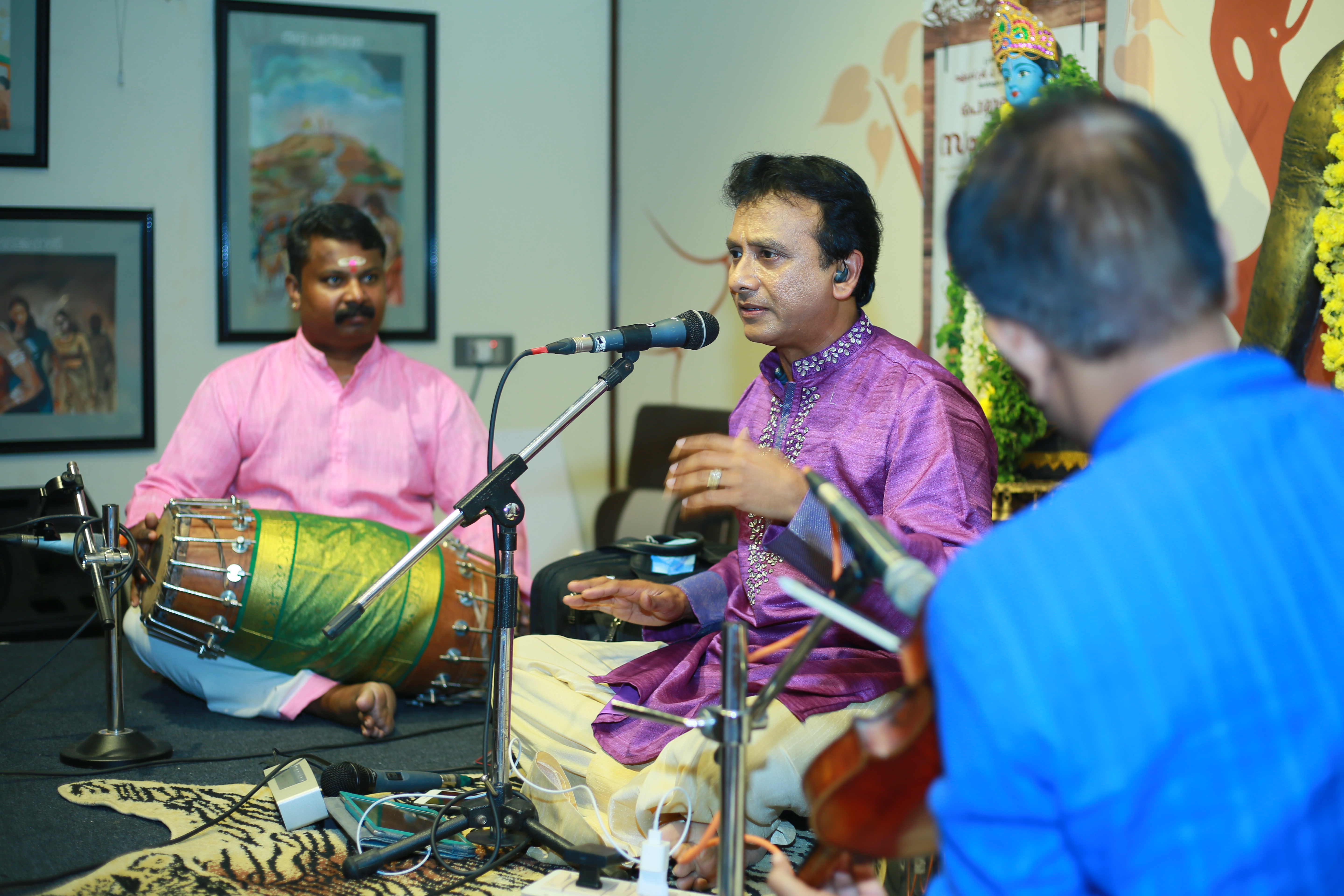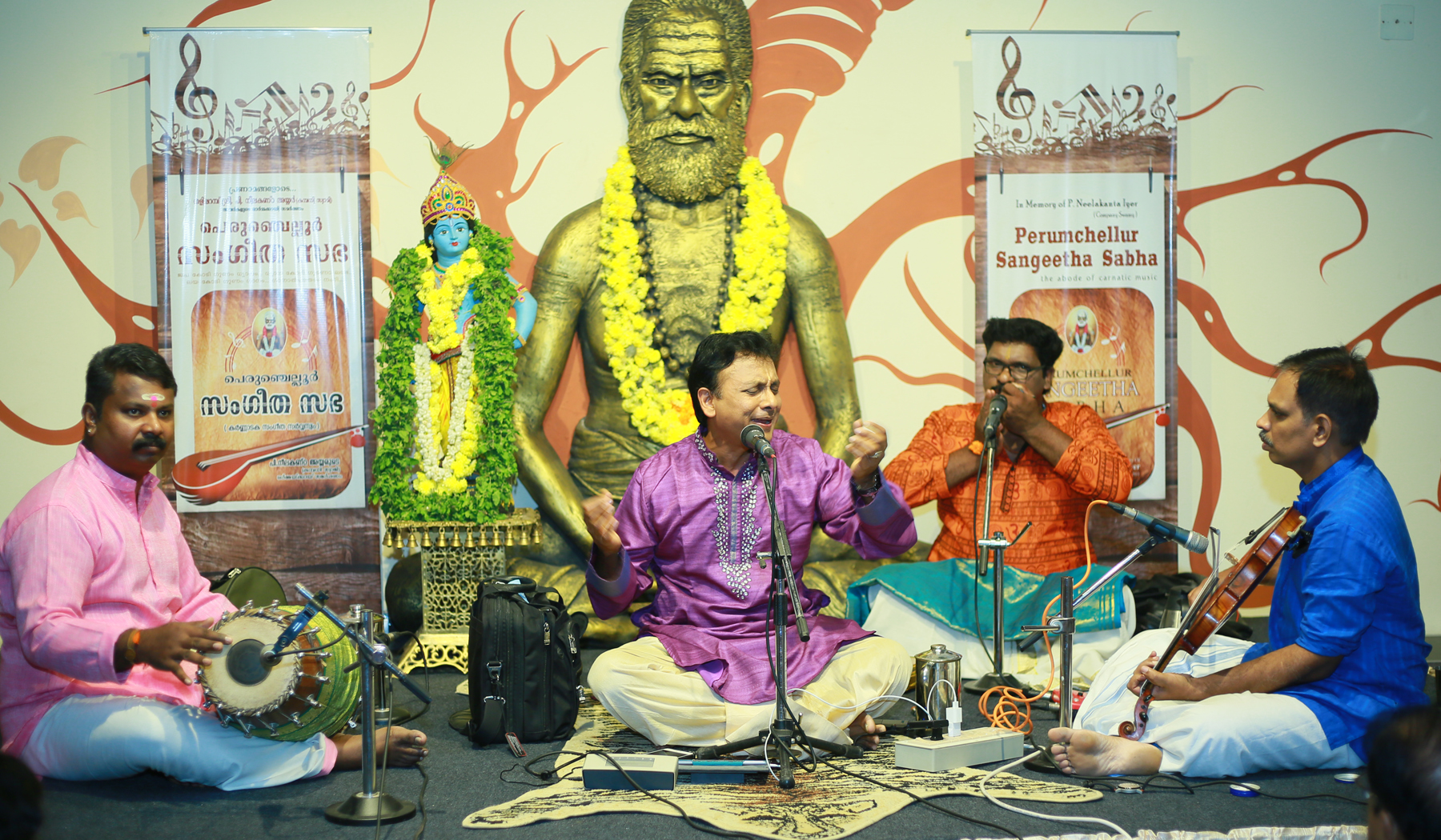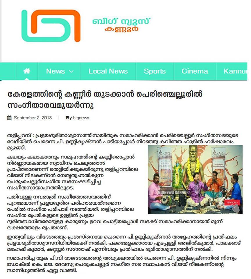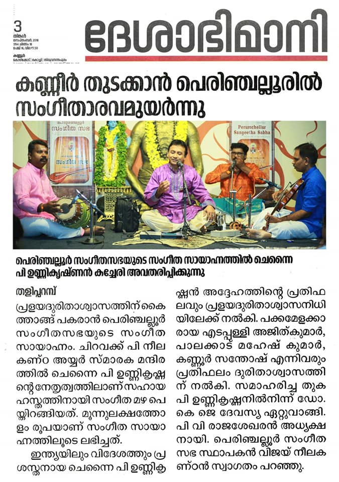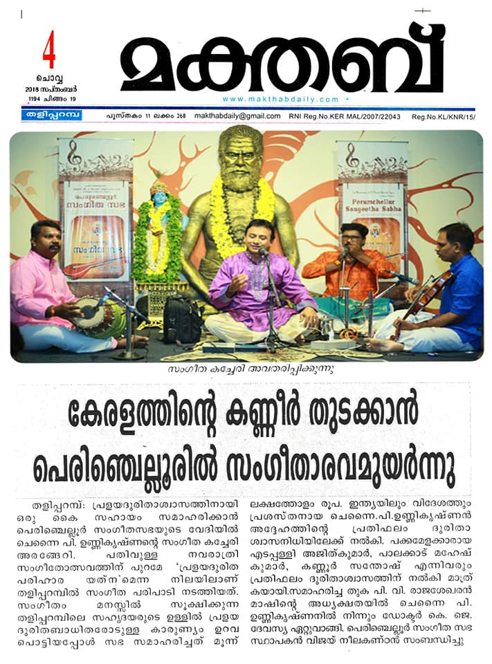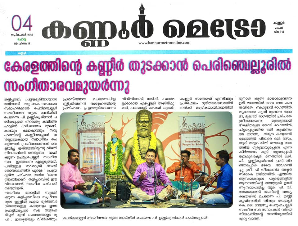 An enticing concert by Kalaimamani Sri. P. Unnikrishnan at Perumchellur Sangeetha Sabha for raising fund for Kerala Flood Relief Rehab. We had been looking forward to his concert for years. His concerts are always filled with divinity. Here too, on as auspicious day “Gokulashtami”, rasikas’ was showered with memorable Carnatic recital at Sri. P. Neelakanta Iyer Memorial Hall, Taliparamba. He left the stamp of his mastery everywhere & power packed deliverance sent the audience to raptures What better accompanying artists we can ask for - violinist Sri Edappally Ajith Kumar, Sri. Palakkad Mahesh Kumar on mridangam & Sri. Kannur Santhosh with Morsing. What else to expect in a concert that had accomplished artists sitting on stage and performing together! Such a delight to hear and an asset to any concert they perform in. It is always amazing how quickly all these artists settle down during a concert and captivates the audience from the get-go! He aptly chose the theme around Lord Krishna on the very auspicious day of `Gokulashtami'. This concert was yet another gem from this supremely talented and consistent musician. Effortlessly rendering perfection, song after song! We are grateful ... expressing our Gratitude ...