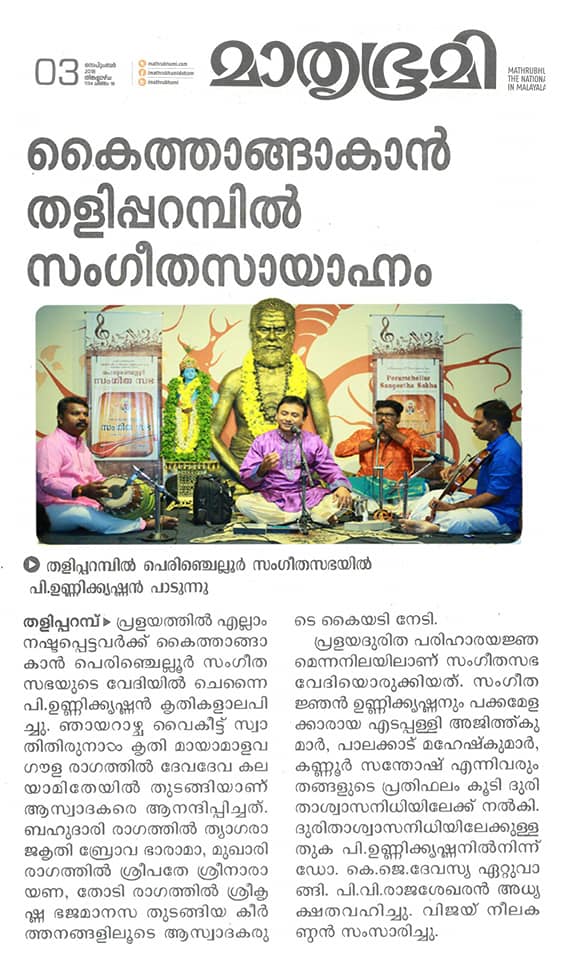 #സംഗീതമഴയായി #പി. #ഉണ്ണികൃഷ്ണൻ #ശുദ്ധമായ #സംഗീതം. സുഖകരമായ ആലാപനം. പ്രശസ്ത സംഗീതജ്ഞന് പി. ഉണ്ണികൃഷ്ണന്റെ സംഗീതക്കച്ചേരി ആസ്വാദ്യകരമായി. പ്രളയദുരിത ബാധിതരെ ഒരു കൈ സഹായിക്കുക എന്ന മഹത് ഉദ്ദേശത്തിന്റെ ഭാഗമായി പെരുഞ്ചെല്ലൂർ സംഗീതസഭ, തളിപ്പറമ്പിൽ യശ:ശ്ശരീരനായ ശ്രീ.പി. നീലകണ്o അയ്യർ ( കമ്പനി സ്വാമി) സ്മാരകാലയ ഹാളിലായിരുന്നു കച്ചേരി നടന്നത്. ഇടപ്പള്ളി അജിത് കുമാർ (വയലിന്), പാലക്കാട് മഹേഷ് കുമാർ (മൃദംഗം), ശ്രീ. കണ്ണൂർ സന്തോഷ് (മുഖർ ശംഖ്) എന്നിവരുടെ പക്കമേളവും ഗംഭീരമായി. പ്രശസ്ത പരിസ്ഥിതി സ്നേഹിയും, പാമ്പ് നിരീക്ഷകനും, പെരുഞ്ചെല്ലൂർ സംഗീതസഭ സ്ഥാപകനുമായ ശ്രീ. #വിജയ് #നീലകണ്ഠനാണ് പരിപാടി സംഘടിപ്പിച്ചത്.