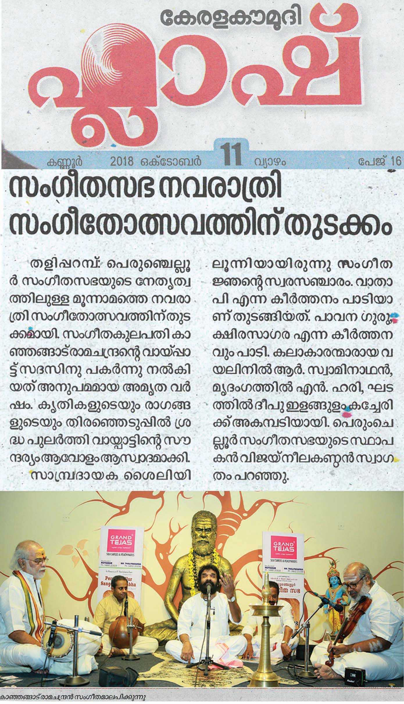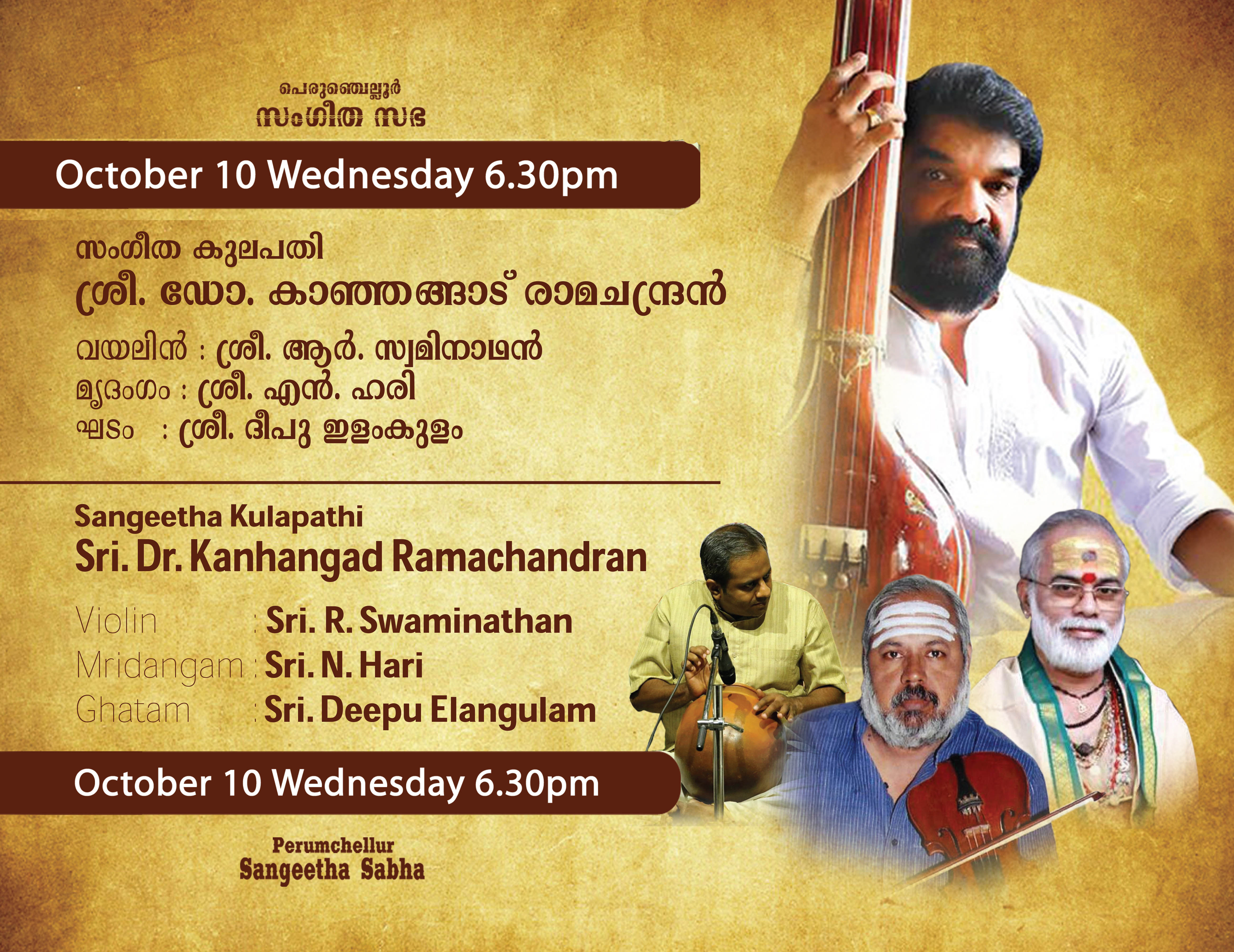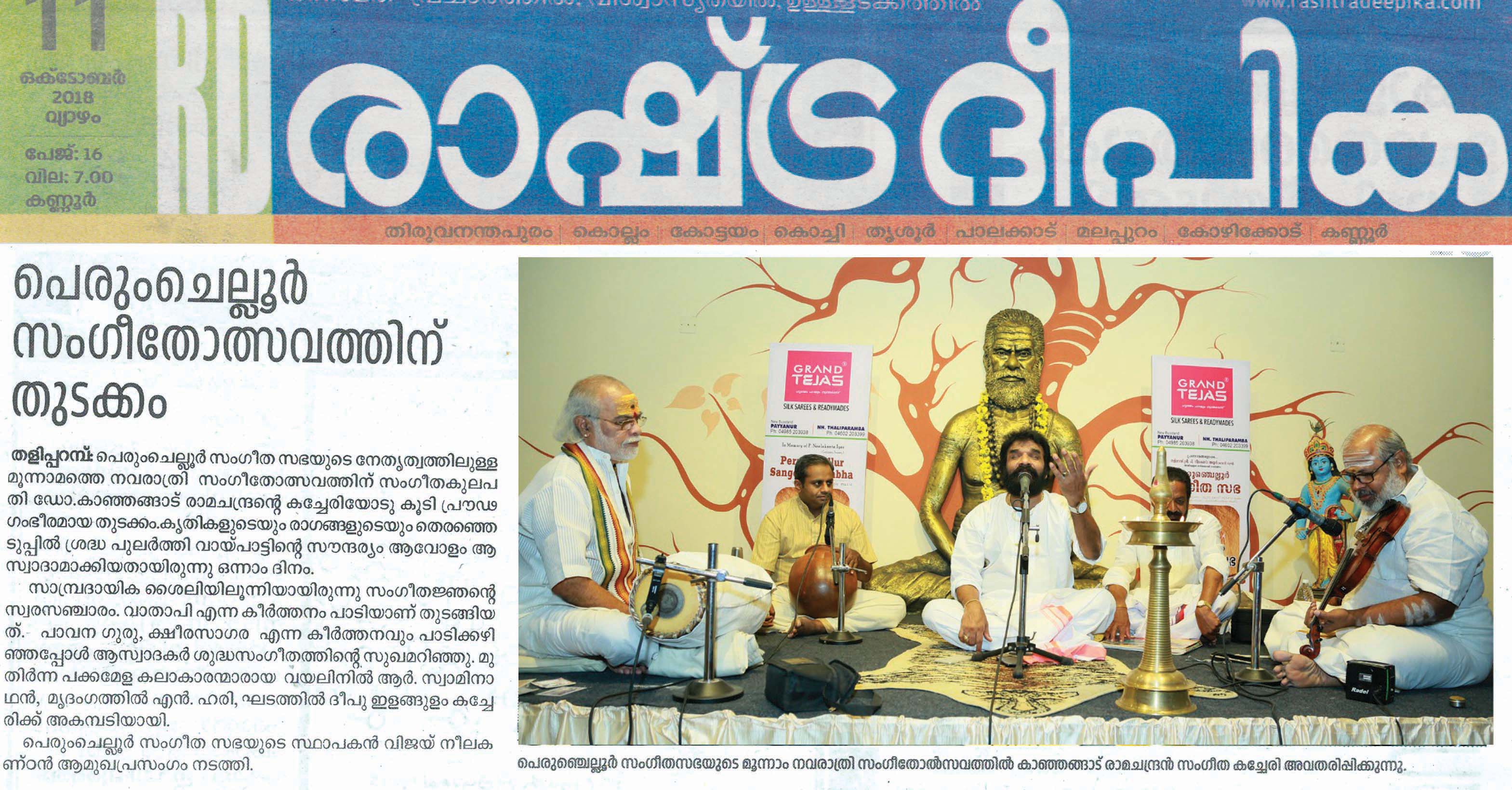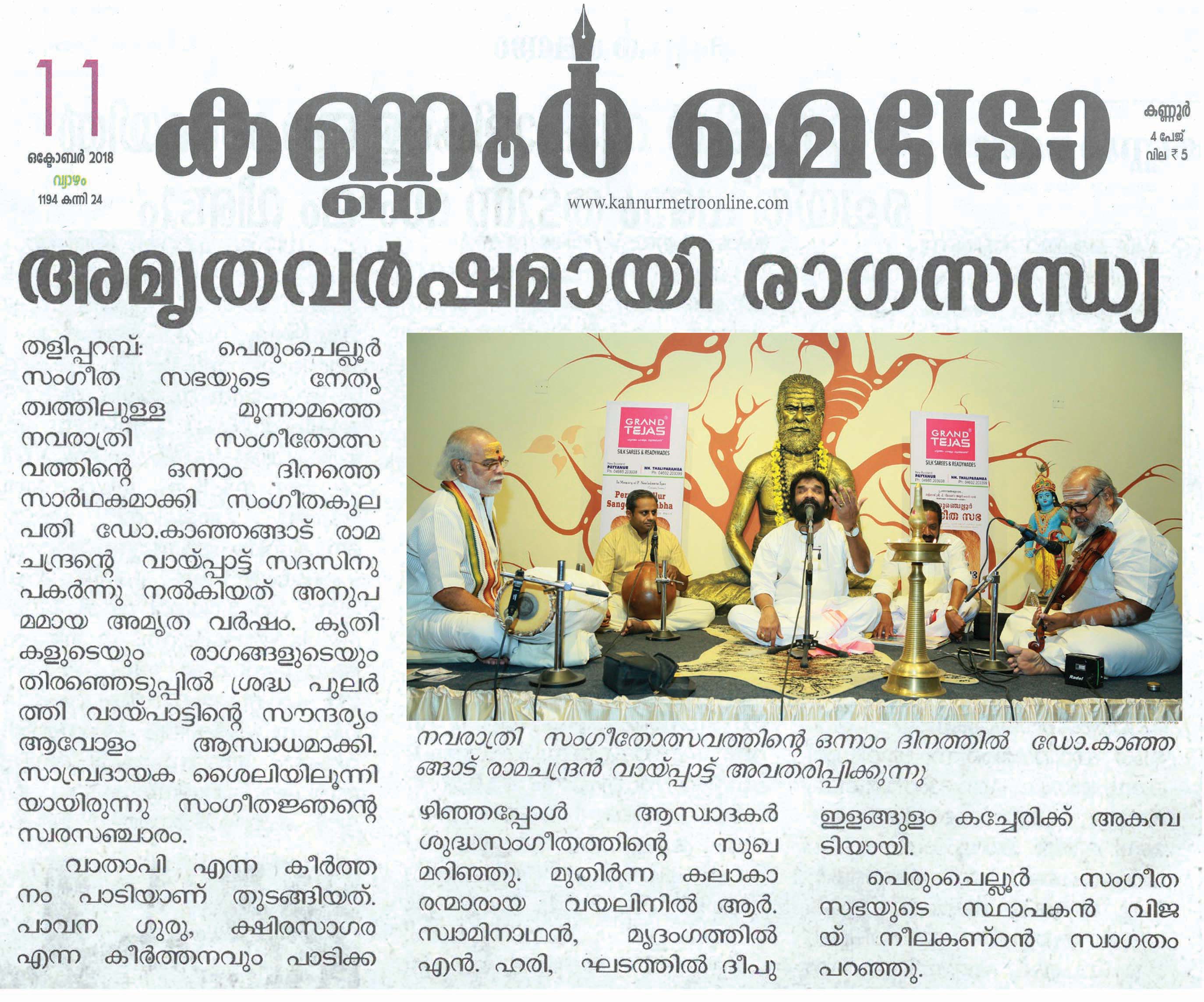 *അമൃതവർഷമായി രാഗസന്ധ്യ* *പെരുംചെല്ലൂർ സംഗീത സഭയുടെ* നേതൃത്വത്തിലുള്ള മൂന്നാമത്തെ നവരാത്രി സംഗീതോത്സവത്തിന്റെ ഒന്നാം ദിനത്തെ സാർഥകമാക്കി സംഗീതകുലപതി Dr. കാഞ്ഞങ്ങാട് രാമചന്ദ്രന്റെ വായ്പ്പാട്ട്. സദസിനു പകർന്നു നൽകിയത് അനുപമമായ അമൃത വർഷം. കൃതികളുടെയും രാഗങ്ങളുടെയും തിരഞ്ഞെടുപ്പിൽ ശ്രദ്ധ പുലർത്തി വായ്പാട്ടിന്റെ സൗന്ദര്യം ആവോളം ആസ്വാധമാക്കി. സാമ്പ്രദായക ശൈലിയിലൂന്നിയായിരുന്നു സംഗീതജ്ഞന്റെ സ്വരസഞ്ചാരം. വാതാപി എന്ന കീർത്തനം പാടിയാണ് തുടങ്ങിയത്. പാവന ഗുരു, ക്ഷിരസാഗര എന്ന കീർത്തനവും പാടിക്കഴിഞ്ഞപ്പോൾ ആസ്വാദകർ ശുദ്ധസംഗീതത്തിന്റെ സുഖമറിഞ്ഞു. മുതിർന്ന കലാകാരന്മാരായ വയലിനിൽ ആർ. സ്വാമിനാഥൻ, മൃദംഗത്തിൽ എൻ. ഹരി, ഘടത്തിൽ ദീപു ഇളങ്ങുളം കച്ചേരിക്ക് അകമ്പടിയായി.