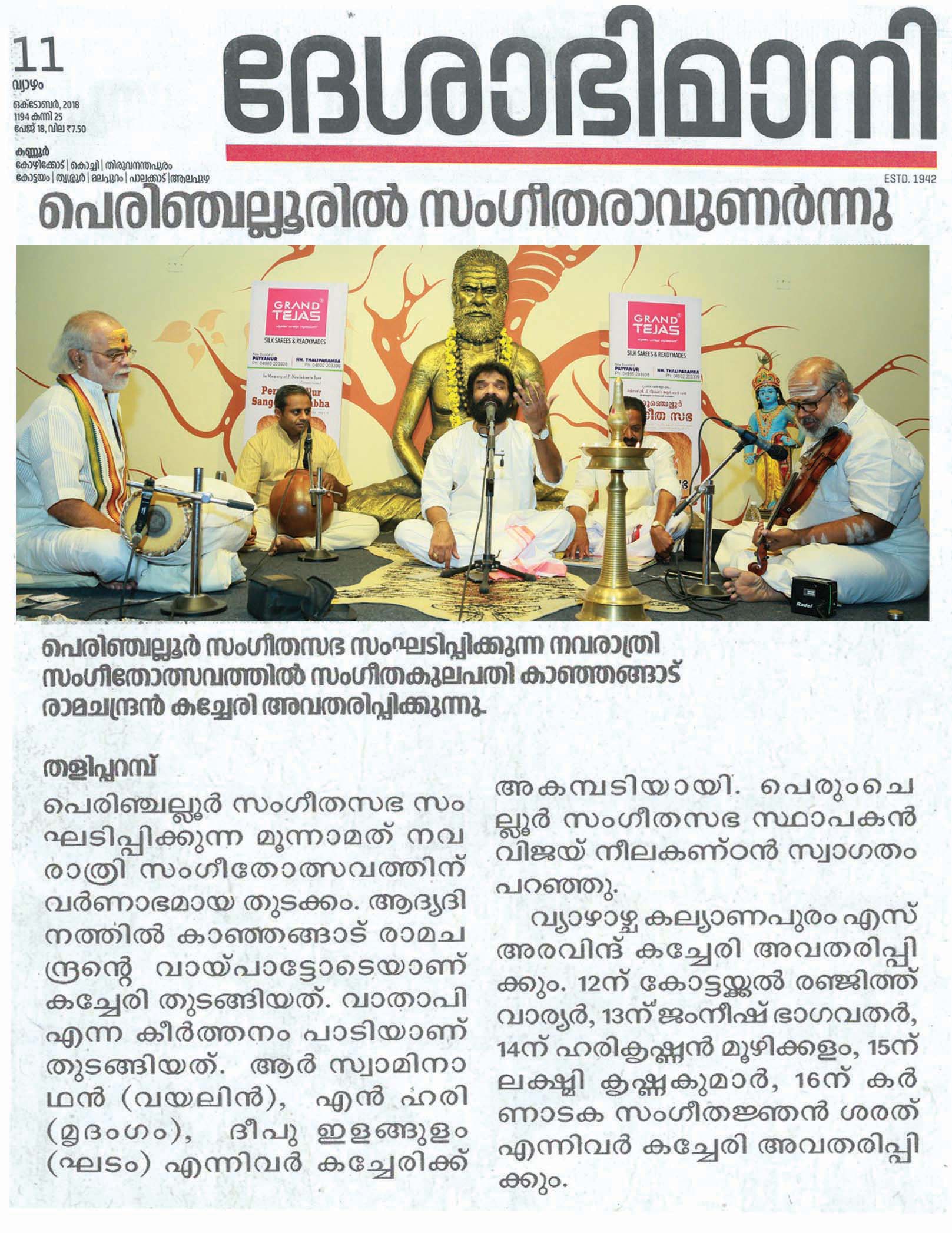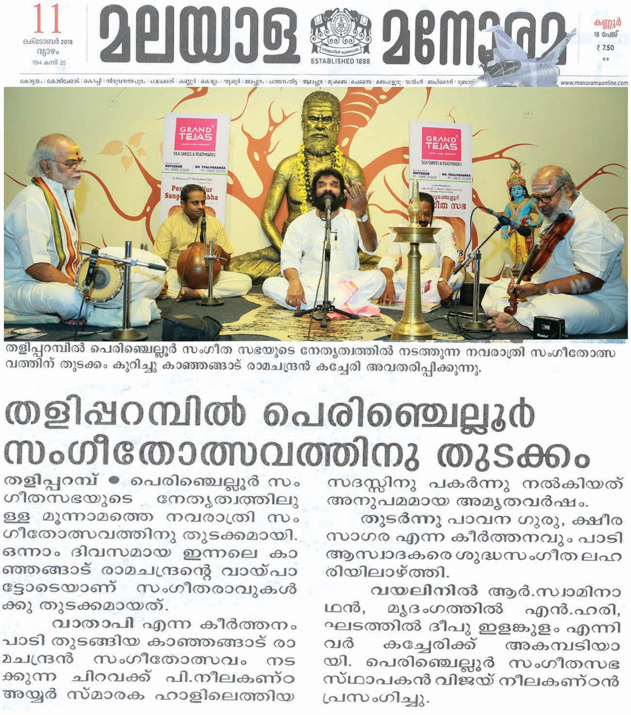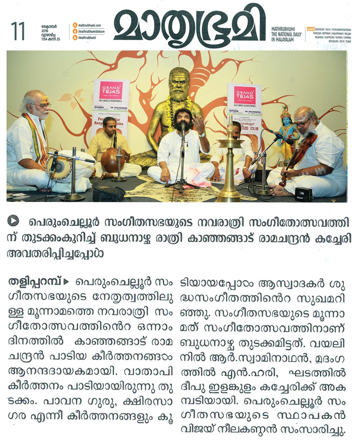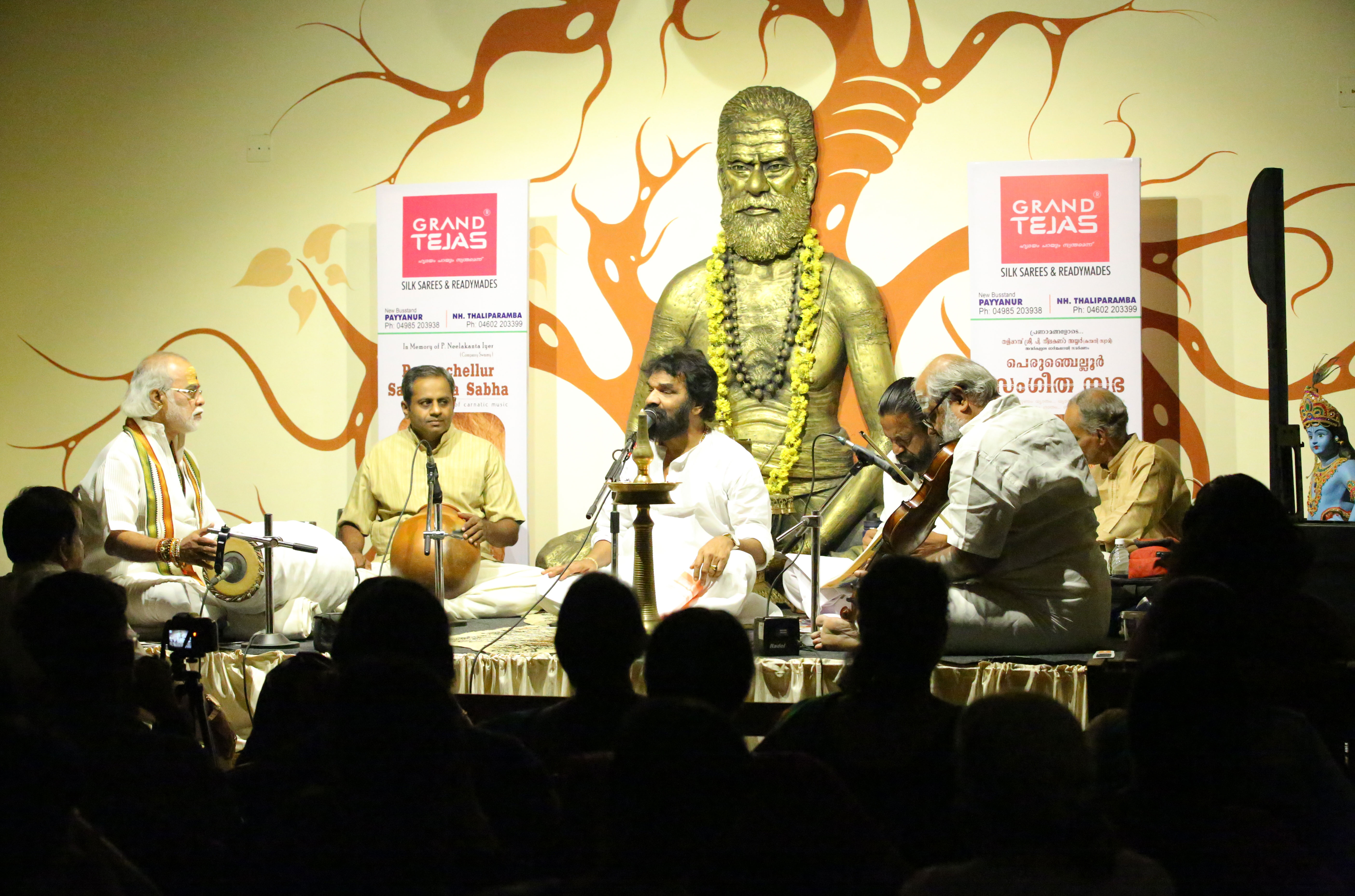 *അമൃതവർഷമായി രാഗസന്ധ്യ* *പെരുംചെല്ലൂർ സംഗീത സഭയുടെ* നേതൃത്വത്തിലുള്ള മൂന്നാമത്തെ നവരാത്രി സംഗീതോത്സവത്തിന്റെ ഒന്നാം ദിനത്തെ സാർഥകമാക്കി സംഗീതകുലപതി Dr. കാഞ്ഞങ്ങാട് രാമചന്ദ്രന്റെ വായ്പ്പാട്ട്. സദസിനു പകർന്നു നൽകിയത് അനുപമമായ അമൃത വർഷം. കൃതികളുടെയും രാഗങ്ങളുടെയും തിരഞ്ഞെടുപ്പിൽ ശ്രദ്ധ പുലർത്തി വായ്പാട്ടിന്റെ സൗന്ദര്യം ആവോളം ആസ്വാധമാക്കി. സാമ്പ്രദായക ശൈലിയിലൂന്നിയായിരുന്നു സംഗീതജ്ഞന്റെ സ്വരസഞ്ചാരം. വാതാപി എന്ന കീർത്തനം പാടിയാണ് തുടങ്ങിയത്. പാവന ഗുരു, ക്ഷിരസാഗര എന്ന കീർത്തനവും പാടിക്കഴിഞ്ഞപ്പോൾ ആസ്വാദകർ ശുദ്ധസംഗീതത്തിന്റെ സുഖമറിഞ്ഞു. മുതിർന്ന കലാകാരന്മാരായ വയലിനിൽ ആർ. സ്വാമിനാഥൻ, മൃദംഗത്തിൽ എൻ. ഹരി, ഘടത്തിൽ ദീപു ഇളങ്ങുളം കച്ചേരിക്ക് അകമ്പടിയായി.