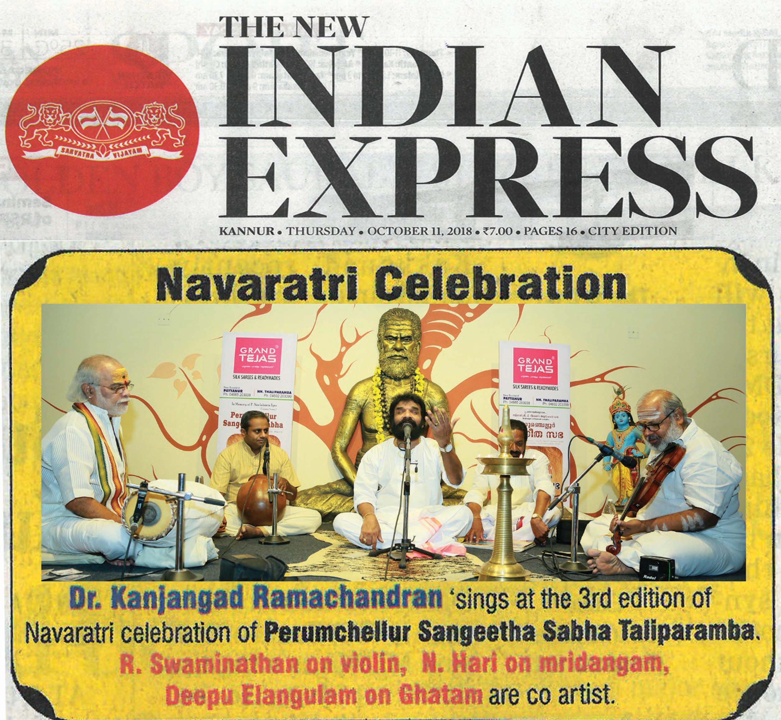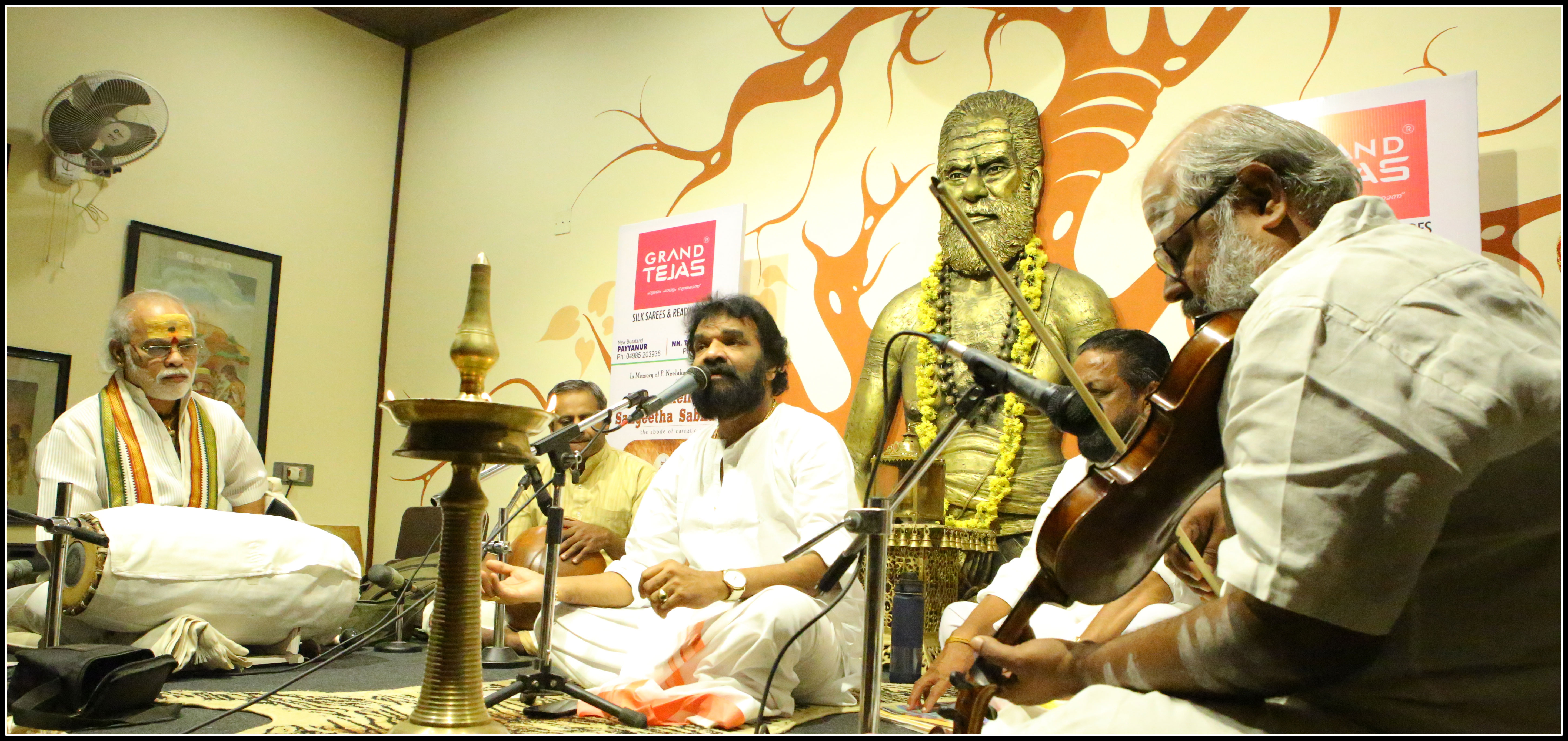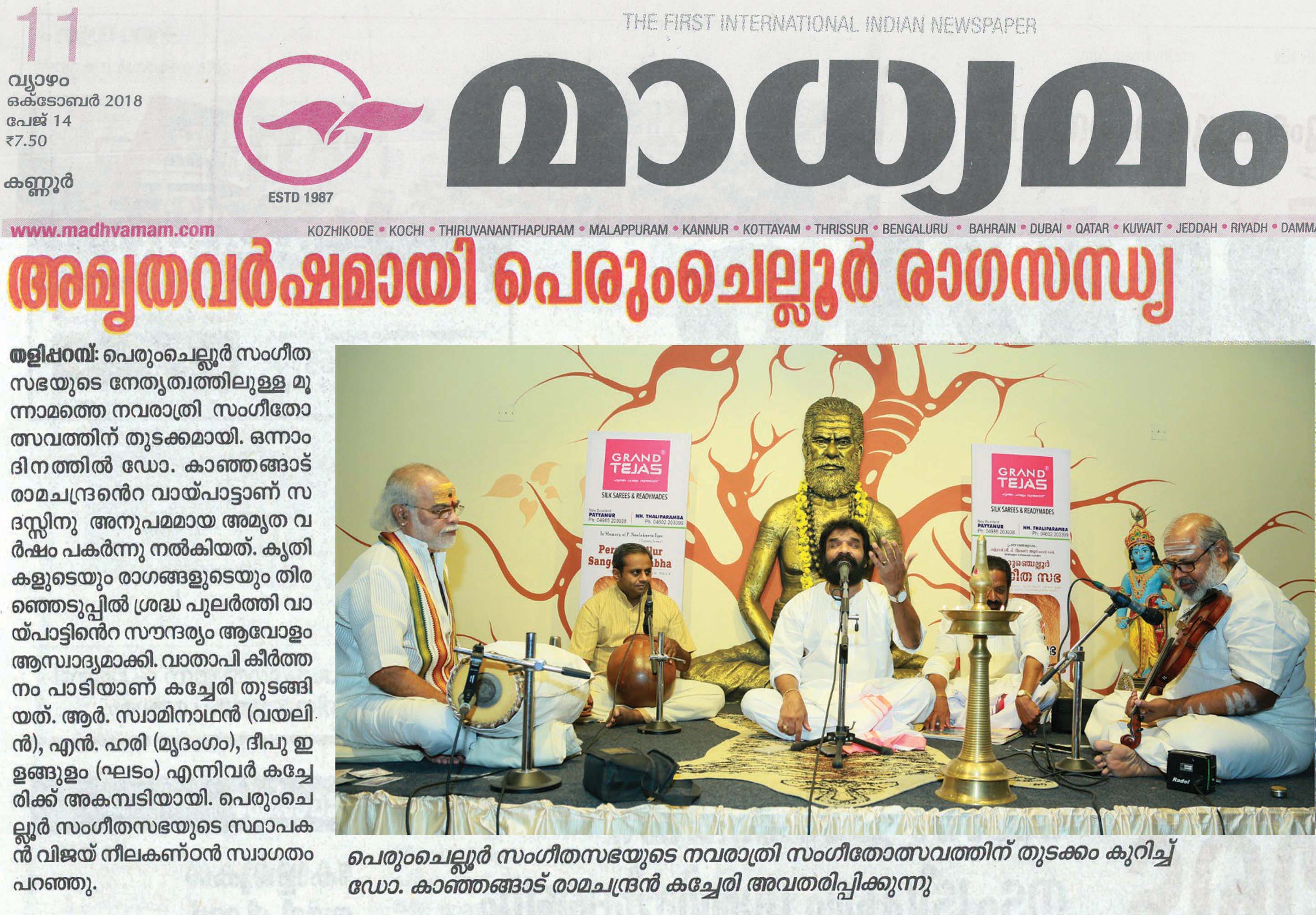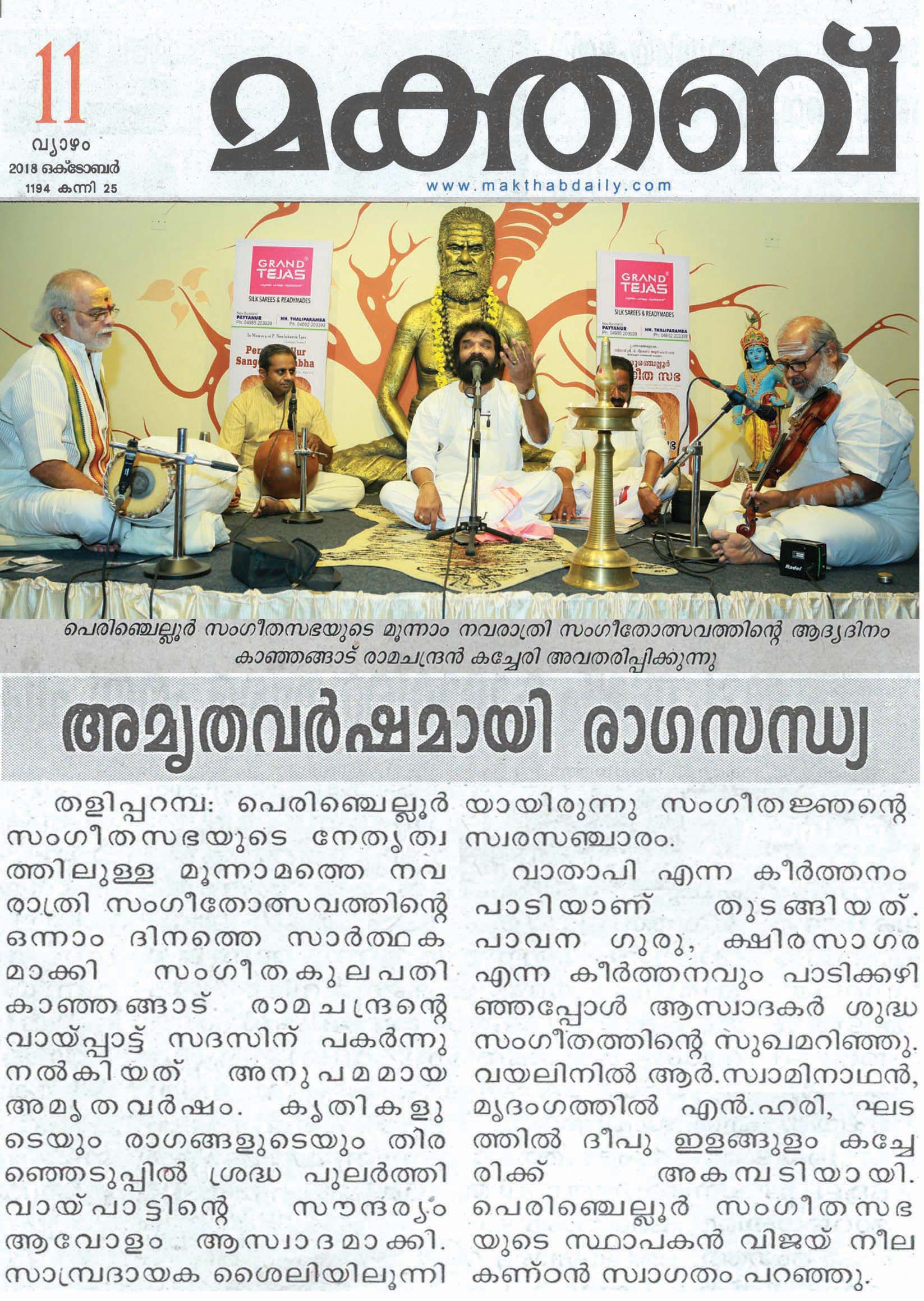 *അമൃതവർഷമായി രാഗസന്ധ്യ* *പെരുംചെല്ലൂർ സംഗീത സഭയുടെ* നേതൃത്വത്തിലുള്ള മൂന്നാമത്തെ നവരാത്രി സംഗീതോത്സവത്തിന്റെ ഒന്നാം ദിനത്തെ സാർഥകമാക്കി സംഗീതകുലപതി Dr. കാഞ്ഞങ്ങാട് രാമചന്ദ്രന്റെ വായ്പ്പാട്ട്. സദസിനു പകർന്നു നൽകിയത് അനുപമമായ അമൃത വർഷം. കൃതികളുടെയും രാഗങ്ങളുടെയും തിരഞ്ഞെടുപ്പിൽ ശ്രദ്ധ പുലർത്തി വായ്പാട്ടിന്റെ സൗന്ദര്യം ആവോളം ആസ്വാധമാക്കി. സാമ്പ്രദായക ശൈലിയിലൂന്നിയായിരുന്നു സംഗീതജ്ഞന്റെ സ്വരസഞ്ചാരം. വാതാപി എന്ന കീർത്തനം പാടിയാണ് തുടങ്ങിയത്. പാവന ഗുരു, ക്ഷിരസാഗര എന്ന കീർത്തനവും പാടിക്കഴിഞ്ഞപ്പോൾ ആസ്വാദകർ ശുദ്ധസംഗീതത്തിന്റെ സുഖമറിഞ്ഞു. മുതിർന്ന കലാകാരന്മാരായ വയലിനിൽ ആർ. സ്വാമിനാഥൻ, മൃദംഗത്തിൽ എൻ. ഹരി, ഘടത്തിൽ ദീപു ഇളങ്ങുളം കച്ചേരിക്ക് അകമ്പടിയായി.