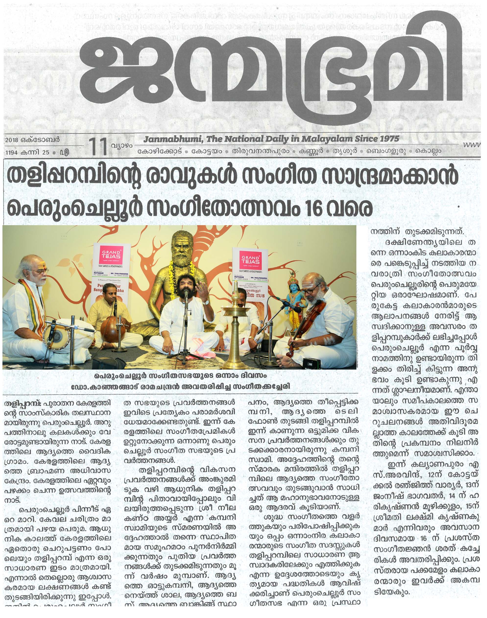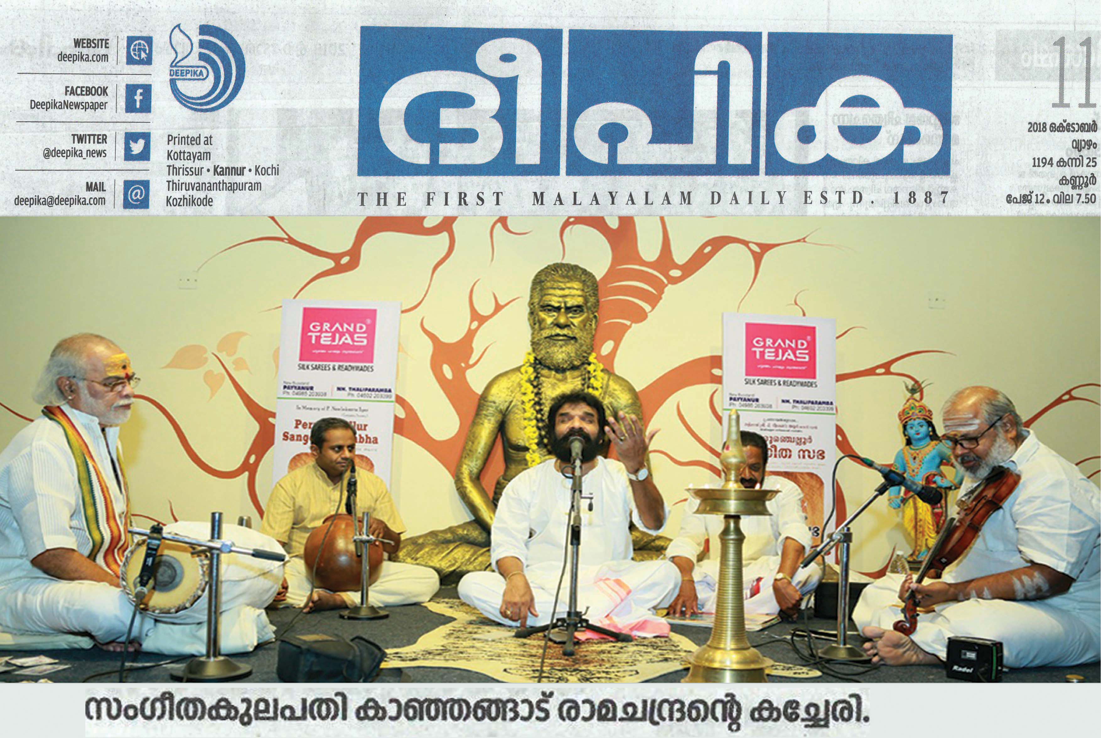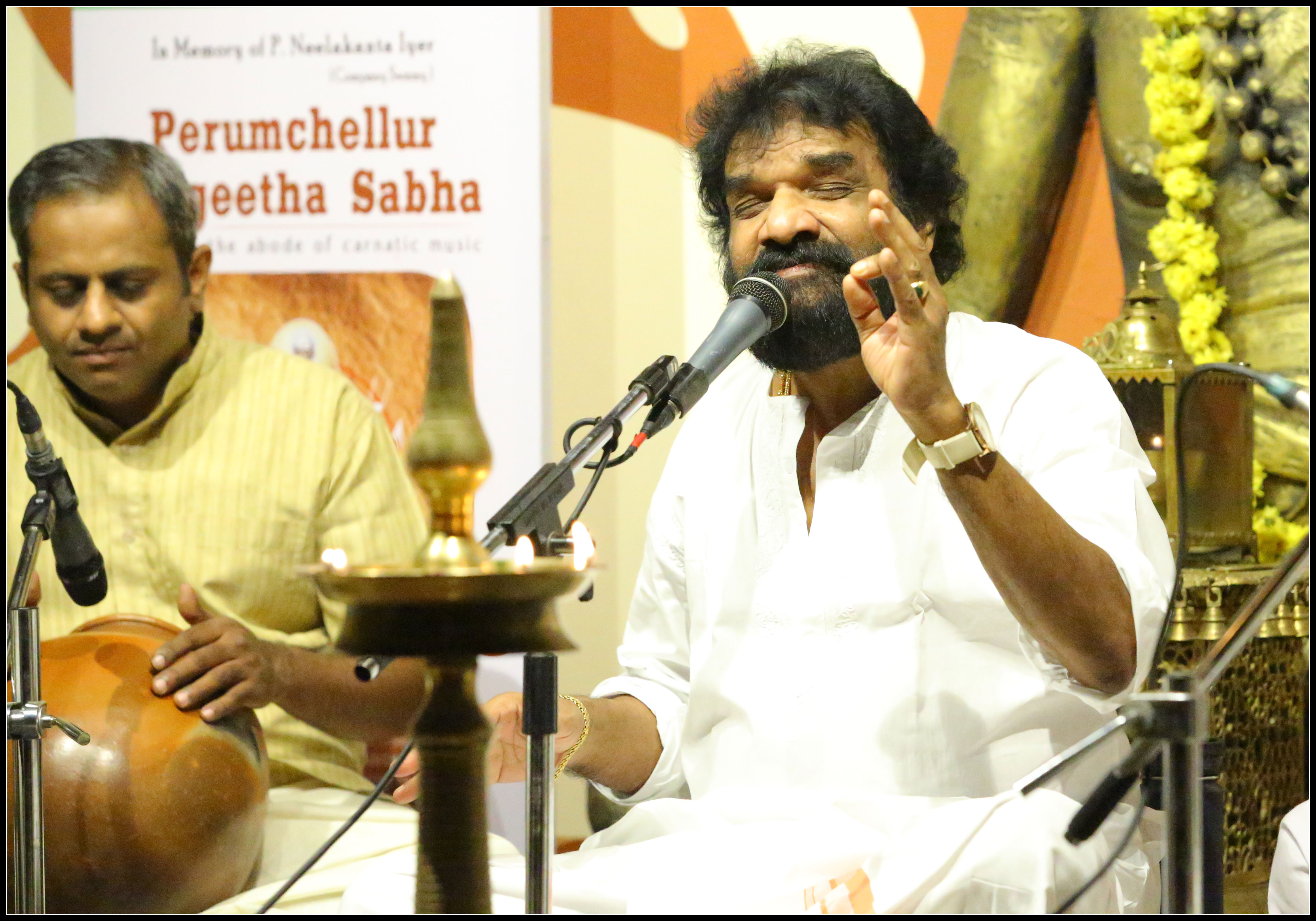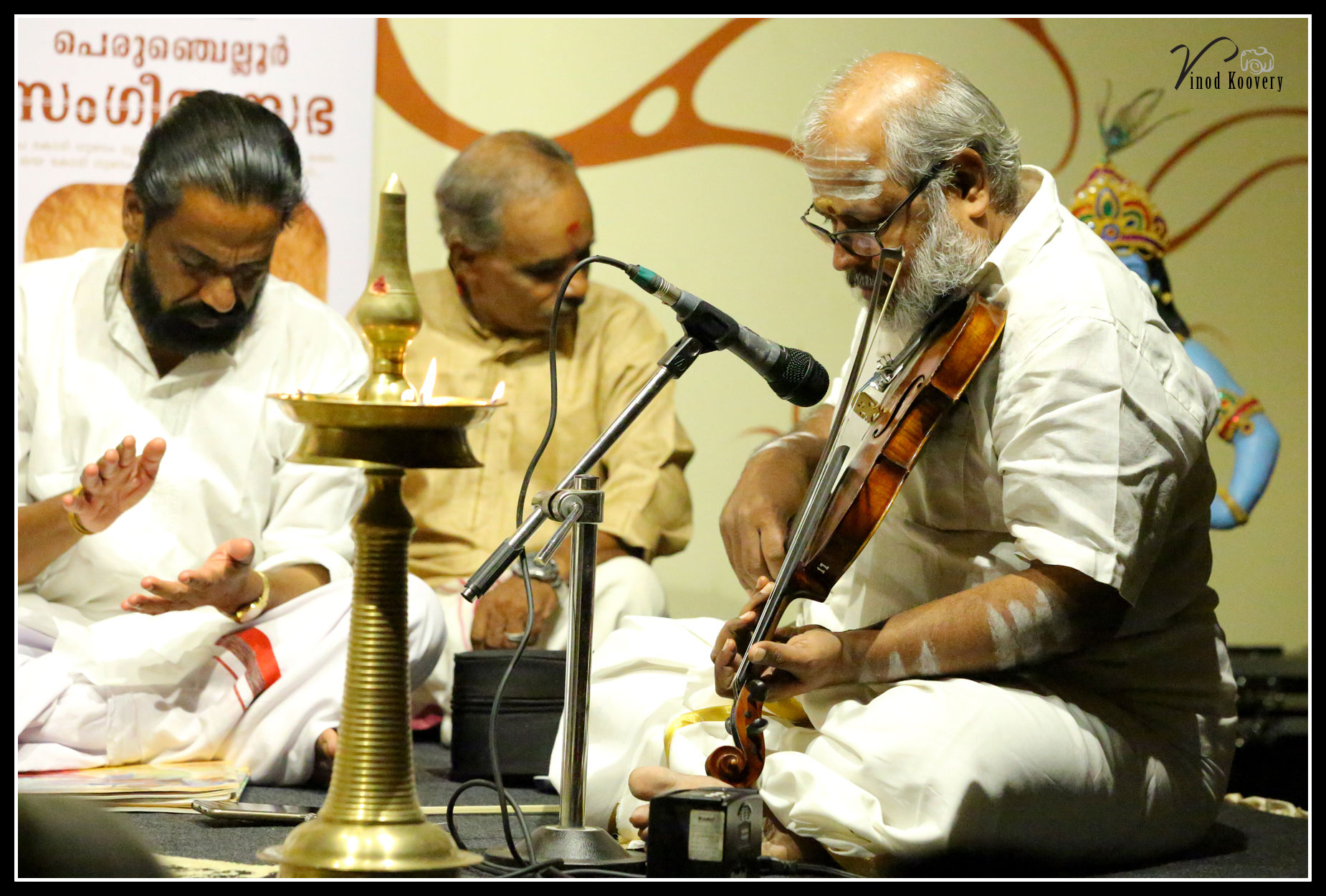 *അമൃതവർഷമായി രാഗസന്ധ്യ* *പെരുംചെല്ലൂർ സംഗീത സഭയുടെ* നേതൃത്വത്തിലുള്ള മൂന്നാമത്തെ നവരാത്രി സംഗീതോത്സവത്തിന്റെ ഒന്നാം ദിനത്തെ സാർഥകമാക്കി സംഗീതകുലപതി Dr. കാഞ്ഞങ്ങാട് രാമചന്ദ്രന്റെ വായ്പ്പാട്ട്. സദസിനു പകർന്നു നൽകിയത് അനുപമമായ അമൃത വർഷം. കൃതികളുടെയും രാഗങ്ങളുടെയും തിരഞ്ഞെടുപ്പിൽ ശ്രദ്ധ പുലർത്തി വായ്പാട്ടിന്റെ സൗന്ദര്യം ആവോളം ആസ്വാധമാക്കി. സാമ്പ്രദായക ശൈലിയിലൂന്നിയായിരുന്നു സംഗീതജ്ഞന്റെ സ്വരസഞ്ചാരം. വാതാപി എന്ന കീർത്തനം പാടിയാണ് തുടങ്ങിയത്. പാവന ഗുരു, ക്ഷിരസാഗര എന്ന കീർത്തനവും പാടിക്കഴിഞ്ഞപ്പോൾ ആസ്വാദകർ ശുദ്ധസംഗീതത്തിന്റെ സുഖമറിഞ്ഞു. മുതിർന്ന കലാകാരന്മാരായ വയലിനിൽ ആർ. സ്വാമിനാഥൻ, മൃദംഗത്തിൽ എൻ. ഹരി, ഘടത്തിൽ ദീപു ഇളങ്ങുളം കച്ചേരിക്ക് അകമ്പടിയായി.