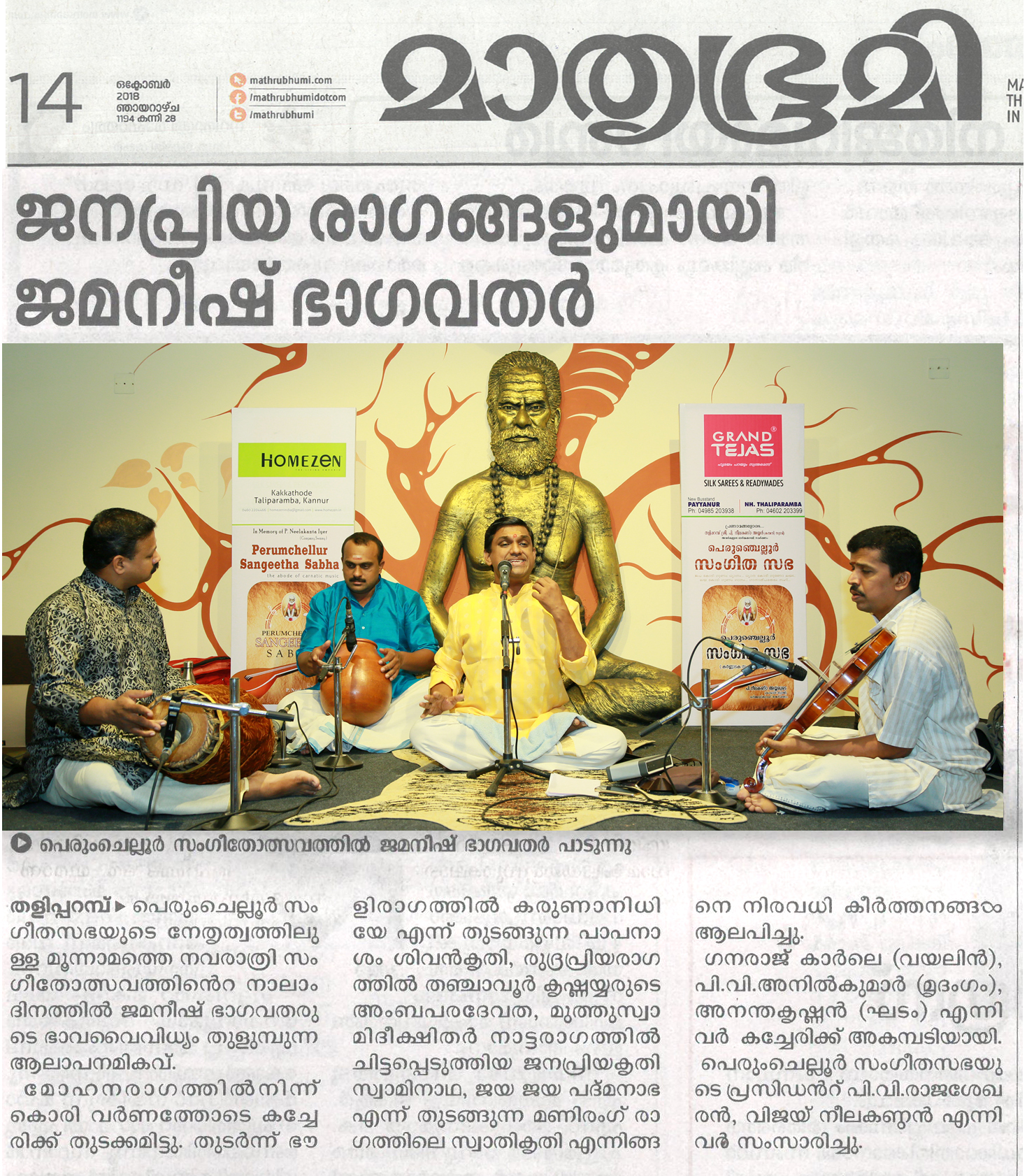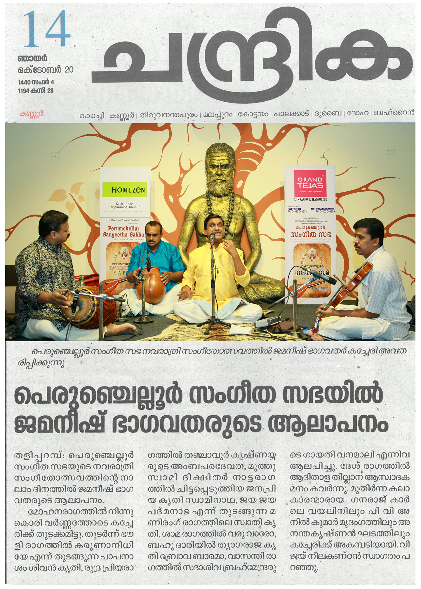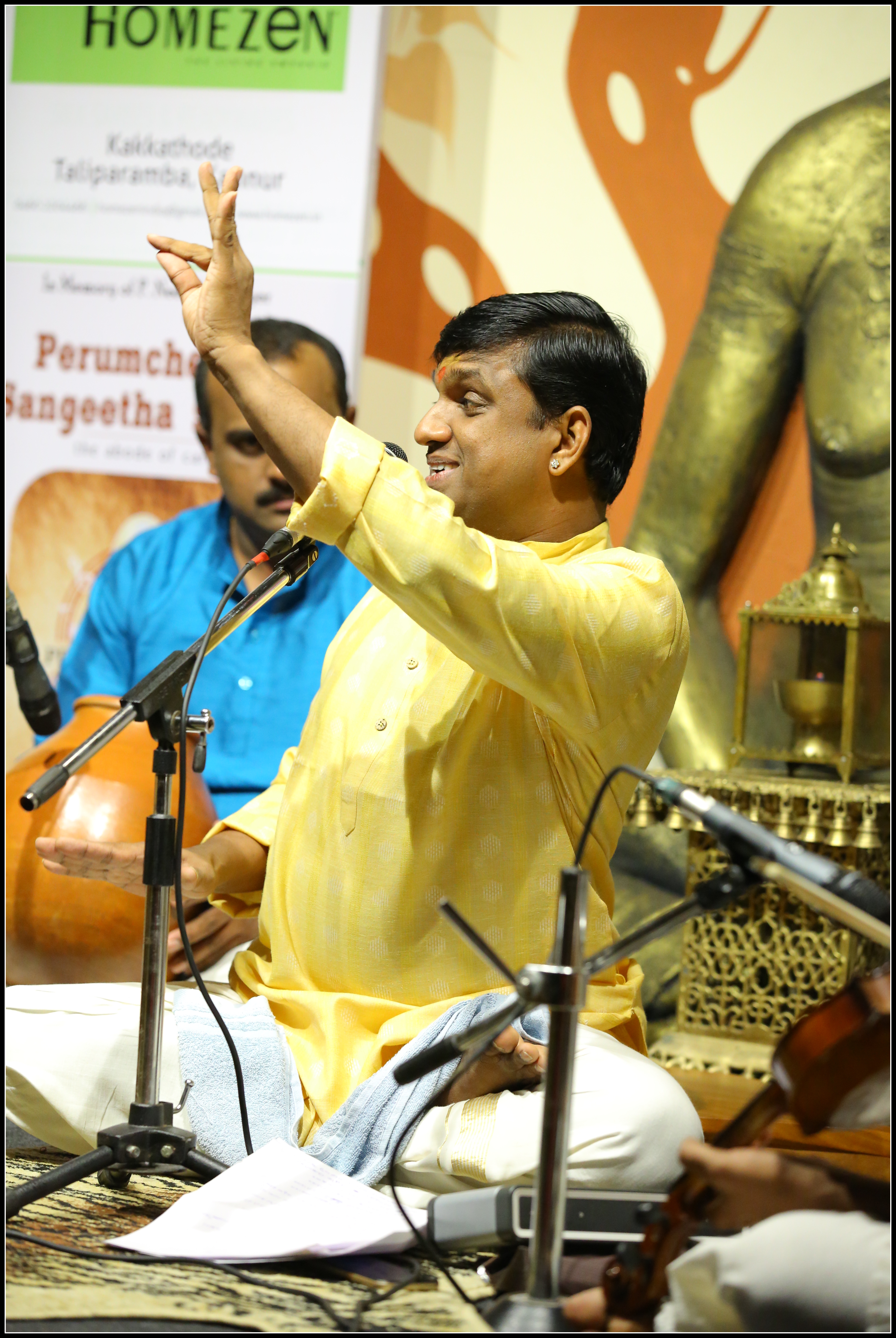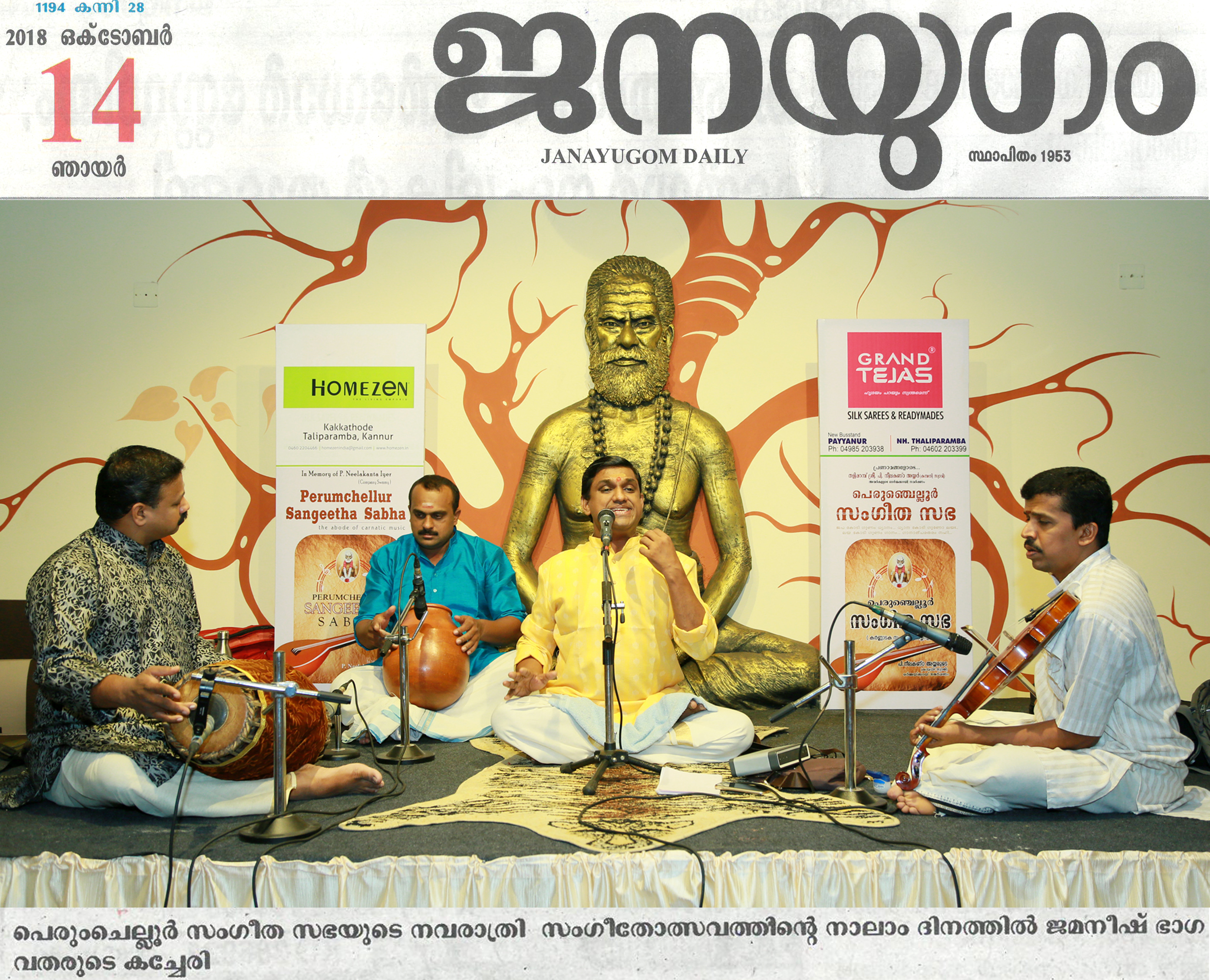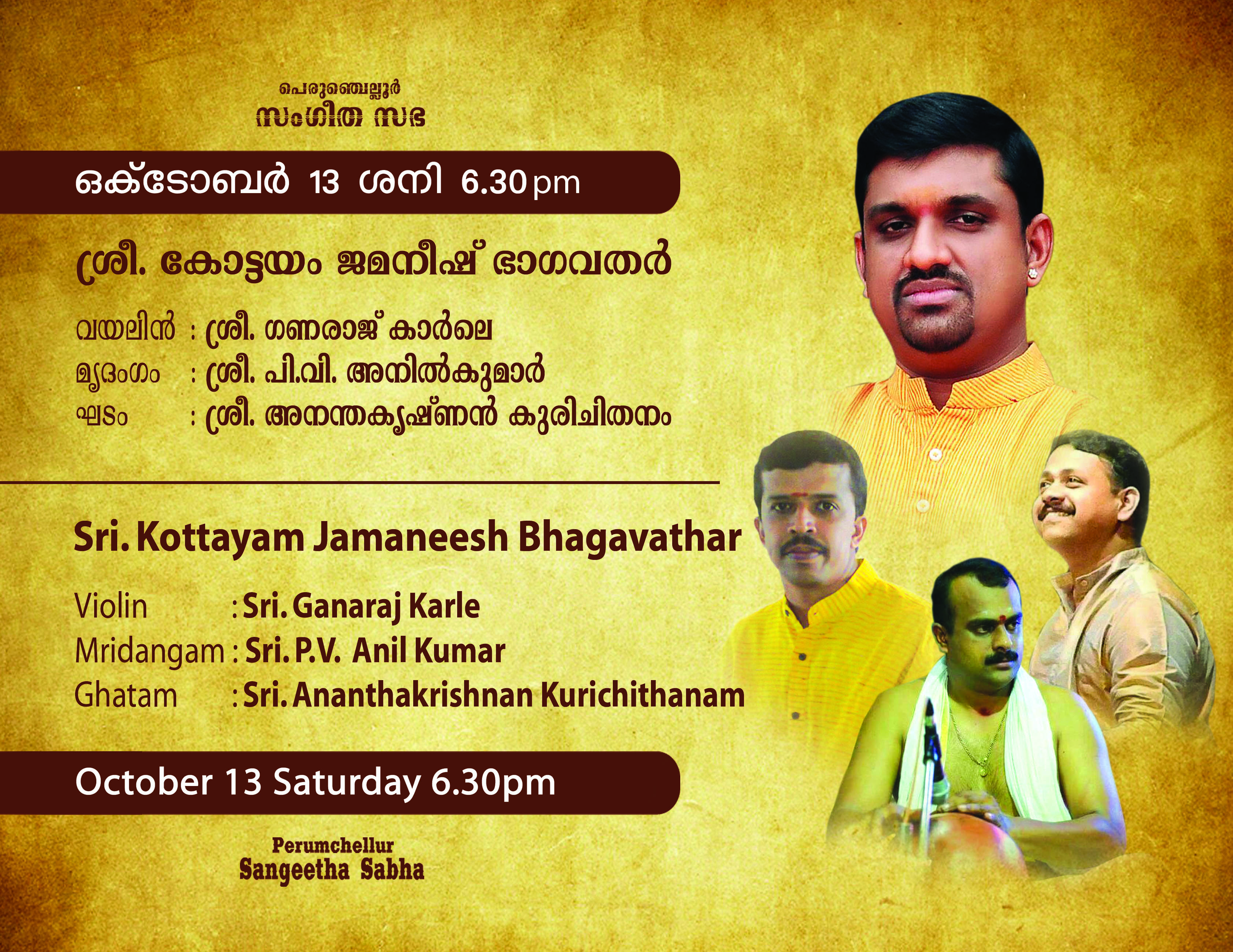 ജനപ്രിയ രാഗങ്ങളുമായി ജമനീഷ് ഭാഗവതർ* *പെരുംചെല്ലൂർ സംഗീത സഭയുടെ* നേതൃത്വത്തിലുള്ള മൂന്നാമത്തെ നവരാത്രി സംഗീതോത്സവത്തിന്റെ നാലാം ദിനത്തിൽ ജമനീഷ് ഭാഗവതരുടെ ഭാവവൈവിധ്യം തുളുമ്പുന്ന ആലാപന മികവിന് സാക്ഷ്യം വഹിച്ചു. മോഹനരാഗത്തിൽ നിന്നു കൊരി വർണ്ണത്തോടെ കച്ചേരിക്ക് തുടക്കമിട്ടു .തുടർന്ന് ഭൗളി രാഗത്തിൽ കരുണാനിധിയേ എന്ന് തുടങ്ങുന്ന പാപനാശം ശിവൻ കൃതി , രുദ്ര പ്രിയരാഗത്തിൽ തഞ്ചാവൂർ കൃഷ്ണയ്യരുടെ അംബപരദേവത , മുത്തുസ്വാമി ദീക്ഷിതർ നാട്ടരാഗത്തിൽ ചിട്ടപ്പെടുത്തിയ ജനപ്രിയ കൃതി സ്വാമിനാഥ , ജയ ജയ പദ്മനാഭ എന്ന് തുടങ്ങുന്ന മണി രംഗ് രാഗത്തിലെ സ്വാതി കൃതി ,ശാമ രാഗത്തിൽ വരു വാരോ , ബഹു ദാരിയിൽ ത്യാഗരാജ കൃതി ബ്രോവ ബാരമാ, വാസന്തി രാഗത്തിൽ സദാശിവ ബ്രഹ് മേന്ദ്രരുടെ ഗായതി വനമാലി എന്നിവ ആലപിച്ചു. ദേശ് രാഗത്തിൽ ആദിതാള തില്ലാന ആസ്വാദക മനം കവർന്നു . മുതിർന്ന കലാകാരന്മാരായ വയലിനിൽ ഗനരാജ് കാർലെ മൃദംഗത്തിൽ പി. വി.അനിൽ കുമാർ ഘട്ടത്തിൽ അനന്തകൃഷ്ണൻ കച്ചേരിക്ക് അകമ്പടിയായി. പെരുംചെല്ലൂർ സംഗീത സഭയുടെ പ്രസിഡന്റ് പി. വി. രാജശേഖരൻ സംസാരിച്ചു.