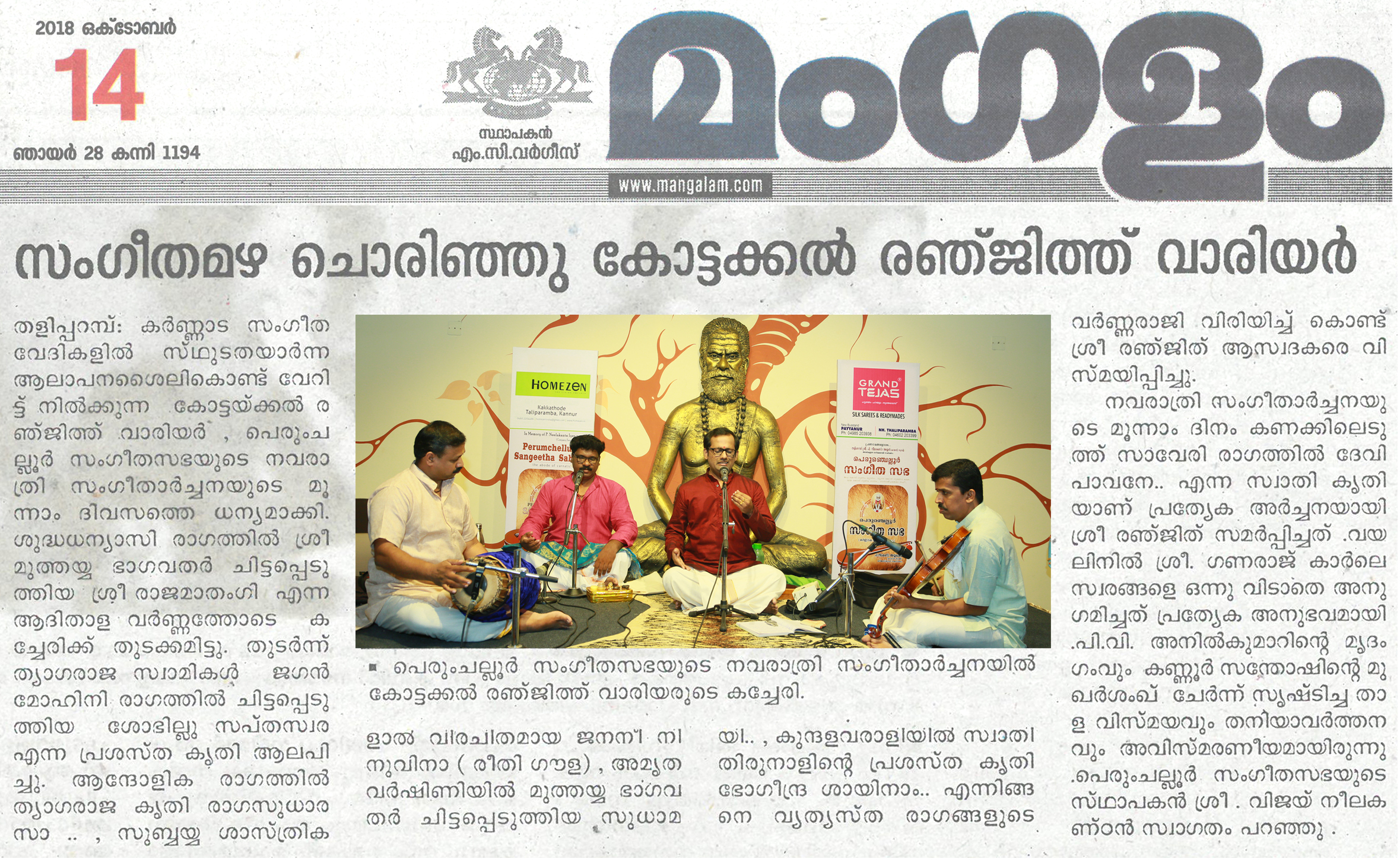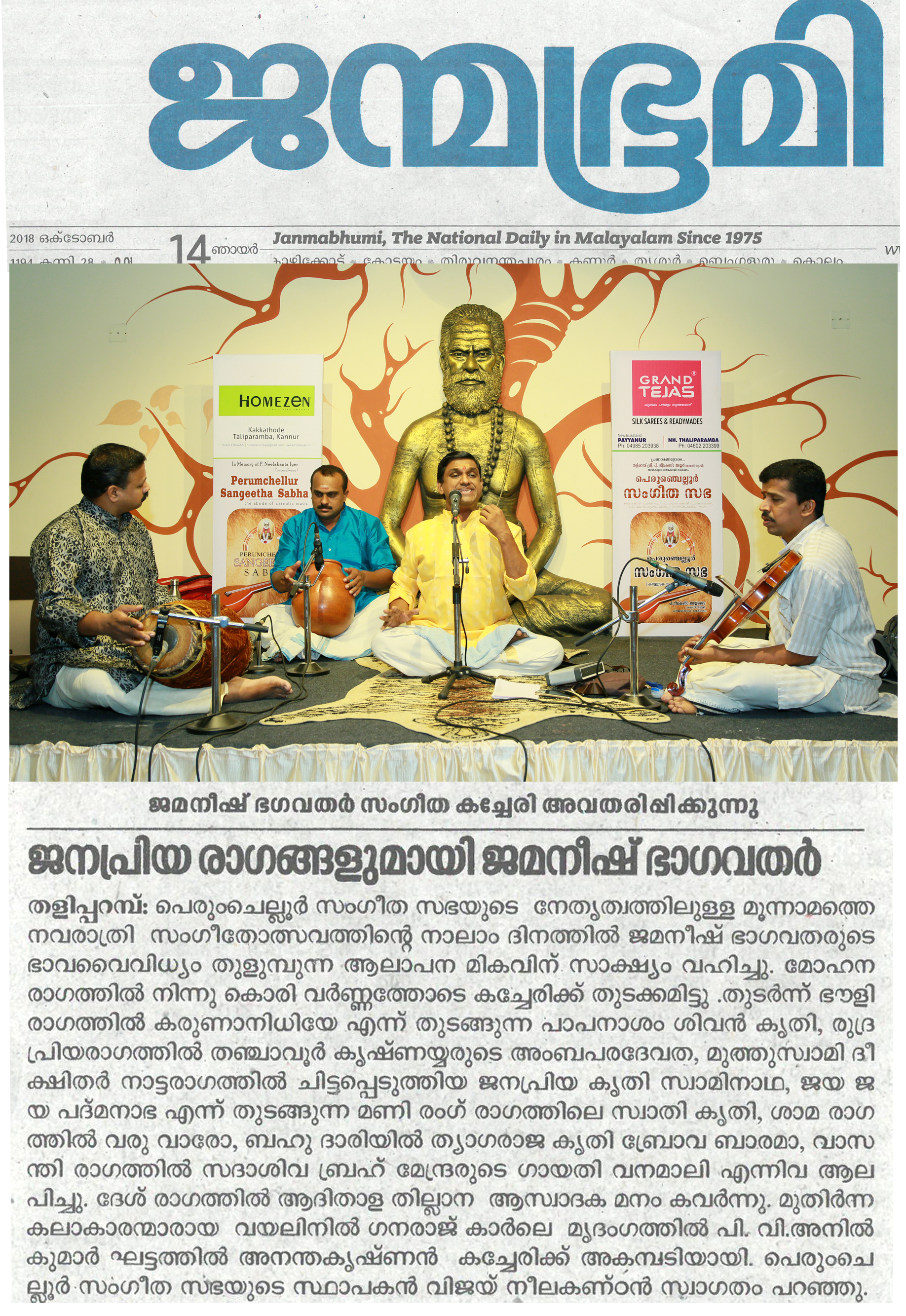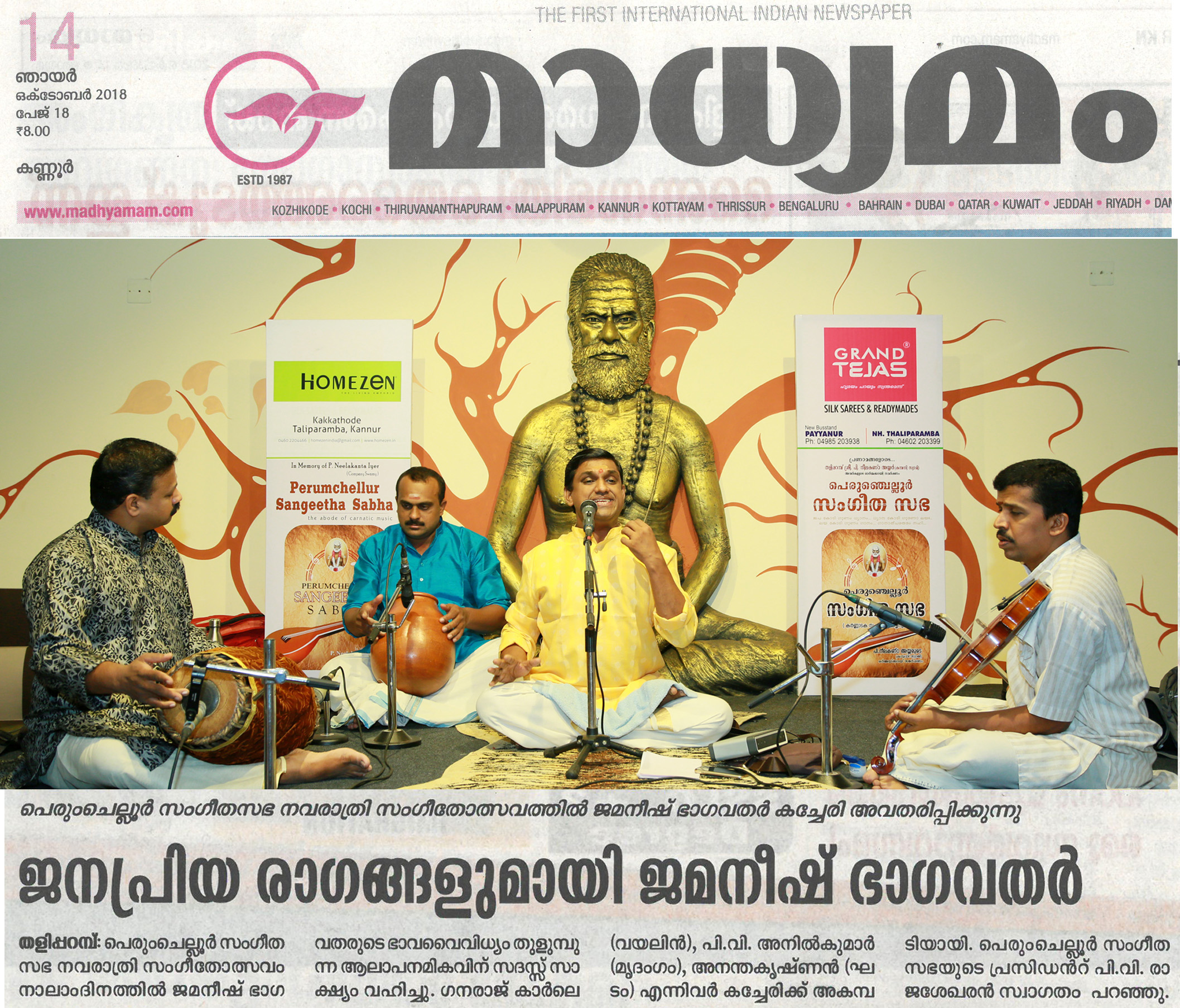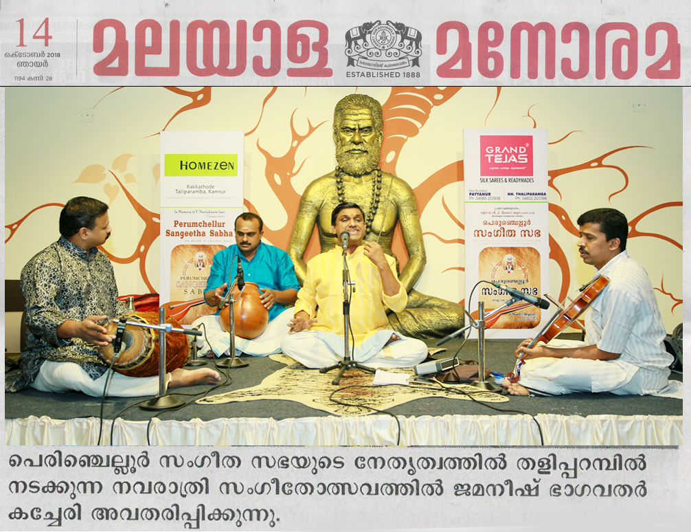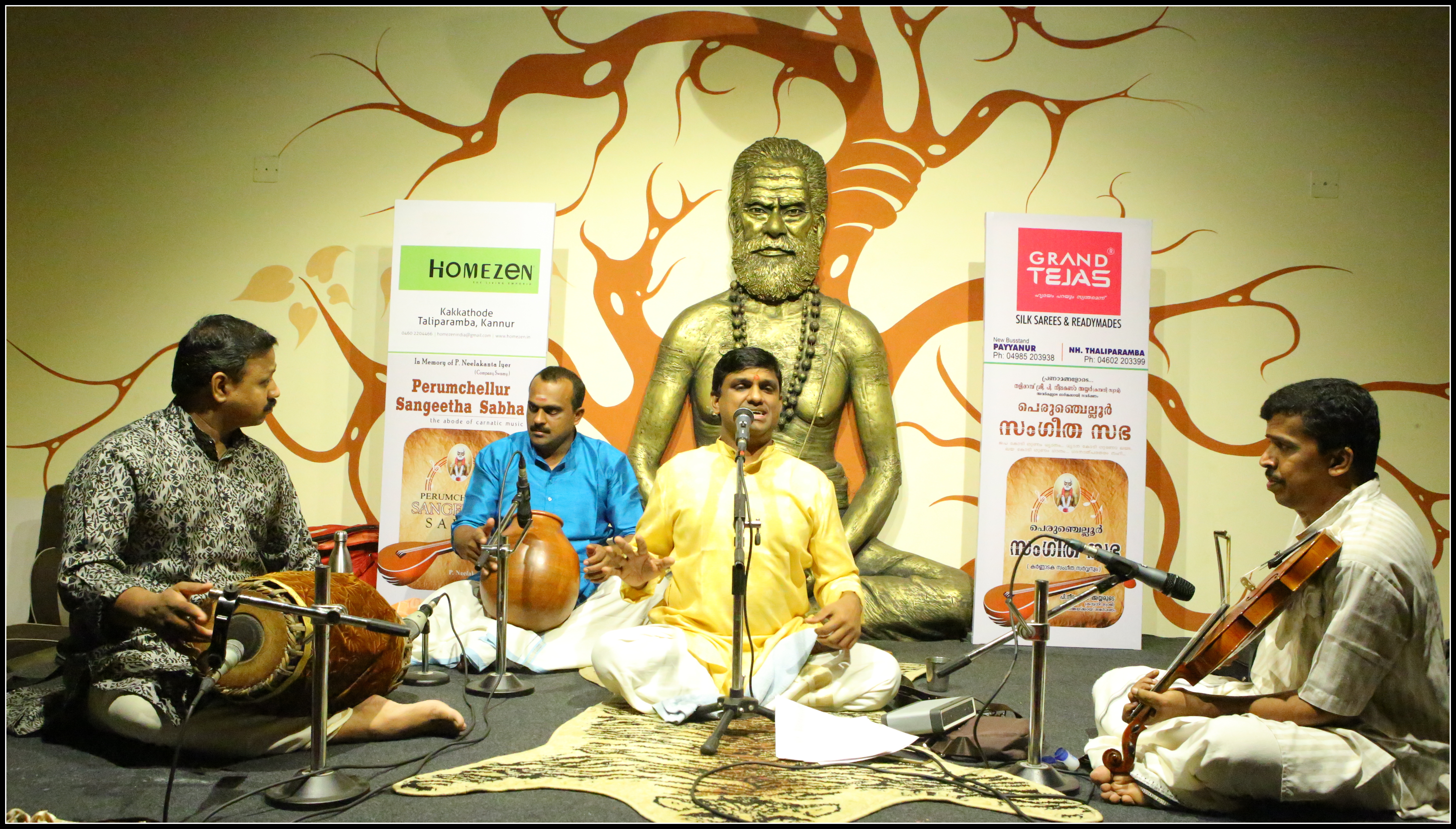 ജനപ്രിയ രാഗങ്ങളുമായി ജമനീഷ് ഭാഗവതർ* *പെരുംചെല്ലൂർ സംഗീത സഭയുടെ* നേതൃത്വത്തിലുള്ള മൂന്നാമത്തെ നവരാത്രി സംഗീതോത്സവത്തിന്റെ നാലാം ദിനത്തിൽ ജമനീഷ് ഭാഗവതരുടെ ഭാവവൈവിധ്യം തുളുമ്പുന്ന ആലാപന മികവിന് സാക്ഷ്യം വഹിച്ചു. മോഹനരാഗത്തിൽ നിന്നു കൊരി വർണ്ണത്തോടെ കച്ചേരിക്ക് തുടക്കമിട്ടു .തുടർന്ന് ഭൗളി രാഗത്തിൽ കരുണാനിധിയേ എന്ന് തുടങ്ങുന്ന പാപനാശം ശിവൻ കൃതി , രുദ്ര പ്രിയരാഗത്തിൽ തഞ്ചാവൂർ കൃഷ്ണയ്യരുടെ അംബപരദേവത , മുത്തുസ്വാമി ദീക്ഷിതർ നാട്ടരാഗത്തിൽ ചിട്ടപ്പെടുത്തിയ ജനപ്രിയ കൃതി സ്വാമിനാഥ , ജയ ജയ പദ്മനാഭ എന്ന് തുടങ്ങുന്ന മണി രംഗ് രാഗത്തിലെ സ്വാതി കൃതി ,ശാമ രാഗത്തിൽ വരു വാരോ , ബഹു ദാരിയിൽ ത്യാഗരാജ കൃതി ബ്രോവ ബാരമാ, വാസന്തി രാഗത്തിൽ സദാശിവ ബ്രഹ് മേന്ദ്രരുടെ ഗായതി വനമാലി എന്നിവ ആലപിച്ചു. ദേശ് രാഗത്തിൽ ആദിതാള തില്ലാന ആസ്വാദക മനം കവർന്നു . മുതിർന്ന കലാകാരന്മാരായ വയലിനിൽ ഗനരാജ് കാർലെ മൃദംഗത്തിൽ പി. വി.അനിൽ കുമാർ ഘട്ടത്തിൽ അനന്തകൃഷ്ണൻ കച്ചേരിക്ക് അകമ്പടിയായി. പെരുംചെല്ലൂർ സംഗീത സഭയുടെ പ്രസിഡന്റ് പി. വി. രാജശേഖരൻ സംസാരിച്ചു.