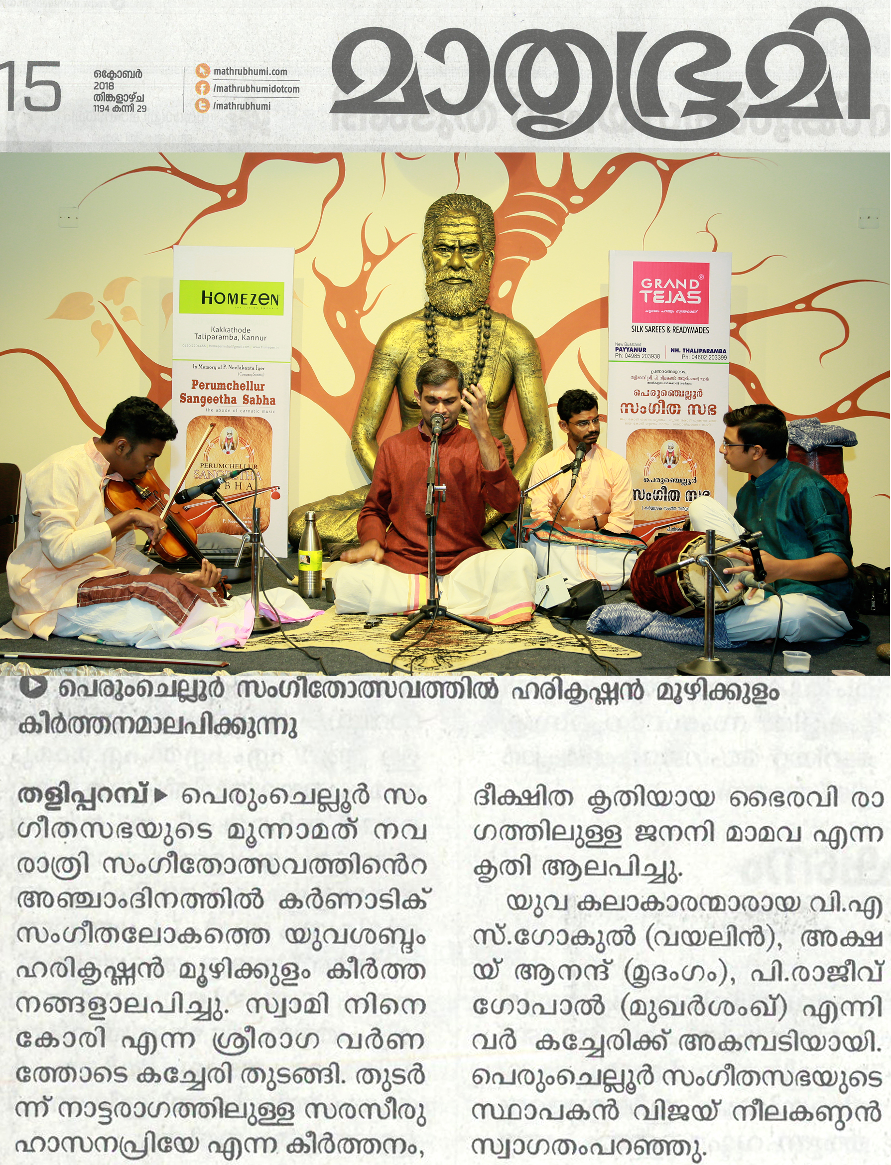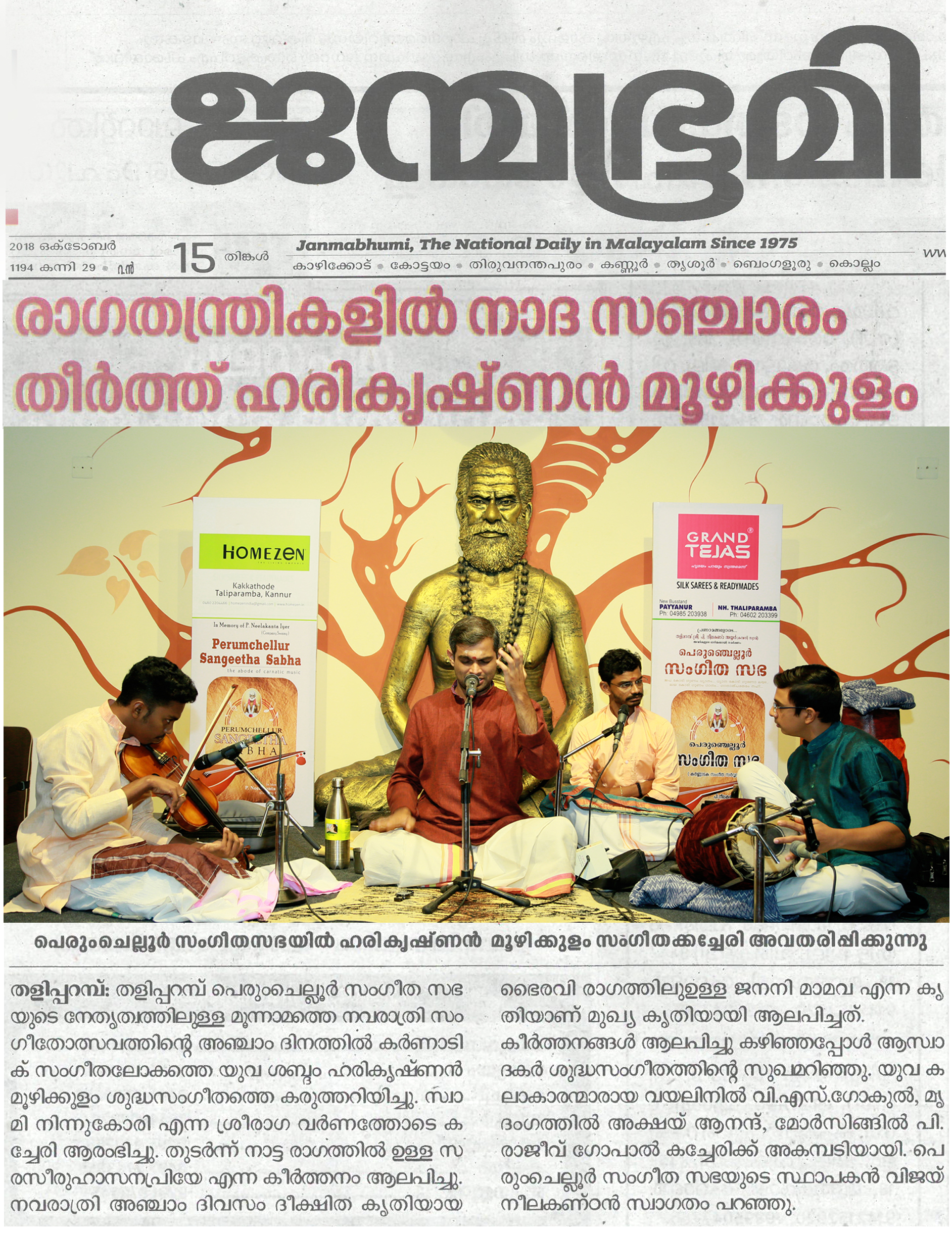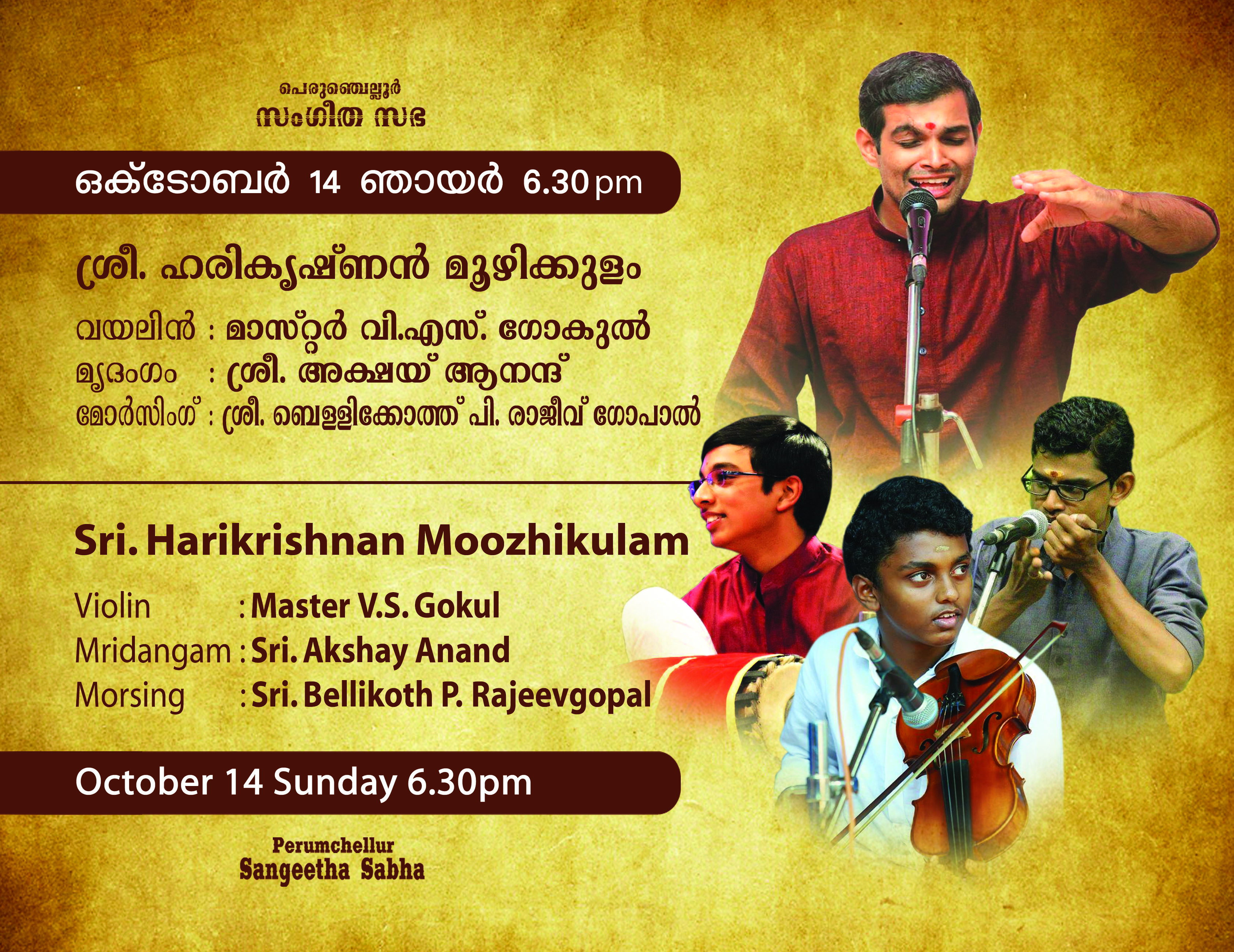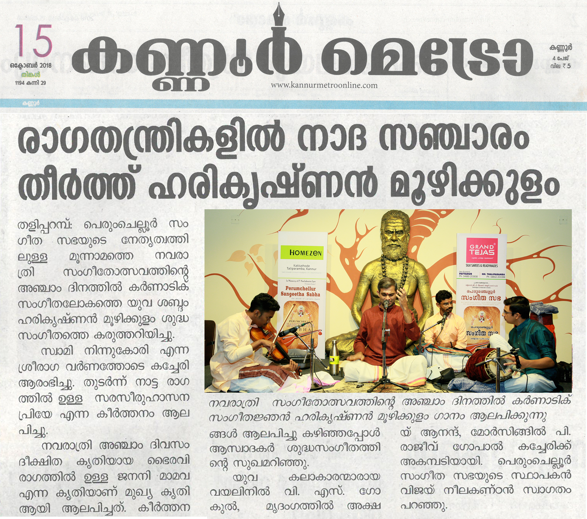 *രാഗതന്ത്രികളിൽ നാദ സഞ്ചാരം തീർത്തു ഹരികൃഷ്ണൻ മൂഴിക്കുളം* *പെരുംചെല്ലൂർ സംഗീത സഭയുടെ* നേതൃത്വത്തിലുള്ള മൂന്നാമത്തെ നവരാത്രി സംഗീതോത്സവത്തിന്റെ അഞ്ചാം ദിനത്തിൽ കർണാടിക് സംഗീതലോകത്തെ യുവ ശബ്ദം ഹരികൃഷ്ണൻ മൂഴിക്കുളം ശുദ്ധസംഗീതത്തെ കരുത്തറിയിച്ചു. സ്വാമി നിന്നുകോരി എന്ന ശ്രീരാഗ വർണത്തോടെ കച്ചേരി ആരംഭിച്ചു. തുടർന്ന് നാട്ട രാഗത്തിൽ ഉള്ള സരസീരുഹാസനപ്രിയേ എന്ന കീർത്തനം ആലപിച്ചു. നവരാത്രി അഞ്ചാം ദിവസം ദീക്ഷിത കൃതിയായ ഭൈരവി രാഗത്തിൽ ഉള്ള ജനനി മാമവ എന്ന കൃതിയാണ് മുഖ്യ കൃതി ആയി ആലപിച്ചത്. കീർത്തനങ്ങൾ ആലപിച്ചു കഴിഞ്ഞപ്പോൾ ആസ്വാദകർ ശുദ്ധസംഗീതത്തിന്റെ സുഖമറിഞ്ഞു. യുവ കലാകാരന്മാരായ വയലിനിൽ വി. എസ്. ഗോകുൽ, മൃദംഗത്തിൽ അക്ഷയ് ആനന്ദ്, മോർസിങ്ങിൽ പി. രാജീവ് ഗോപാൽ കച്ചേരിക്ക് അകമ്പടിയായി. പെരുംചെല്ലൂർ സംഗീത സഭയുടെ സ്ഥാപകൻ വിജയ് നീലകണ്ഠൻ സ്വാഗതം പറഞ്ഞു.