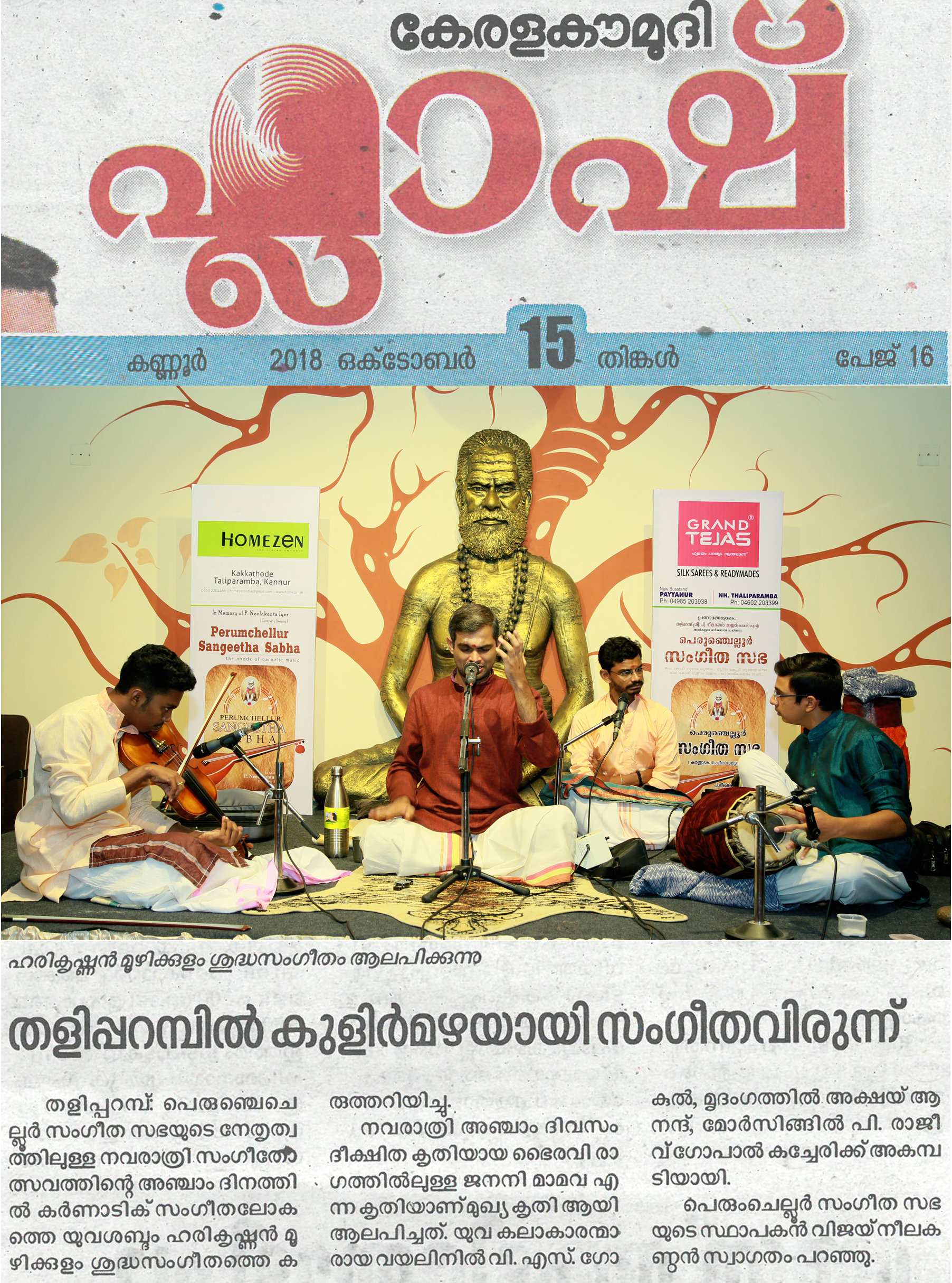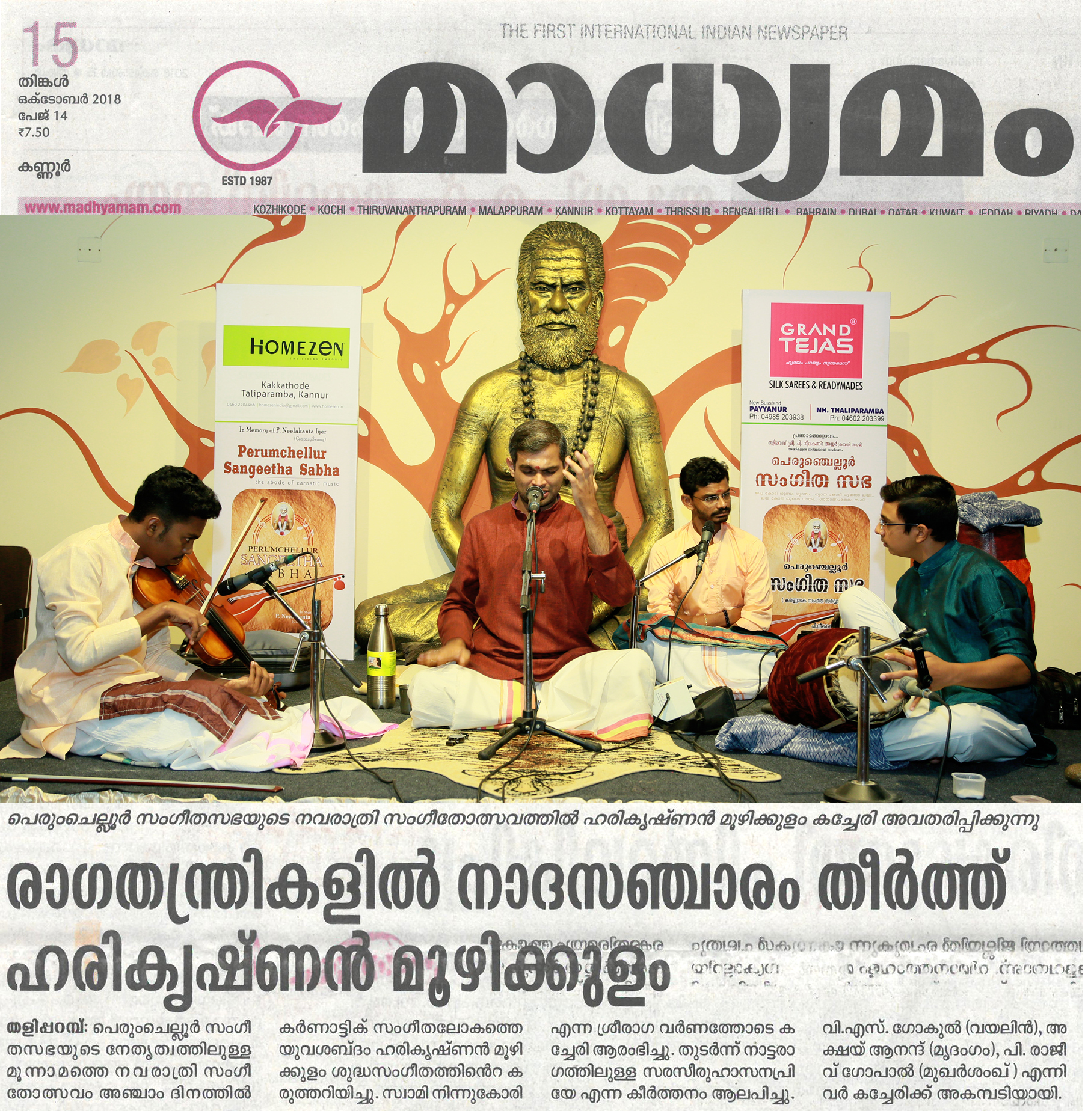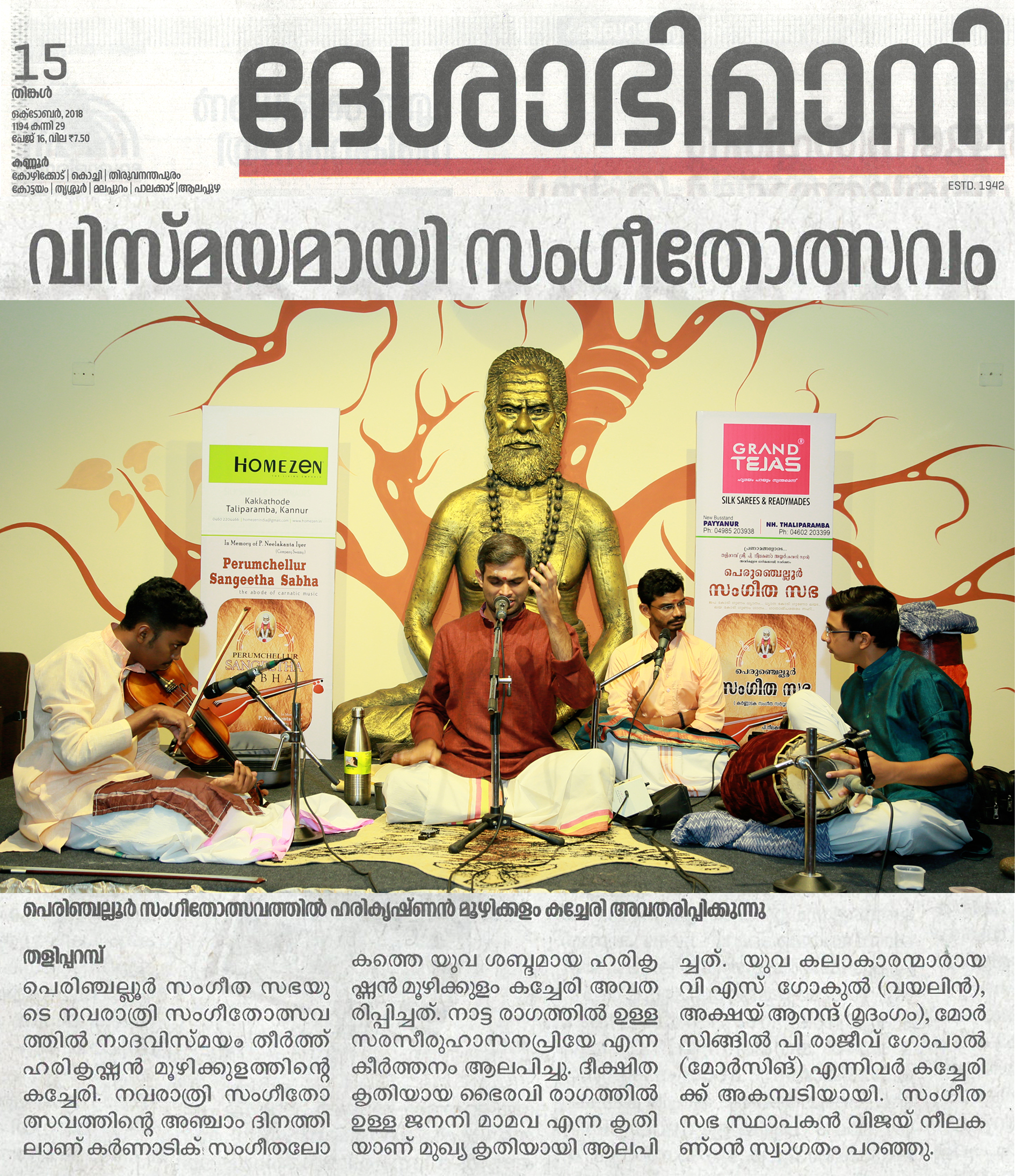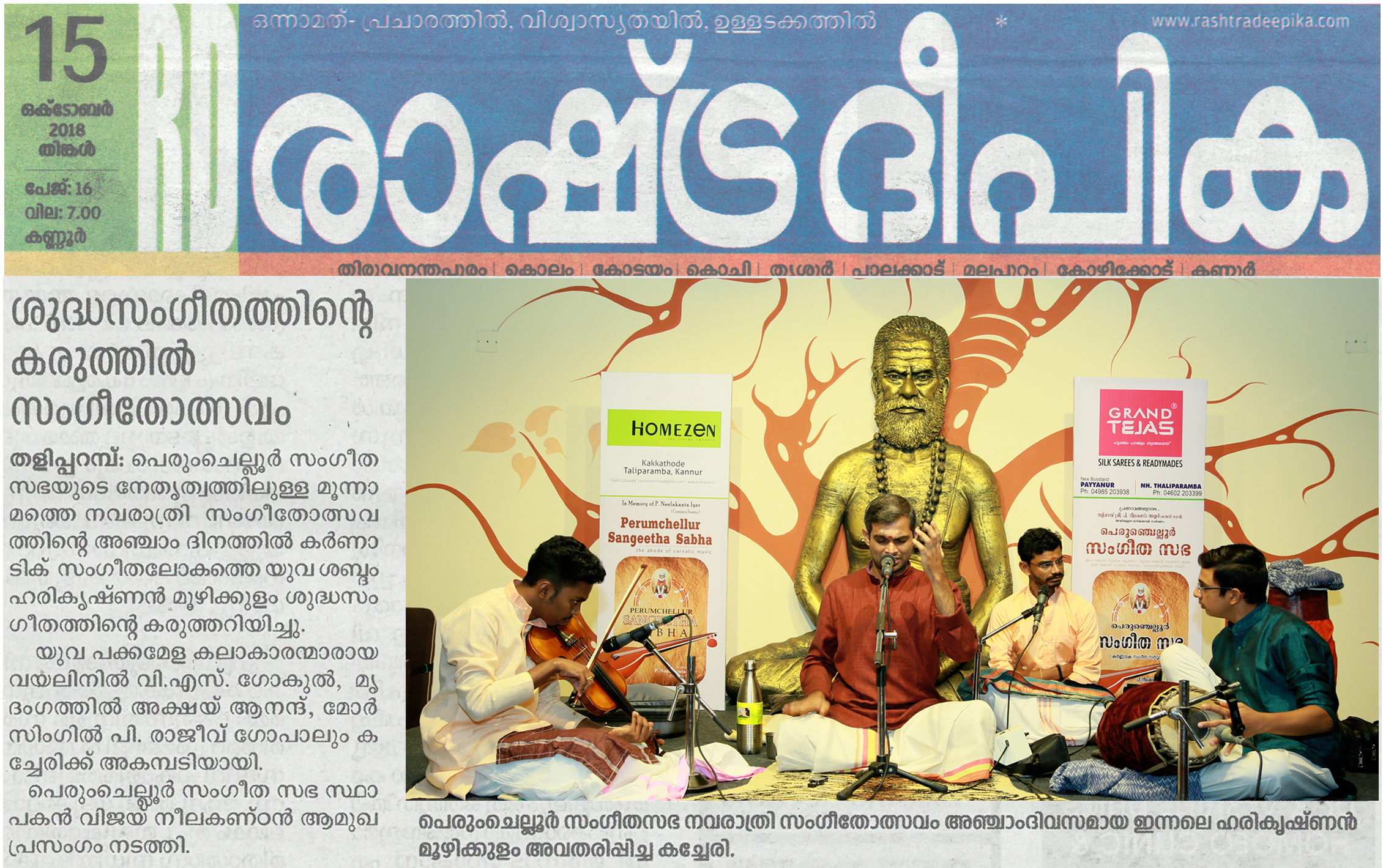 *രാഗതന്ത്രികളിൽ നാദ സഞ്ചാരം തീർത്തു ഹരികൃഷ്ണൻ മൂഴിക്കുളം* *പെരുംചെല്ലൂർ സംഗീത സഭയുടെ* നേതൃത്വത്തിലുള്ള മൂന്നാമത്തെ നവരാത്രി സംഗീതോത്സവത്തിന്റെ അഞ്ചാം ദിനത്തിൽ കർണാടിക് സംഗീതലോകത്തെ യുവ ശബ്ദം ഹരികൃഷ്ണൻ മൂഴിക്കുളം ശുദ്ധസംഗീതത്തെ കരുത്തറിയിച്ചു. സ്വാമി നിന്നുകോരി എന്ന ശ്രീരാഗ വർണത്തോടെ കച്ചേരി ആരംഭിച്ചു. തുടർന്ന് നാട്ട രാഗത്തിൽ ഉള്ള സരസീരുഹാസനപ്രിയേ എന്ന കീർത്തനം ആലപിച്ചു. നവരാത്രി അഞ്ചാം ദിവസം ദീക്ഷിത കൃതിയായ ഭൈരവി രാഗത്തിൽ ഉള്ള ജനനി മാമവ എന്ന കൃതിയാണ് മുഖ്യ കൃതി ആയി ആലപിച്ചത്. കീർത്തനങ്ങൾ ആലപിച്ചു കഴിഞ്ഞപ്പോൾ ആസ്വാദകർ ശുദ്ധസംഗീതത്തിന്റെ സുഖമറിഞ്ഞു. യുവ കലാകാരന്മാരായ വയലിനിൽ വി. എസ്. ഗോകുൽ, മൃദംഗത്തിൽ അക്ഷയ് ആനന്ദ്, മോർസിങ്ങിൽ പി. രാജീവ് ഗോപാൽ കച്ചേരിക്ക് അകമ്പടിയായി. പെരുംചെല്ലൂർ സംഗീത സഭയുടെ സ്ഥാപകൻ വിജയ് നീലകണ്ഠൻ സ്വാഗതം പറഞ്ഞു.
