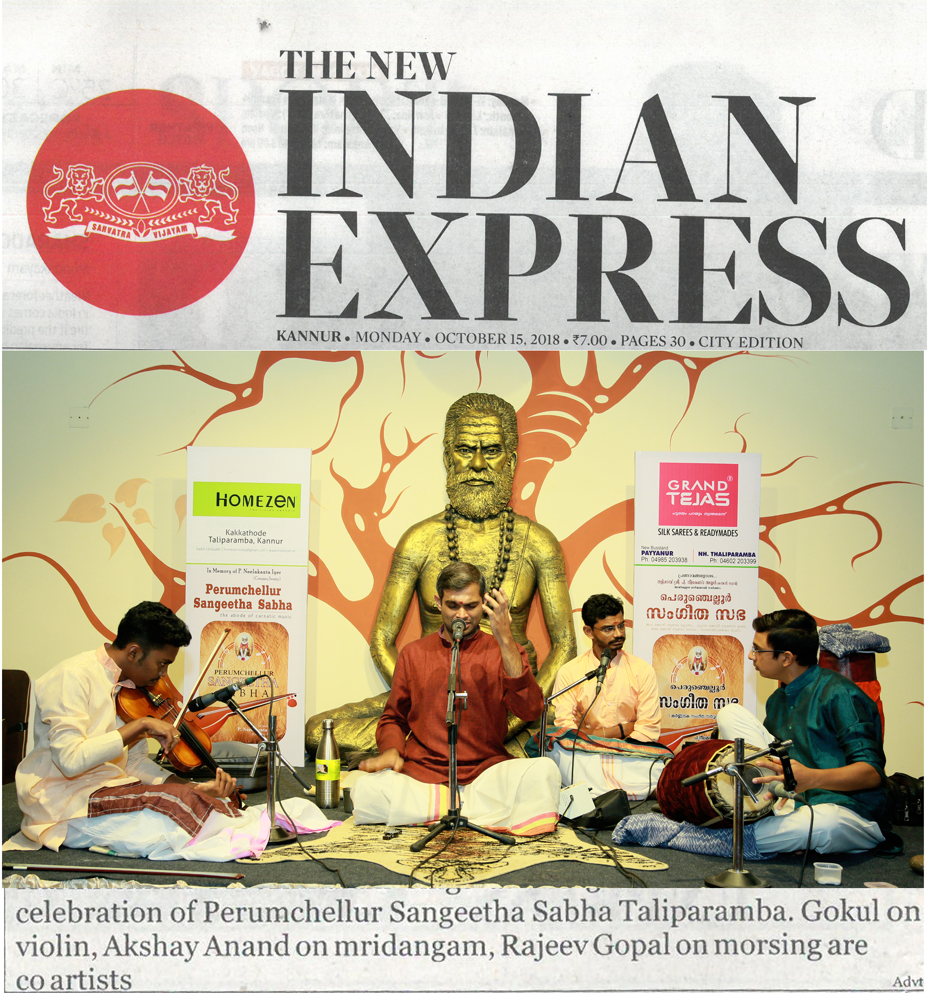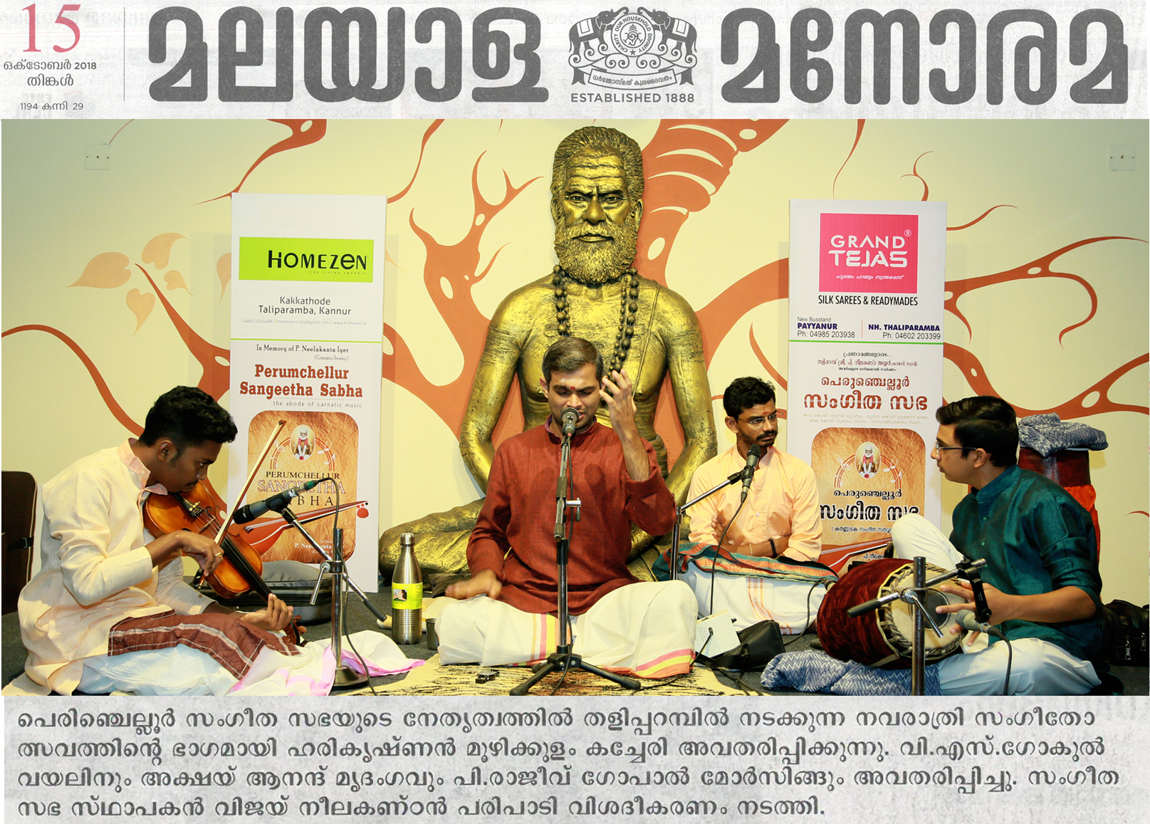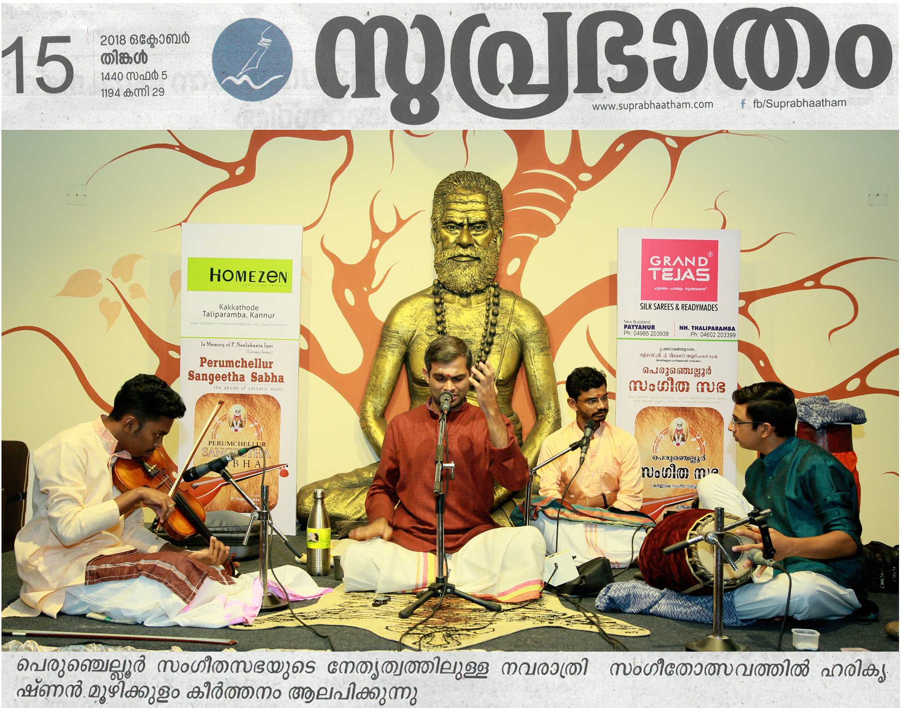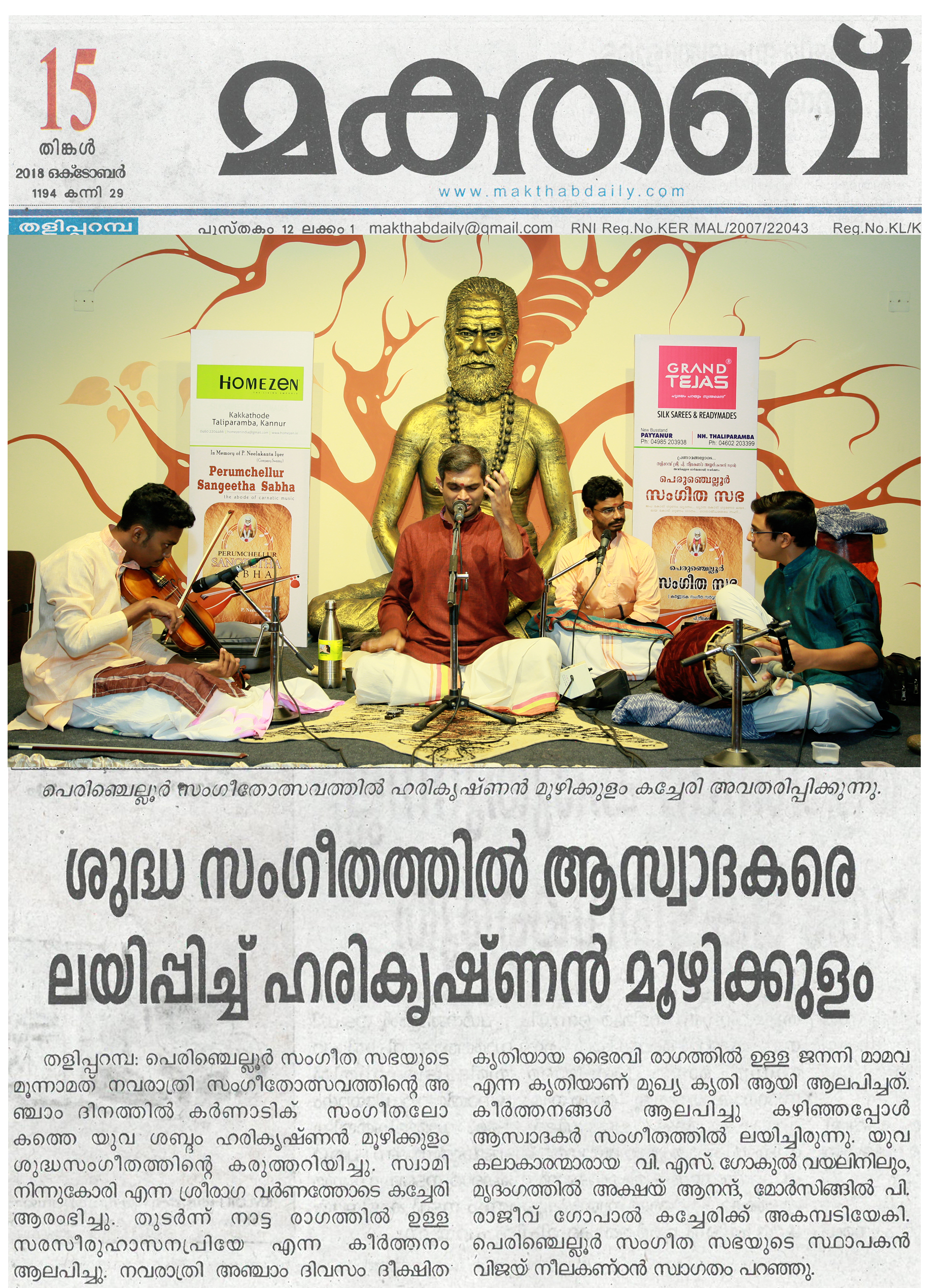 *രാഗതന്ത്രികളിൽ നാദ സഞ്ചാരം തീർത്തു ഹരികൃഷ്ണൻ മൂഴിക്കുളം* *പെരുംചെല്ലൂർ സംഗീത സഭയുടെ* നേതൃത്വത്തിലുള്ള മൂന്നാമത്തെ നവരാത്രി സംഗീതോത്സവത്തിന്റെ അഞ്ചാം ദിനത്തിൽ കർണാടിക് സംഗീതലോകത്തെ യുവ ശബ്ദം ഹരികൃഷ്ണൻ മൂഴിക്കുളം ശുദ്ധസംഗീതത്തെ കരുത്തറിയിച്ചു. സ്വാമി നിന്നുകോരി എന്ന ശ്രീരാഗ വർണത്തോടെ കച്ചേരി ആരംഭിച്ചു. തുടർന്ന് നാട്ട രാഗത്തിൽ ഉള്ള സരസീരുഹാസനപ്രിയേ എന്ന കീർത്തനം ആലപിച്ചു. നവരാത്രി അഞ്ചാം ദിവസം ദീക്ഷിത കൃതിയായ ഭൈരവി രാഗത്തിൽ ഉള്ള ജനനി മാമവ എന്ന കൃതിയാണ് മുഖ്യ കൃതി ആയി ആലപിച്ചത്. കീർത്തനങ്ങൾ ആലപിച്ചു കഴിഞ്ഞപ്പോൾ ആസ്വാദകർ ശുദ്ധസംഗീതത്തിന്റെ സുഖമറിഞ്ഞു. യുവ കലാകാരന്മാരായ വയലിനിൽ വി. എസ്. ഗോകുൽ, മൃദംഗത്തിൽ അക്ഷയ് ആനന്ദ്, മോർസിങ്ങിൽ പി. രാജീവ് ഗോപാൽ കച്ചേരിക്ക് അകമ്പടിയായി. പെരുംചെല്ലൂർ സംഗീത സഭയുടെ സ്ഥാപകൻ വിജയ് നീലകണ്ഠൻ സ്വാഗതം പറഞ്ഞു.