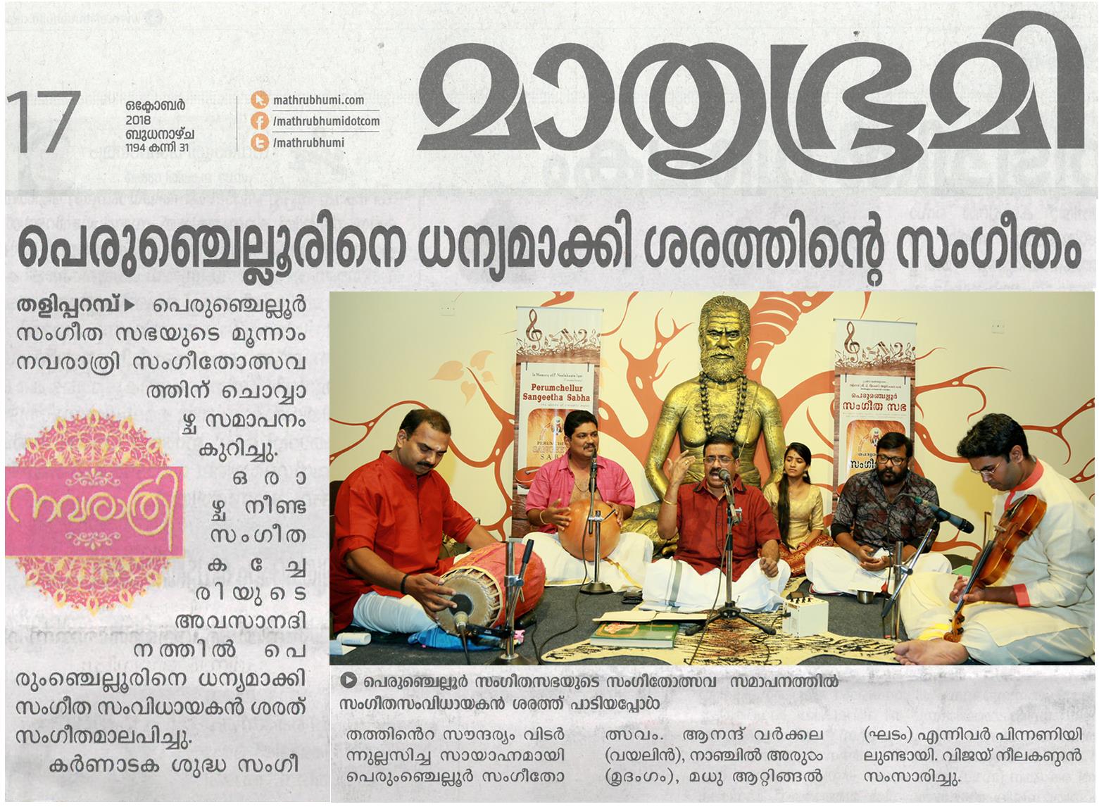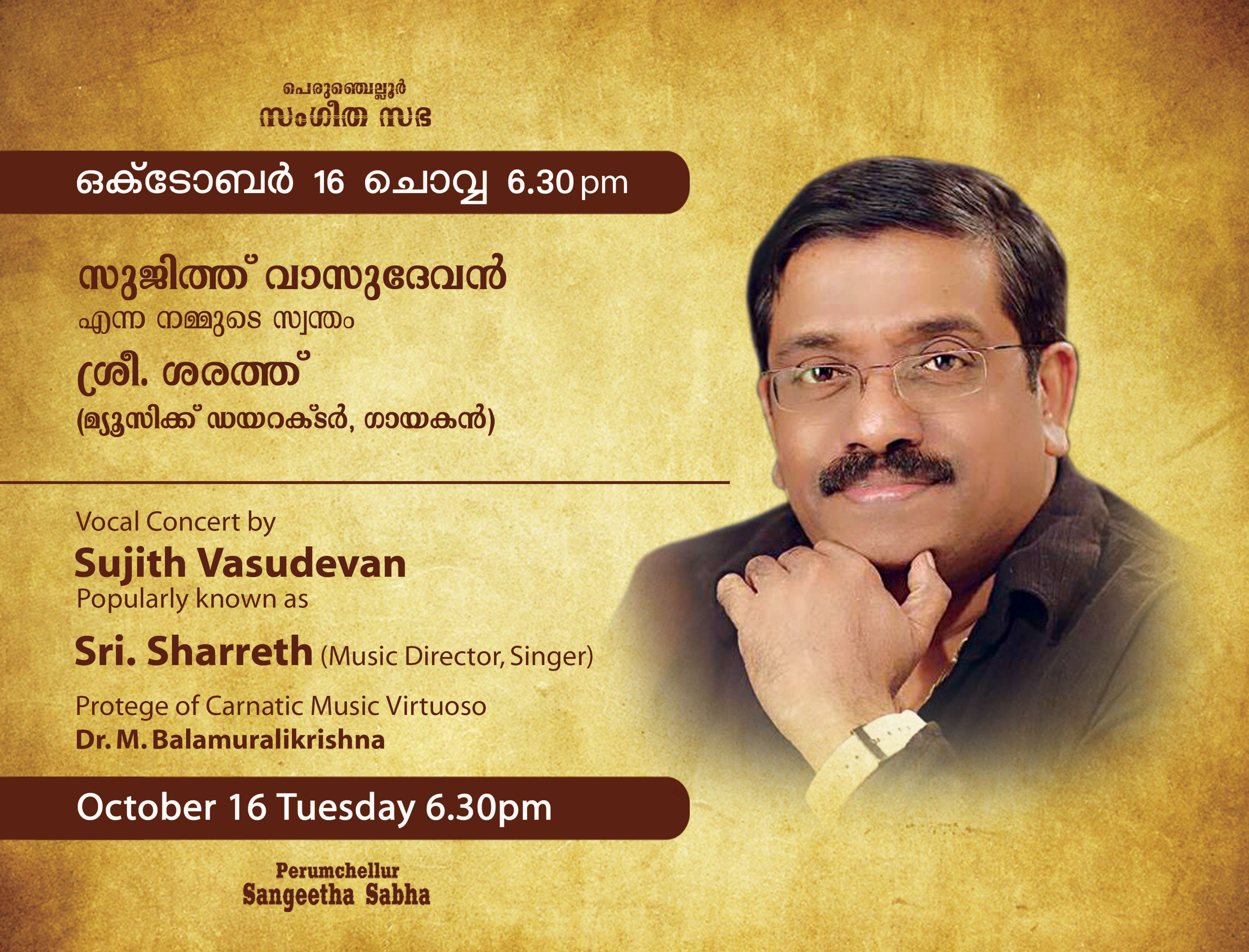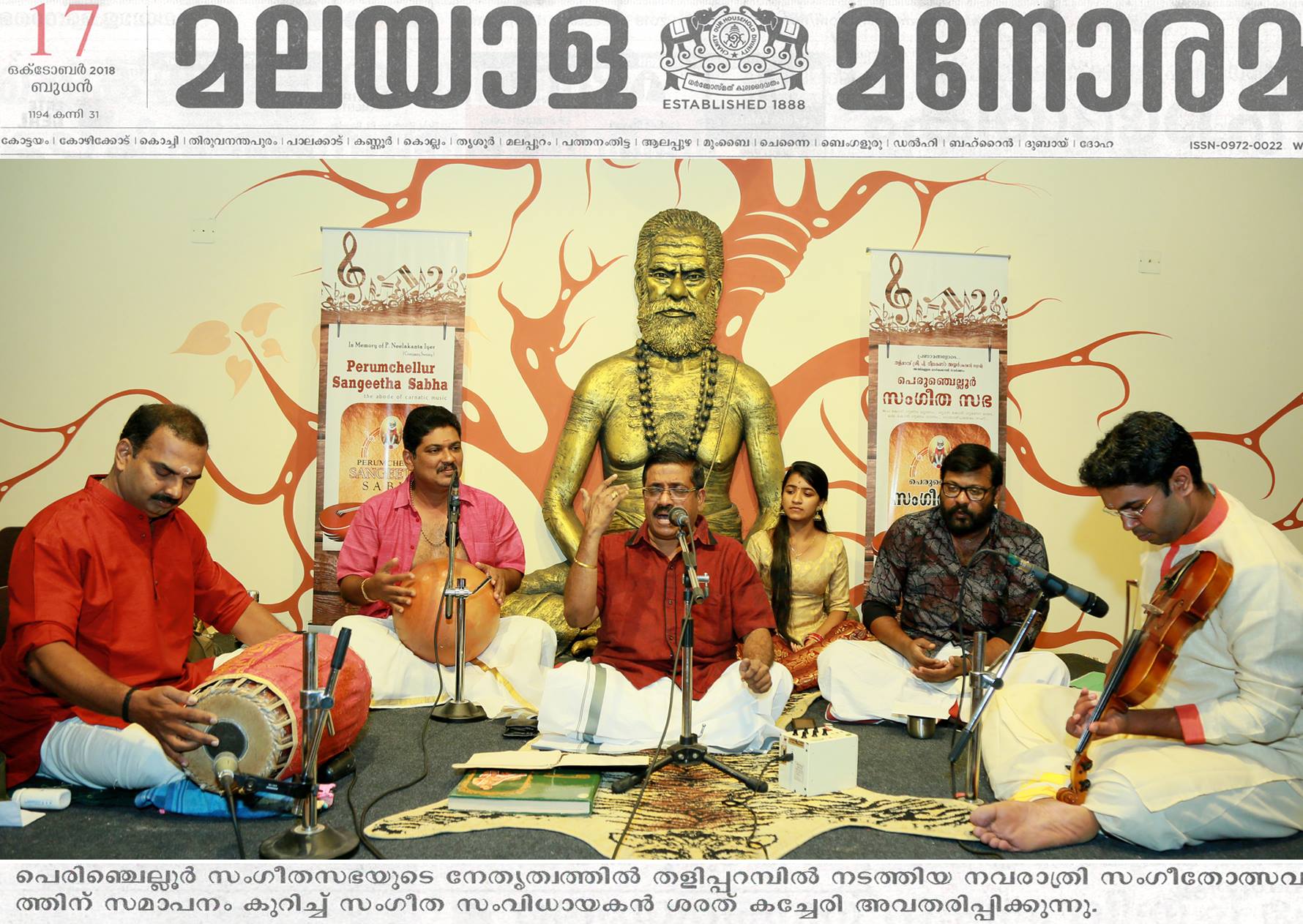 പെരുംചെല്ലൂർ സംഗീത സഭയുടെ മൂന്നാം നവരാത്രി സംഗീതോത്സവത്തിന്റെ ഭാഗമായി നടന്ന ഒരാഴ്ച നീണ്ട സംഗീത കച്ചേരി ശുദ്ധ സംഗീത പ്രേമികള്ക്ക് അമൃതധാരയായി. ഭക്തിയും ഭാവവും നിറഞ്ഞു തുളുമ്പുന്ന ആലാപന ശൈലിയിലൂടെ ആനന്ദിപ്പിച്ച അതുല്യ കലാകാരന്മാർ ശാസ്ത്രീയ സംഗീത ലോകത്തും ഗാന സംവിധാന രംഗത്തും പ്രശസ്തനായ ശ്രീ.ശരത് കര്ണാടക ശുദ്ധ സംഗീതത്തിന്റെ തരുണ സൗന്ദര്യം വിടര്ന്നുല്ലസിച്ച സായാഹ്നത്തില് പാട്ടിന്റെ മോഹനാനുഭവം പകര്ന്നത്. കച്ചേരി നേരിട്ട് കേട്ടപ്പോൾ ഉണ്ടായ അനുഭവം, ആസ്വാദകർക്കിടയിൽ വാക്കുകൾ കൊണ്ട് വർണ്ണിക്കാൻ ആയില്ല. കച്ചേരി കാതുകളിൽ അമൃതധാര പൊഴിയുന്ന പോലുള്ള അനുഭൂതിയാണ് പകർന്നു നൽകിയത്. ശ്രീ. ശരത് സംഗീതത്തിൽ ഒരു സർവ്വ വിജ്ഞാനകോശം ആണെന്ന കാര്യത്തിൽ ആർക്കും സംശയം ഉണ്ടാകില്ല. ഗായകന് വഴിവിളിക്കായി വേദിയിലുണ്ടായിരുന്ന കലാകാരന്മാരായ ശ്രീ ആനന്ദ് വർക്കല (വയലിന്), ശ്രീ. dr.നാഞ്ചിൽ അരുൾ (മൃദംഗം), മധു ആറ്റിങ്ങൽ (ഘടം )എന്നിവരും ആസ്വാധകുരുടെ ഹൃദയത്തില് ഇടം നേടി. ആസ്വാദനത്തെ അനായാസമാക്കുന്ന ലളിതസുന്ദരമായ ആലാപനത്തിന്റെ സുഖം ആസ്വാദകര് അനുഭവിച്ചറിഞ്ഞു. താളാത്മകതയുടെ സൗന്ദര്യത്തോടൊപ്പം വിശാലമായ രാഗവിസ്താരത്തിന്റെ കാല്പനിക ഭാവവും ആസ്വാദനത്തിന്റെ പുതിയ തലങ്ങളിലേക്ക് ഇഴ ചേര്ത്തു.
