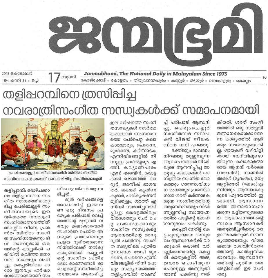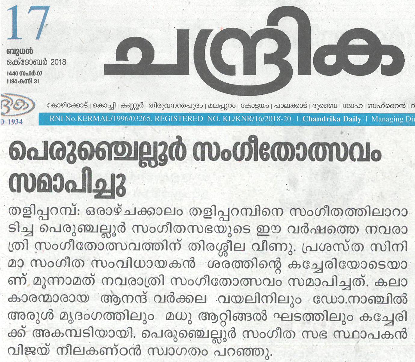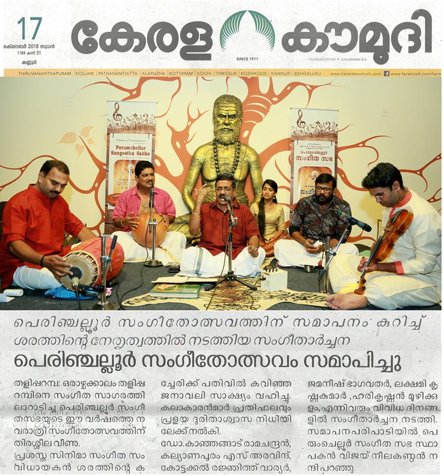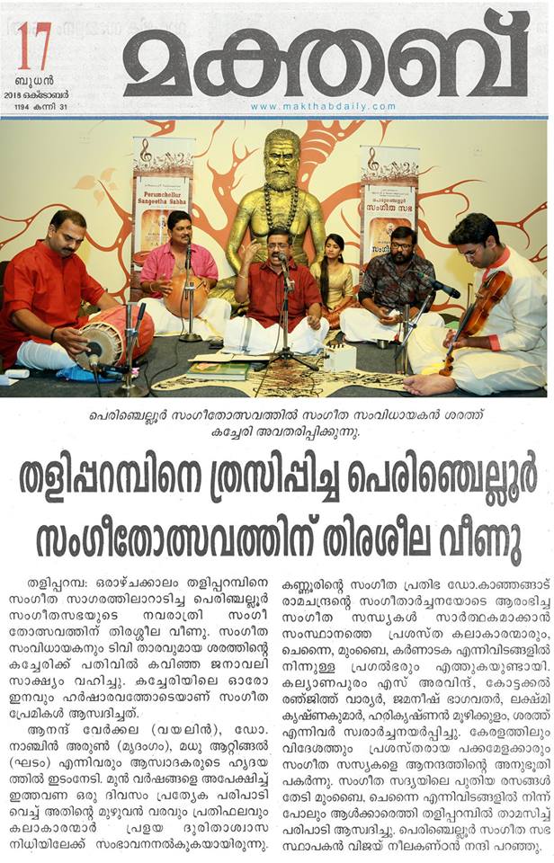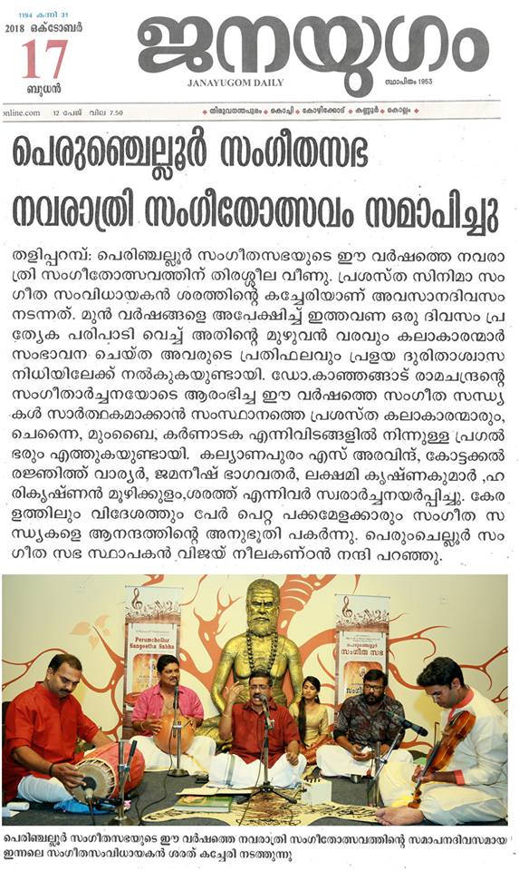പെരുംചെല്ലൂർ സംഗീത സഭയുടെ മൂന്നാം നവരാത്രി സംഗീതോത്സവത്തിന്റെ ഭാഗമായി നടന്ന ഒരാഴ്ച നീണ്ട സംഗീത കച്ചേരി ശുദ്ധ സംഗീത പ്രേമികള്ക്ക് അമൃതധാരയായി. ഭക്തിയും ഭാവവും നിറഞ്ഞു തുളുമ്പുന്ന ആലാപന ശൈലിയിലൂടെ ആനന്ദിപ്പിച്ച അതുല്യ കലാകാരന്മാർ ശാസ്ത്രീയ സംഗീത ലോകത്തും ഗാന സംവിധാന രംഗത്തും പ്രശസ്തനായ ശ്രീ.ശരത് കര്ണാടക ശുദ്ധ സംഗീതത്തിന്റെ തരുണ സൗന്ദര്യം വിടര്ന്നുല്ലസിച്ച സായാഹ്നത്തില് പാട്ടിന്റെ മോഹനാനുഭവം പകര്ന്നത്. കച്ചേരി നേരിട്ട് കേട്ടപ്പോൾ ഉണ്ടായ അനുഭവം, ആസ്വാദകർക്കിടയിൽ വാക്കുകൾ കൊണ്ട് വർണ്ണിക്കാൻ ആയില്ല. കച്ചേരി കാതുകളിൽ അമൃതധാര പൊഴിയുന്ന പോലുള്ള അനുഭൂതിയാണ് പകർന്നു നൽകിയത്. ശ്രീ. ശരത് സംഗീതത്തിൽ ഒരു സർവ്വ വിജ്ഞാനകോശം ആണെന്ന കാര്യത്തിൽ ആർക്കും സംശയം ഉണ്ടാകില്ല. ഗായകന് വഴിവിളിക്കായി വേദിയിലുണ്ടായിരുന്ന കലാകാരന്മാരായ ശ്രീ ആനന്ദ് വർക്കല (വയലിന്), ശ്രീ. dr.നാഞ്ചിൽ അരുൾ (മൃദംഗം), മധു ആറ്റിങ്ങൽ (ഘടം )എന്നിവരും ആസ്വാധകുരുടെ ഹൃദയത്തില് ഇടം നേടി. ആസ്വാദനത്തെ അനായാസമാക്കുന്ന ലളിതസുന്ദരമായ ആലാപനത്തിന്റെ സുഖം ആസ്വാദകര് അനുഭവിച്ചറിഞ്ഞു. താളാത്മകതയുടെ സൗന്ദര്യത്തോടൊപ്പം വിശാലമായ രാഗവിസ്താരത്തിന്റെ കാല്പനിക ഭാവവും ആസ്വാദനത്തിന്റെ പുതിയ തലങ്ങളിലേക്ക് ഇഴ ചേര്ത്തു.