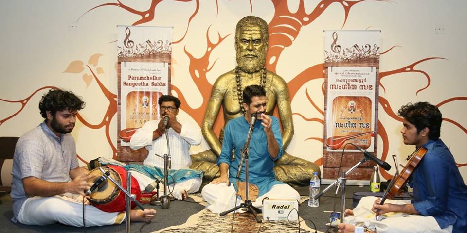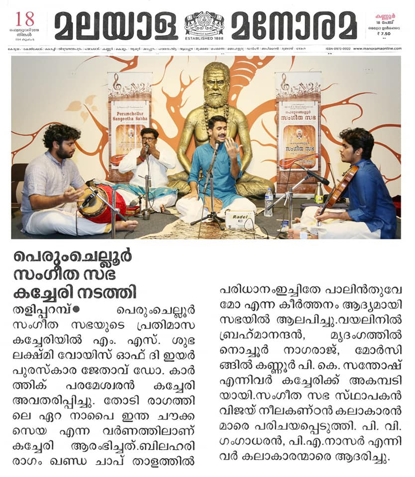രാഗമായി... ഭാവമായി.. Dr. കാർത്തിക് പരമേശ്വരൻ പെരുംചെല്ലൂർ സംഗീത സഭയുടെ നേതൃത്വത്തിലുള്ള പ്രതിമാസ കച്ചേരിയിൽ എം. എസ്. സുഭലക്ഷ്മി വോയിസ് ഓഫ് ദി ഇയർ 2018 ലെ പുരസ്കാര ജേതാവ് Dr. കാർത്തിക് പരമേശ്വരൻ ശുദ്ധസംഗീതത്തിന്റെ കരുത്തറിയിച്ചു. തോടി രാഗത്തിലെ ഏറ നാപൈ ഇന്ത ചൗക്ക സെയ എന്ന വർണത്തിൽ കച്ചേരി ആരംഭിച്ചു.മുത്തയ്യ ഭാഗവതരുടെ ഹംസധ്വനി രാഗത്തിലെ ഗംഗണപതേ നമോ നമോ ശങ്കരി തനയാ എന്ന കീർത്തനം ആലപിച്ചു. വന്ദനമു രഘു നന്ദന ശഹാന രാഗത്തിലെ ത്യാഗരാജ കൃതി ആലപിച്ചപ്പോൾ സദസ് ഭക്തിനിർഭരമായി. തൃപ്പൂണിത്തറ സ്വദേശി ടി. ജി. കൃഷ്ണയ്യർ (ലളിതാദാസർ) രചിച്ചു ചെമ്പൈ സംഗീതം നൽകി ഹംസാനന്ദി രാഗം രൂപകം താളത്തിൽ പാവന ഗുരു ആലാപനം സംഗീതആസ്വാദകരുടെ മനം കവർന്നു. ബിലഹരി രാഗം ഖണ്ഡ ചാപ് താളത്തിൽ പരിധാനംഇച്ചിതേ പാലിൻതുവേമോ എന്ന കീർത്തനം ആദ്യമായി സഭയിൽ ആലപിച്ചു. ദ്വൈതമു സുഖമാ എന്ന രീതിഗൗള രാഗത്തിലെ ത്യാഗരാജ കീർത്തനം സെമ്മാങ്കുടി ശ്രീനിവാസ് അയ്യരുടെ ശൈലിയെ ഓർമപ്പെടുത്തി. ആഹിരി രാഗത്തിൽ പനിമതി മുഖി ബാലെ എന്ന സ്വാതിതിരുനാൾ കൃതി കഴിഞ്ഞു മംഗളം പാടി കച്ചേരി അവസാനിപ്പിച്ചു. വയലിനിൽ ബ്രഹ്മാനന്ദൻ, മൃദംഗത്തിൽ നൊച്ചൂർ നാഗരാജ്, മോർസിങ്ങിൽ കണ്ണൂർ പി. കെ. സന്തോഷ് കച്ചേരിക്ക് അകമ്പടിയായി. പെരുംചെല്ലൂർ സംഗീത സഭയുടെ സ്ഥാപകൻ വിജയ് നീലകണ്ഠൻ സ്വാഗതം പറഞ്ഞു. ശ്രീ. പി. വി. ഗംഗാധരൻ, ശ്രീ. നാസർ അറബ് ഇരുവരും ചേർന്ന് കലാകാരന്മാരെ ആദരിച്ചു.