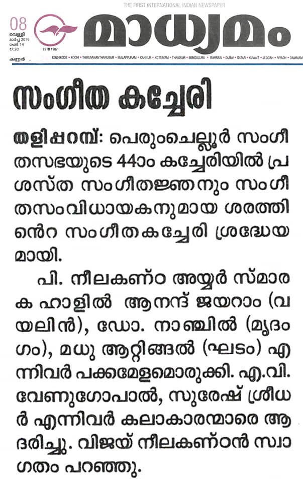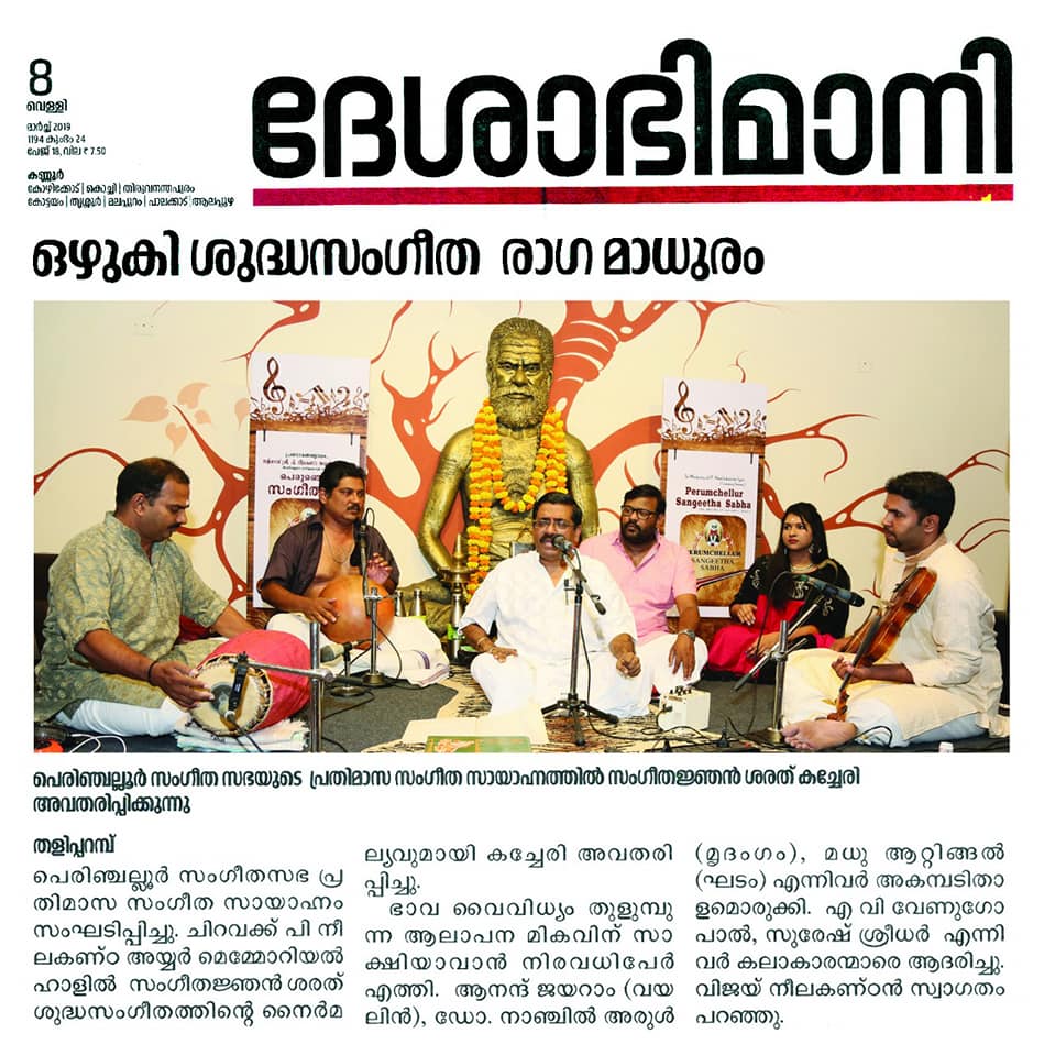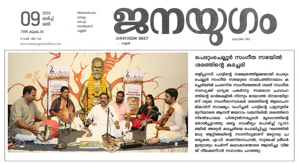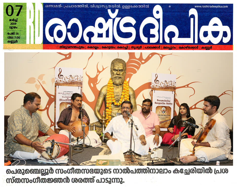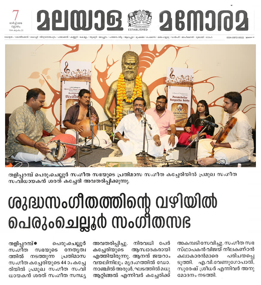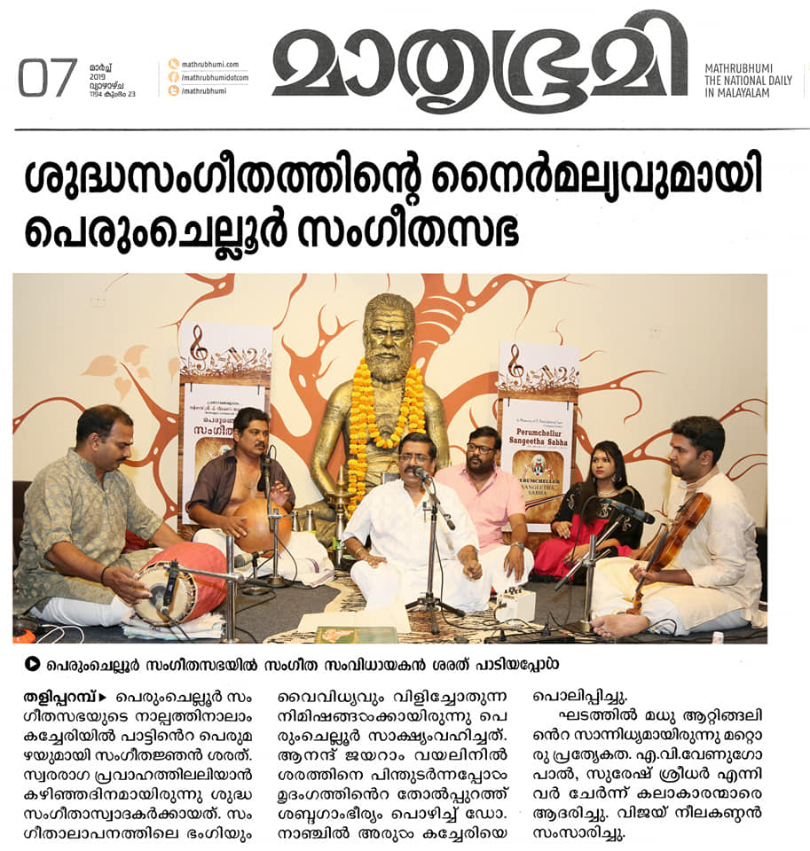 ശുദ്ധ സംഗീതത്തിന്റെ നൈർമല്യവുമായി പെരുംചെല്ലൂർ സംഗീത സഭ. പാട്ടിന്റെ നക്ഷത്രത്തിളക്കമായി പെരുംചെല്ലൂർ സംഗീത സഭയുടെ നാല്പത്തിനാലാം കച്ചേരിയിൽ പ്രശസ്ത സംഗീതജ്ഞൻ ശരത് സംഗീത സന്ധ്യക്ക് ധന്യത പകർന്നു. സ്വരരാഗ പ്രവാഹത്തിന്റെ ഓർമകളിൽ നിന്നും മായാത്ത ദിനമായിട്ടാണ് ശുദ്ധ സംഗീതാസ്വാദകർ ശരത്തിന്റെ ഭാവ വൈവിധ്യം തുളുമ്പുന്ന ആലാപന മികവിന് സാക്ഷ്യം വഹിച്ചത്. പാട്ടിന്റെ പട്ടുനൂലിഴ മുറിയാതെ ആനന്ദ് ജയറാം വയനിലിൽ ശരത്തിനെ നിഴൽപോലെ പിന്തുടർന്നപ്പോൾ, മൃദംഗത്തിന്റെ തോൽപ്പുറത്തു ശബ്ദ ഗാംഭീര്യം പൊഴിച്ച് dr. നാഞ്ചിൽ അരുൾ കച്ചേരിയെ പൊലിപ്പിച്ചു. ഘടത്തിൽ മധു ആറ്റിങ്ങലിന്റെ സാന്നിധ്യമാണ് മറ്റൊരു പ്രത്യേകത. തോടി രാഗത്തിലെ സരഗുണ എന്ന വർണത്തോടെ കച്ചേരി ആരംഭിച്ചു. ശ്രീ. ബാലമുരളികൃഷ്ണയുടെ ഹംസധ്വനി രാഗത്തിലെ പാഹിപ്രഭോ, ലവംഗി രാഗത്തിലെ ഓംകാര എന്ന കീർത്തനം പാടി കഴിഞ്ഞപ്പോൾ ശുദ്ധ സംഗീതത്തിൽ ആസ്വാദകർ മതിമറന്നു. ത്യാഗരാജ സ്വാമികളുടെ ആഭേരി രാഗത്തിലെ നഗുമോ എന്ന കീർത്തനം പാടി കഴിഞ്ഞപ്പോൾ ആനന്ദത്തിന്റെ ഉത്സവത്തിൽ ആസ്വാദകർ നീരാടി. മോഹന രാഗത്തിലെ ഉറ്റ്റുമയ്, കാപ്പി രാഗത്തിലെ ജഗദോദ്ധാരണ എന്നീ കീർത്തനങ്ങളും ആലപിച്ചു. ശ്രീ. എ. വി. വേണുഗോപാൽ, ശ്രീ. സുരേഷ് ശ്രീധർ കലാകാരന്മാരെ ആദരിച്ചു.
