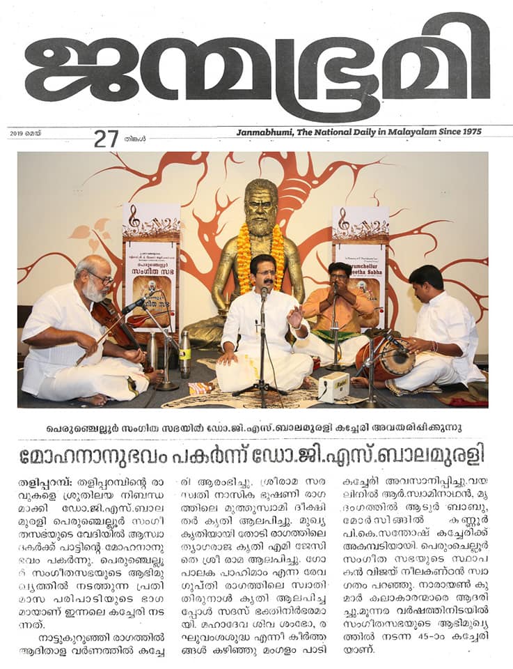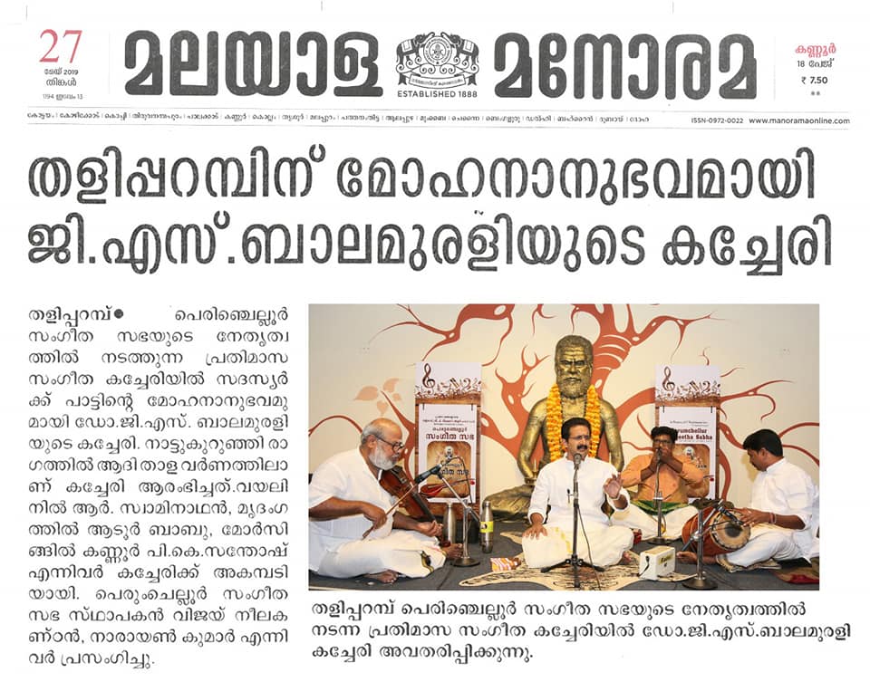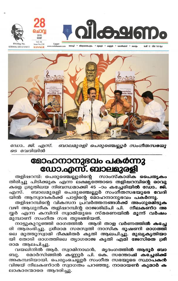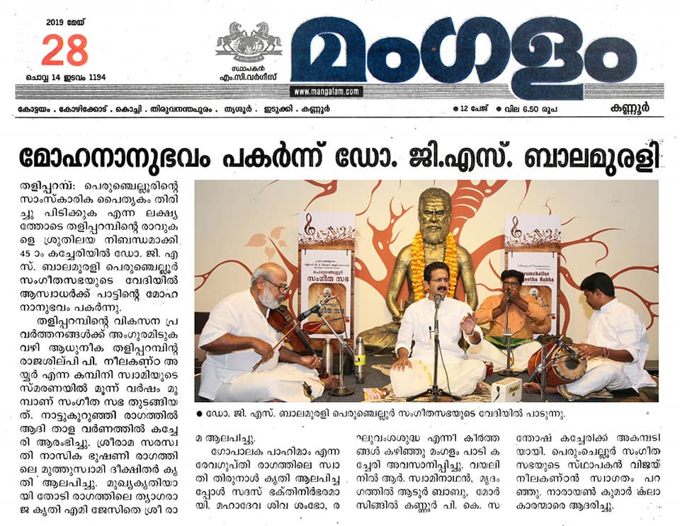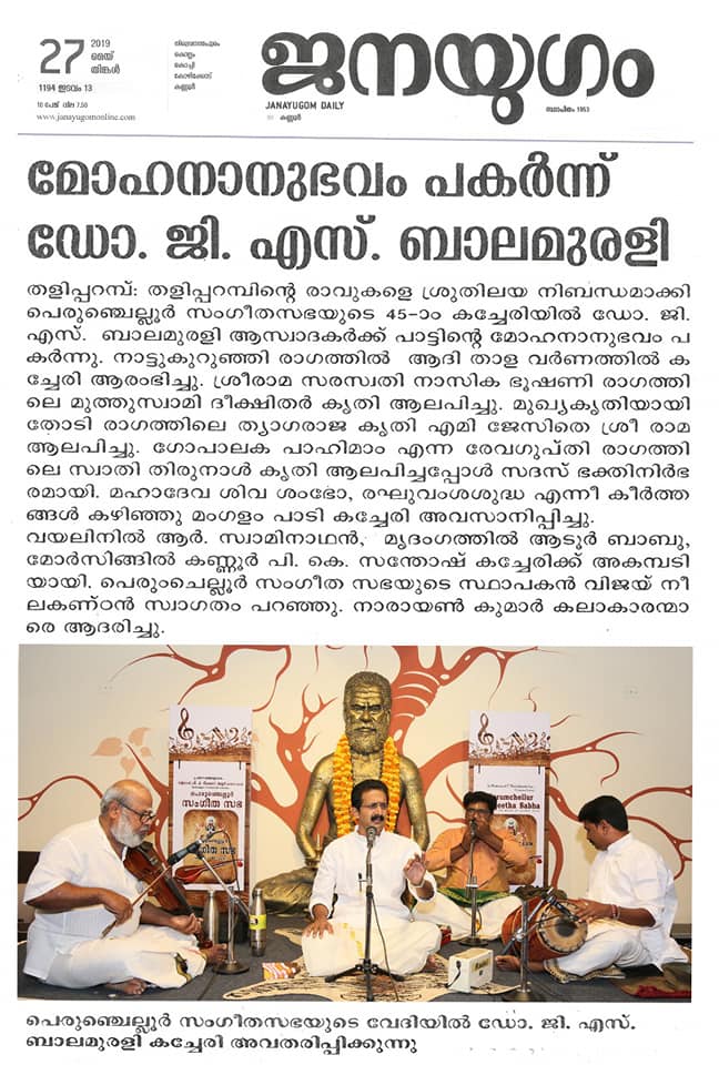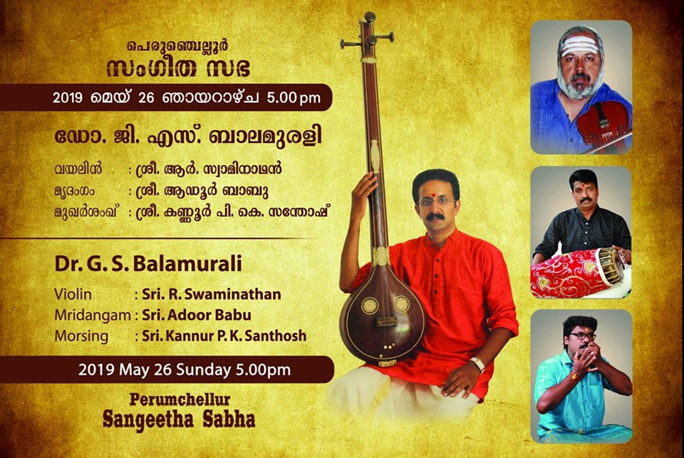 What a spell binding performance this evening by Carnatic vocalist Dr. G. S. Balamurali! Concert was rich in content, and proved to be a quality experience. Began the concert briskly with Bhajamaanasa (Bhahudhaari). Followed by Maamava Meenakshi (Varaali), Marukelara (Jayanthasree), Annapoorne (Shyama), Gopalaka paahima (revagupthi), Saamagaanalolane (Hindolam), Mahadeva Shiva Shambo (Revathy), Raghuvamshasudham (Kadhanakuthoohalam). Ennaalu uraka (shubhapandhuvaraali), Aarabhimaanam (Raaghamaalika), showed his experience on the concert platform - the structure, planning and allocation of time that goes with it. Delineated the raga with all attendant niceties and it was quite protracted as well. Krishna nee begane (yaman kalyani), Bhaja Bhaja Maanasa (Sindhibhairavi), Ennathavam (Kaappi), Radhasametha (Yaman Kalyani) had a calming influence on the mind. Sri. R. Swaminathan on violin, Sri. Aadoor Babu on Mridangam & Sri. Kannur Santhosh on Morsing combined well to take the audience to a musical `Yatra' during their performance at Perumchellur Sangeetha Sabha, Taliparamba held at P. Neelakanta Iyer Memorial Hall on 26 May 2019. It was indeed a serene recital. A sincere exercise and a dedicated performance?. R. Swaminathans violin faithfully reproduced all the sancharas and the clarity of the notes bowed out was laudable. A spirited, high-decibel tani by Aadoor Babu and Santhosh won applause from the audience.