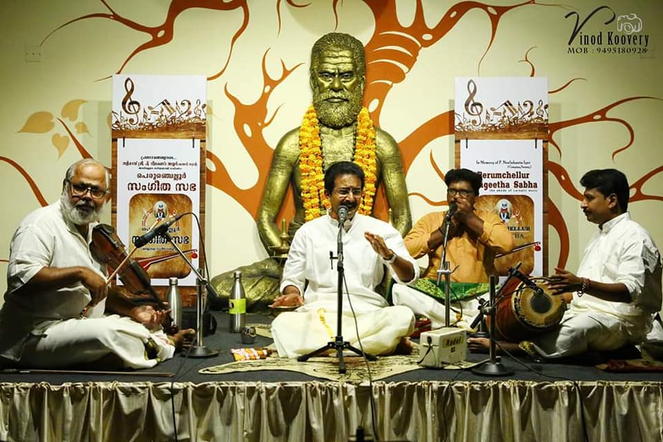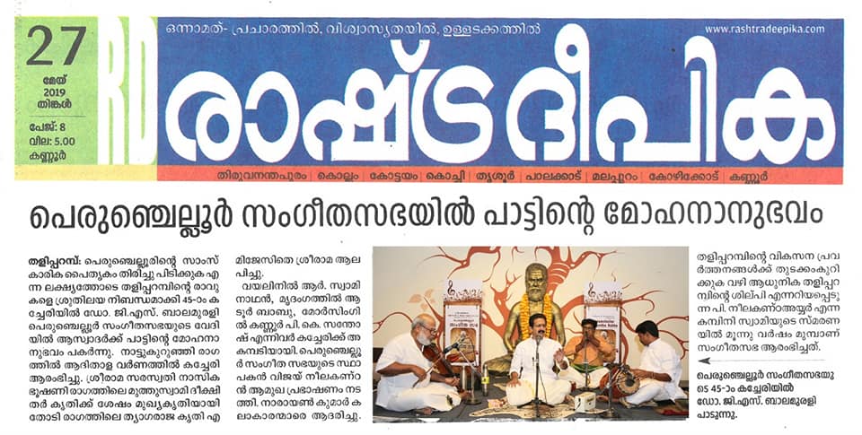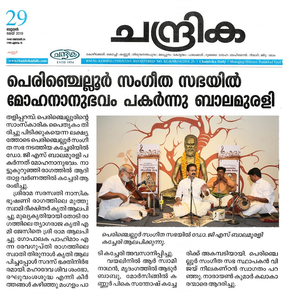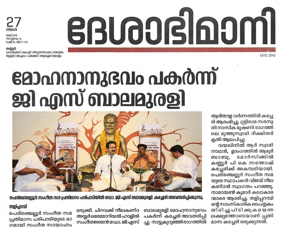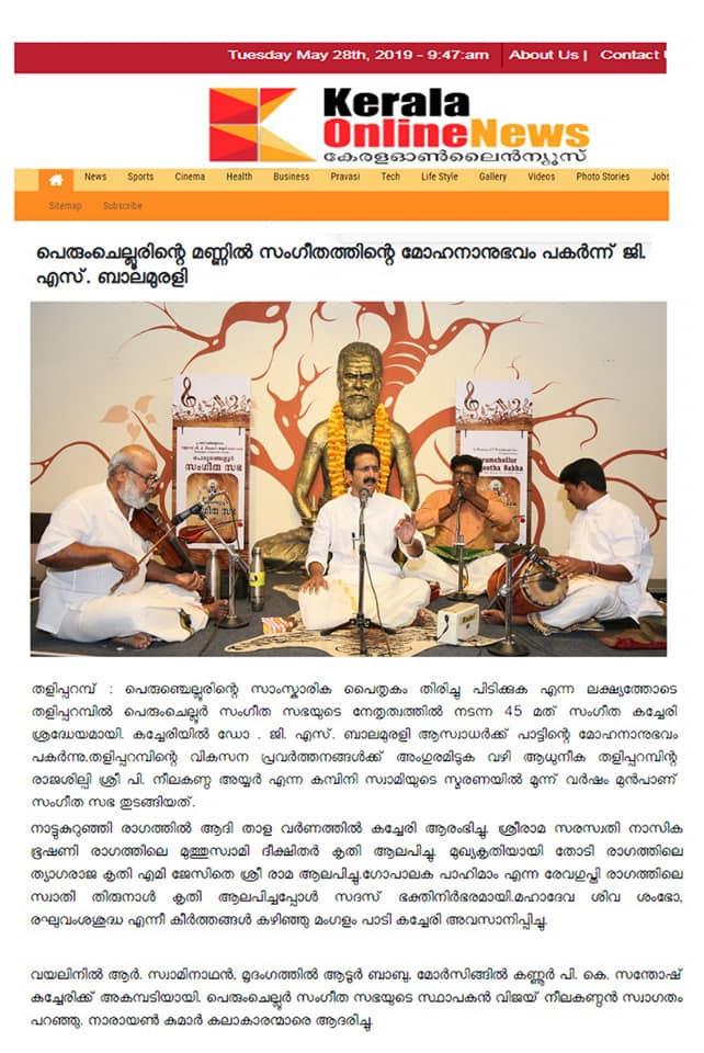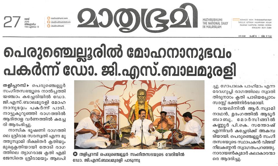 What a spell binding performance this evening by Carnatic vocalist Dr. G. S. Balamurali! Concert was rich in content, and proved to be a quality experience. Began the concert briskly with Bhajamaanasa (Bhahudhaari). Followed by Maamava Meenakshi (Varaali), Marukelara (Jayanthasree), Annapoorne (Shyama), Gopalaka paahima (revagupthi), Saamagaanalolane (Hindolam), Mahadeva Shiva Shambo (Revathy), Raghuvamshasudham (Kadhanakuthoohalam). Ennaalu uraka (shubhapandhuvaraali), Aarabhimaanam (Raaghamaalika), showed his experience on the concert platform - the structure, planning and allocation of time that goes with it. Delineated the raga with all attendant niceties and it was quite protracted as well. Krishna nee begane (yaman kalyani), Bhaja Bhaja Maanasa (Sindhibhairavi), Ennathavam (Kaappi), Radhasametha (Yaman Kalyani) had a calming influence on the mind. Sri. R. Swaminathan on violin, Sri. Aadoor Babu on Mridangam & Sri. Kannur Santhosh on Morsing combined well to take the audience to a musical `Yatra' during their performance at Perumchellur Sangeetha Sabha, Taliparamba held at P. Neelakanta Iyer Memorial Hall on 26 May 2019. It was indeed a serene recital. A sincere exercise and a dedicated performance?. R. Swaminathans violin faithfully reproduced all the sancharas and the clarity of the notes bowed out was laudable. A spirited, high-decibel tani by Aadoor Babu and Santhosh won applause from the audience.
