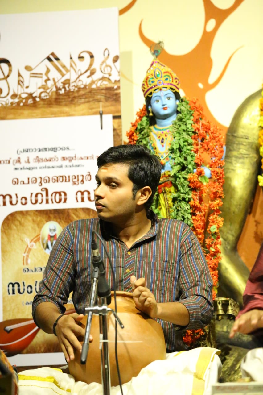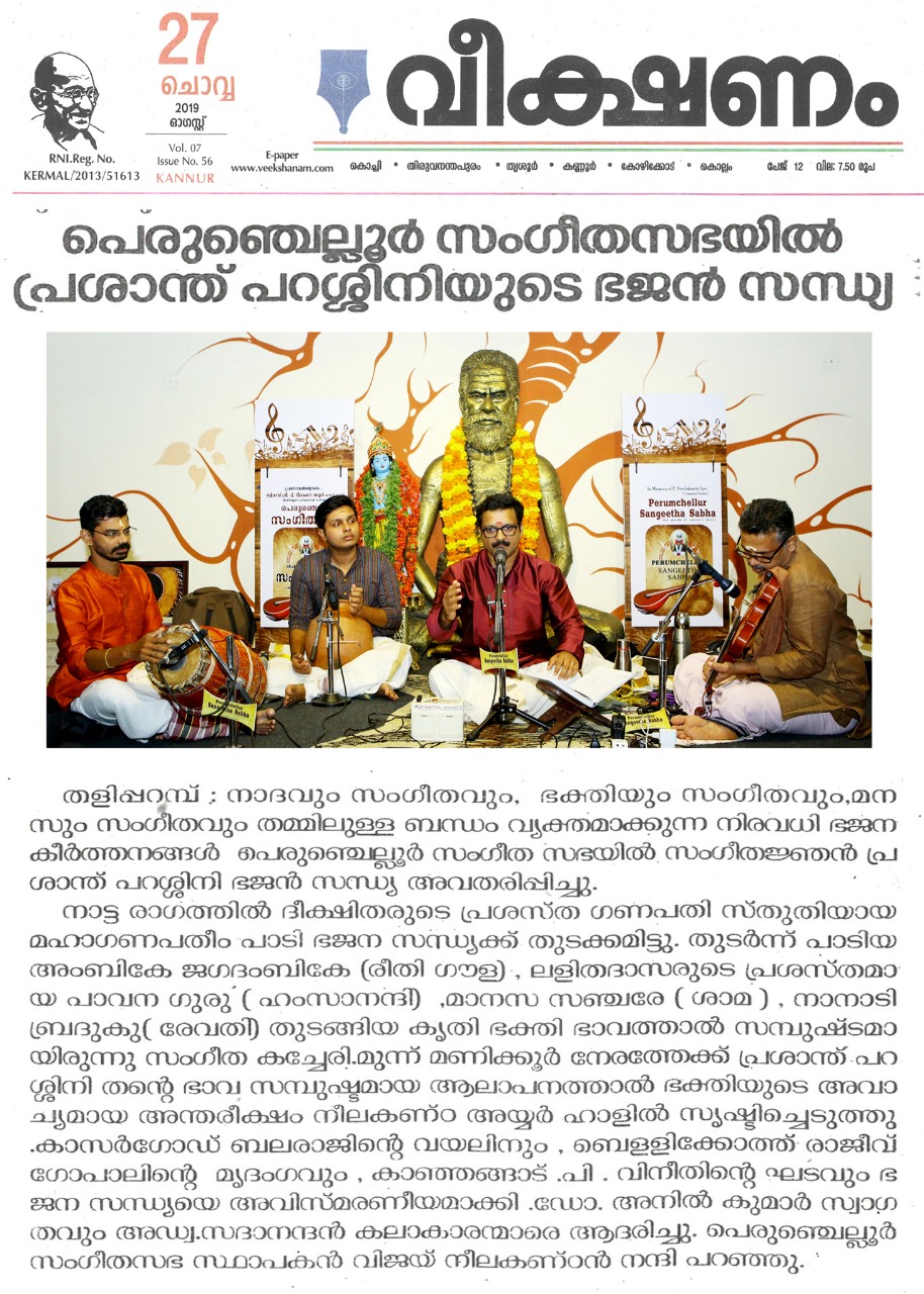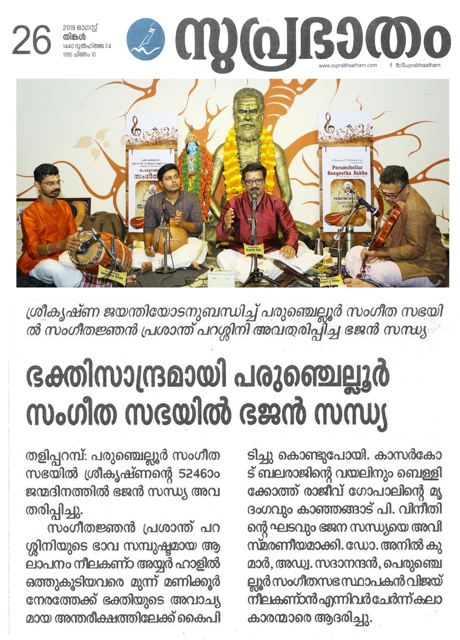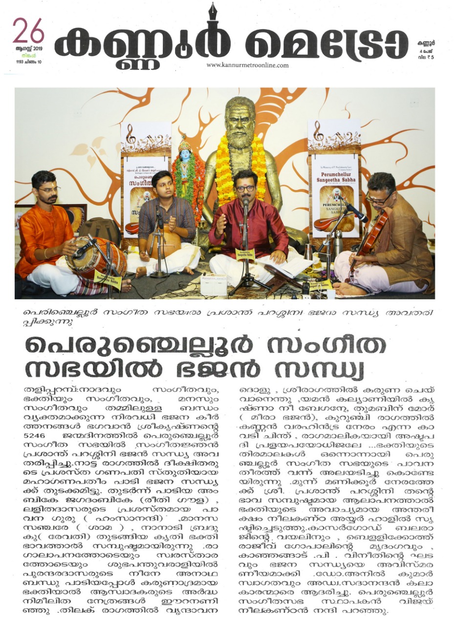 ഗോകുലാഷ്ടമി ദിനത്തിൽ ഭജൻ സന്ധ്യ നാദവും സംഗീതവും, ഭക്തിയും സംഗീതവും, മനസും സംഗീതവും തമ്മിലുള്ള ബന്ധം വ്യക്തമാക്കുന്ന നിരവധി ഭജന കീർത്തനങ്ങൾ ഭഗവാൻ ശ്രീകൃഷ്ണന്റെ 5246 ജന്മദിനത്തിൽ പെരുഞ്ചെല്ലൂർ സംഗീത സഭയിൽ സംഗീതജ്ഞൻ പ്രശാന്ത് പറശ്ശിനി ഭജൻ സന്ധ്യ അവതരിപ്പിച്ചു. നാട്ട രാഗത്തിൽ ദീക്ഷിതരുടെ പ്രശസ്ത ഗണപതി സ്തുതിയായ മഹാഗണപതീം പാടി ഭജന സന്ധ്യക്ക് തുടക്കമിട്ടു. തുടർന്ന് പാടിയ അംബികേ ജഗദംബികേ (രീതി ഗൗള) , ലളിതദാസരുടെ പ്രശസ്തമായ പാവന ഗുരു ( ഹംസാനന്ദി) ,മാനസ സഞ്ചരേ ( ശാമ ) , നാനാടി ബ്രദുകു( രേവതി) തുടങ്ങിയ കൃതി ഭക്തി ഭാവത്താൽ സമ്പുഷ്ടമായിരുന്നു . രാഗാലാപനത്തോടെയും സ്വരസ്താരത്തോടെയും ശുഭപന്തുവരാളിയിൽ പുരന്ദരദാസരുടെ നീനേ അനാഥ ബന്ധു പാടിയപ്പോൾ കരുണാദ്രമായ ഭക്തിയാൽ ആസ്വാദകരുടെ അർദ്ധ നിമീലിത നേത്രങ്ങൾ ഈറനണിഞ്ഞു . തിലക് രാഗത്തിൽ വൃന്ദാവനദൊളു , ശ്രീരാഗത്തിൽ കരുണ ചെയ് വാനെന്തു ,യമൻ കല്യാണിയിൽ കൃഷ്ണാ നീ ബേഗനേ, തുമബിന് മോര് ( മീരാ ഭജൻ), കുറുഞ്ചി രാഗത്തിൽ കണ്ണൻ വരഹിൻട്ര നേരം എന്ന കാവടി ചിന്ത് , രാഗമാലികയായി അഷ്ടപദി പ്രളയപയോധിജലേ ...ഭക്തിയുടെ തിരമാലകൾ ഒന്നൊന്നായി പെരുഞ്ചല്ലൂർ സംഗീത സഭയുടെ പാവന തീരത്ത് വന്ന് അലയടിച്ചു കൊണ്ടേയിരുന്നു . മുന്ന് മണിക്കൂർ നേരത്തേക്ക് ശ്രീ. പ്രശാന്ത് പറശ്ശിനി തന്റെ ഭാവ സമ്പുഷ്ടമായ ആലാപനത്താൽ ഭക്തിയുടെ അവാച്യമായ അന്തരീക്ഷം നീലകണ്ഠ അയ്യർ ഹാളിൽ സൃഷ്ടിച്ചെടുത്തു . കാസർഗോഡ് ബലരാജിന്റെ വയലിനും , ബെളളിക്കോത്ത് രാജീവ് ഗോപാലിന്റെ മൃദംഗവും , കാഞ്ഞങ്ങാട് .പി . വിനീതിന്റെ ഘടവും ഭജന സന്ധ്യയെ അവിസ്മരണീയമാക്കി . Dr. P.K. അനിൽ കുമാർ സ്വാഗതവും , Adv. V.V. സദാനന്ദൻ കലാകാരന്മാരെ ആദരിച്ചു. പെരുഞ്ചെല്ലൂർ സംഗീതസഭ സ്ഥാപകൻ വിജയ് നീലകണ്ഠൻ നന്ദി പറഞ്ഞു.