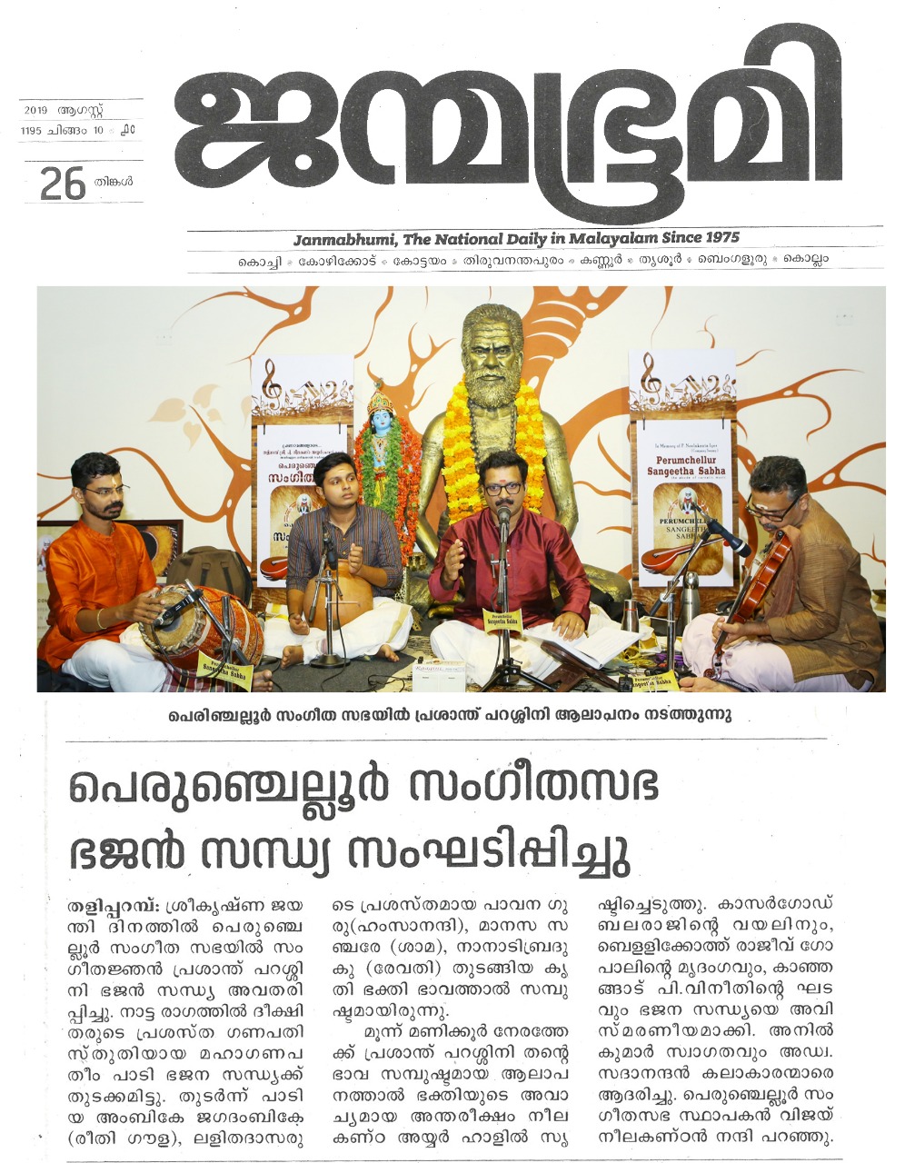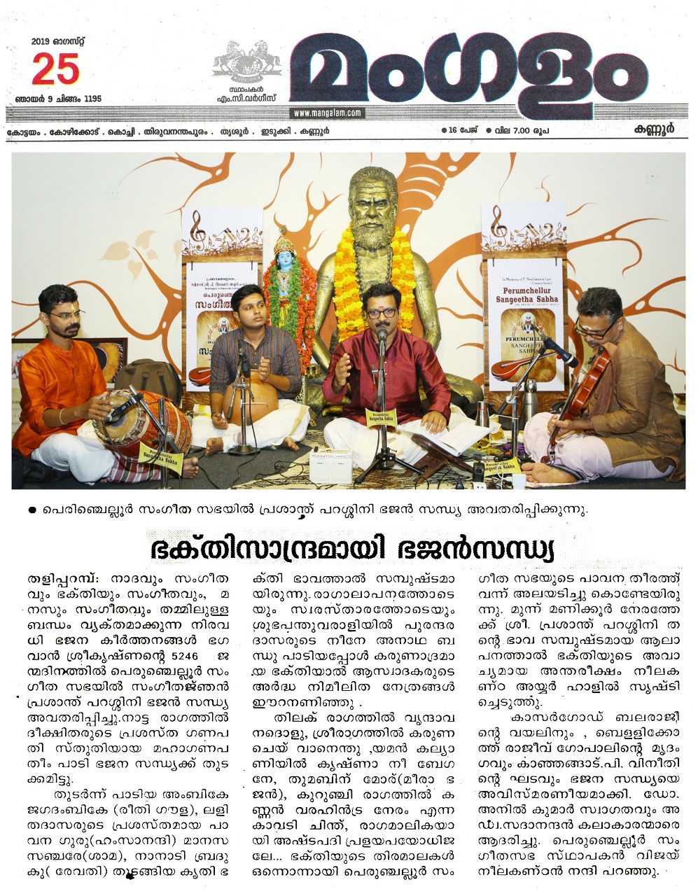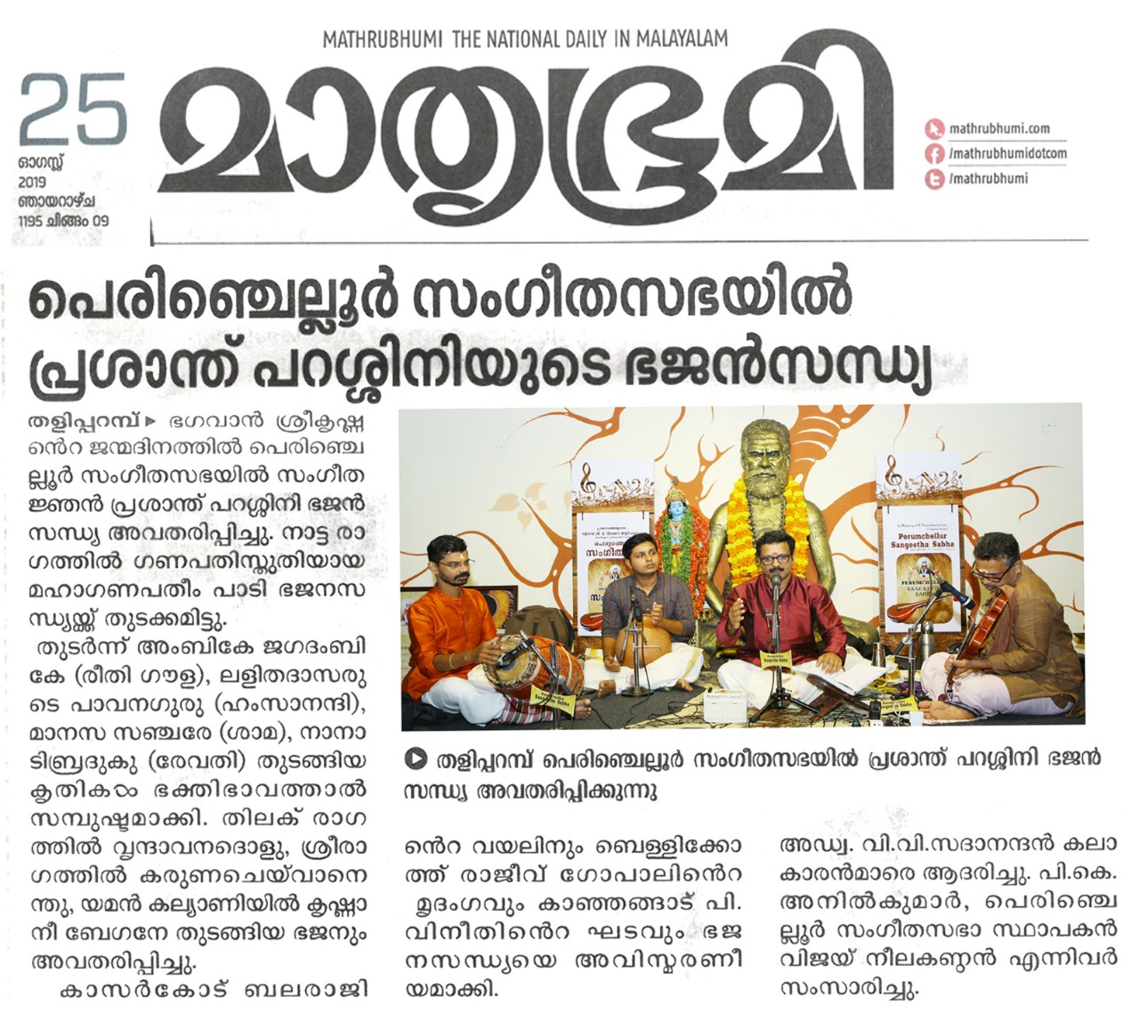 ഗോകുലാഷ്ടമി ദിനത്തിൽ ഭജൻ സന്ധ്യ നാദവും സംഗീതവും, ഭക്തിയും സംഗീതവും, മനസും സംഗീതവും തമ്മിലുള്ള ബന്ധം വ്യക്തമാക്കുന്ന നിരവധി ഭജന കീർത്തനങ്ങൾ ഭഗവാൻ ശ്രീകൃഷ്ണന്റെ 5246 ജന്മദിനത്തിൽ പെരുഞ്ചെല്ലൂർ സംഗീത സഭയിൽ സംഗീതജ്ഞൻ പ്രശാന്ത് പറശ്ശിനി ഭജൻ സന്ധ്യ അവതരിപ്പിച്ചു. നാട്ട രാഗത്തിൽ ദീക്ഷിതരുടെ പ്രശസ്ത ഗണപതി സ്തുതിയായ മഹാഗണപതീം പാടി ഭജന സന്ധ്യക്ക് തുടക്കമിട്ടു. തുടർന്ന് പാടിയ അംബികേ ജഗദംബികേ (രീതി ഗൗള) , ലളിതദാസരുടെ പ്രശസ്തമായ പാവന ഗുരു ( ഹംസാനന്ദി) ,മാനസ സഞ്ചരേ ( ശാമ ) , നാനാടി ബ്രദുകു( രേവതി) തുടങ്ങിയ കൃതി ഭക്തി ഭാവത്താൽ സമ്പുഷ്ടമായിരുന്നു . രാഗാലാപനത്തോടെയും സ്വരസ്താരത്തോടെയും ശുഭപന്തുവരാളിയിൽ പുരന്ദരദാസരുടെ നീനേ അനാഥ ബന്ധു പാടിയപ്പോൾ കരുണാദ്രമായ ഭക്തിയാൽ ആസ്വാദകരുടെ അർദ്ധ നിമീലിത നേത്രങ്ങൾ ഈറനണിഞ്ഞു . തിലക് രാഗത്തിൽ വൃന്ദാവനദൊളു , ശ്രീരാഗത്തിൽ കരുണ ചെയ് വാനെന്തു ,യമൻ കല്യാണിയിൽ കൃഷ്ണാ നീ ബേഗനേ, തുമബിന് മോര് ( മീരാ ഭജൻ), കുറുഞ്ചി രാഗത്തിൽ കണ്ണൻ വരഹിൻട്ര നേരം എന്ന കാവടി ചിന്ത് , രാഗമാലികയായി അഷ്ടപദി പ്രളയപയോധിജലേ ...ഭക്തിയുടെ തിരമാലകൾ ഒന്നൊന്നായി പെരുഞ്ചല്ലൂർ സംഗീത സഭയുടെ പാവന തീരത്ത് വന്ന് അലയടിച്ചു കൊണ്ടേയിരുന്നു . മുന്ന് മണിക്കൂർ നേരത്തേക്ക് ശ്രീ. പ്രശാന്ത് പറശ്ശിനി തന്റെ ഭാവ സമ്പുഷ്ടമായ ആലാപനത്താൽ ഭക്തിയുടെ അവാച്യമായ അന്തരീക്ഷം നീലകണ്ഠ അയ്യർ ഹാളിൽ സൃഷ്ടിച്ചെടുത്തു . കാസർഗോഡ് ബലരാജിന്റെ വയലിനും , ബെളളിക്കോത്ത് രാജീവ് ഗോപാലിന്റെ മൃദംഗവും , കാഞ്ഞങ്ങാട് .പി . വിനീതിന്റെ ഘടവും ഭജന സന്ധ്യയെ അവിസ്മരണീയമാക്കി . Dr. P.K. അനിൽ കുമാർ സ്വാഗതവും , Adv. V.V. സദാനന്ദൻ കലാകാരന്മാരെ ആദരിച്ചു. പെരുഞ്ചെല്ലൂർ സംഗീതസഭ സ്ഥാപകൻ വിജയ് നീലകണ്ഠൻ നന്ദി പറഞ്ഞു.