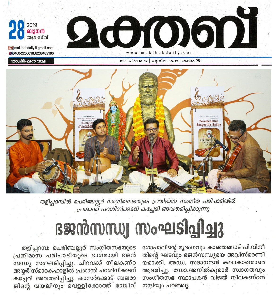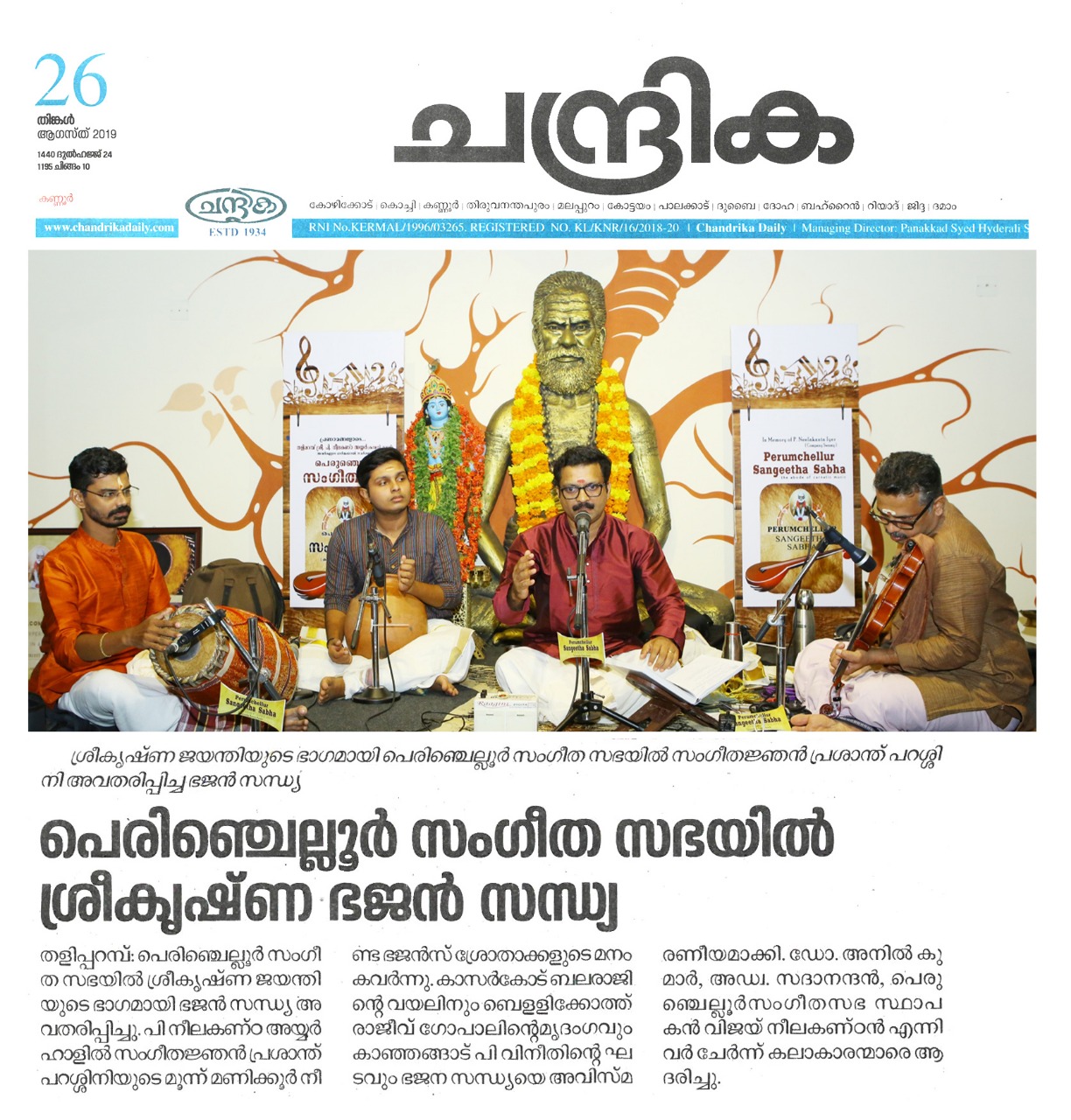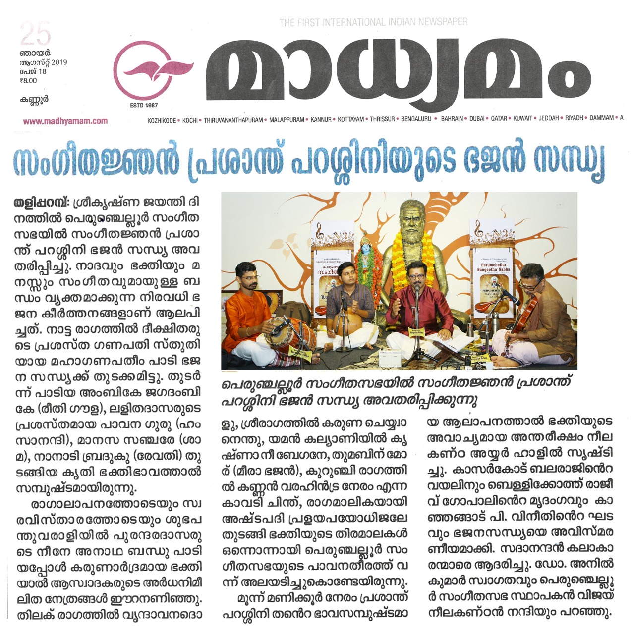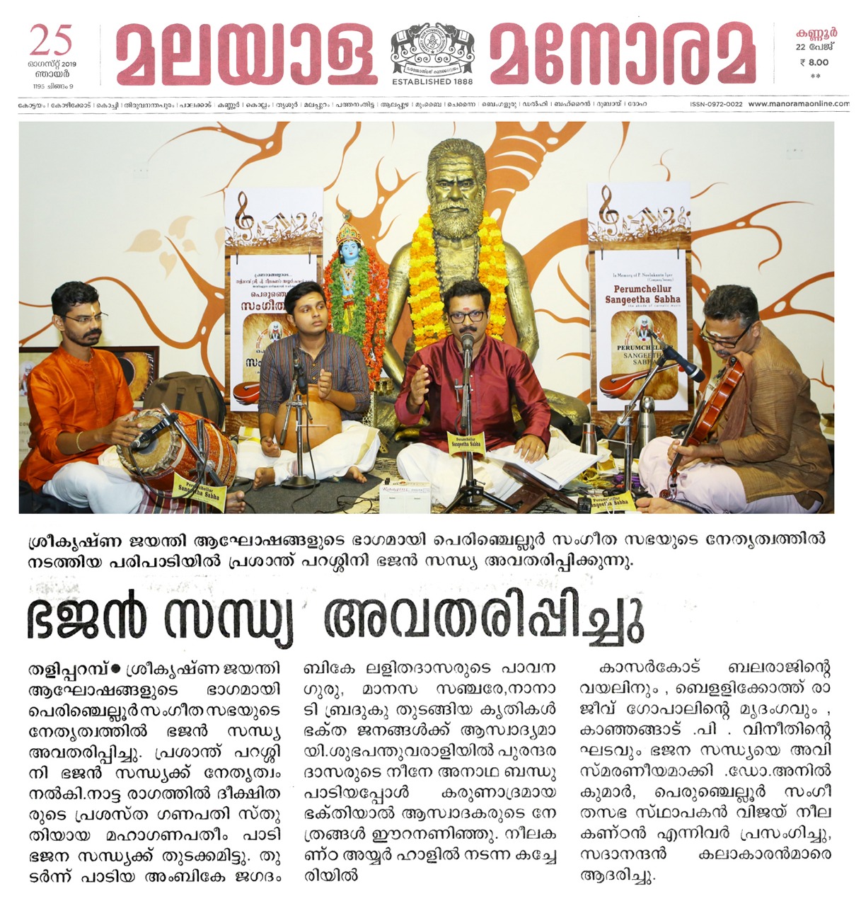 ഗോകുലാഷ്ടമി ദിനത്തിൽ ഭജൻ സന്ധ്യ നാദവും സംഗീതവും, ഭക്തിയും സംഗീതവും, മനസും സംഗീതവും തമ്മിലുള്ള ബന്ധം വ്യക്തമാക്കുന്ന നിരവധി ഭജന കീർത്തനങ്ങൾ ഭഗവാൻ ശ്രീകൃഷ്ണന്റെ 5246 ജന്മദിനത്തിൽ പെരുഞ്ചെല്ലൂർ സംഗീത സഭയിൽ സംഗീതജ്ഞൻ പ്രശാന്ത് പറശ്ശിനി ഭജൻ സന്ധ്യ അവതരിപ്പിച്ചു. നാട്ട രാഗത്തിൽ ദീക്ഷിതരുടെ പ്രശസ്ത ഗണപതി സ്തുതിയായ മഹാഗണപതീം പാടി ഭജന സന്ധ്യക്ക് തുടക്കമിട്ടു. തുടർന്ന് പാടിയ അംബികേ ജഗദംബികേ (രീതി ഗൗള) , ലളിതദാസരുടെ പ്രശസ്തമായ പാവന ഗുരു ( ഹംസാനന്ദി) ,മാനസ സഞ്ചരേ ( ശാമ ) , നാനാടി ബ്രദുകു( രേവതി) തുടങ്ങിയ കൃതി ഭക്തി ഭാവത്താൽ സമ്പുഷ്ടമായിരുന്നു . രാഗാലാപനത്തോടെയും സ്വരസ്താരത്തോടെയും ശുഭപന്തുവരാളിയിൽ പുരന്ദരദാസരുടെ നീനേ അനാഥ ബന്ധു പാടിയപ്പോൾ കരുണാദ്രമായ ഭക്തിയാൽ ആസ്വാദകരുടെ അർദ്ധ നിമീലിത നേത്രങ്ങൾ ഈറനണിഞ്ഞു . തിലക് രാഗത്തിൽ വൃന്ദാവനദൊളു , ശ്രീരാഗത്തിൽ കരുണ ചെയ് വാനെന്തു ,യമൻ കല്യാണിയിൽ കൃഷ്ണാ നീ ബേഗനേ, തുമബിന് മോര് ( മീരാ ഭജൻ), കുറുഞ്ചി രാഗത്തിൽ കണ്ണൻ വരഹിൻട്ര നേരം എന്ന കാവടി ചിന്ത് , രാഗമാലികയായി അഷ്ടപദി പ്രളയപയോധിജലേ ...ഭക്തിയുടെ തിരമാലകൾ ഒന്നൊന്നായി പെരുഞ്ചല്ലൂർ സംഗീത സഭയുടെ പാവന തീരത്ത് വന്ന് അലയടിച്ചു കൊണ്ടേയിരുന്നു . മുന്ന് മണിക്കൂർ നേരത്തേക്ക് ശ്രീ. പ്രശാന്ത് പറശ്ശിനി തന്റെ ഭാവ സമ്പുഷ്ടമായ ആലാപനത്താൽ ഭക്തിയുടെ അവാച്യമായ അന്തരീക്ഷം നീലകണ്ഠ അയ്യർ ഹാളിൽ സൃഷ്ടിച്ചെടുത്തു . കാസർഗോഡ് ബലരാജിന്റെ വയലിനും , ബെളളിക്കോത്ത് രാജീവ് ഗോപാലിന്റെ മൃദംഗവും , കാഞ്ഞങ്ങാട് .പി . വിനീതിന്റെ ഘടവും ഭജന സന്ധ്യയെ അവിസ്മരണീയമാക്കി . Dr. P.K. അനിൽ കുമാർ സ്വാഗതവും , Adv. V.V. സദാനന്ദൻ കലാകാരന്മാരെ ആദരിച്ചു. പെരുഞ്ചെല്ലൂർ സംഗീതസഭ സ്ഥാപകൻ വിജയ് നീലകണ്ഠൻ നന്ദി പറഞ്ഞു.