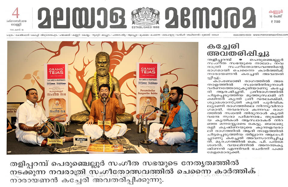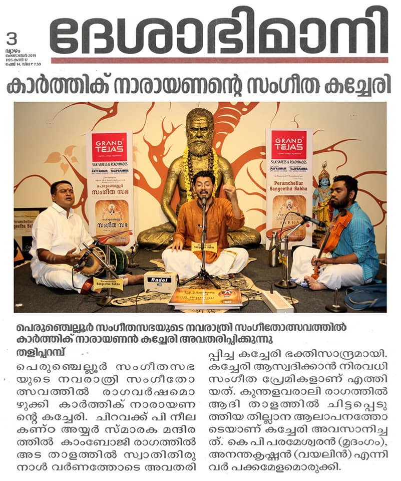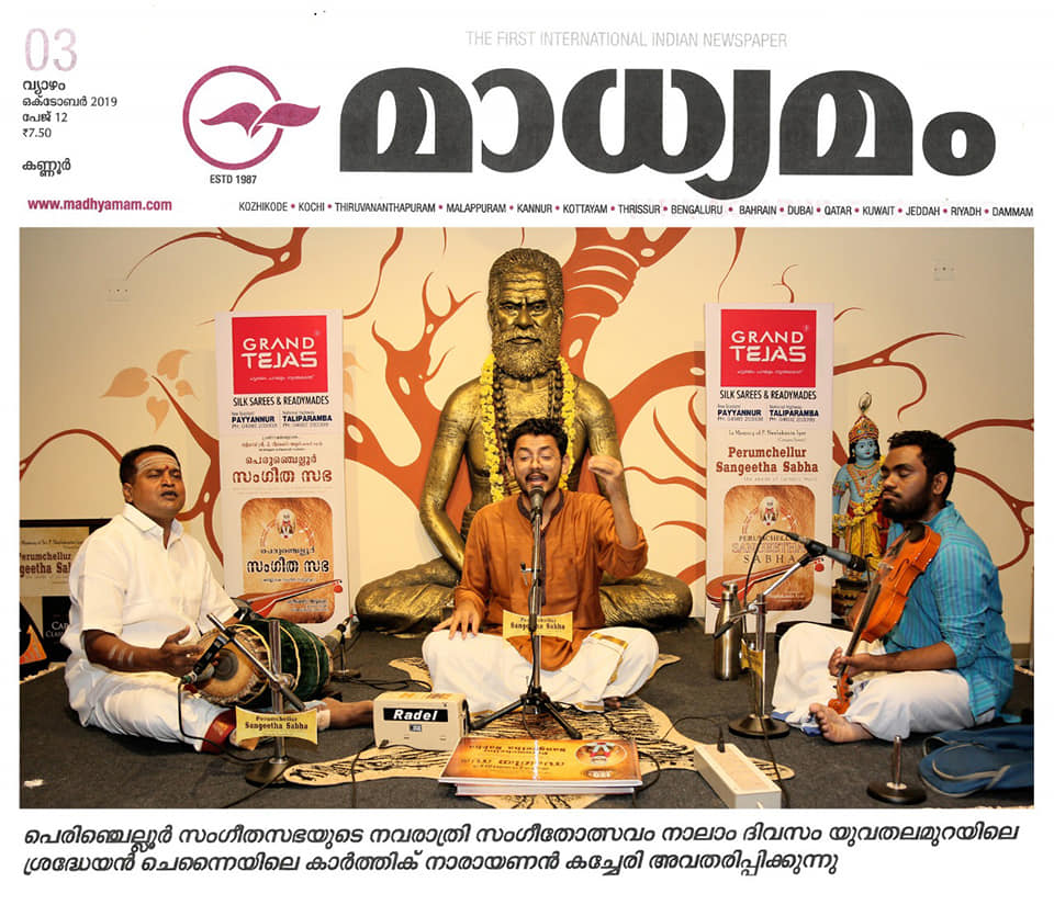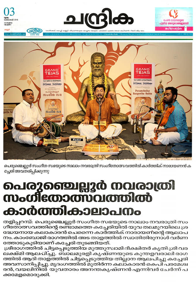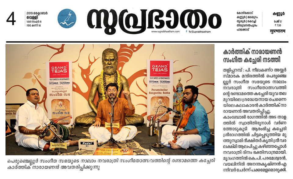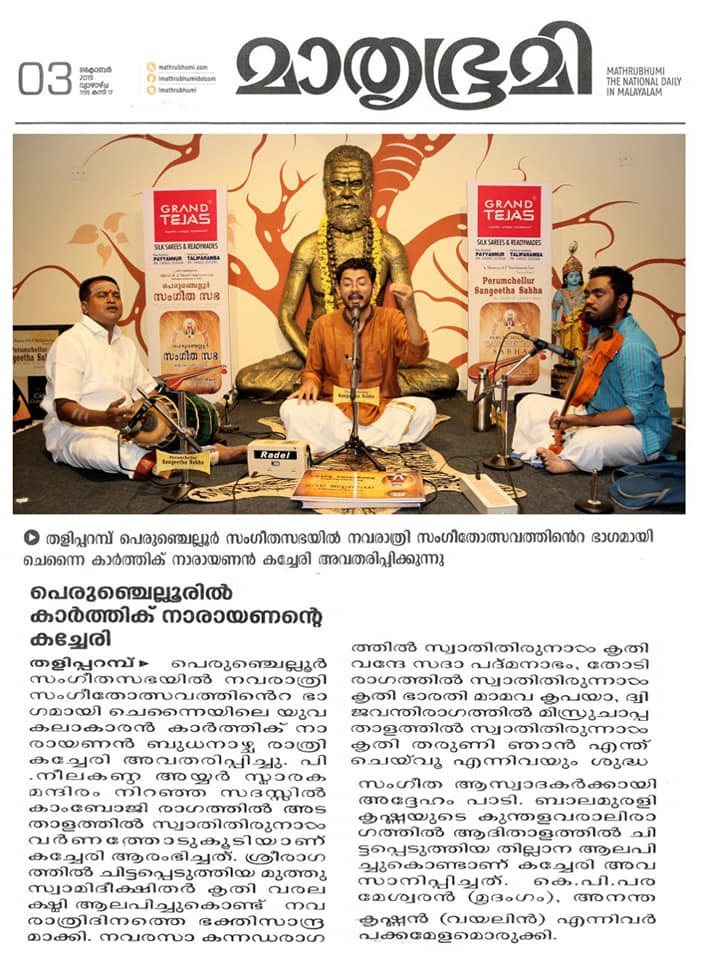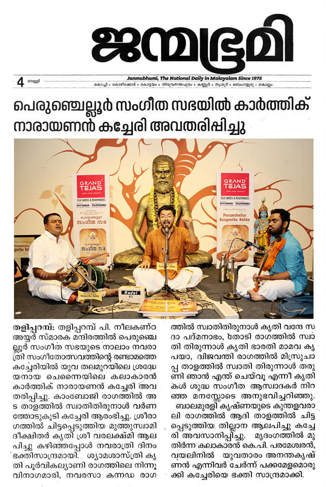 Vocal concert by Karthik Narayan again proved that in Carnatic music, the soul matters! The artists sent everyone of us into a trance with their brilliant exceptional performance. 3 gems - Karthik Narayan (vocal), Ananthkrishnan (violin) & K.P. Parameswaran mama (Mridangam), crafted & structured the divine musical journey....An experience by itself to the rasikas.