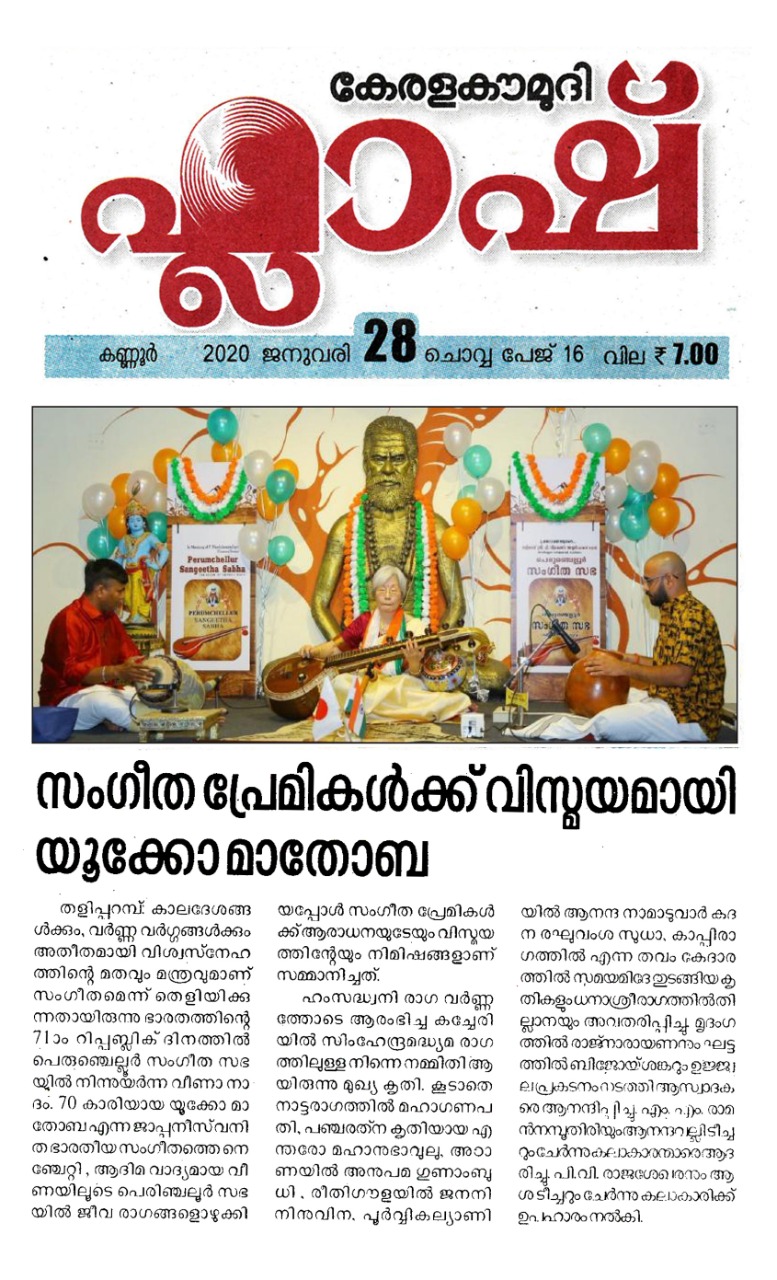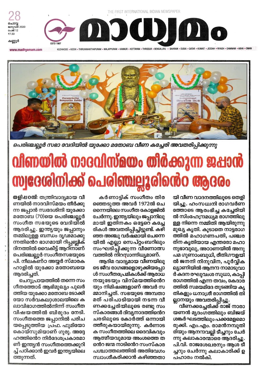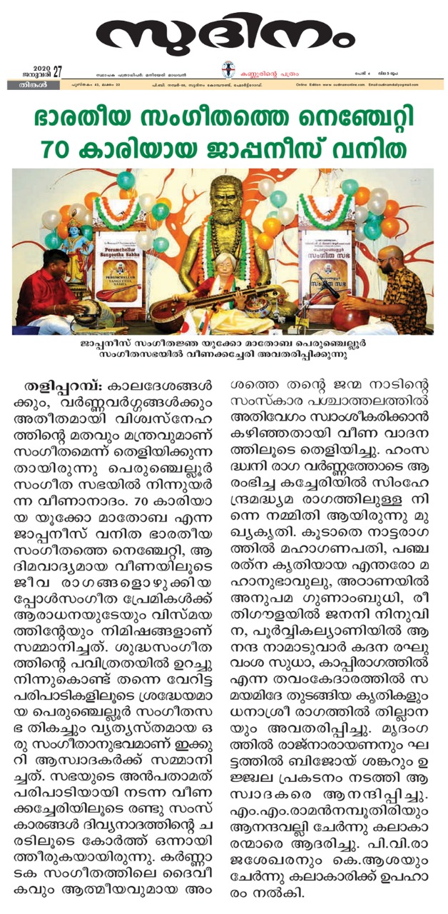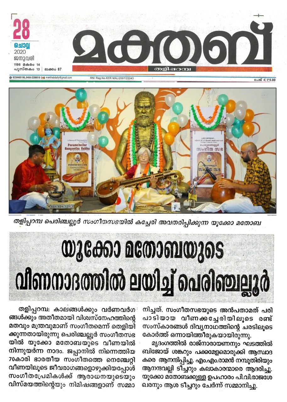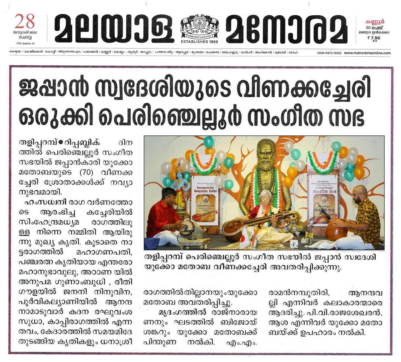 വിശ്വസ്നേഹത്തിന്റെ വീണാ മന്ത്രത്തിലലിഞ്ഞ് പെരുഞ്ചെല്ലൂർ കാലദേശങ്ങൾക്കും, വർണ്ണ വർഗ്ഗങ്ങൾക്കും അതീതമായി വിശ്വസ്നേഹത്തിന്റെ മതവും മന്ത്രവുമാണ് സംഗീതമെന്ന് തെളിയിക്കുന്നതായിരുന്നു പെരുഞ്ചെല്ലൂർ സംഗീത സഭയിൽ നിന്നുയർന്ന വീണാ നാദം. 70 കാരിയായ യൂക്കോ മാതോബ എന്ന ജാപ്പനീസ് വനിത ഭാരതീയ സംഗീതത്തെ നെഞ്ചേറ്റി , ആദിമ വാദ്യമായ വീണയിലൂടെ ജീവ രാഗങ്ങളൊഴുക്കിയപ്പോൾ സംഗീത പ്രേമികൾക്ക് ആരാധനയുടേയും വിസ്മയത്തിന്റേയും നിമിഷങ്ങളാണ് സമ്മാനിച്ചത്. ശുദ്ധസംഗീതത്തിന്റെ പവിത്രതയിൽ ഉറച്ചു നിന്നുകൊണ്ട് തന്നെ വേറിട്ട പരിപാടികളിലൂടെ ശ്രദ്ധേയമായ പെരുഞ്ചെല്ലൂർ സംഗീത സഭ തികച്ചും വ്യത്യസ്തമായ ഒരു സംഗീതാനുഭവമാണ് ഇക്കുറി ആസ്വാദകർക്ക് സമ്മാനിച്ചത്. സഭയുടെ അൻപതാമത് പരിപാടിയായി നടന്ന വീണക്കച്ചേരിയിലൂടെ രണ്ടു സംസ്കാരങ്ങൾ ദിവ്യനാദത്തിന്റെ ചരടിലൂടെ കോർത്ത് ഒന്നായിത്തീരുകയായിരുന്നു. കർണ്ണാടക സംഗീതത്തിലെ ദൈവീകവും ആത്മീയവുമായ അംശത്തെ തന്റെ ജന്മ നാടിന്റെ സംസ്കാര പശ്ചാത്തലത്തിൽ അതിവേഗം സ്വാംശീകരിക്കാൻ കഴിഞ്ഞതായി വീണ വാദനത്തിലൂടെ തെളിയിച്ചു. ഹംസദ്ധ്വനി രാഗ വർണ്ണത്തോടെ ആരംഭിച്ച കച്ചേരിയിൽ സിംഹേന്ദ്രമദ്ധ്യമ രാഗത്തിലുള്ള നിന്നെ നമ്മിതി ആയിരുന്നു മുഖ്യ കൃതി . കൂടാതെ നാട്ടരാഗത്തിൽ മഹാഗണപതി, പഞ്ചരത്ന കൃതിയായ എന്തരോ മഹാനുഭാവുലു, അഠാണ യിൽ അനുപമ ഗുണാംബുധി , രീതിഗൗളയിൽ ജനനി നിനുവിന, പൂർവ്വികല്യാണിയിൽ ആനന്ദ നാമാടുവാർ കദന രഘുവംശ സുധാ, കാപ്പിരാഗത്തിൽ എന്ന തവം, കേദാരത്തിൽ സമയമിദേ തുടങ്ങിയ കൃതികളും ധനാശ്രീ രാഗത്തിൽ തില്ലാനയും അവതരിപ്പിച്ചു. മൃദംഗത്തിൽ വിദ്വാൻ. രാജ്നാരായണനും ഘട്ടത്തിൽ വിദ്വാൻ ബിജോയ് ശങ്കറും ഉജ്ജ്വല പ്രകടനം നടത്തി ആസ്വാദകരെ ആനന്ദിപ്പിച്ചു. ശ്രീ. എം. എം. രാമൻനമ്പൂതിരി യും ആനന്ദവല്ലി ടീച്ചറും ചേർന്നു കലാകാരന്മാരെ ആദരിച്ചു. ശ്രീ. പി. വി. രാജശേഖരൻ ആശ ടീച്ചറും ചേർന്നു കലാകാരന്മാർക്ക് ഉപഹാരം നൽകി. പി. വി. രാജശേഖരനും ആശ ടീച്ചറും ചേർന്നു കലാകാരിക്ക് ഉപഹാരം നൽകി