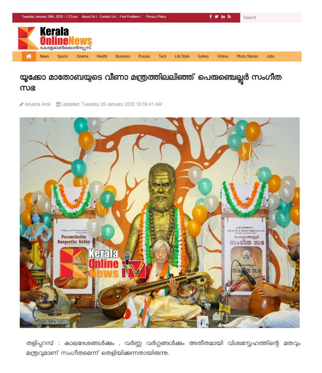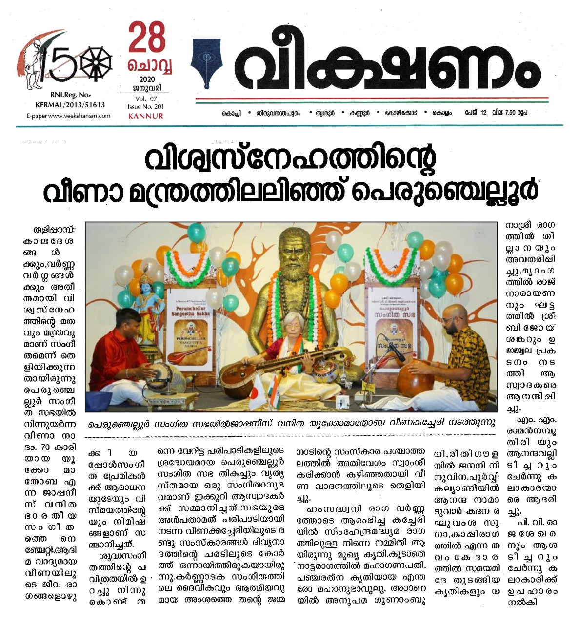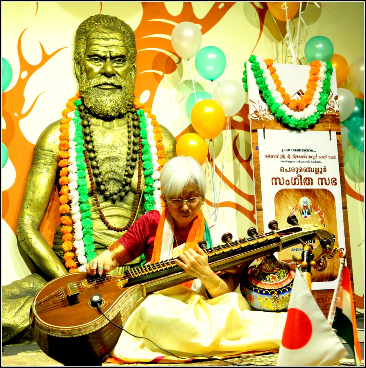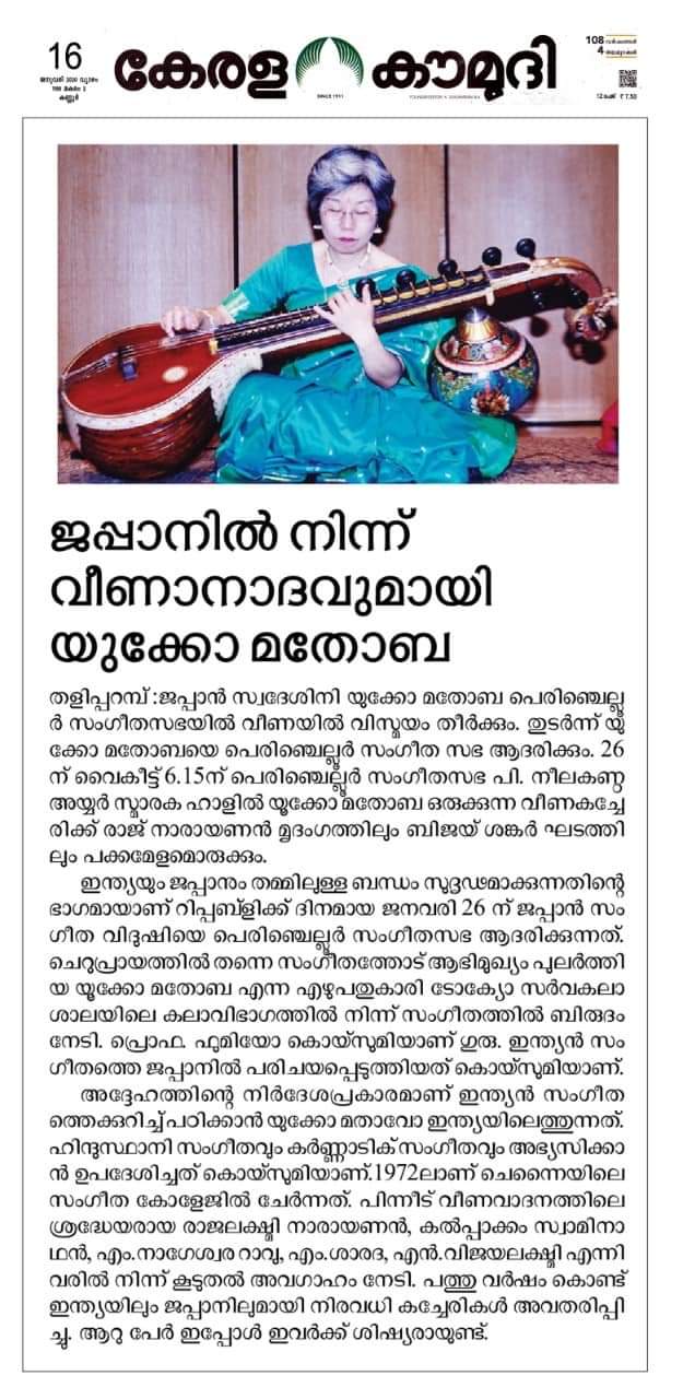 വിശ്വസ്നേഹത്തിന്റെ വീണാ മന്ത്രത്തിലലിഞ്ഞ് പെരുഞ്ചെല്ലൂർ കാലദേശങ്ങൾക്കും, വർണ്ണ വർഗ്ഗങ്ങൾക്കും അതീതമായി വിശ്വസ്നേഹത്തിന്റെ മതവും മന്ത്രവുമാണ് സംഗീതമെന്ന് തെളിയിക്കുന്നതായിരുന്നു പെരുഞ്ചെല്ലൂർ സംഗീത സഭയിൽ നിന്നുയർന്ന വീണാ നാദം. 70 കാരിയായ യൂക്കോ മാതോബ എന്ന ജാപ്പനീസ് വനിത ഭാരതീയ സംഗീതത്തെ നെഞ്ചേറ്റി , ആദിമ വാദ്യമായ വീണയിലൂടെ ജീവ രാഗങ്ങളൊഴുക്കിയപ്പോൾ സംഗീത പ്രേമികൾക്ക് ആരാധനയുടേയും വിസ്മയത്തിന്റേയും നിമിഷങ്ങളാണ് സമ്മാനിച്ചത്. ശുദ്ധസംഗീതത്തിന്റെ പവിത്രതയിൽ ഉറച്ചു നിന്നുകൊണ്ട് തന്നെ വേറിട്ട പരിപാടികളിലൂടെ ശ്രദ്ധേയമായ പെരുഞ്ചെല്ലൂർ സംഗീത സഭ തികച്ചും വ്യത്യസ്തമായ ഒരു സംഗീതാനുഭവമാണ് ഇക്കുറി ആസ്വാദകർക്ക് സമ്മാനിച്ചത്. സഭയുടെ അൻപതാമത് പരിപാടിയായി നടന്ന വീണക്കച്ചേരിയിലൂടെ രണ്ടു സംസ്കാരങ്ങൾ ദിവ്യനാദത്തിന്റെ ചരടിലൂടെ കോർത്ത് ഒന്നായിത്തീരുകയായിരുന്നു. കർണ്ണാടക സംഗീതത്തിലെ ദൈവീകവും ആത്മീയവുമായ അംശത്തെ തന്റെ ജന്മ നാടിന്റെ സംസ്കാര പശ്ചാത്തലത്തിൽ അതിവേഗം സ്വാംശീകരിക്കാൻ കഴിഞ്ഞതായി വീണ വാദനത്തിലൂടെ തെളിയിച്ചു. ഹംസദ്ധ്വനി രാഗ വർണ്ണത്തോടെ ആരംഭിച്ച കച്ചേരിയിൽ സിംഹേന്ദ്രമദ്ധ്യമ രാഗത്തിലുള്ള നിന്നെ നമ്മിതി ആയിരുന്നു മുഖ്യ കൃതി . കൂടാതെ നാട്ടരാഗത്തിൽ മഹാഗണപതി, പഞ്ചരത്ന കൃതിയായ എന്തരോ മഹാനുഭാവുലു, അഠാണ യിൽ അനുപമ ഗുണാംബുധി , രീതിഗൗളയിൽ ജനനി നിനുവിന, പൂർവ്വികല്യാണിയിൽ ആനന്ദ നാമാടുവാർ കദന രഘുവംശ സുധാ, കാപ്പിരാഗത്തിൽ എന്ന തവം, കേദാരത്തിൽ സമയമിദേ തുടങ്ങിയ കൃതികളും ധനാശ്രീ രാഗത്തിൽ തില്ലാനയും അവതരിപ്പിച്ചു. മൃദംഗത്തിൽ വിദ്വാൻ. രാജ്നാരായണനും ഘട്ടത്തിൽ വിദ്വാൻ ബിജോയ് ശങ്കറും ഉജ്ജ്വല പ്രകടനം നടത്തി ആസ്വാദകരെ ആനന്ദിപ്പിച്ചു. ശ്രീ. എം. എം. രാമൻനമ്പൂതിരി യും ആനന്ദവല്ലി ടീച്ചറും ചേർന്നു കലാകാരന്മാരെ ആദരിച്ചു. ശ്രീ. പി. വി. രാജശേഖരൻ ആശ ടീച്ചറും ചേർന്നു കലാകാരന്മാർക്ക് ഉപഹാരം നൽകി. പി. വി. രാജശേഖരനും ആശ ടീച്ചറും ചേർന്നു കലാകാരിക്ക് ഉപഹാരം നൽകി