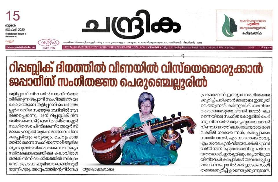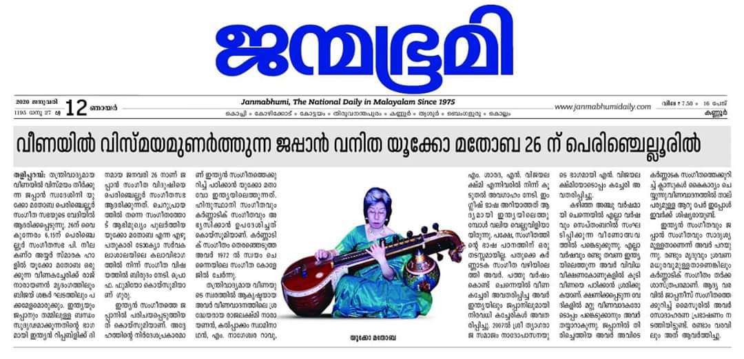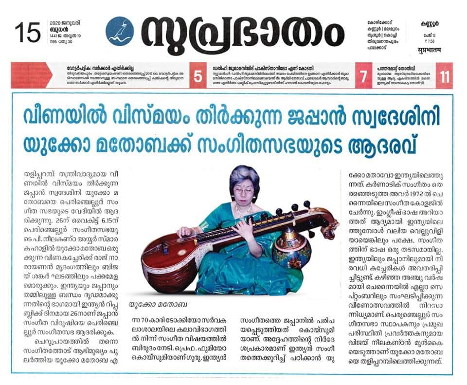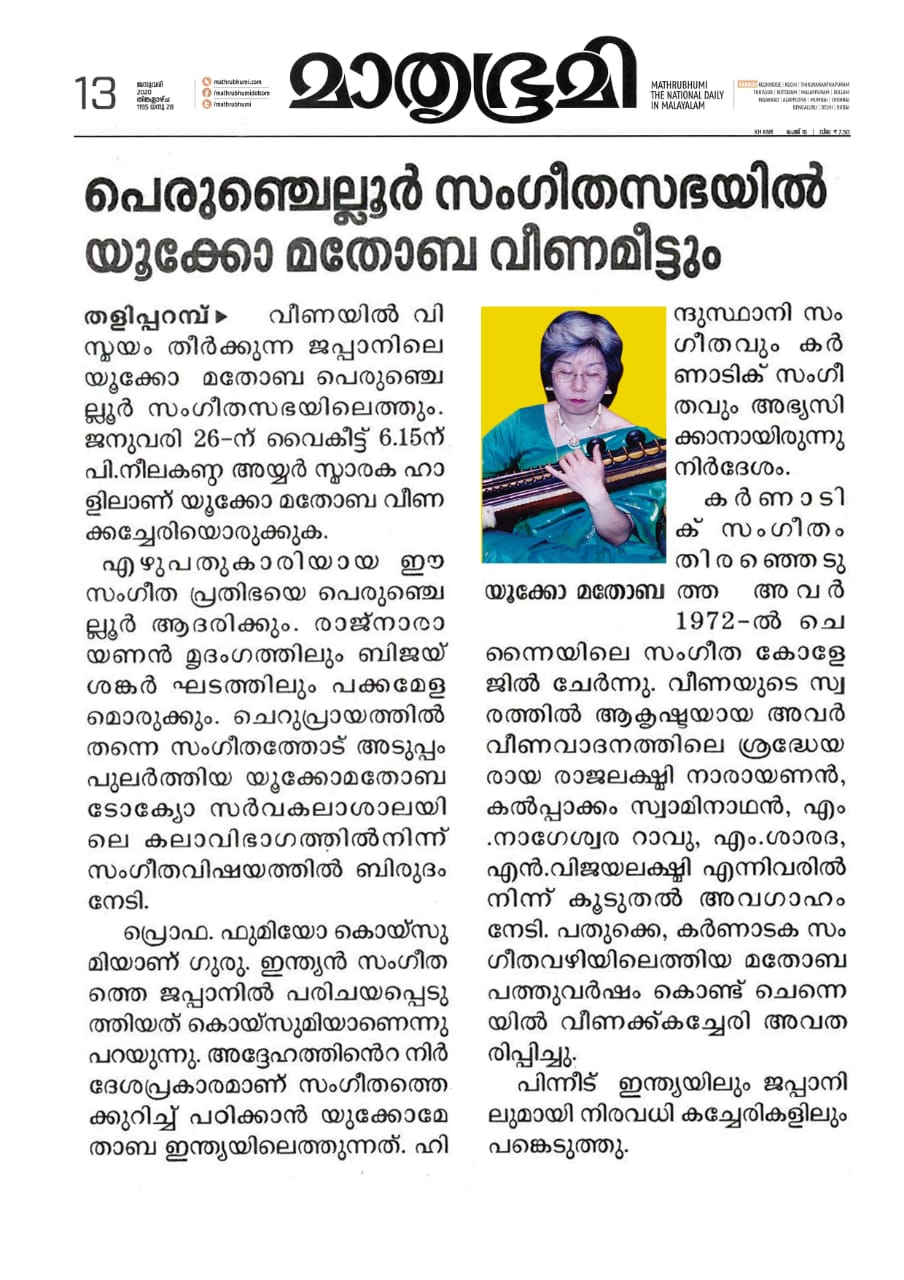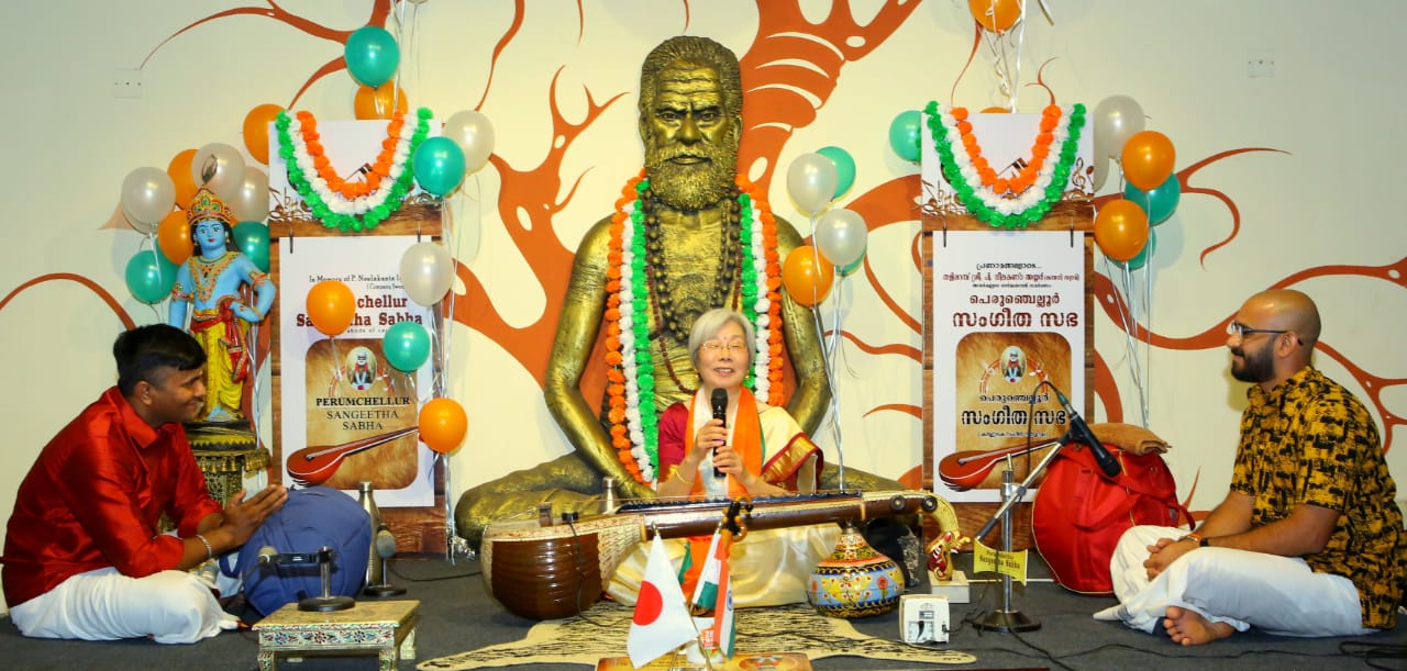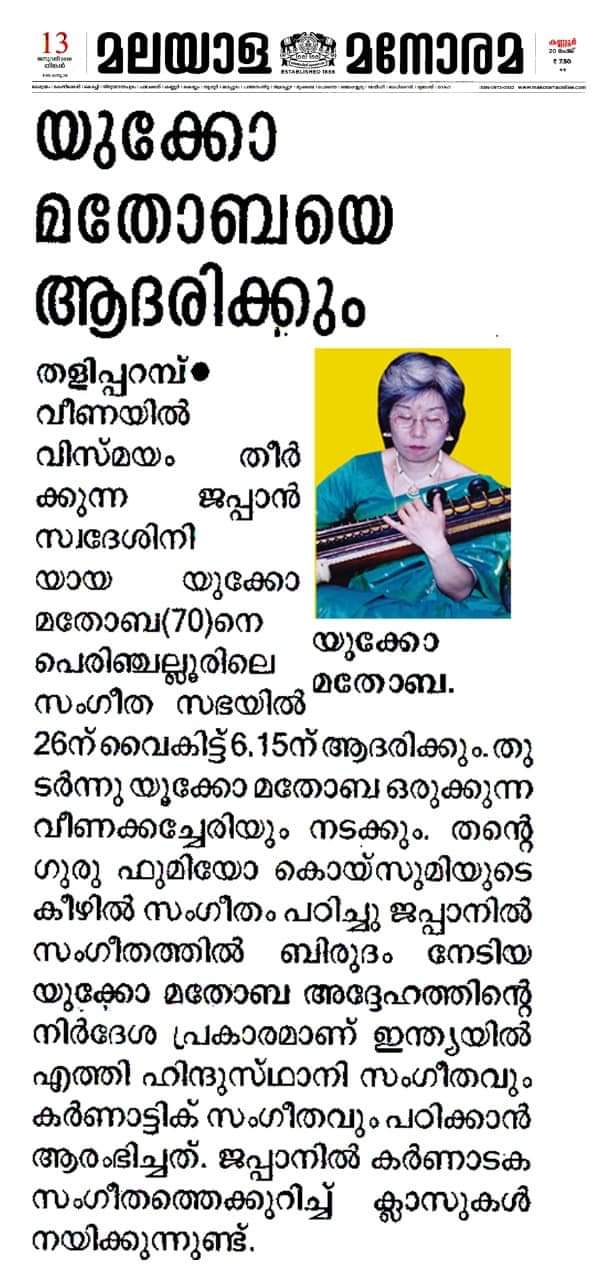 വിശ്വസ്നേഹത്തിന്റെ വീണാ മന്ത്രത്തിലലിഞ്ഞ് പെരുഞ്ചെല്ലൂർ കാലദേശങ്ങൾക്കും, വർണ്ണ വർഗ്ഗങ്ങൾക്കും അതീതമായി വിശ്വസ്നേഹത്തിന്റെ മതവും മന്ത്രവുമാണ് സംഗീതമെന്ന് തെളിയിക്കുന്നതായിരുന്നു പെരുഞ്ചെല്ലൂർ സംഗീത സഭയിൽ നിന്നുയർന്ന വീണാ നാദം. 70 കാരിയായ യൂക്കോ മാതോബ എന്ന ജാപ്പനീസ് വനിത ഭാരതീയ സംഗീതത്തെ നെഞ്ചേറ്റി , ആദിമ വാദ്യമായ വീണയിലൂടെ ജീവ രാഗങ്ങളൊഴുക്കിയപ്പോൾ സംഗീത പ്രേമികൾക്ക് ആരാധനയുടേയും വിസ്മയത്തിന്റേയും നിമിഷങ്ങളാണ് സമ്മാനിച്ചത്. ശുദ്ധസംഗീതത്തിന്റെ പവിത്രതയിൽ ഉറച്ചു നിന്നുകൊണ്ട് തന്നെ വേറിട്ട പരിപാടികളിലൂടെ ശ്രദ്ധേയമായ പെരുഞ്ചെല്ലൂർ സംഗീത സഭ തികച്ചും വ്യത്യസ്തമായ ഒരു സംഗീതാനുഭവമാണ് ഇക്കുറി ആസ്വാദകർക്ക് സമ്മാനിച്ചത്. സഭയുടെ അൻപതാമത് പരിപാടിയായി നടന്ന വീണക്കച്ചേരിയിലൂടെ രണ്ടു സംസ്കാരങ്ങൾ ദിവ്യനാദത്തിന്റെ ചരടിലൂടെ കോർത്ത് ഒന്നായിത്തീരുകയായിരുന്നു. കർണ്ണാടക സംഗീതത്തിലെ ദൈവീകവും ആത്മീയവുമായ അംശത്തെ തന്റെ ജന്മ നാടിന്റെ സംസ്കാര പശ്ചാത്തലത്തിൽ അതിവേഗം സ്വാംശീകരിക്കാൻ കഴിഞ്ഞതായി വീണ വാദനത്തിലൂടെ തെളിയിച്ചു. ഹംസദ്ധ്വനി രാഗ വർണ്ണത്തോടെ ആരംഭിച്ച കച്ചേരിയിൽ സിംഹേന്ദ്രമദ്ധ്യമ രാഗത്തിലുള്ള നിന്നെ നമ്മിതി ആയിരുന്നു മുഖ്യ കൃതി . കൂടാതെ നാട്ടരാഗത്തിൽ മഹാഗണപതി, പഞ്ചരത്ന കൃതിയായ എന്തരോ മഹാനുഭാവുലു, അഠാണ യിൽ അനുപമ ഗുണാംബുധി , രീതിഗൗളയിൽ ജനനി നിനുവിന, പൂർവ്വികല്യാണിയിൽ ആനന്ദ നാമാടുവാർ കദന രഘുവംശ സുധാ, കാപ്പിരാഗത്തിൽ എന്ന തവം, കേദാരത്തിൽ സമയമിദേ തുടങ്ങിയ കൃതികളും ധനാശ്രീ രാഗത്തിൽ തില്ലാനയും അവതരിപ്പിച്ചു. മൃദംഗത്തിൽ വിദ്വാൻ. രാജ്നാരായണനും ഘട്ടത്തിൽ വിദ്വാൻ ബിജോയ് ശങ്കറും ഉജ്ജ്വല പ്രകടനം നടത്തി ആസ്വാദകരെ ആനന്ദിപ്പിച്ചു. ശ്രീ. എം. എം. രാമൻനമ്പൂതിരി യും ആനന്ദവല്ലി ടീച്ചറും ചേർന്നു കലാകാരന്മാരെ ആദരിച്ചു. ശ്രീ. പി. വി. രാജശേഖരൻ ആശ ടീച്ചറും ചേർന്നു കലാകാരന്മാർക്ക് ഉപഹാരം നൽകി. പി. വി. രാജശേഖരനും ആശ ടീച്ചറും ചേർന്നു കലാകാരിക്ക് ഉപഹാരം നൽകി