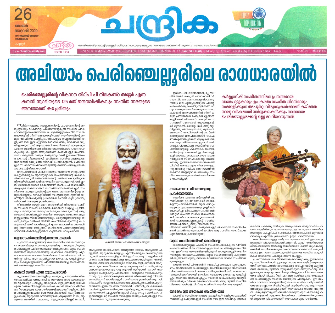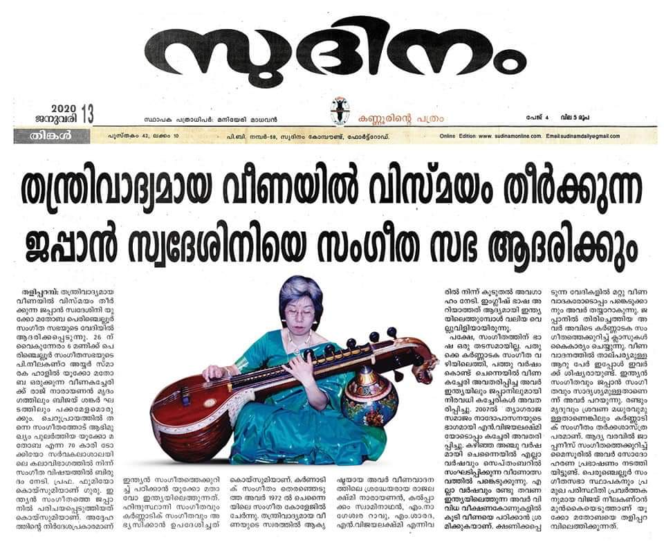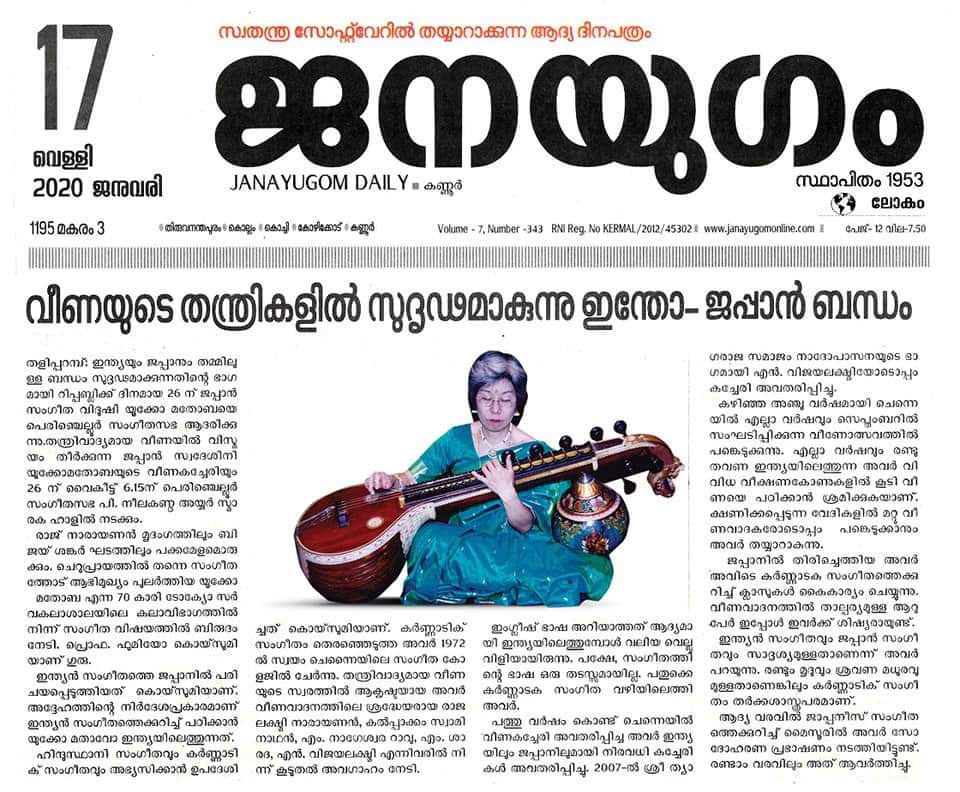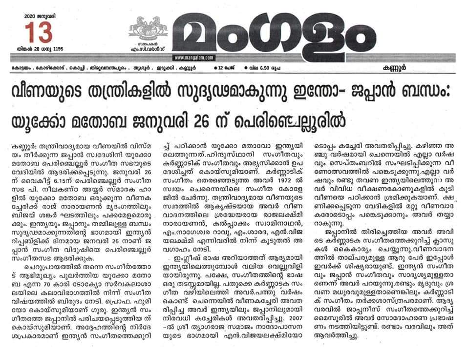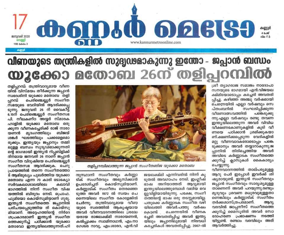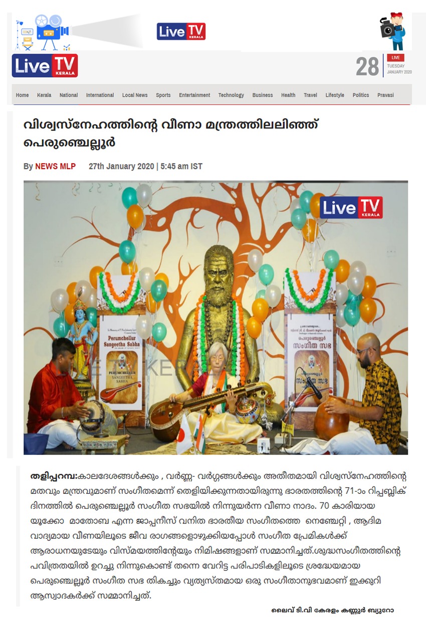 വിശ്വസ്നേഹത്തിന്റെ വീണാ മന്ത്രത്തിലലിഞ്ഞ് പെരുഞ്ചെല്ലൂർ കാലദേശങ്ങൾക്കും, വർണ്ണ വർഗ്ഗങ്ങൾക്കും അതീതമായി വിശ്വസ്നേഹത്തിന്റെ മതവും മന്ത്രവുമാണ് സംഗീതമെന്ന് തെളിയിക്കുന്നതായിരുന്നു പെരുഞ്ചെല്ലൂർ സംഗീത സഭയിൽ നിന്നുയർന്ന വീണാ നാദം. 70 കാരിയായ യൂക്കോ മാതോബ എന്ന ജാപ്പനീസ് വനിത ഭാരതീയ സംഗീതത്തെ നെഞ്ചേറ്റി , ആദിമ വാദ്യമായ വീണയിലൂടെ ജീവ രാഗങ്ങളൊഴുക്കിയപ്പോൾ സംഗീത പ്രേമികൾക്ക് ആരാധനയുടേയും വിസ്മയത്തിന്റേയും നിമിഷങ്ങളാണ് സമ്മാനിച്ചത്. ശുദ്ധസംഗീതത്തിന്റെ പവിത്രതയിൽ ഉറച്ചു നിന്നുകൊണ്ട് തന്നെ വേറിട്ട പരിപാടികളിലൂടെ ശ്രദ്ധേയമായ പെരുഞ്ചെല്ലൂർ സംഗീത സഭ തികച്ചും വ്യത്യസ്തമായ ഒരു സംഗീതാനുഭവമാണ് ഇക്കുറി ആസ്വാദകർക്ക് സമ്മാനിച്ചത്. സഭയുടെ അൻപതാമത് പരിപാടിയായി നടന്ന വീണക്കച്ചേരിയിലൂടെ രണ്ടു സംസ്കാരങ്ങൾ ദിവ്യനാദത്തിന്റെ ചരടിലൂടെ കോർത്ത് ഒന്നായിത്തീരുകയായിരുന്നു. കർണ്ണാടക സംഗീതത്തിലെ ദൈവീകവും ആത്മീയവുമായ അംശത്തെ തന്റെ ജന്മ നാടിന്റെ സംസ്കാര പശ്ചാത്തലത്തിൽ അതിവേഗം സ്വാംശീകരിക്കാൻ കഴിഞ്ഞതായി വീണ വാദനത്തിലൂടെ തെളിയിച്ചു. ഹംസദ്ധ്വനി രാഗ വർണ്ണത്തോടെ ആരംഭിച്ച കച്ചേരിയിൽ സിംഹേന്ദ്രമദ്ധ്യമ രാഗത്തിലുള്ള നിന്നെ നമ്മിതി ആയിരുന്നു മുഖ്യ കൃതി . കൂടാതെ നാട്ടരാഗത്തിൽ മഹാഗണപതി, പഞ്ചരത്ന കൃതിയായ എന്തരോ മഹാനുഭാവുലു, അഠാണ യിൽ അനുപമ ഗുണാംബുധി , രീതിഗൗളയിൽ ജനനി നിനുവിന, പൂർവ്വികല്യാണിയിൽ ആനന്ദ നാമാടുവാർ കദന രഘുവംശ സുധാ, കാപ്പിരാഗത്തിൽ എന്ന തവം, കേദാരത്തിൽ സമയമിദേ തുടങ്ങിയ കൃതികളും ധനാശ്രീ രാഗത്തിൽ തില്ലാനയും അവതരിപ്പിച്ചു. മൃദംഗത്തിൽ വിദ്വാൻ. രാജ്നാരായണനും ഘട്ടത്തിൽ വിദ്വാൻ ബിജോയ് ശങ്കറും ഉജ്ജ്വല പ്രകടനം നടത്തി ആസ്വാദകരെ ആനന്ദിപ്പിച്ചു. ശ്രീ. എം. എം. രാമൻനമ്പൂതിരി യും ആനന്ദവല്ലി ടീച്ചറും ചേർന്നു കലാകാരന്മാരെ ആദരിച്ചു. ശ്രീ. പി. വി. രാജശേഖരൻ ആശ ടീച്ചറും ചേർന്നു കലാകാരന്മാർക്ക് ഉപഹാരം നൽകി. പി. വി. രാജശേഖരനും ആശ ടീച്ചറും ചേർന്നു കലാകാരിക്ക് ഉപഹാരം നൽകി