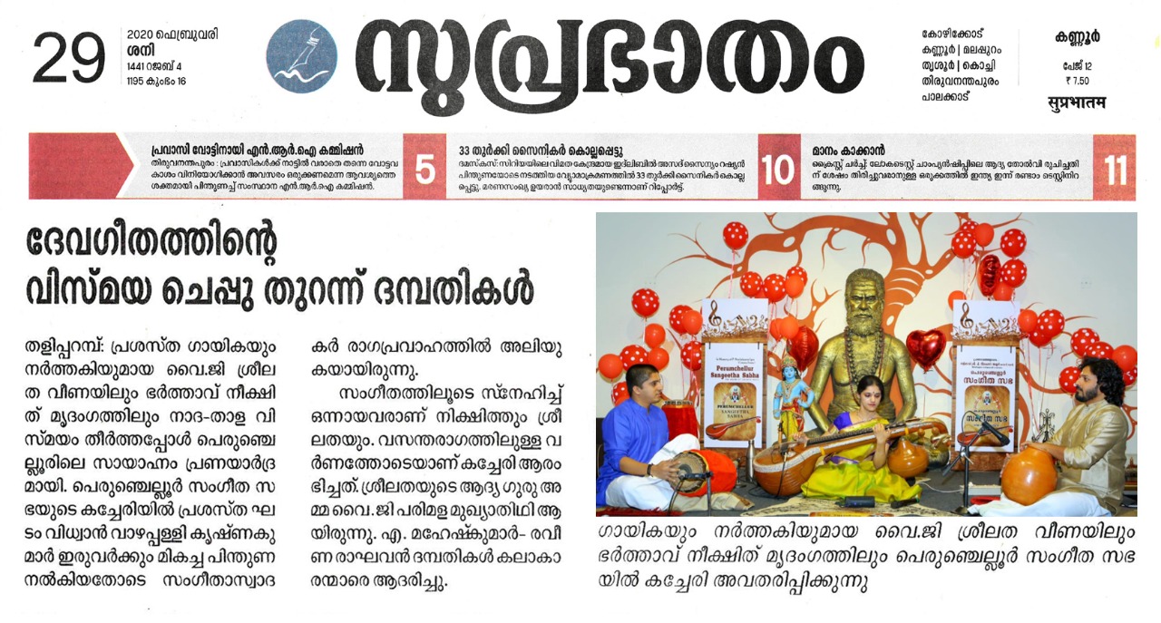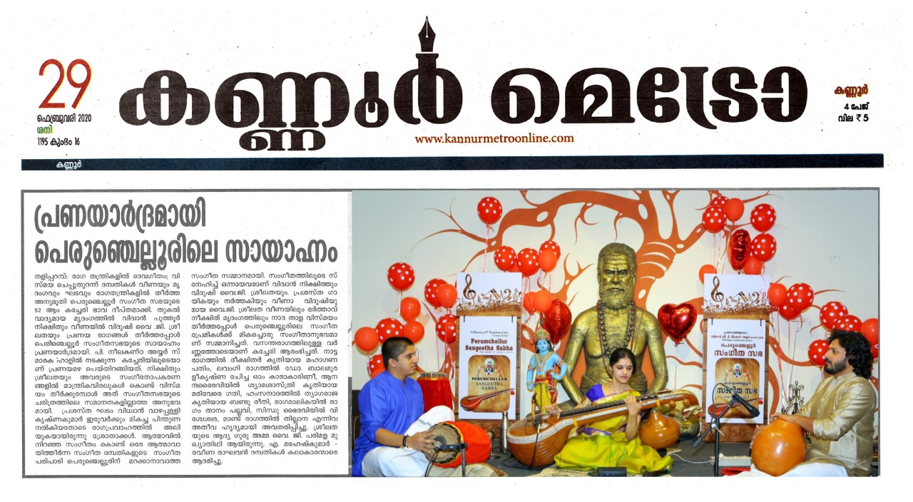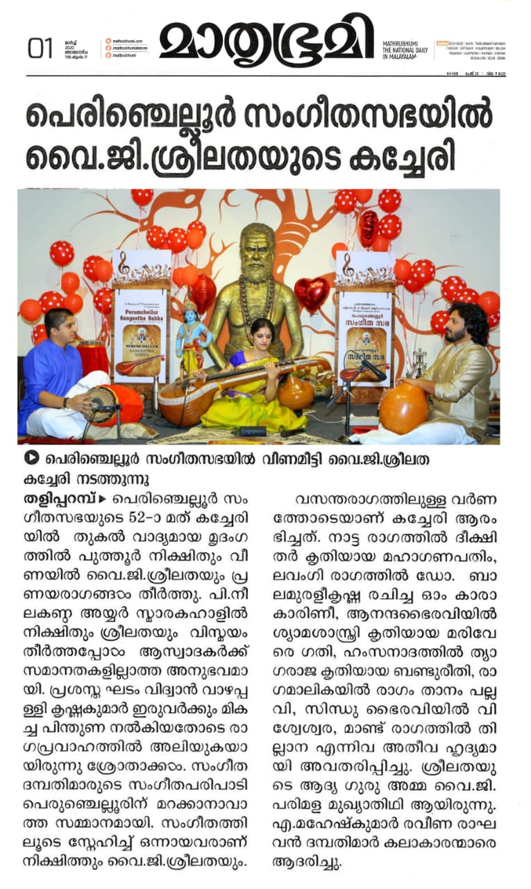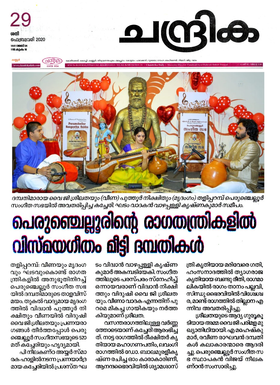 പ്രണയാർദ്രമായി പെരുഞ്ചെല്ലൂരിലെ സായാഹ്നം രാഗ തന്ത്രികളിൽ ദേവഗീതം ; വിസ്മയ ചെപ്പുതുറന്ന് ദമ്പതികൾ വീണയും മൃദംഗവും ഘടവും രാഗതന്ത്രികളിൽ തീർത്ത അനുഭൂതി പെരുഞ്ചെല്ലൂർ സംഗീത സഭയുടെ 52 ആം കച്ചേരി ഭാവ ദീപ്തമാക്കി. തുകൽ വാദ്യമായ മൃദംഗത്തിൽ വിദ്വാൻ പുത്തൂർ നിക്ഷിതും വീണയിൽ വിദുഷി വൈ .ജി. ശ്രീലതയും പ്രണയ രാഗങ്ങൾ തീർത്തപ്പോൾ പെരിഞ്ചെല്ലൂർ സംഗീതസഭയുടെ സായാഹ്നം പ്രണയാർദ്രമായി. പി. നീലകണ്ഠ അയ്യർ സ്മാരക ഹാളിൽ നടക്കുന്ന കച്ചേരിയിലൂടെയാണ് പ്രണയമഴ പെയ്തിറങ്ങിയത്. നിക്ഷിതും ശ്രീലതയും അവരുടെ സംഗീതോപകരണങ്ങളിൽ മാന്ത്രികവിരലുകൾ കൊണ്ട് വിസ്മയം തീർക്കുമ്പോൾ അത് സംഗീതസഭയുടെ ചരിത്രത്തിലെ സമാനതകളില്ലാത്ത അനുഭവമായി. പ്രശസ്ത ഘടം വിധ്വാൻ വാഴപ്പള്ളി കൃഷ്ണകുമാർ ഇരുവർക്കും മികച്ച പിന്തുണ നൽകിയതോടെ രാഗപ്രവാഹത്തിൽ അലിയുകയായിരുന്നു ശ്രോതാക്കൾ. ആത്മാവിൽ നിറഞ്ഞ സംഗീതം കൊണ്ട് ഒരേ ആത്മാവായിത്തീർന്ന സംഗീത ദമ്പതികളുടെ സംഗീത പരിപാടി പെരുഞ്ചെല്ലൂരിന് മറക്കാനാവാത്ത സംഗീത സമ്മാനമായി. സംഗീതത്തിലൂടെ സ്നേഹിച്ച് ഒന്നായവരാണ് വിദ്വാൻ നിക്ഷിത്തും വിദുഷി വൈ.ജി.ശ്രീലതയും. പ്രശസ്ത ഗായികയും നർത്തകിയും വീണാ വിദുഷിയുമായ വൈ.ജി. ശ്രീലത വീണയിലും ഭർത്താവ് നീക്ഷിത് മൃദംഗത്തിലും നാദ താള വിസ്മയം തീർത്തപ്പോൾ പെരുഞ്ചെല്ലൂരിലെ സംഗീത പ്രേമികൾക്ക് മികച്ചൊരു സംഗീതാനുഭവമാണ് സമ്മാനിച്ചത്. വസന്തരാഗത്തിലുള്ള വർണ്ണത്തോടെയാണ് കച്ചേരി ആരംഭിച്ചത്. നാട്ട രാഗത്തിൽ ദീക്ഷിതർ കൃതിയായ മഹാഗണപതിം , ലവംഗി രാഗത്തിൽ ഡോ. ബാലമുരളീകൃഷ്ണ രചിച്ച ഓം കാരാകാരിണീ, ആനന്ദഭൈരവിയിൽ ശ്യാമശാസ്ത്രി കൃതിയായ മരിവേരെ ഗതി, ഹംസനാദത്തിൽ ത്യാഗരാജ കൃതിയായ ബണ്ടു രീതി, രാഗമാലികയിൽ രാഗം താനം പല്ലവി, സിന്ധു ഭൈരവിയിൽ വിശ്വേശ്വര, മാണ്ട് രാഗത്തിൽ തില്ലാന എന്നിവ അതീവ ഹൃദ്യമായി അവതരിപ്പിച്ചു. ശ്രീലതയുടെ ആദ്യ ഗുരു അമ്മ വൈ. ജി. പരിമള മുഖ്യാതിഥി ആയിരുന്നു. എ. മഹേഷ്കുമാർ - രവീണ രാഘവൻ ദമ്പതികൾ കലാകാരന്മാരെ ആദരിച്ചു.