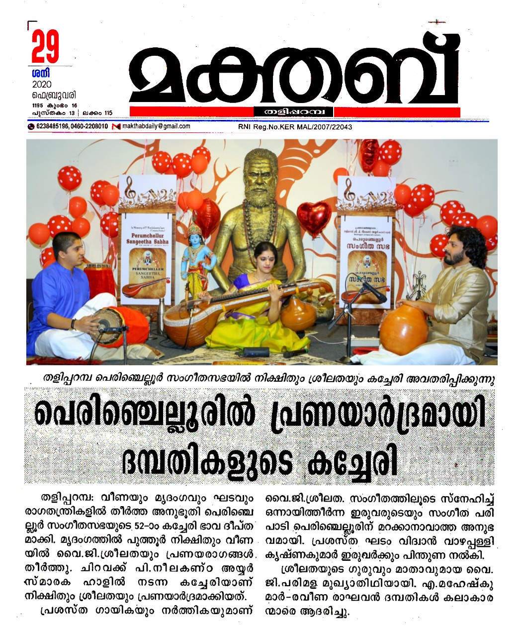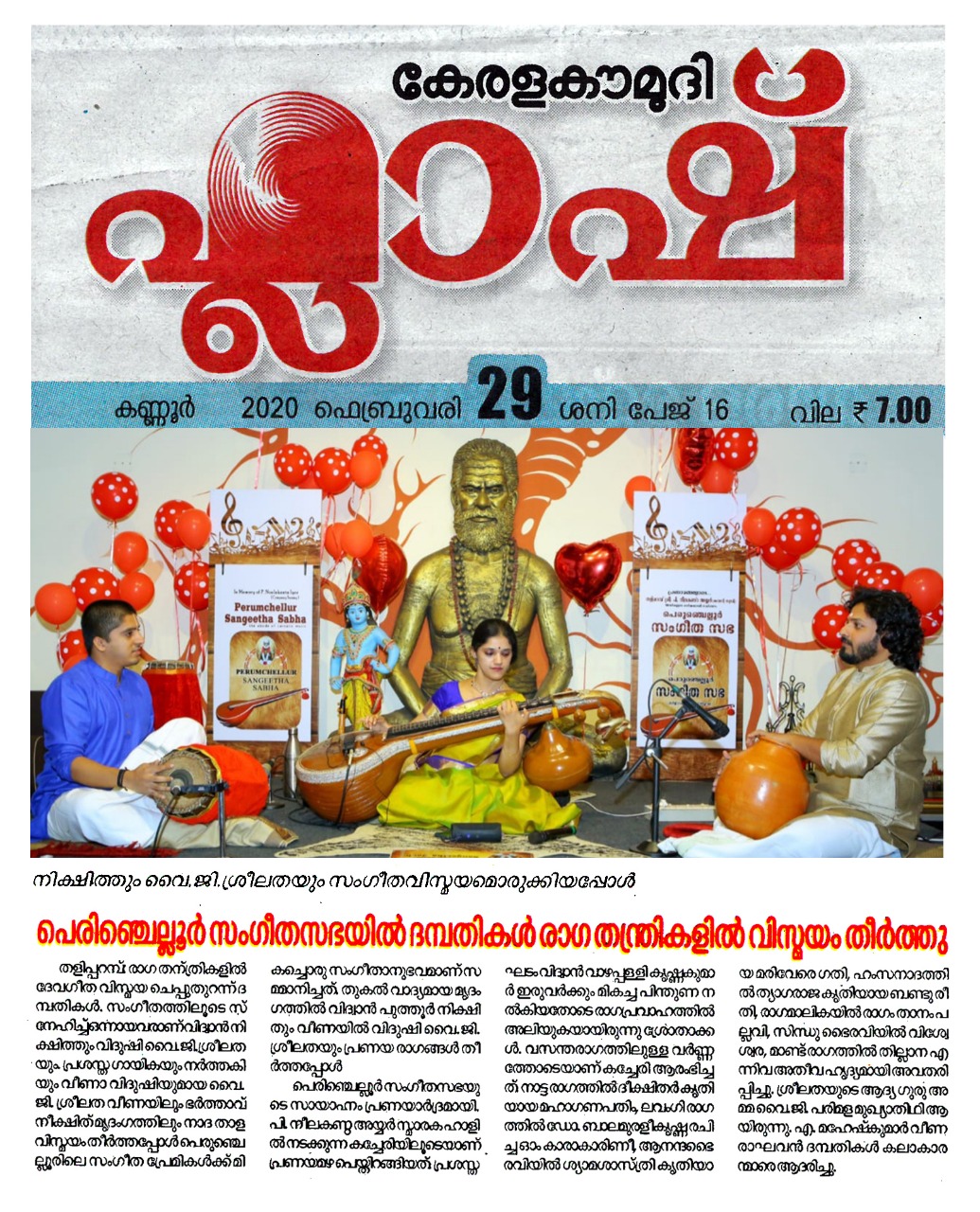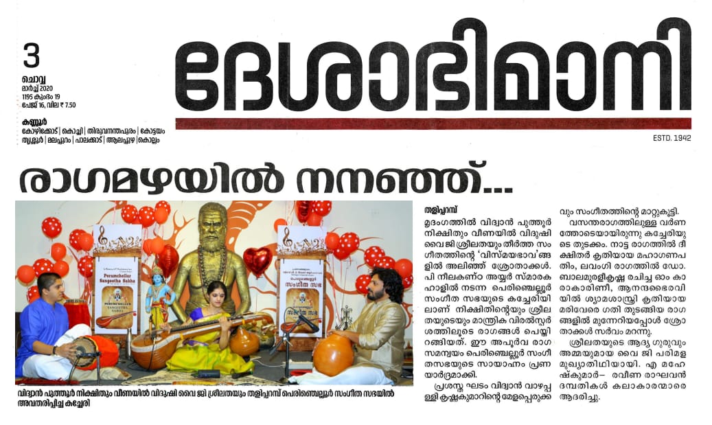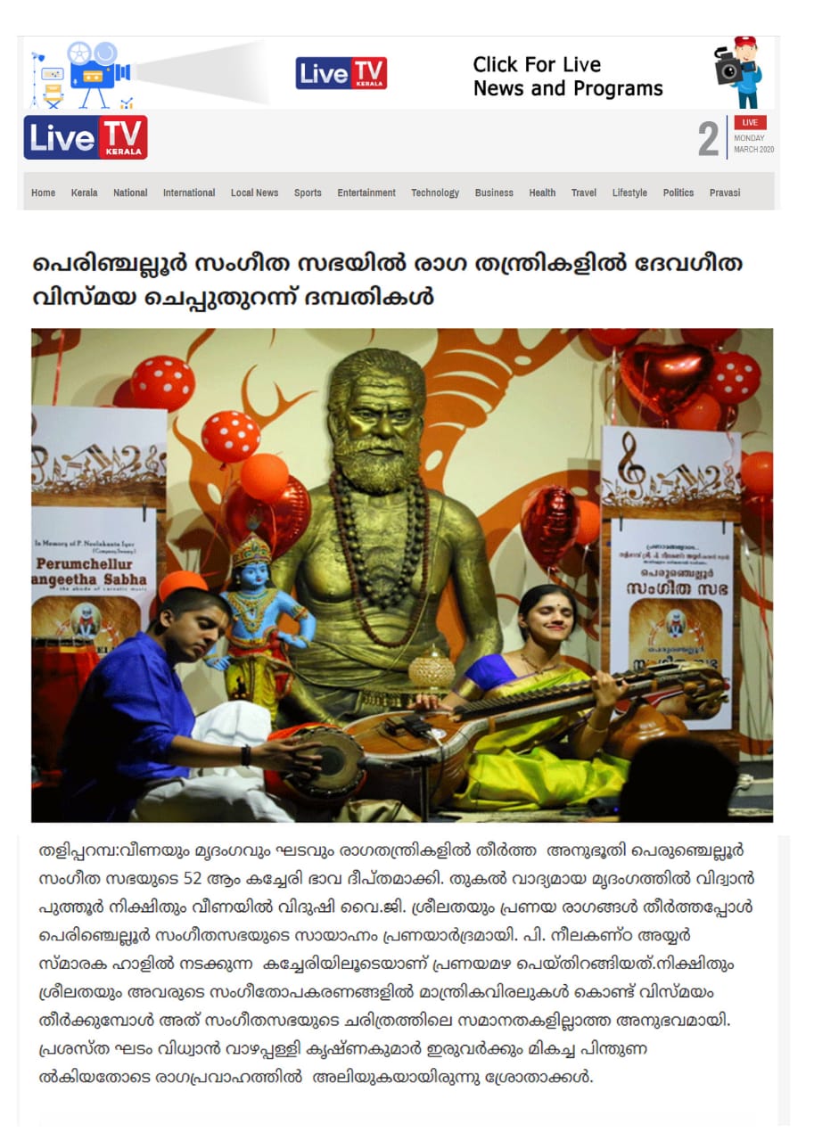 പ്രണയാർദ്രമായി പെരുഞ്ചെല്ലൂരിലെ സായാഹ്നം രാഗ തന്ത്രികളിൽ ദേവഗീതം ; വിസ്മയ ചെപ്പുതുറന്ന് ദമ്പതികൾ വീണയും മൃദംഗവും ഘടവും രാഗതന്ത്രികളിൽ തീർത്ത അനുഭൂതി പെരുഞ്ചെല്ലൂർ സംഗീത സഭയുടെ 52 ആം കച്ചേരി ഭാവ ദീപ്തമാക്കി. തുകൽ വാദ്യമായ മൃദംഗത്തിൽ വിദ്വാൻ പുത്തൂർ നിക്ഷിതും വീണയിൽ വിദുഷി വൈ .ജി. ശ്രീലതയും പ്രണയ രാഗങ്ങൾ തീർത്തപ്പോൾ പെരിഞ്ചെല്ലൂർ സംഗീതസഭയുടെ സായാഹ്നം പ്രണയാർദ്രമായി. പി. നീലകണ്ഠ അയ്യർ സ്മാരക ഹാളിൽ നടക്കുന്ന കച്ചേരിയിലൂടെയാണ് പ്രണയമഴ പെയ്തിറങ്ങിയത്. നിക്ഷിതും ശ്രീലതയും അവരുടെ സംഗീതോപകരണങ്ങളിൽ മാന്ത്രികവിരലുകൾ കൊണ്ട് വിസ്മയം തീർക്കുമ്പോൾ അത് സംഗീതസഭയുടെ ചരിത്രത്തിലെ സമാനതകളില്ലാത്ത അനുഭവമായി. പ്രശസ്ത ഘടം വിധ്വാൻ വാഴപ്പള്ളി കൃഷ്ണകുമാർ ഇരുവർക്കും മികച്ച പിന്തുണ നൽകിയതോടെ രാഗപ്രവാഹത്തിൽ അലിയുകയായിരുന്നു ശ്രോതാക്കൾ. ആത്മാവിൽ നിറഞ്ഞ സംഗീതം കൊണ്ട് ഒരേ ആത്മാവായിത്തീർന്ന സംഗീത ദമ്പതികളുടെ സംഗീത പരിപാടി പെരുഞ്ചെല്ലൂരിന് മറക്കാനാവാത്ത സംഗീത സമ്മാനമായി. സംഗീതത്തിലൂടെ സ്നേഹിച്ച് ഒന്നായവരാണ് വിദ്വാൻ നിക്ഷിത്തും വിദുഷി വൈ.ജി.ശ്രീലതയും. പ്രശസ്ത ഗായികയും നർത്തകിയും വീണാ വിദുഷിയുമായ വൈ.ജി. ശ്രീലത വീണയിലും ഭർത്താവ് നീക്ഷിത് മൃദംഗത്തിലും നാദ താള വിസ്മയം തീർത്തപ്പോൾ പെരുഞ്ചെല്ലൂരിലെ സംഗീത പ്രേമികൾക്ക് മികച്ചൊരു സംഗീതാനുഭവമാണ് സമ്മാനിച്ചത്. വസന്തരാഗത്തിലുള്ള വർണ്ണത്തോടെയാണ് കച്ചേരി ആരംഭിച്ചത്. നാട്ട രാഗത്തിൽ ദീക്ഷിതർ കൃതിയായ മഹാഗണപതിം , ലവംഗി രാഗത്തിൽ ഡോ. ബാലമുരളീകൃഷ്ണ രചിച്ച ഓം കാരാകാരിണീ, ആനന്ദഭൈരവിയിൽ ശ്യാമശാസ്ത്രി കൃതിയായ മരിവേരെ ഗതി, ഹംസനാദത്തിൽ ത്യാഗരാജ കൃതിയായ ബണ്ടു രീതി, രാഗമാലികയിൽ രാഗം താനം പല്ലവി, സിന്ധു ഭൈരവിയിൽ വിശ്വേശ്വര, മാണ്ട് രാഗത്തിൽ തില്ലാന എന്നിവ അതീവ ഹൃദ്യമായി അവതരിപ്പിച്ചു. ശ്രീലതയുടെ ആദ്യ ഗുരു അമ്മ വൈ. ജി. പരിമള മുഖ്യാതിഥി ആയിരുന്നു. എ. മഹേഷ്കുമാർ - രവീണ രാഘവൻ ദമ്പതികൾ കലാകാരന്മാരെ ആദരിച്ചു.