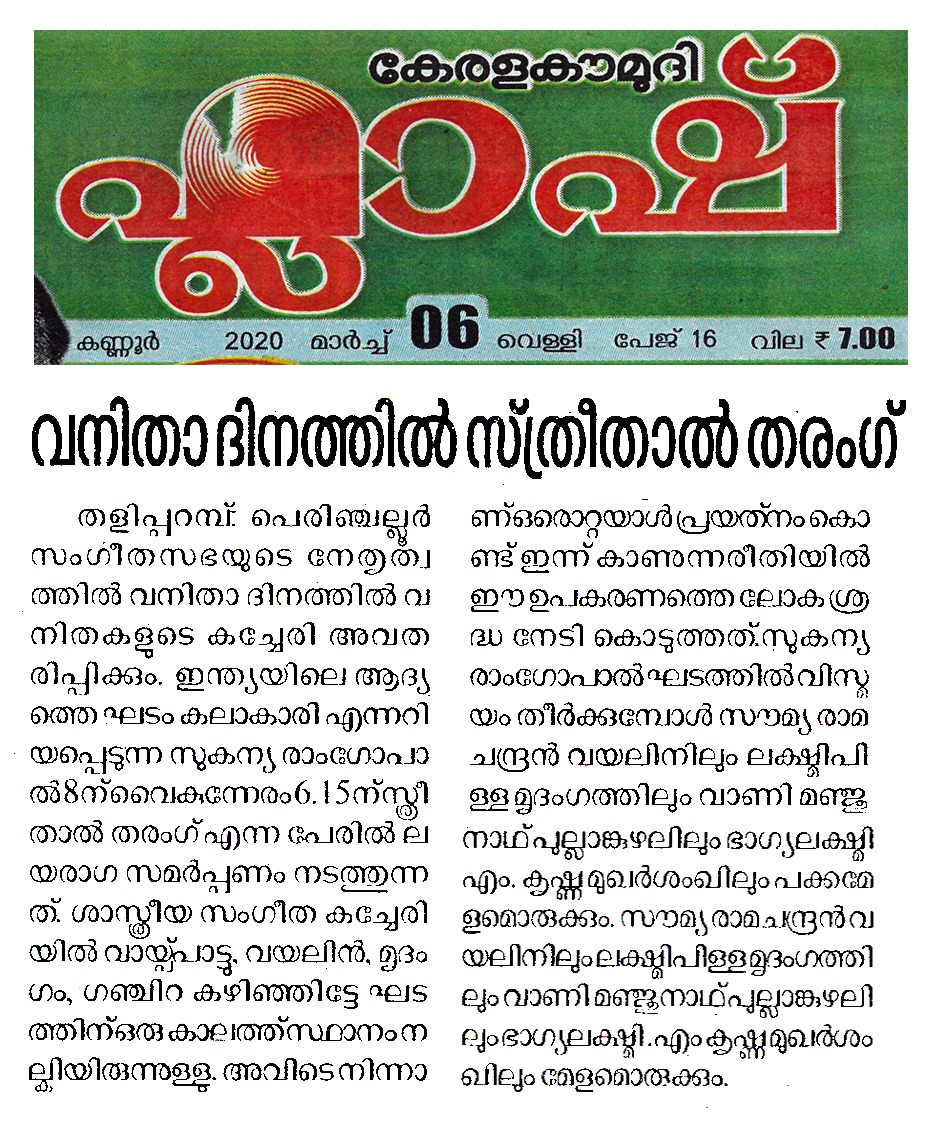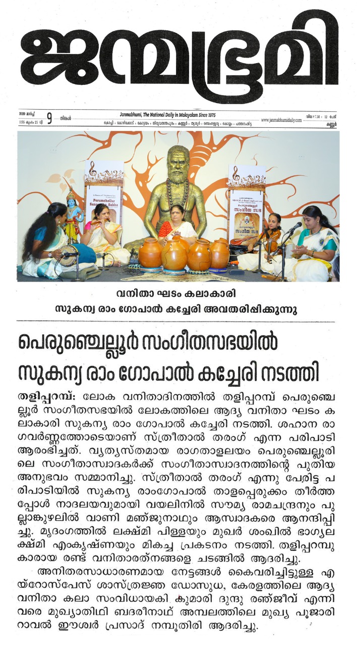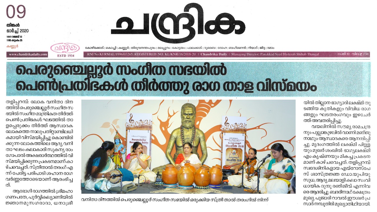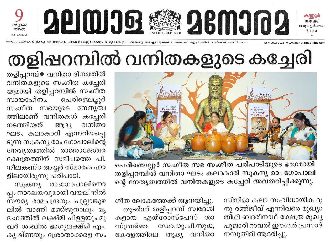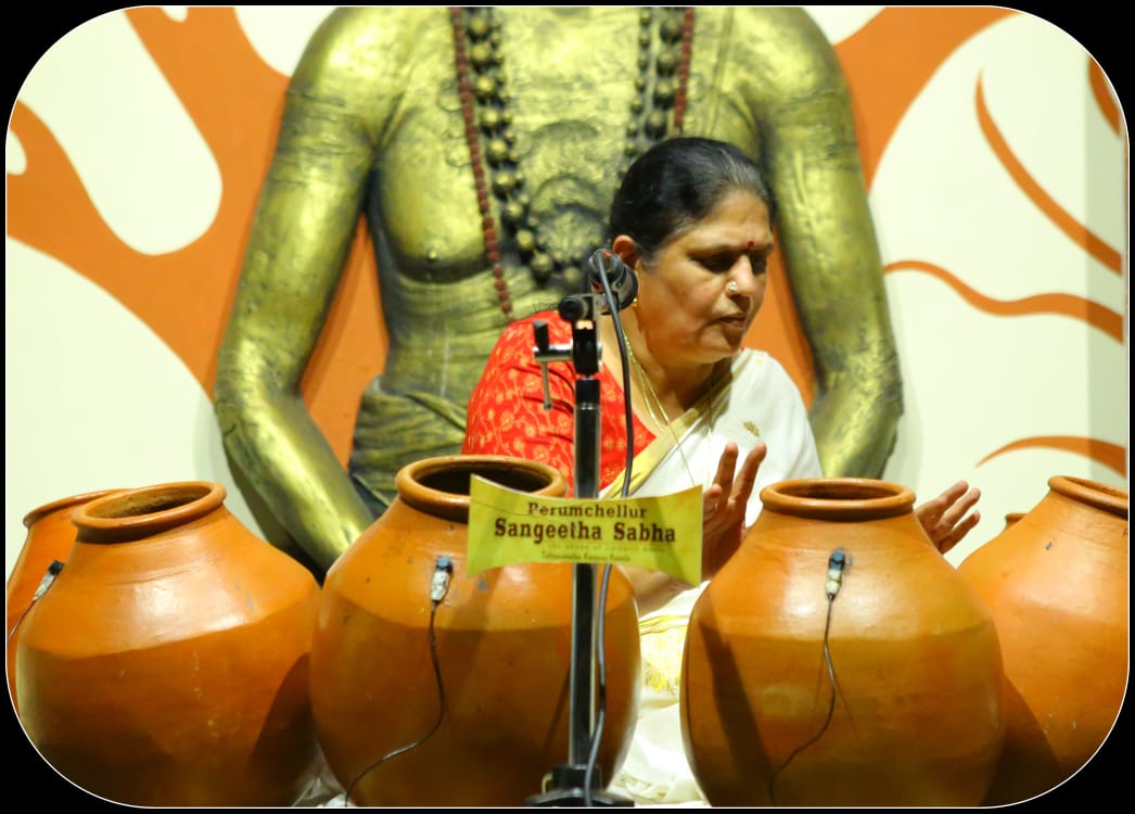 Vidushi. Sukanya Ramgopal Akka, India’s first woman ghatam player is among the best-known percussionists in India today. She is heading an all-woman instrumental ensemble started in the year 1995, the Sthree Thaal Tharang features the ghatam, violin, flute, morsing and mridangam. A well-trained, senior & experienced Carnatic Classical Percussionist as well as music composer ... she is also sought after for her effervescent multi-ghatam tarang performances. Talent and expertise transcend gender preferences; ghatam, hitherto considered as an upa pakkavadyam, occupied centre stage literally and figuratively. Thanks to Sukanya Ramgopal Akka and her all-woman team! The team has proved that percussion is no longer to be considered a male bastion. Vidushi. Sukanya Ramgopal played the ghata tarang - with six ghatams. Her mastery over the instrument is simply awe-inspiring! Sukanya Akkas konnakol was again simply out of the world. Vidushi. Soumya Ramachandran on violin, Vidushi. Lakshmi Pillai on Mrudangam, Vidushi.Vani Manjunath on Flute & Vidushi. Bhagyalakshmi M. Krishna on Morsing performed brilliantly. All talented musicians in their own right and when they play together there is a delightful exuberance and a magical charm. The amount of energy and enthusiasm that this this ensemble exudes is something phenomenal. The intensity and laya brilliance that they demonstrated captivated me. This concert at Perumchellur Sangeetha Sabha...that too on March 8th - International womens day...was certainly different and hats off to the entire women artistes who were all good. One needs to see it to believe!!! It’s a concert that will remain in memory for a very long time.....