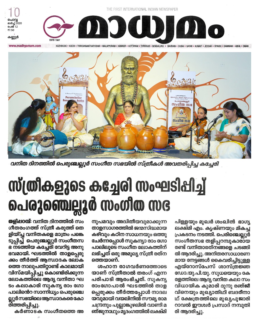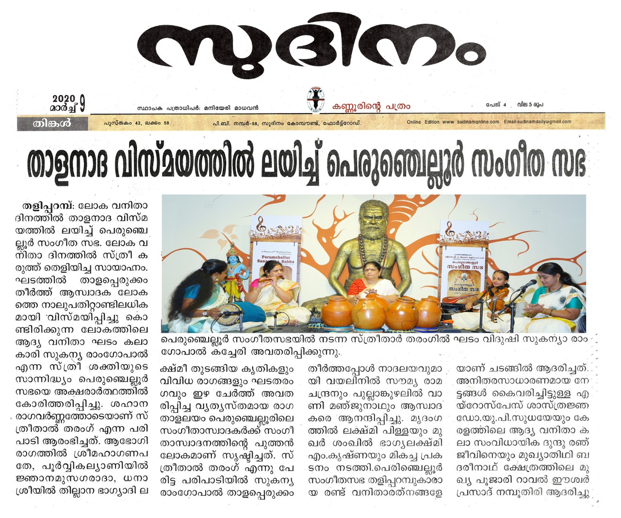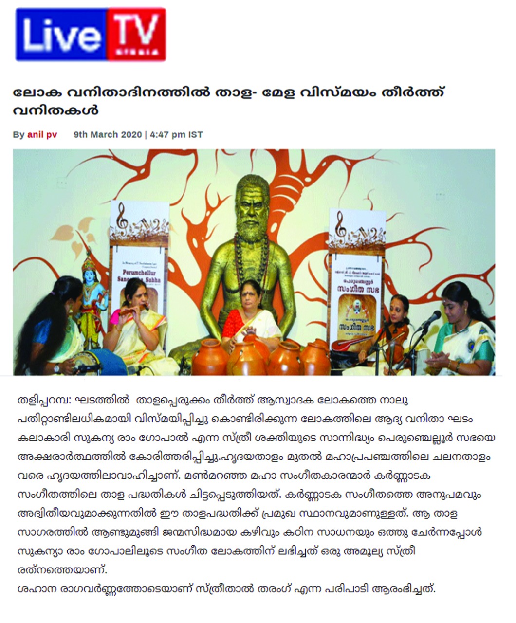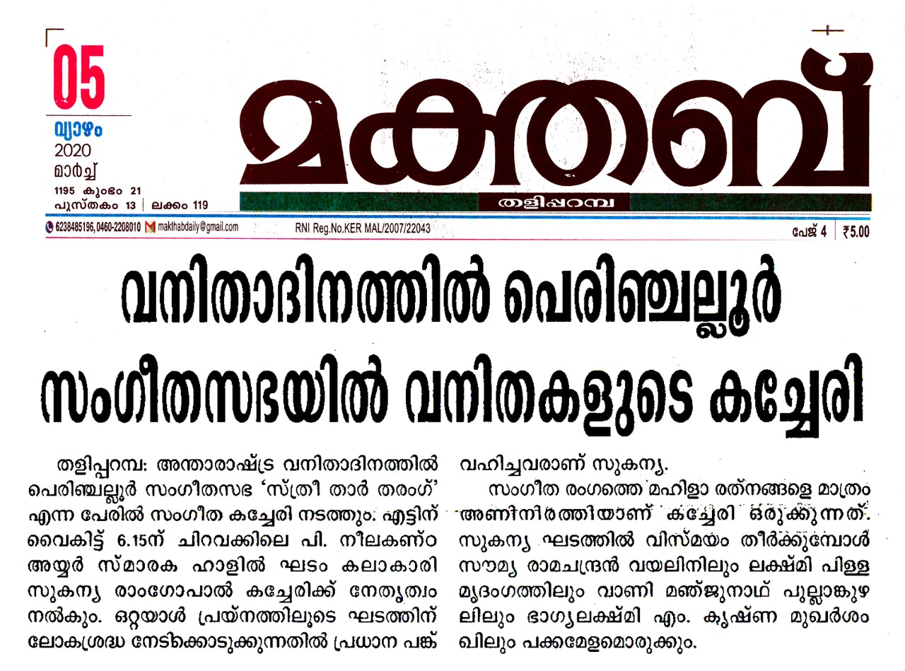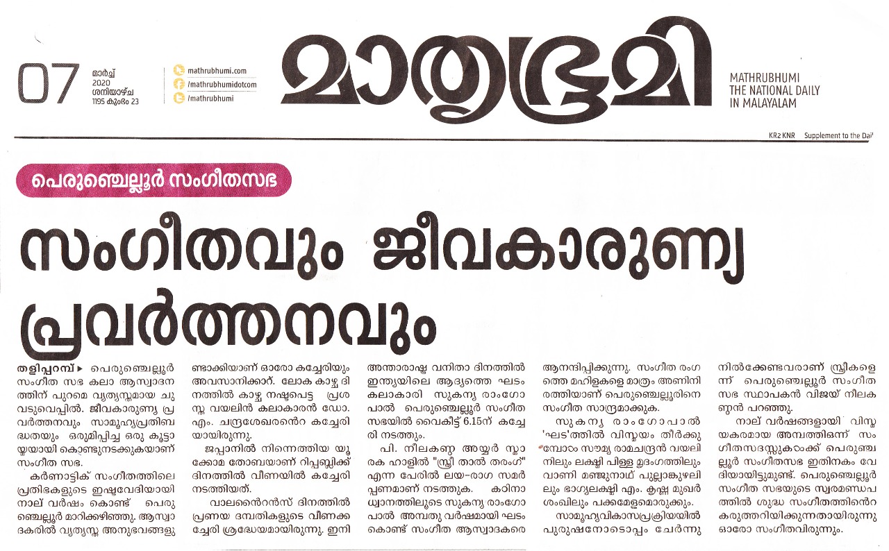 Vidushi. Sukanya Ramgopal Akka, India’s first woman ghatam player is among the best-known percussionists in India today. She is heading an all-woman instrumental ensemble started in the year 1995, the Sthree Thaal Tharang features the ghatam, violin, flute, morsing and mridangam. A well-trained, senior & experienced Carnatic Classical Percussionist as well as music composer ... she is also sought after for her effervescent multi-ghatam tarang performances. Talent and expertise transcend gender preferences; ghatam, hitherto considered as an upa pakkavadyam, occupied centre stage literally and figuratively. Thanks to Sukanya Ramgopal Akka and her all-woman team! The team has proved that percussion is no longer to be considered a male bastion. Vidushi. Sukanya Ramgopal played the ghata tarang - with six ghatams. Her mastery over the instrument is simply awe-inspiring! Sukanya Akkas konnakol was again simply out of the world. Vidushi. Soumya Ramachandran on violin, Vidushi. Lakshmi Pillai on Mrudangam, Vidushi.Vani Manjunath on Flute & Vidushi. Bhagyalakshmi M. Krishna on Morsing performed brilliantly. All talented musicians in their own right and when they play together there is a delightful exuberance and a magical charm. The amount of energy and enthusiasm that this this ensemble exudes is something phenomenal. The intensity and laya brilliance that they demonstrated captivated me. This concert at Perumchellur Sangeetha Sabha...that too on March 8th - International womens day...was certainly different and hats off to the entire women artistes who were all good. One needs to see it to believe!!! It’s a concert that will remain in memory for a very long time.....