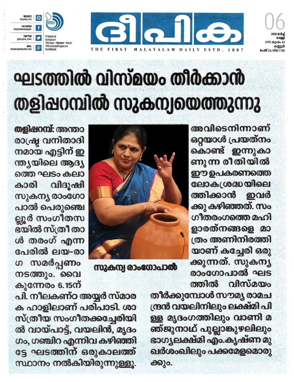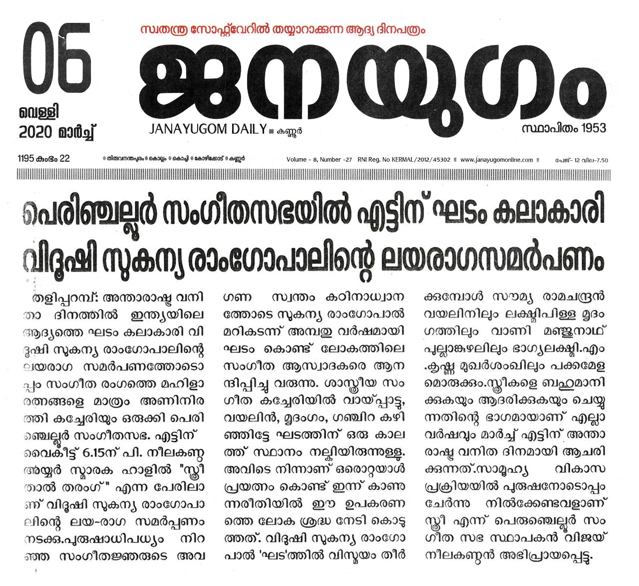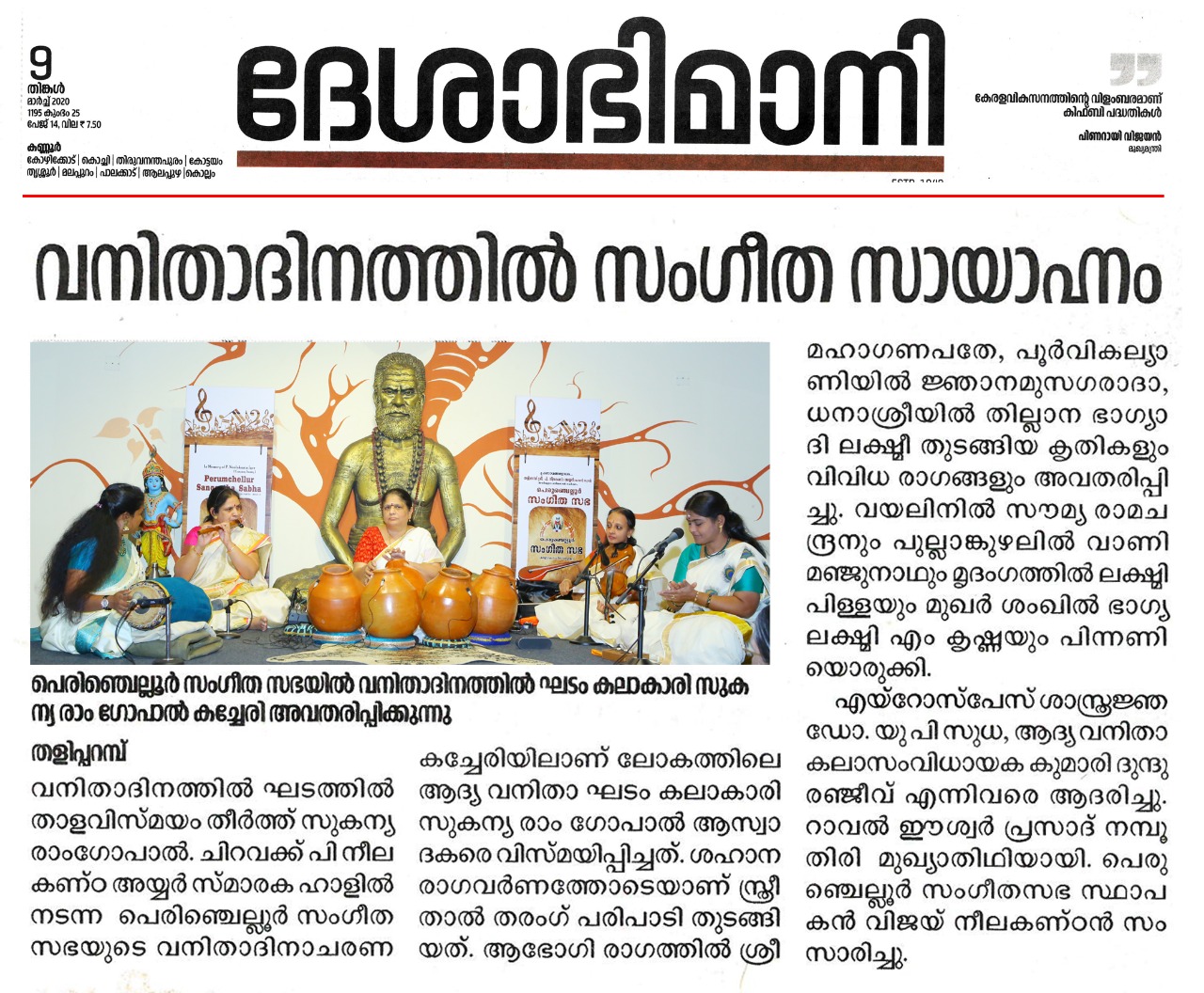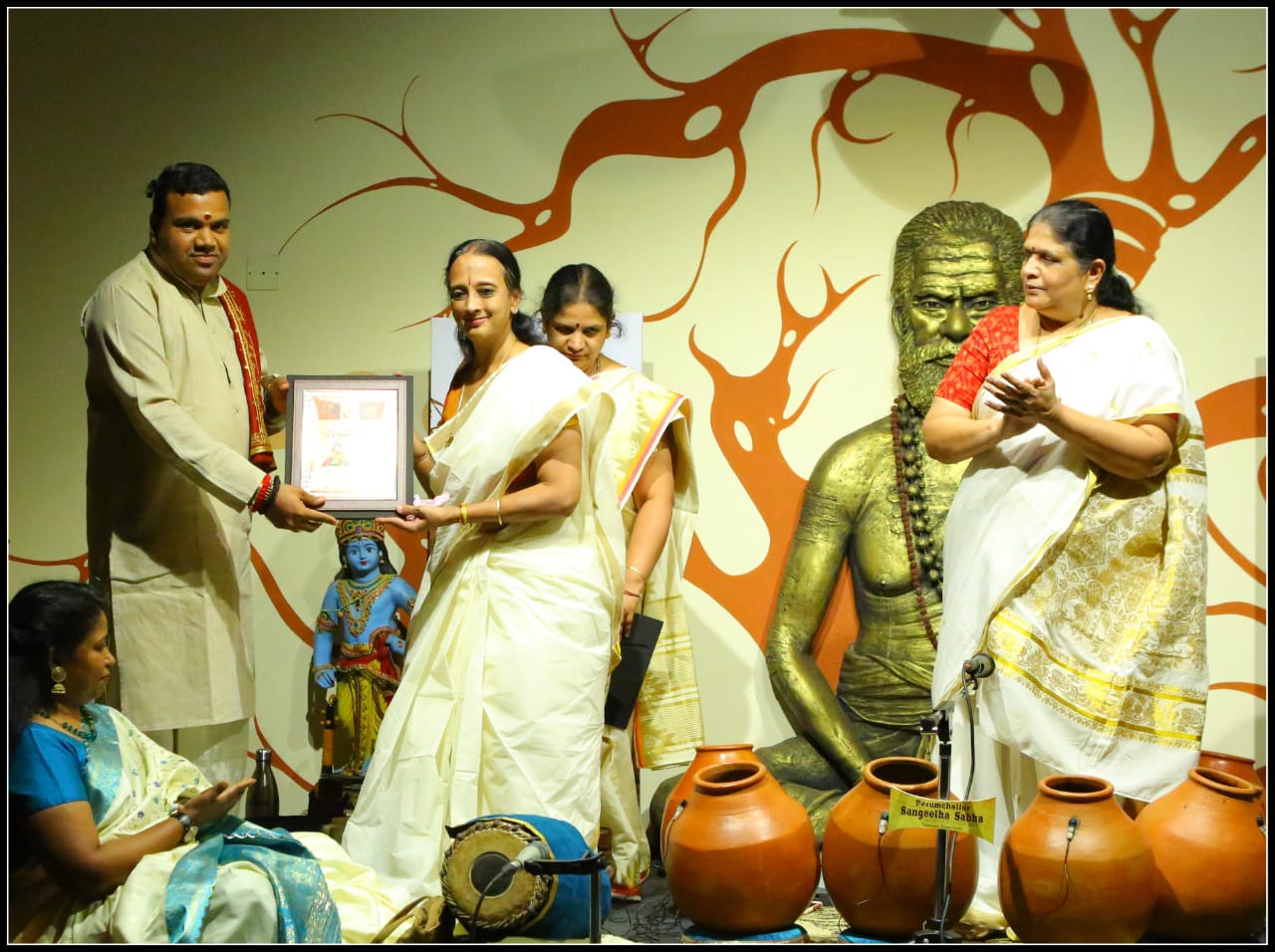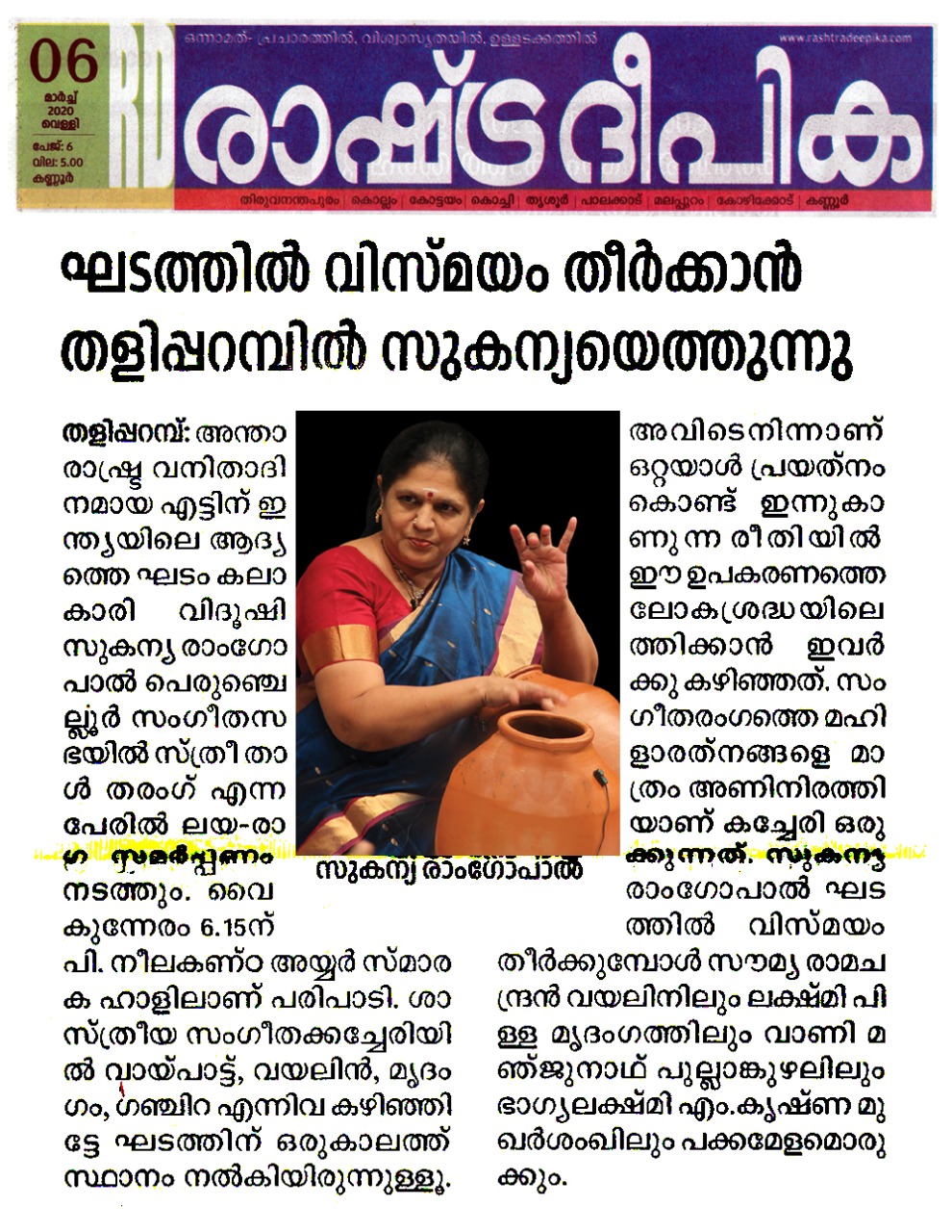 Vidushi. Sukanya Ramgopal Akka, India’s first woman ghatam player is among the best-known percussionists in India today. She is heading an all-woman instrumental ensemble started in the year 1995, the Sthree Thaal Tharang features the ghatam, violin, flute, morsing and mridangam. A well-trained, senior & experienced Carnatic Classical Percussionist as well as music composer ... she is also sought after for her effervescent multi-ghatam tarang performances. Talent and expertise transcend gender preferences; ghatam, hitherto considered as an upa pakkavadyam, occupied centre stage literally and figuratively. Thanks to Sukanya Ramgopal Akka and her all-woman team! The team has proved that percussion is no longer to be considered a male bastion. Vidushi. Sukanya Ramgopal played the ghata tarang - with six ghatams. Her mastery over the instrument is simply awe-inspiring! Sukanya Akkas konnakol was again simply out of the world. Vidushi. Soumya Ramachandran on violin, Vidushi. Lakshmi Pillai on Mrudangam, Vidushi.Vani Manjunath on Flute & Vidushi. Bhagyalakshmi M. Krishna on Morsing performed brilliantly. All talented musicians in their own right and when they play together there is a delightful exuberance and a magical charm. The amount of energy and enthusiasm that this this ensemble exudes is something phenomenal. The intensity and laya brilliance that they demonstrated captivated me. This concert at Perumchellur Sangeetha Sabha...that too on March 8th - International womens day...was certainly different and hats off to the entire women artistes who were all good. One needs to see it to believe!!! It’s a concert that will remain in memory for a very long time.....