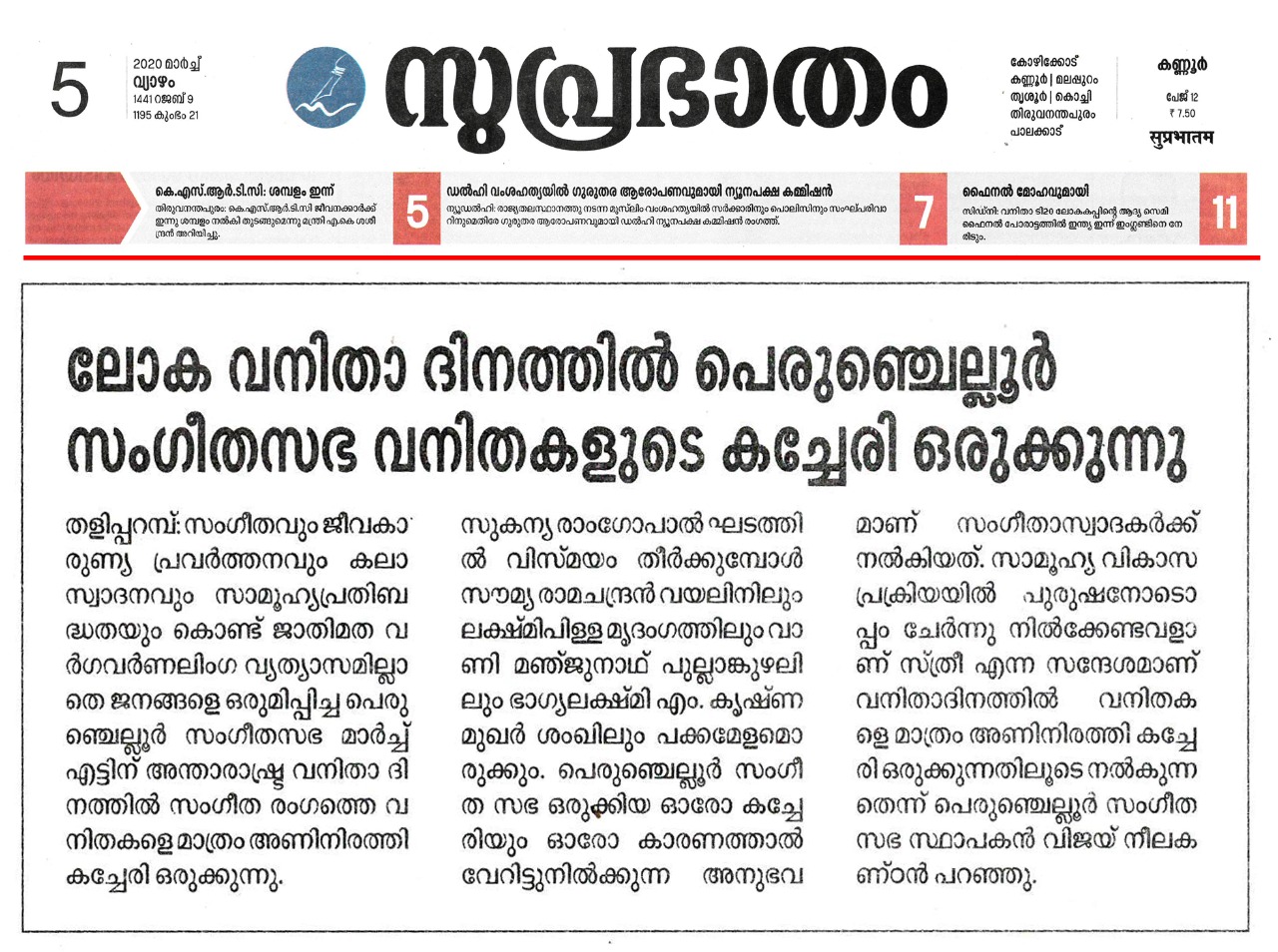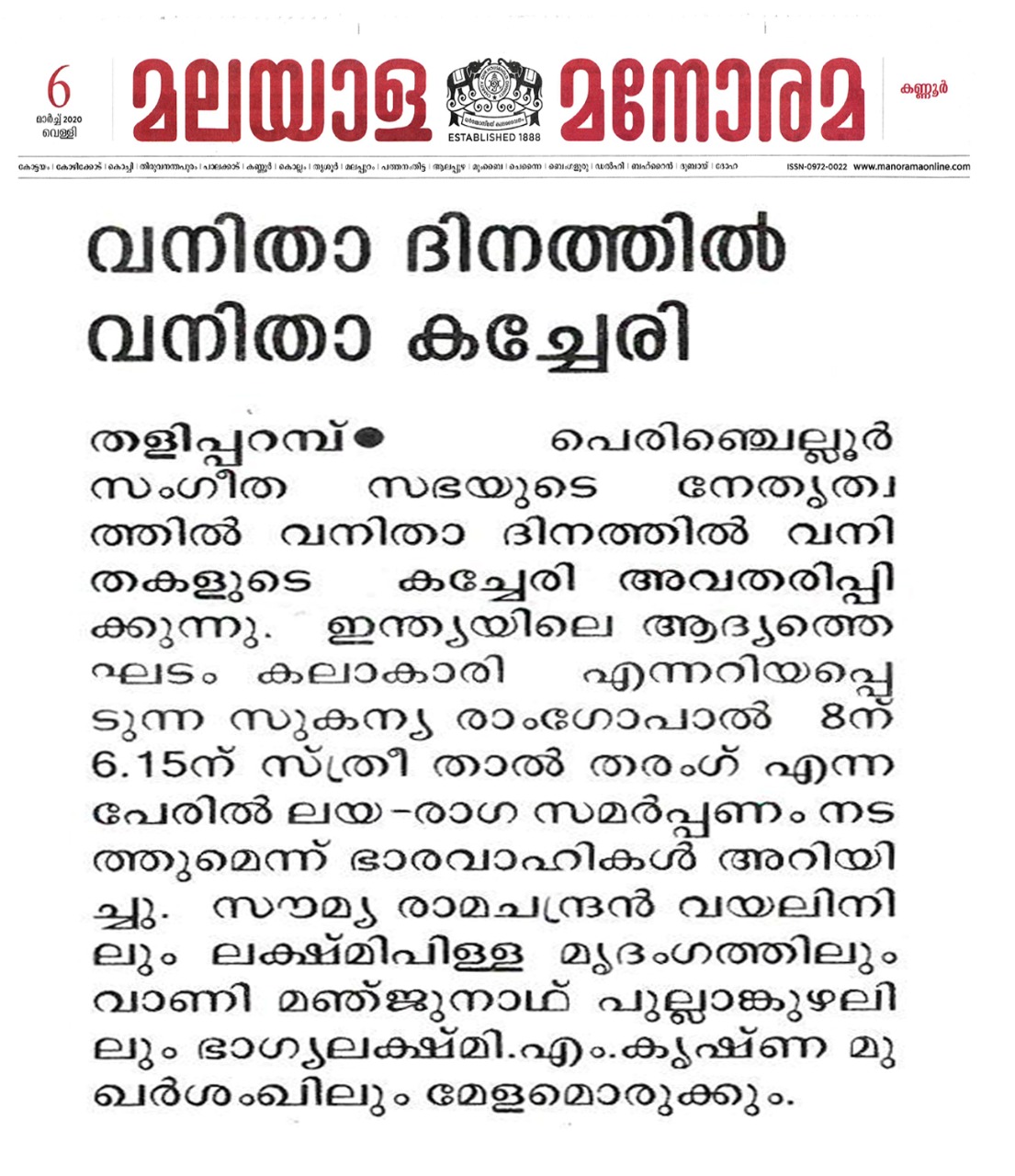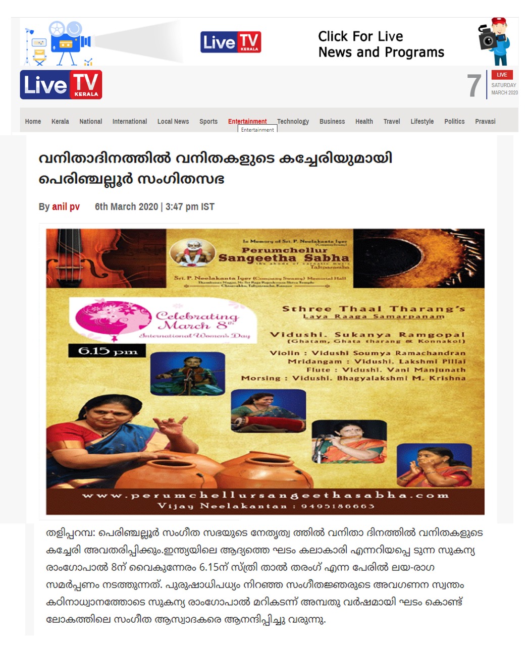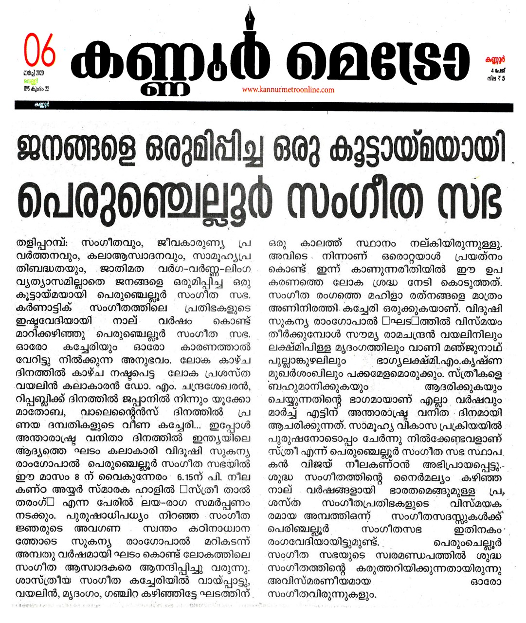 Vidushi. Sukanya Ramgopal Akka, India’s first woman ghatam player is among the best-known percussionists in India today. She is heading an all-woman instrumental ensemble started in the year 1995, the Sthree Thaal Tharang features the ghatam, violin, flute, morsing and mridangam. A well-trained, senior & experienced Carnatic Classical Percussionist as well as music composer ... she is also sought after for her effervescent multi-ghatam tarang performances. Talent and expertise transcend gender preferences; ghatam, hitherto considered as an upa pakkavadyam, occupied centre stage literally and figuratively. Thanks to Sukanya Ramgopal Akka and her all-woman team! The team has proved that percussion is no longer to be considered a male bastion. Vidushi. Sukanya Ramgopal played the ghata tarang - with six ghatams. Her mastery over the instrument is simply awe-inspiring! Sukanya Akkas konnakol was again simply out of the world. Vidushi. Soumya Ramachandran on violin, Vidushi. Lakshmi Pillai on Mrudangam, Vidushi.Vani Manjunath on Flute & Vidushi. Bhagyalakshmi M. Krishna on Morsing performed brilliantly. All talented musicians in their own right and when they play together there is a delightful exuberance and a magical charm. The amount of energy and enthusiasm that this this ensemble exudes is something phenomenal. The intensity and laya brilliance that they demonstrated captivated me. This concert at Perumchellur Sangeetha Sabha...that too on March 8th - International womens day...was certainly different and hats off to the entire women artistes who were all good. One needs to see it to believe!!! It’s a concert that will remain in memory for a very long time.....