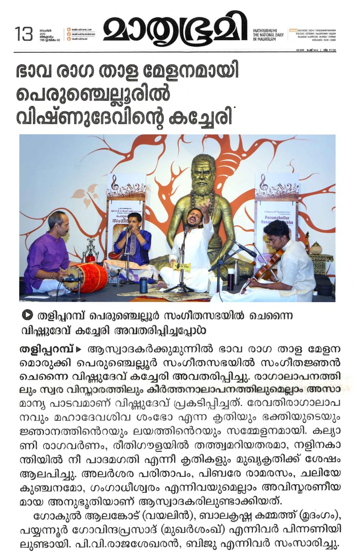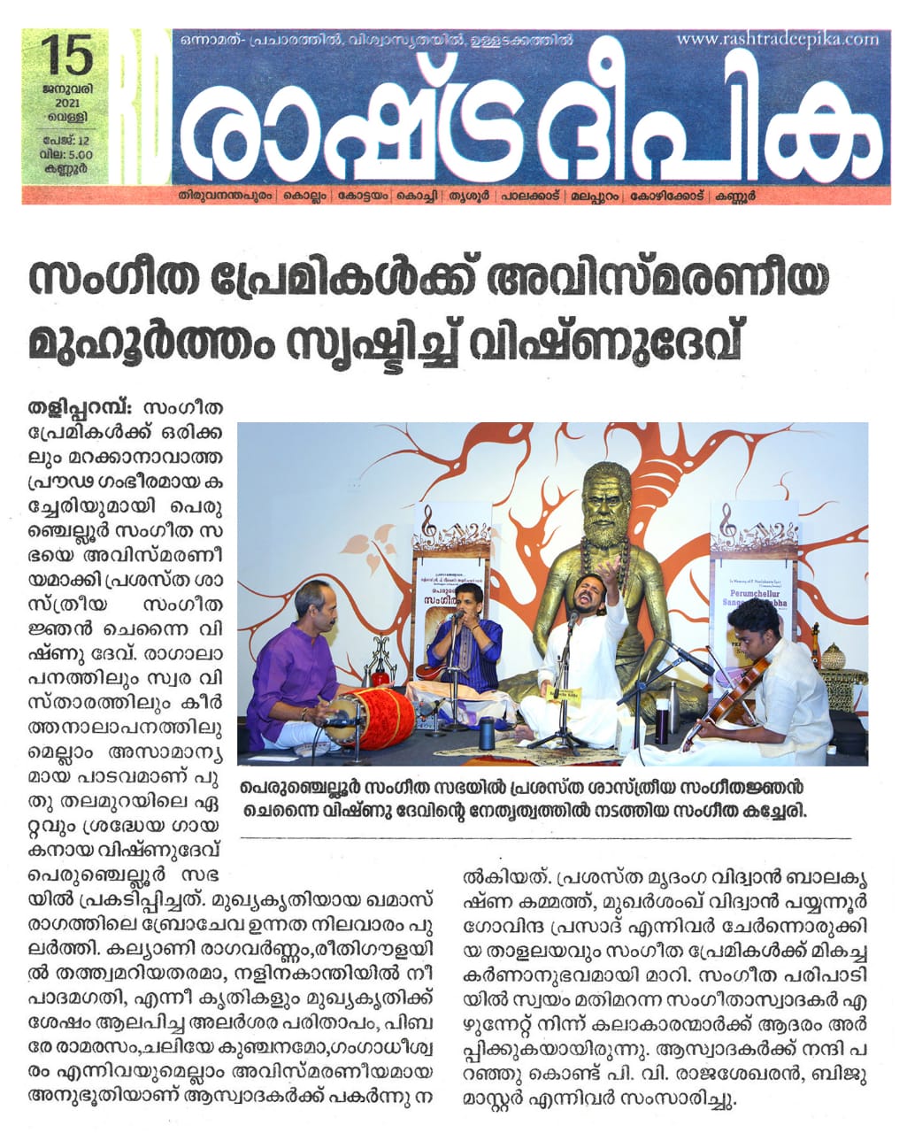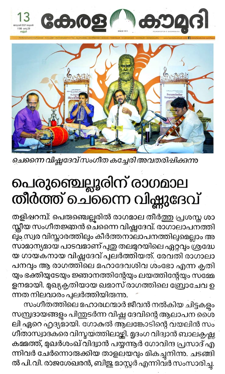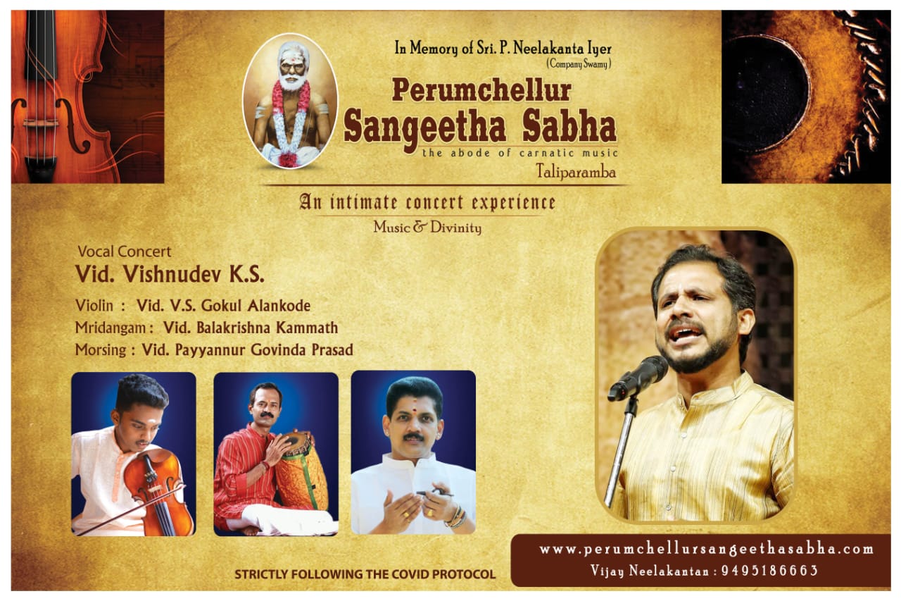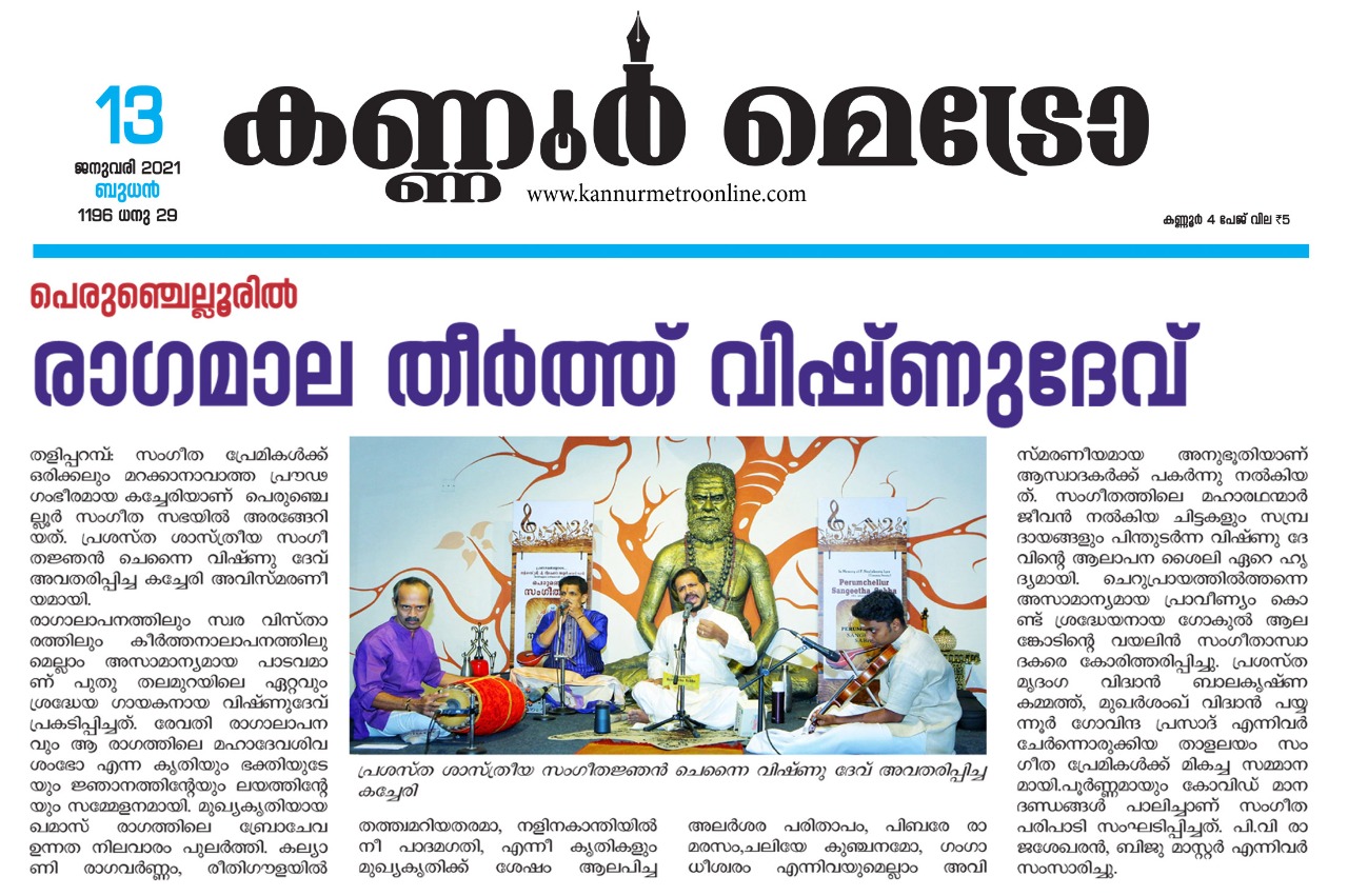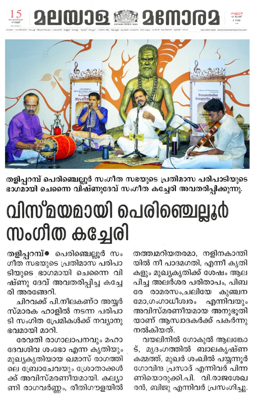 സംഗീത പെരുമഴയുമായി വിഷ്ണുദേവ് _________ സംഗീത പ്രേമികൾക്ക് ഒരിക്കലും മറക്കാനാവാത്ത പ്രൗഢ ഗംഭീരമായ കച്ചേരിയാണ് പെരുഞ്ചെല്ലൂർ സംഗീത സഭയിൽ അരങ്ങേറിയത്. പ്രശസ്ത ശാസ്ത്രീയ സംഗീതജ്ഞൻ ചെന്നൈ വിഷ്ണു ദേവ് അവതരിപ്പിച്ച കച്ചേരി അവിസ്മരണീയമായി. രാഗാലാപനത്തിലും സ്വര വിസ്താരത്തിലും കീർത്തനാലാപനത്തിലുമെല്ലാം അസാമാന്യമായ പാടവമാണ് പുതു തലമുറയിലെ ഏറ്റവും ശ്രദ്ധേയ ഗായകനായ വിഷ്ണുദേവ് പ്രകടിപ്പിച്ചത്. രേവതി രാഗാലാപനവും ആ രാഗത്തിലെ മഹാദേവശിവ ശംഭോ എന്ന കൃതിയും ഭക്തിയുടേയും ജ്ഞാനത്തിന്റേയും ലയത്തിന്റേയും സമ്മേളനമായി. മുഖ്യകൃതിയായ ഖമാസ് രാഗത്തിലെ ബ്രോചേവ ഉന്നത നിലവാരം പുലർത്തി. കല്യാണി രാഗവർണ്ണം,രീതിഗൗളയിൽ തത്ത്വമറിയതരമാ, നളിനകാന്തിയിൽ നീ പാദമഗതി, എന്നീ കൃതികളും മുഖ്യകൃതിക്ക് ശേഷം ആലപിച്ച അലർശര പരിതാപം, പിബരേ രാമരസം,ചലിയേ കുഞ്ചനമോ,ഗംഗാധീശ്വരം എന്നിവയുമെല്ലാം അവിസ്മരണീയമായ അനുഭൂതിയാണ് ആസ്വാദകർക്ക് പകർന്നു നൽകിയത്. സംഗീതത്തിലെ മഹാരഥന്മാർ ജീവൻ നൽകിയ ചിട്ടകളും സമ്പ്രദായങ്ങളും പിന്തുടർന്ന വിഷ്ണു ദേവിന്റെ ആലാപന ശൈലി ഏറെ ഹൃദ്യമായി. ചെറുപ്രായത്തിൽത്തന്നെ അസാമാന്യമായ പ്രാവീണ്യം കൊണ്ട് ശ്രദ്ധേയനായ ഗോകുൽ ആലങ്കോടിന്റെ വയലിൻ സംഗീതാസ്വാദകരെ അക്ഷരാർത്ഥത്തിൽ കോരിത്തരിപ്പിച്ചു. പ്രശസ്ത മൃദംഗ വിദ്വാൻ ബാലകൃഷ്ണ കമ്മത്ത്, മുഖർശംഖ് വിദ്വാൻ പയ്യന്നൂർ ഗോവിന്ദ പ്രസാദ് എന്നിവർ ചേർന്നൊരുക്കിയ താളലയം സംഗീത പ്രേമികൾക്ക് മികച്ച സമ്മാനമായി. പൂർണ്ണമായും കോവിഡ് മാനദണ്ഡങ്ങൾ പാലിച്ചാണ് സംഗീത പരിപാടി സംഘടിപ്പിച്ചത്. പി. വി. രാജശേഖരൻ, വിജയ് നീലകണ്ഠൻ, ബിജു മാസ്റ്റർ എന്നിവർ സംസാരിച്ചു.