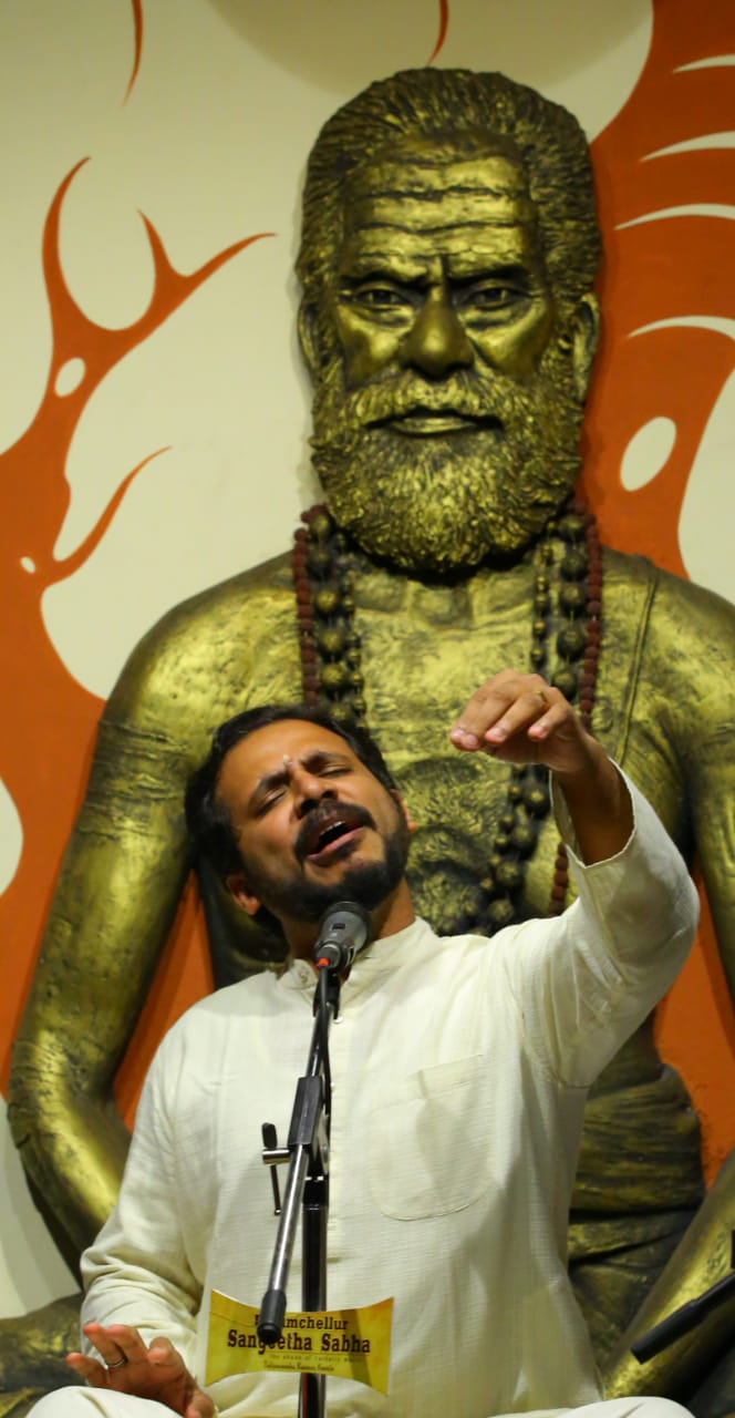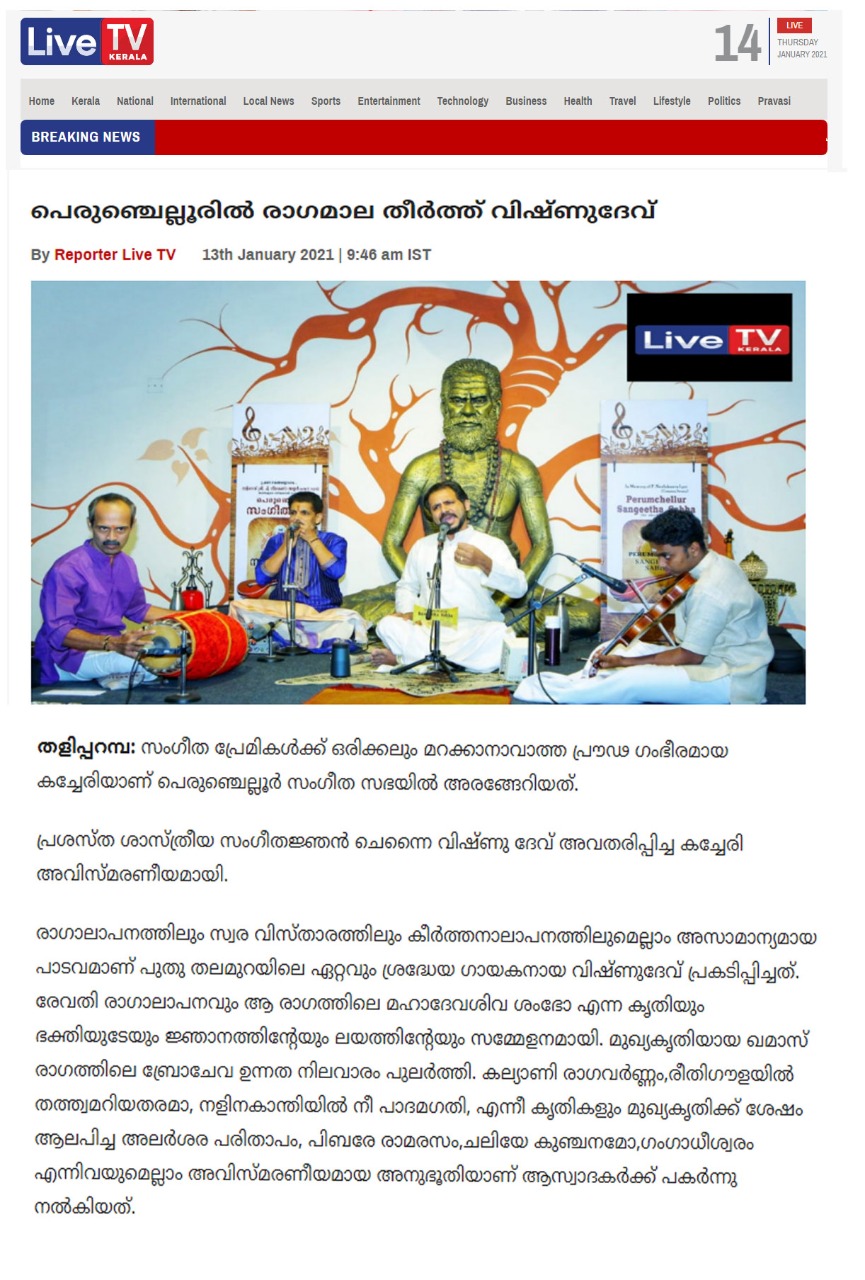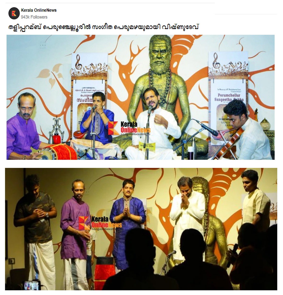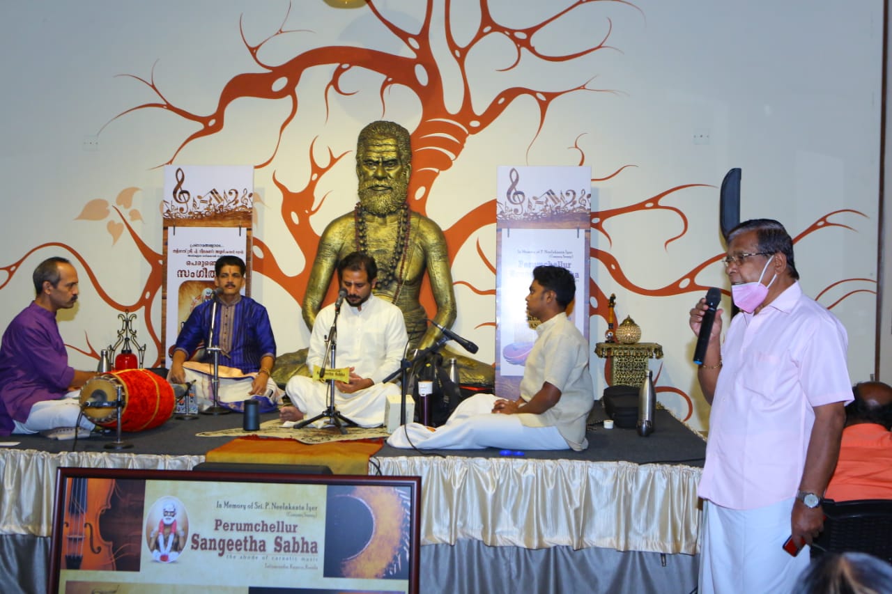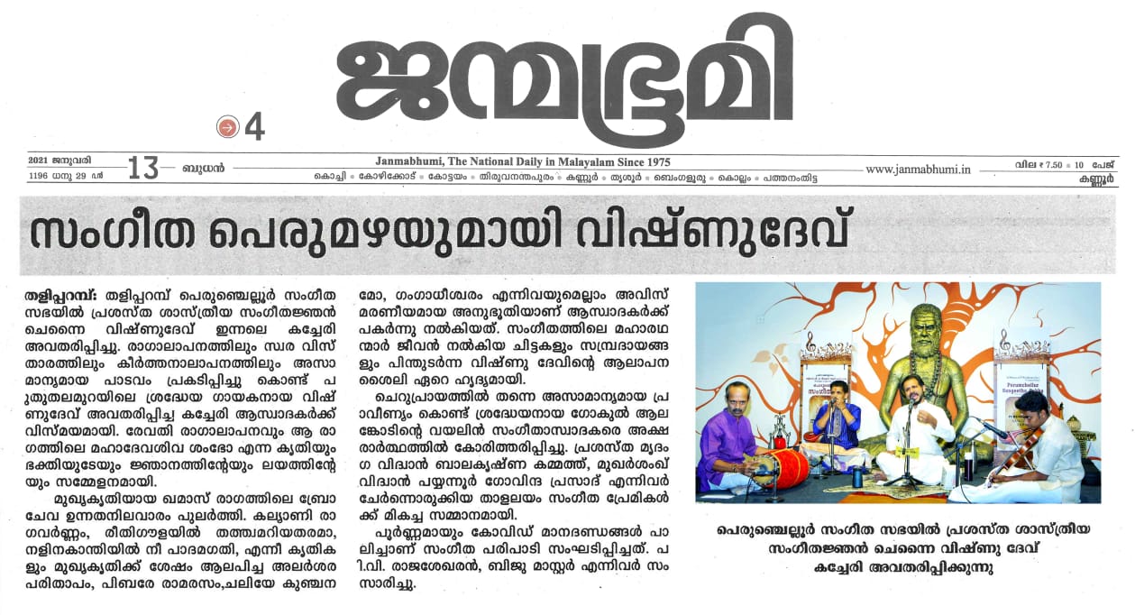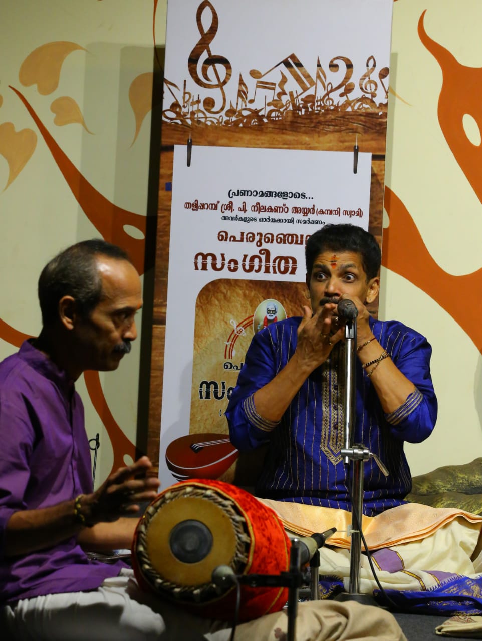 സംഗീത പെരുമഴയുമായി വിഷ്ണുദേവ് _________ സംഗീത പ്രേമികൾക്ക് ഒരിക്കലും മറക്കാനാവാത്ത പ്രൗഢ ഗംഭീരമായ കച്ചേരിയാണ് പെരുഞ്ചെല്ലൂർ സംഗീത സഭയിൽ അരങ്ങേറിയത്. പ്രശസ്ത ശാസ്ത്രീയ സംഗീതജ്ഞൻ ചെന്നൈ വിഷ്ണു ദേവ് അവതരിപ്പിച്ച കച്ചേരി അവിസ്മരണീയമായി. രാഗാലാപനത്തിലും സ്വര വിസ്താരത്തിലും കീർത്തനാലാപനത്തിലുമെല്ലാം അസാമാന്യമായ പാടവമാണ് പുതു തലമുറയിലെ ഏറ്റവും ശ്രദ്ധേയ ഗായകനായ വിഷ്ണുദേവ് പ്രകടിപ്പിച്ചത്. രേവതി രാഗാലാപനവും ആ രാഗത്തിലെ മഹാദേവശിവ ശംഭോ എന്ന കൃതിയും ഭക്തിയുടേയും ജ്ഞാനത്തിന്റേയും ലയത്തിന്റേയും സമ്മേളനമായി. മുഖ്യകൃതിയായ ഖമാസ് രാഗത്തിലെ ബ്രോചേവ ഉന്നത നിലവാരം പുലർത്തി. കല്യാണി രാഗവർണ്ണം,രീതിഗൗളയിൽ തത്ത്വമറിയതരമാ, നളിനകാന്തിയിൽ നീ പാദമഗതി, എന്നീ കൃതികളും മുഖ്യകൃതിക്ക് ശേഷം ആലപിച്ച അലർശര പരിതാപം, പിബരേ രാമരസം,ചലിയേ കുഞ്ചനമോ,ഗംഗാധീശ്വരം എന്നിവയുമെല്ലാം അവിസ്മരണീയമായ അനുഭൂതിയാണ് ആസ്വാദകർക്ക് പകർന്നു നൽകിയത്. സംഗീതത്തിലെ മഹാരഥന്മാർ ജീവൻ നൽകിയ ചിട്ടകളും സമ്പ്രദായങ്ങളും പിന്തുടർന്ന വിഷ്ണു ദേവിന്റെ ആലാപന ശൈലി ഏറെ ഹൃദ്യമായി. ചെറുപ്രായത്തിൽത്തന്നെ അസാമാന്യമായ പ്രാവീണ്യം കൊണ്ട് ശ്രദ്ധേയനായ ഗോകുൽ ആലങ്കോടിന്റെ വയലിൻ സംഗീതാസ്വാദകരെ അക്ഷരാർത്ഥത്തിൽ കോരിത്തരിപ്പിച്ചു. പ്രശസ്ത മൃദംഗ വിദ്വാൻ ബാലകൃഷ്ണ കമ്മത്ത്, മുഖർശംഖ് വിദ്വാൻ പയ്യന്നൂർ ഗോവിന്ദ പ്രസാദ് എന്നിവർ ചേർന്നൊരുക്കിയ താളലയം സംഗീത പ്രേമികൾക്ക് മികച്ച സമ്മാനമായി. പൂർണ്ണമായും കോവിഡ് മാനദണ്ഡങ്ങൾ പാലിച്ചാണ് സംഗീത പരിപാടി സംഘടിപ്പിച്ചത്. പി. വി. രാജശേഖരൻ, വിജയ് നീലകണ്ഠൻ, ബിജു മാസ്റ്റർ എന്നിവർ സംസാരിച്ചു.