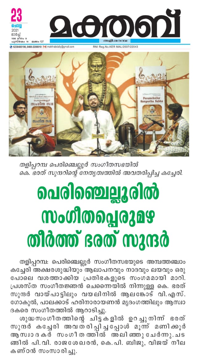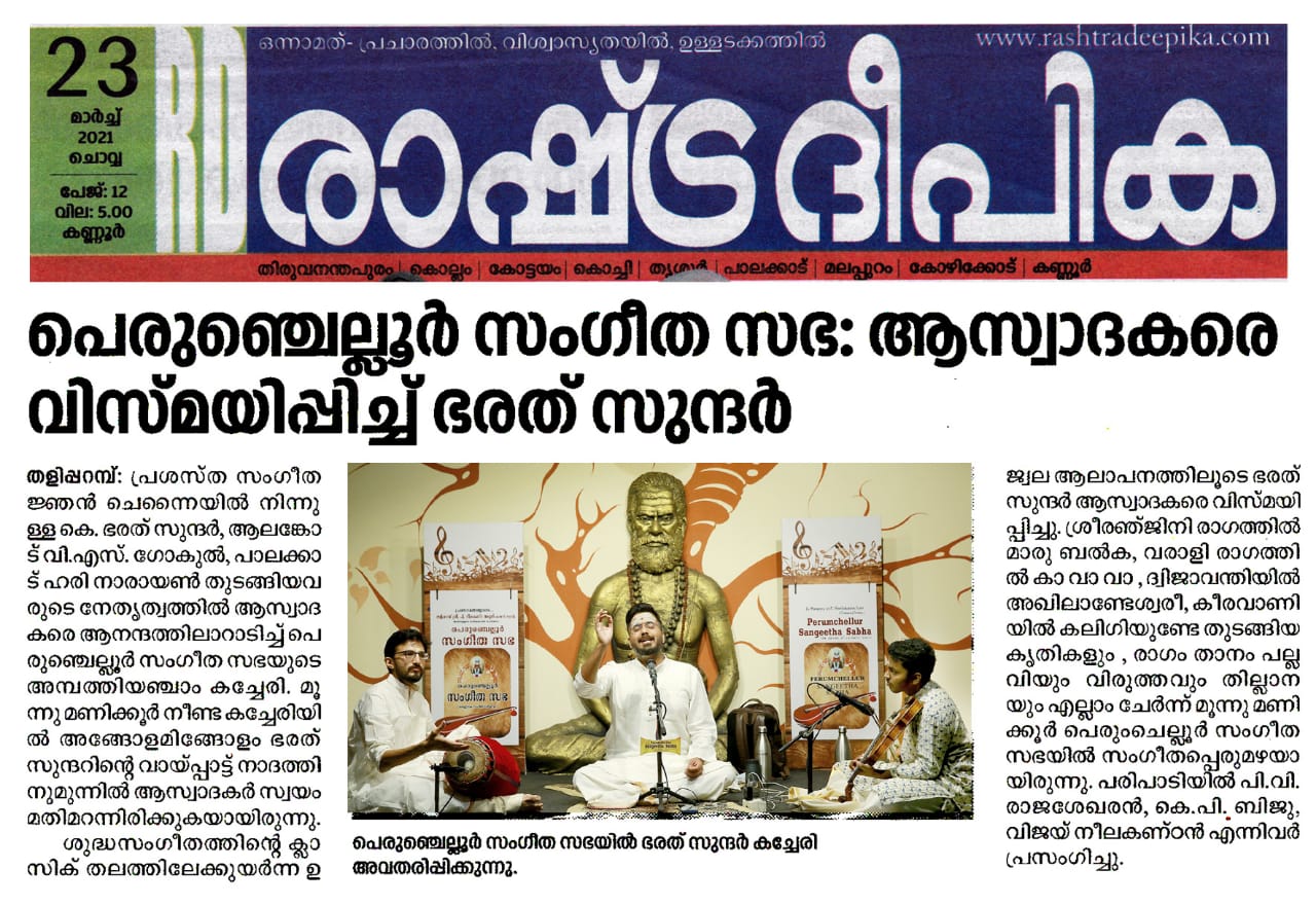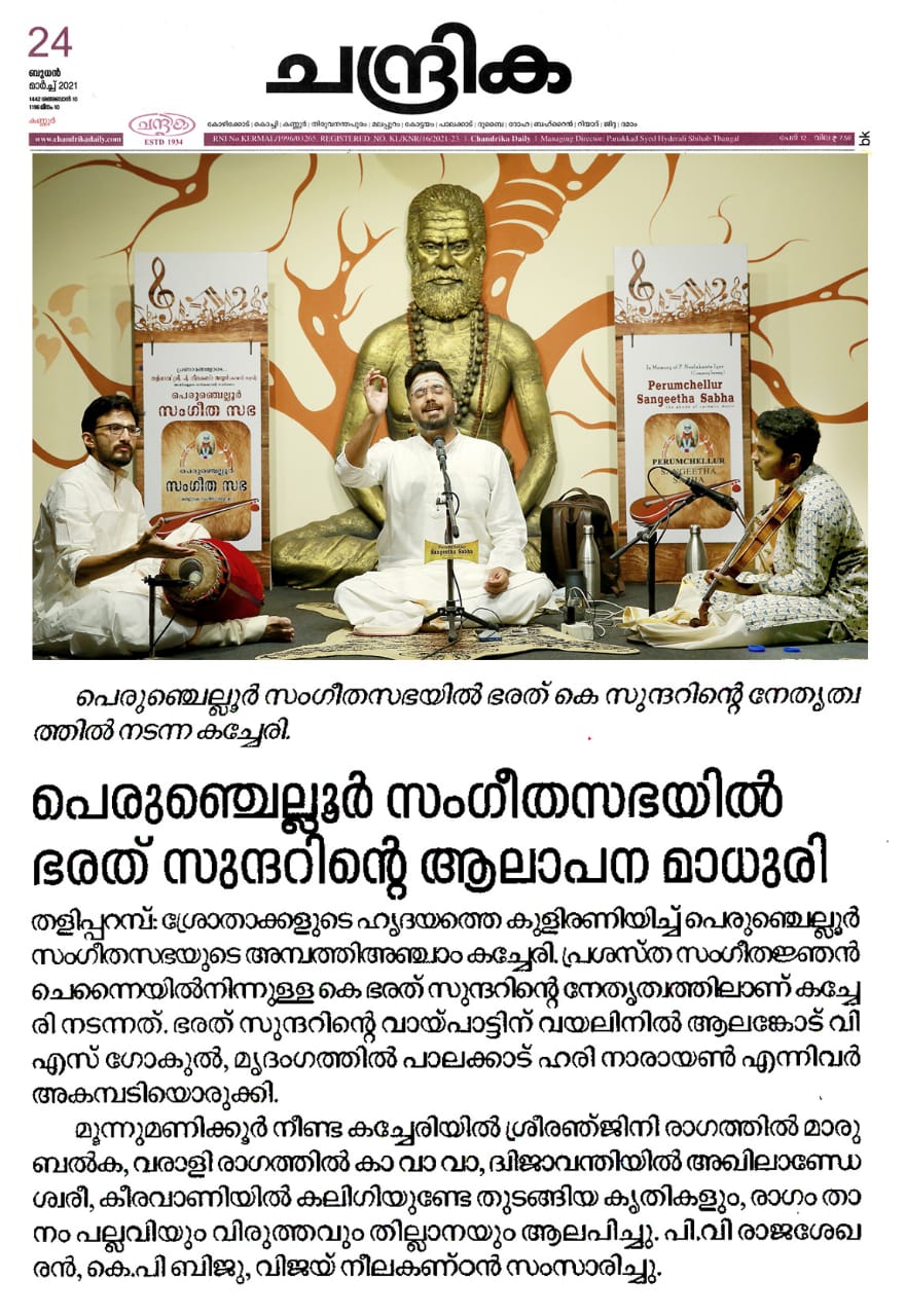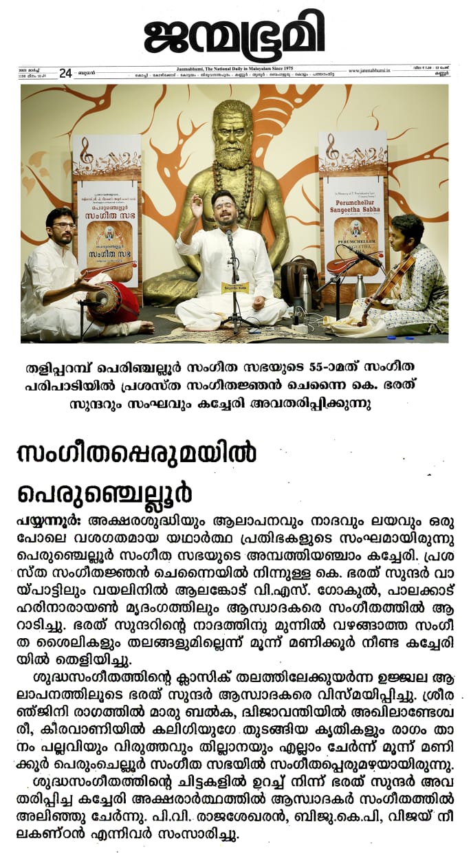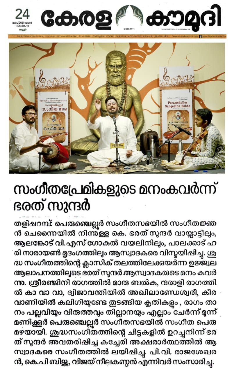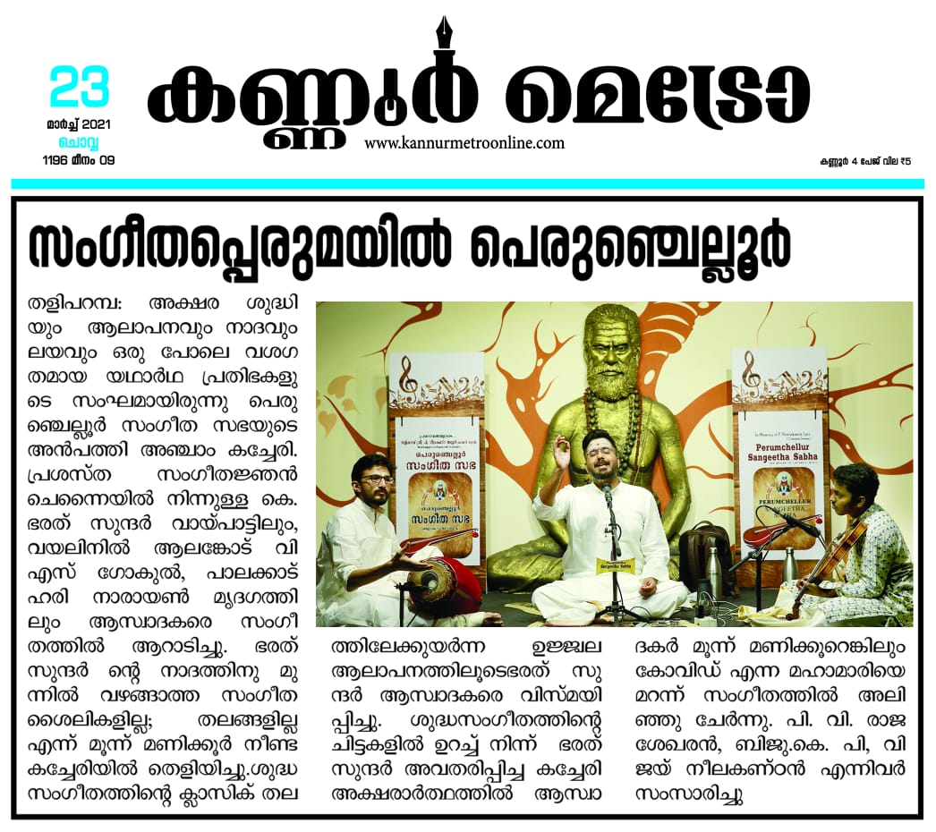 ഭരത് സുന്ദർ ആസ്വാദകരെ വിസ്മയിപ്പിച്ചു. ശ്രീരഞ്ജിനി രാഗത്തിൽ മാരു ബൽക, വരാളി രാഗത്തിൽ കാ വാ വാ , ദ്വിജാവന്തിയിൽ അഖിലാണ്ടേശ്വരീ, കീരവാണിയിൽ കലിഗിയുണ്ടേ തുടങ്ങിയ കൃതികളും , രാഗം താനം പല്ലവിയും വിരുത്തവും തില്ലാനയും എല്ലാം ചേർന്ന് മൂന്ന് മണിക്കൂർ പെരുംചെല്ലൂർ സംഗീത സഭയിൽ സംഗീത പ്പെരുമഴയായിരുന്നു.