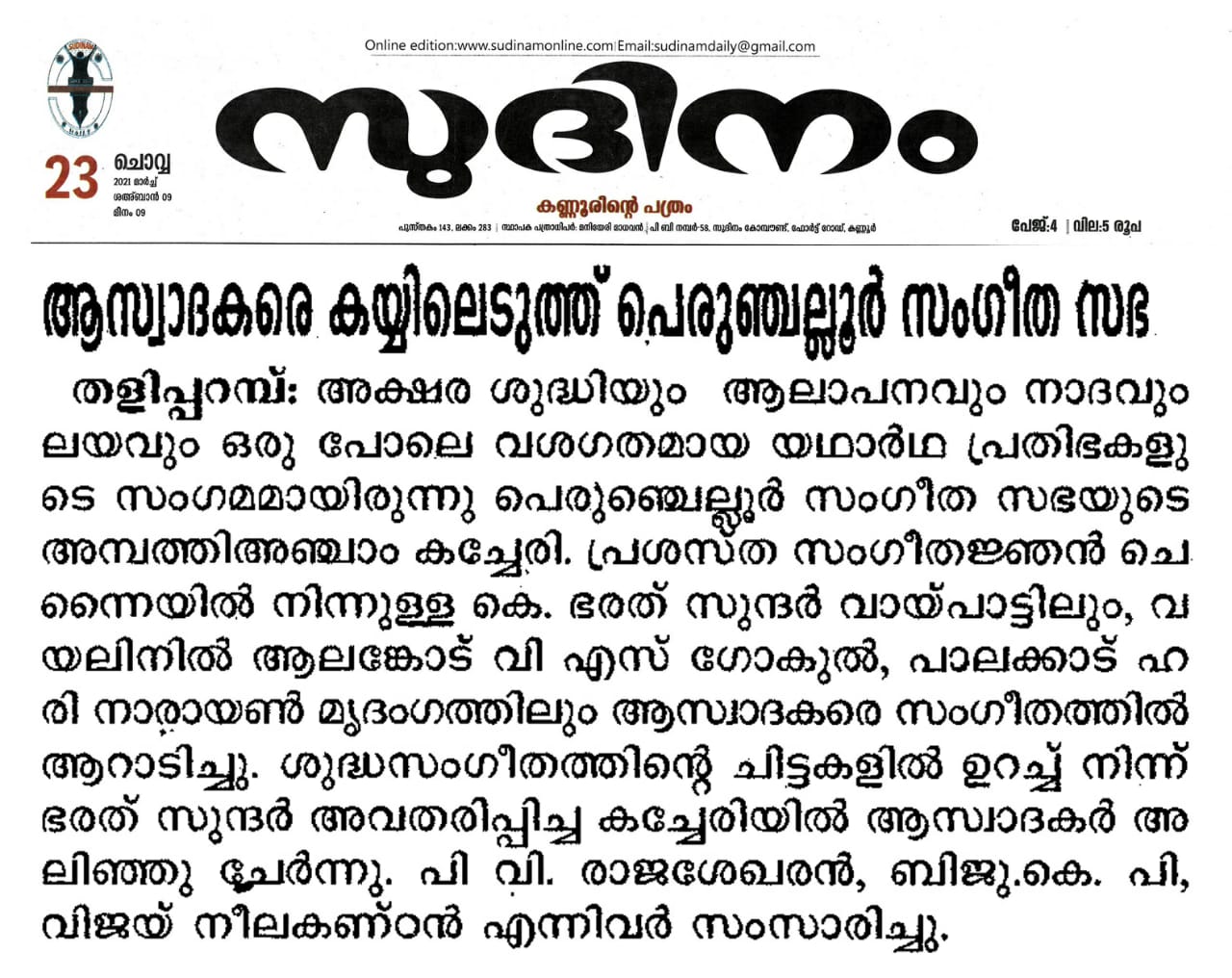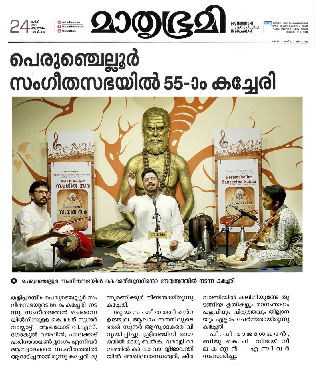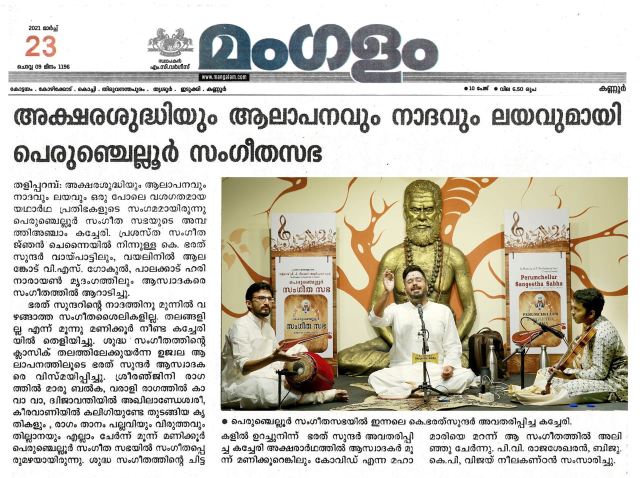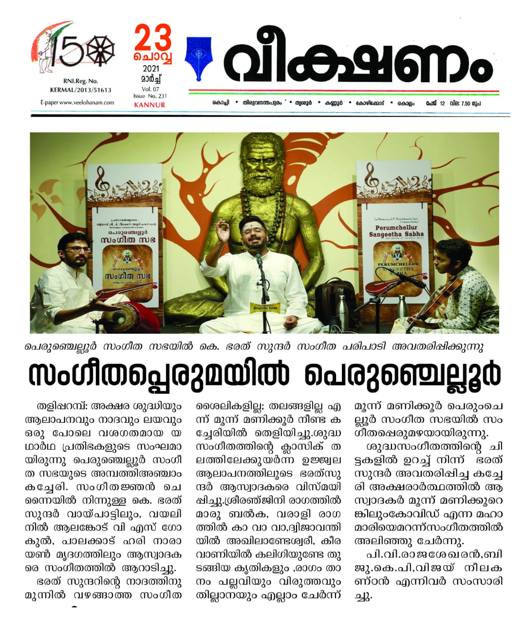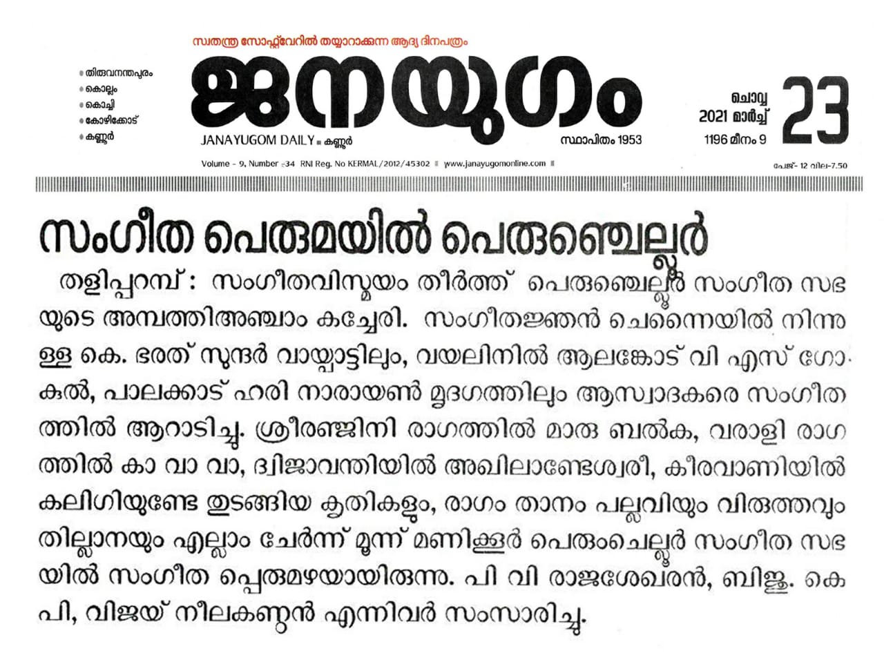 ഭരത് സുന്ദർ ആസ്വാദകരെ വിസ്മയിപ്പിച്ചു. ശ്രീരഞ്ജിനി രാഗത്തിൽ മാരു ബൽക, വരാളി രാഗത്തിൽ കാ വാ വാ , ദ്വിജാവന്തിയിൽ അഖിലാണ്ടേശ്വരീ, കീരവാണിയിൽ കലിഗിയുണ്ടേ തുടങ്ങിയ കൃതികളും , രാഗം താനം പല്ലവിയും വിരുത്തവും തില്ലാനയും എല്ലാം ചേർന്ന് മൂന്ന് മണിക്കൂർ പെരുംചെല്ലൂർ സംഗീത സഭയിൽ സംഗീത പ്പെരുമഴയായിരുന്നു.